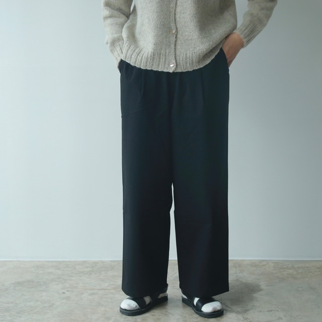evameva エヴァムエヴァ プレスウールパンツ / E253K094 冬の装いにやさしく寄り添う、プレスウールパンツ。ふんわりともこもことしたウール素材は、見た目にも温かく、触れると柔らかい手触り。穿いたときにも軽やかで、自然と心地よさに包まれます。 フロントに施したワンタックがほどよい立体感を生み、すとんと落ちるストレートシルエットへ。すっきりとしたラインを描きながらも堅苦しさはなく、どこかやわらかい雰囲気を纏わせてくれます。 厚手のニットやざっくりとしたカーディガンと合わせても重たくならず、冬の装いを軽やかにまとめてくれる一本。日常の中で気負わずに穿けて、可愛らしさと心地よさを同時に楽しめるパンツです。 しっとりとした色目のモカも入荷してきました! 【サイズ】 ウエスト 70-94cm 脇丈 92cm 股上 32cm わたり 33cm 着用モデル165cm 【素材】ウール100% 【カラー】44モカ