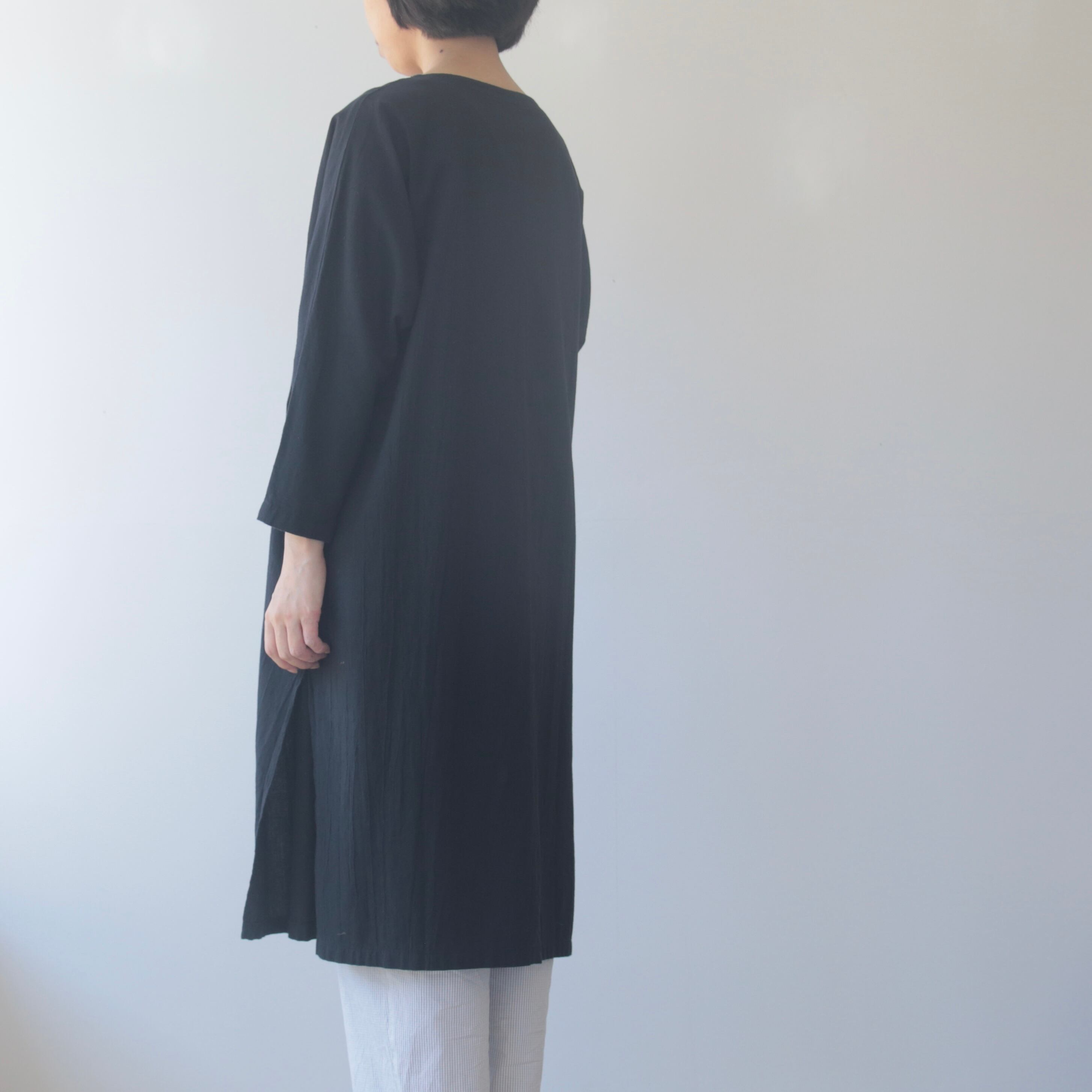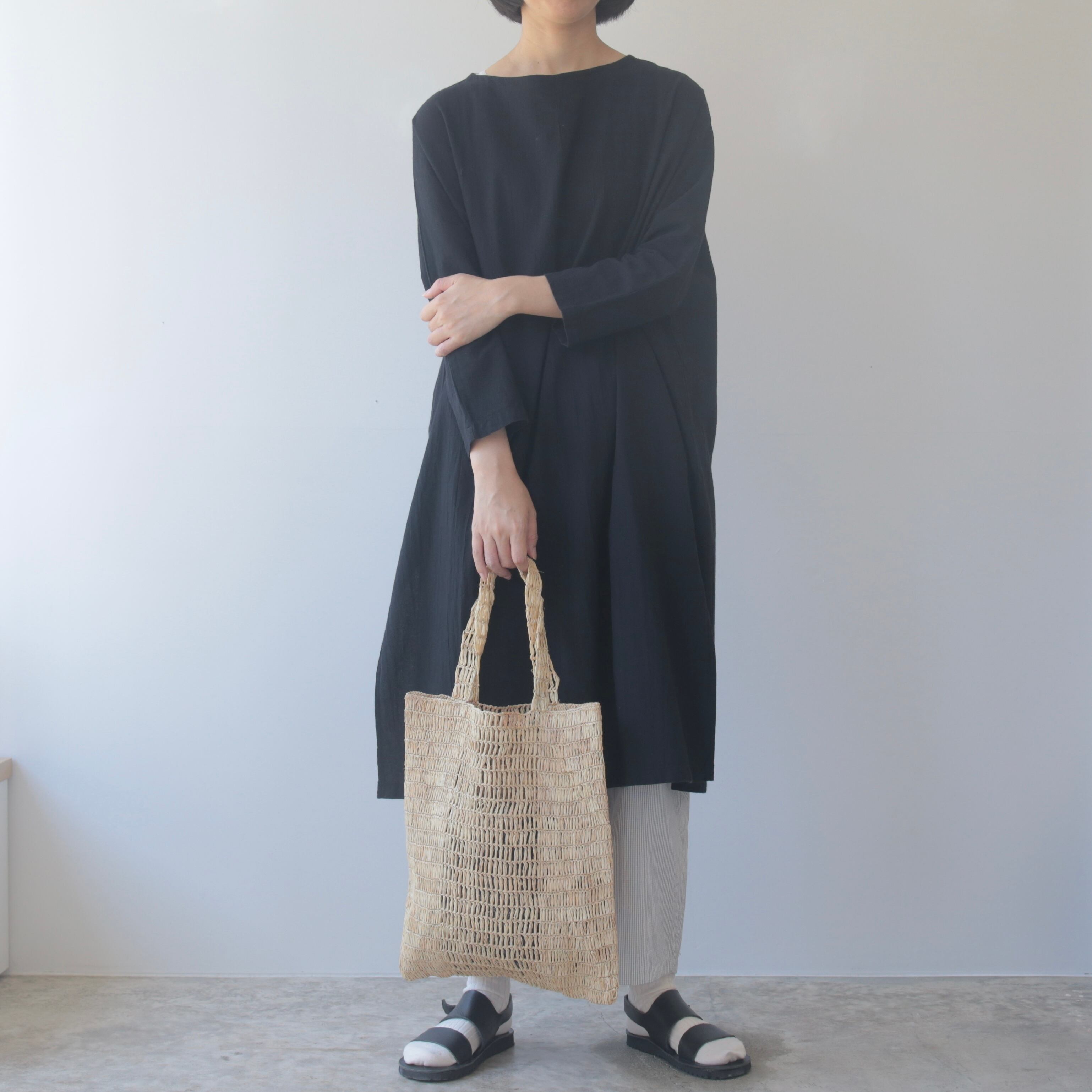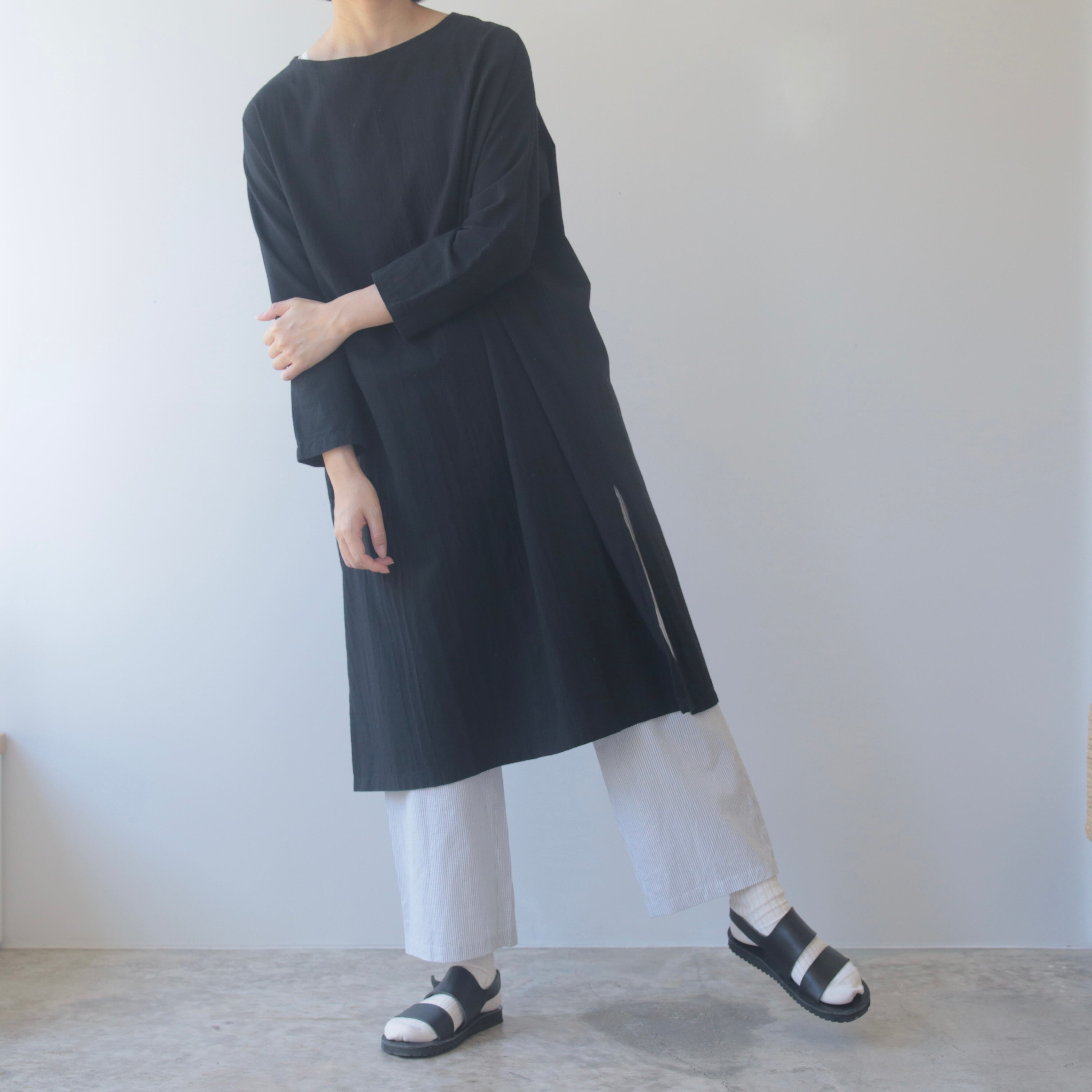 シンプルなドルマンスリーブのロングチュニックは肩の動きが大きく取れるので体へのストレスや負担を感じにくく柔らかい生地もあり、本当に心地よく過ごせます。長めの丈ですがボートネックで首元は軽く、身幅はゆったりですが袖はスッキリとバランスの取れた1枚でもあります。重さを感じずに春から夏に軽やかに着て頂けます。