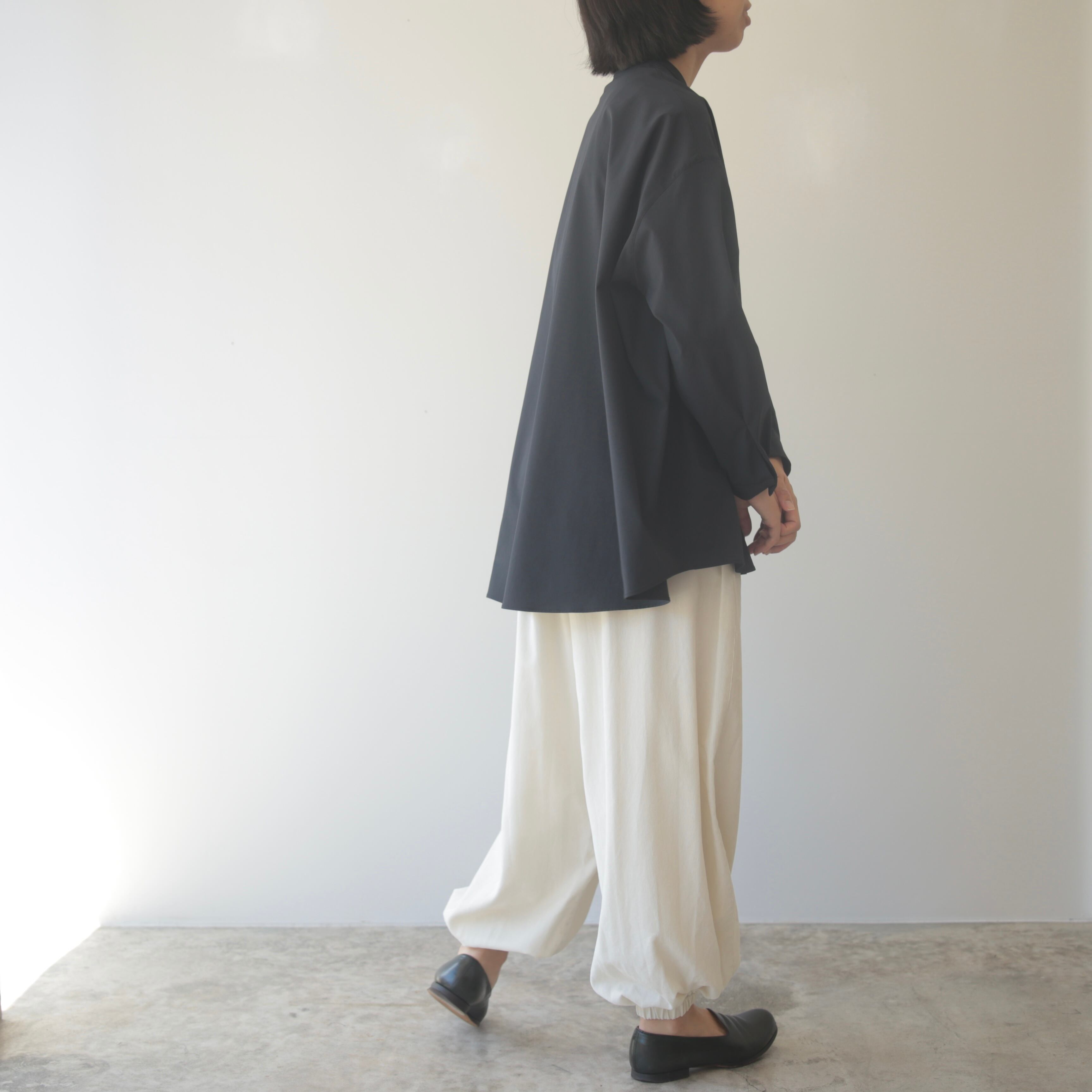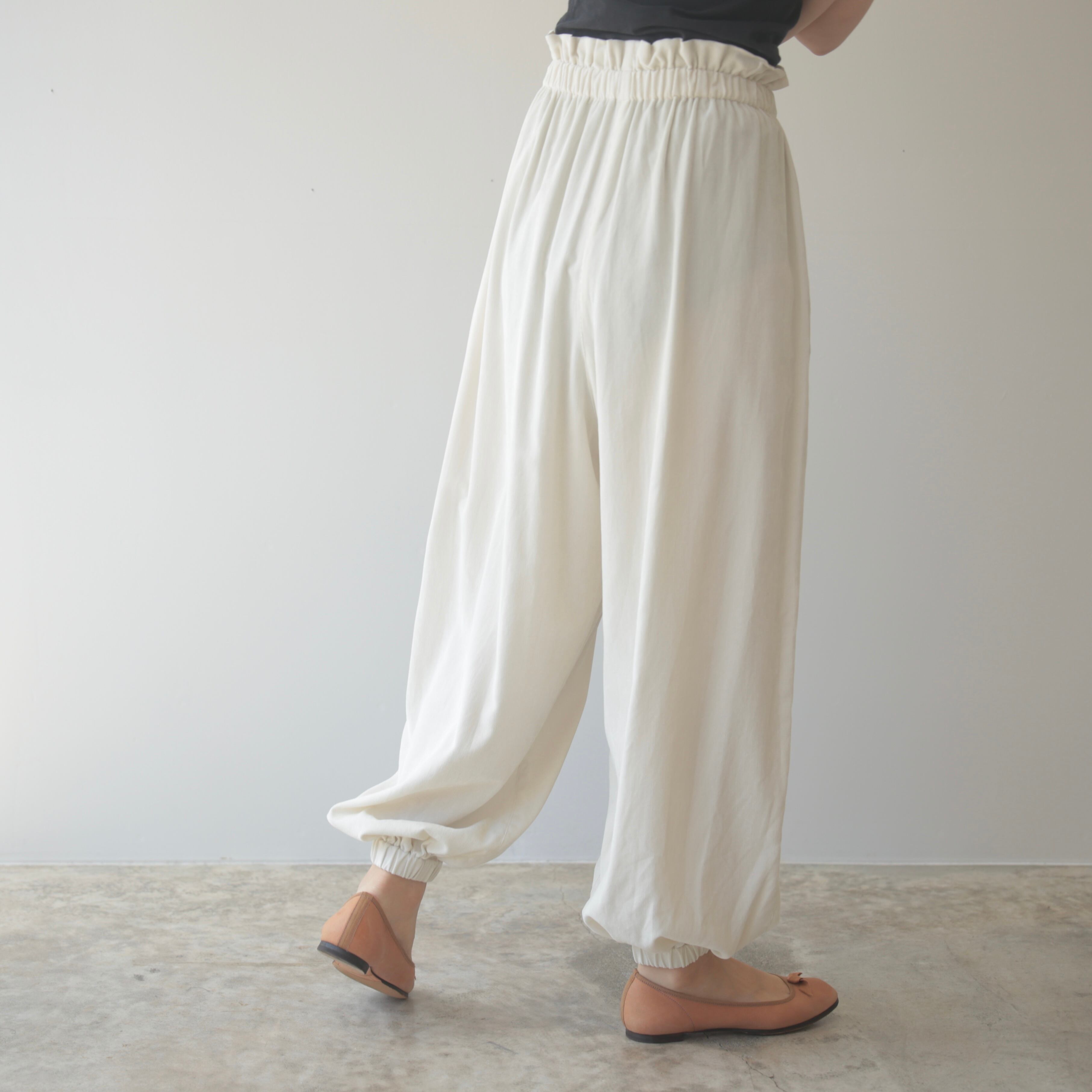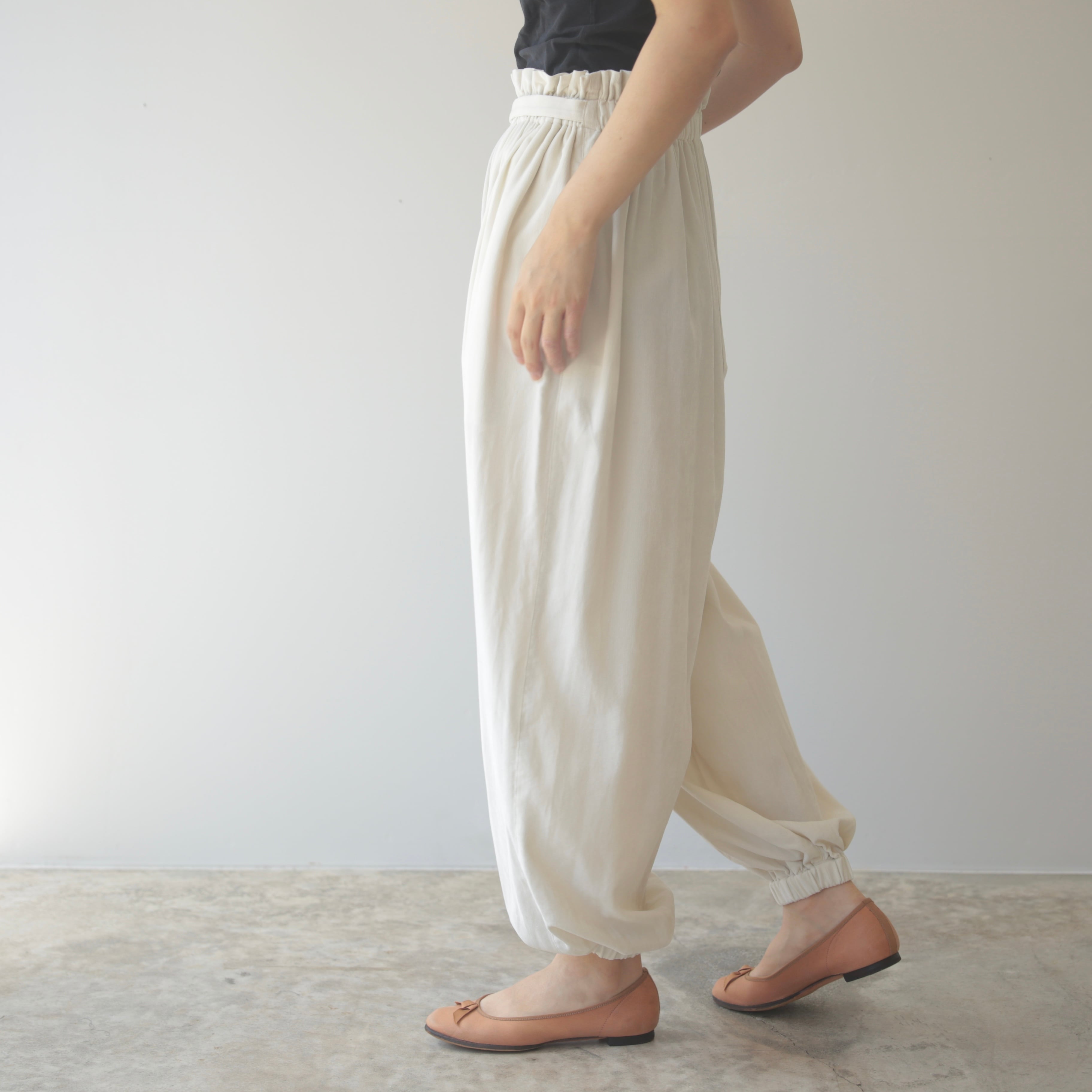 毎シーズン、色や素材を変えて登場するアタッチメントパンツ。ウエストのギャザーと、丸みを帯びたシルエットが印象的な一本です。