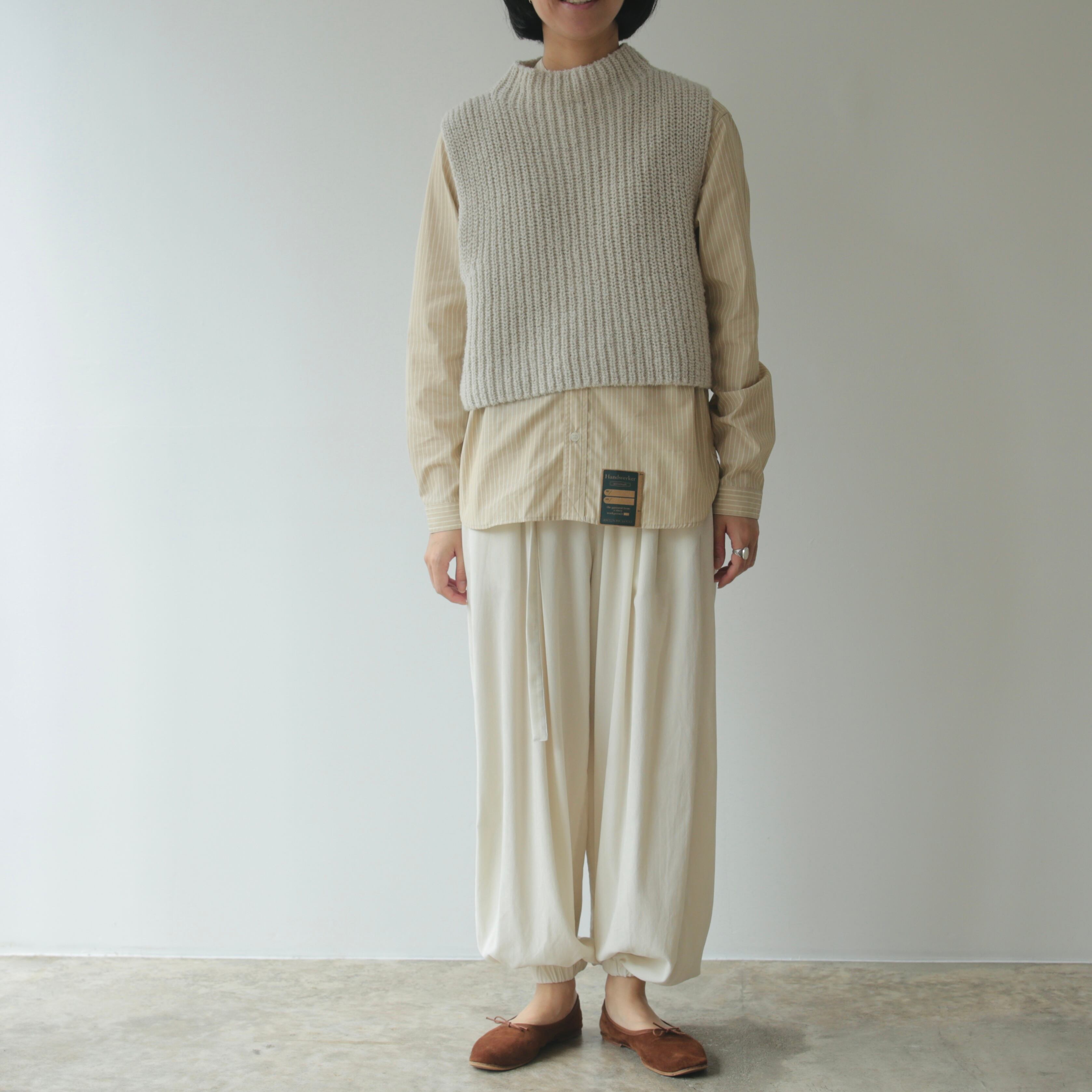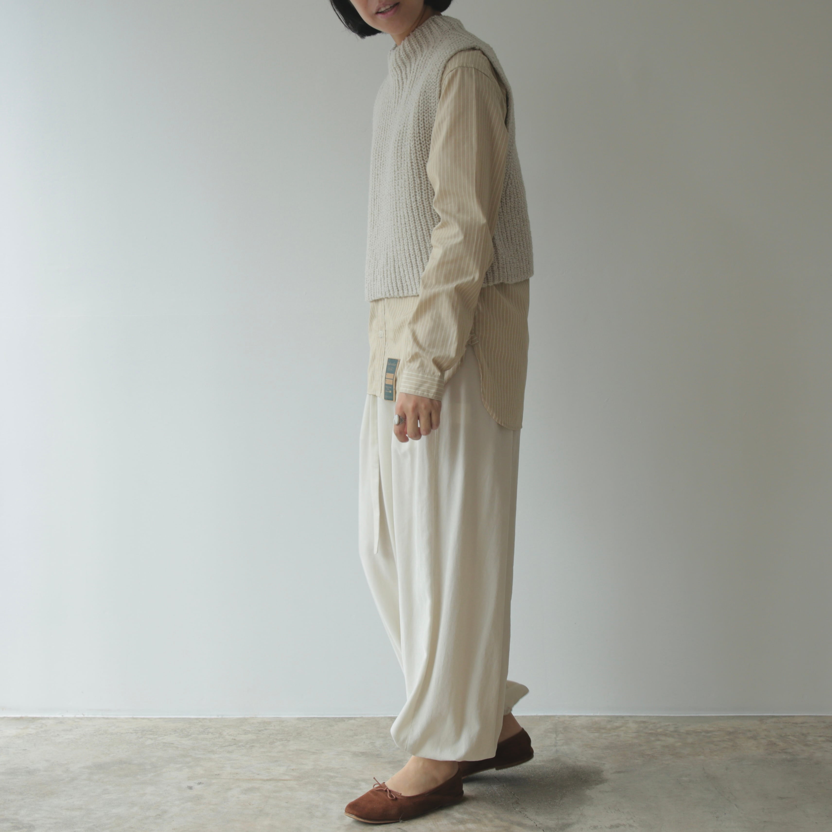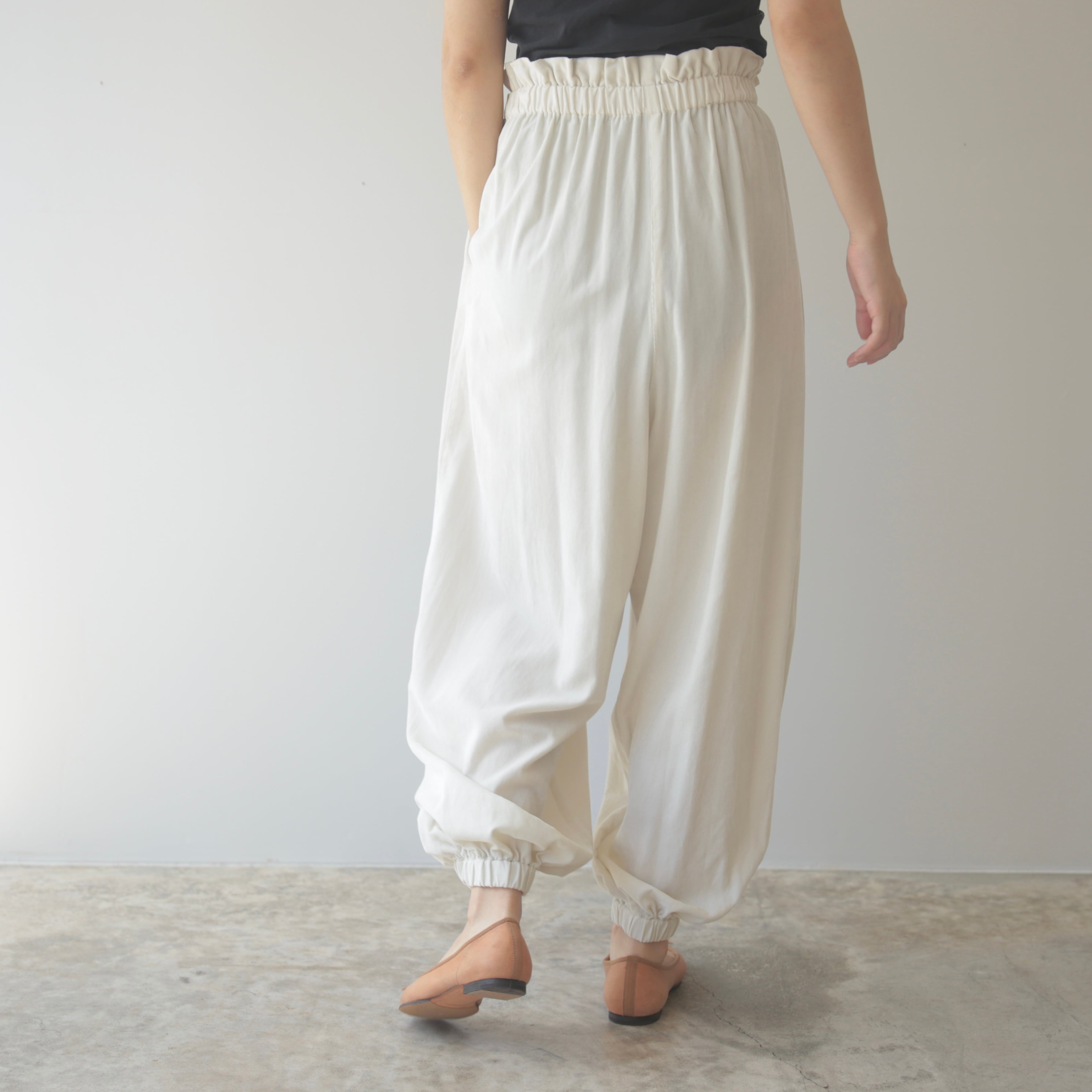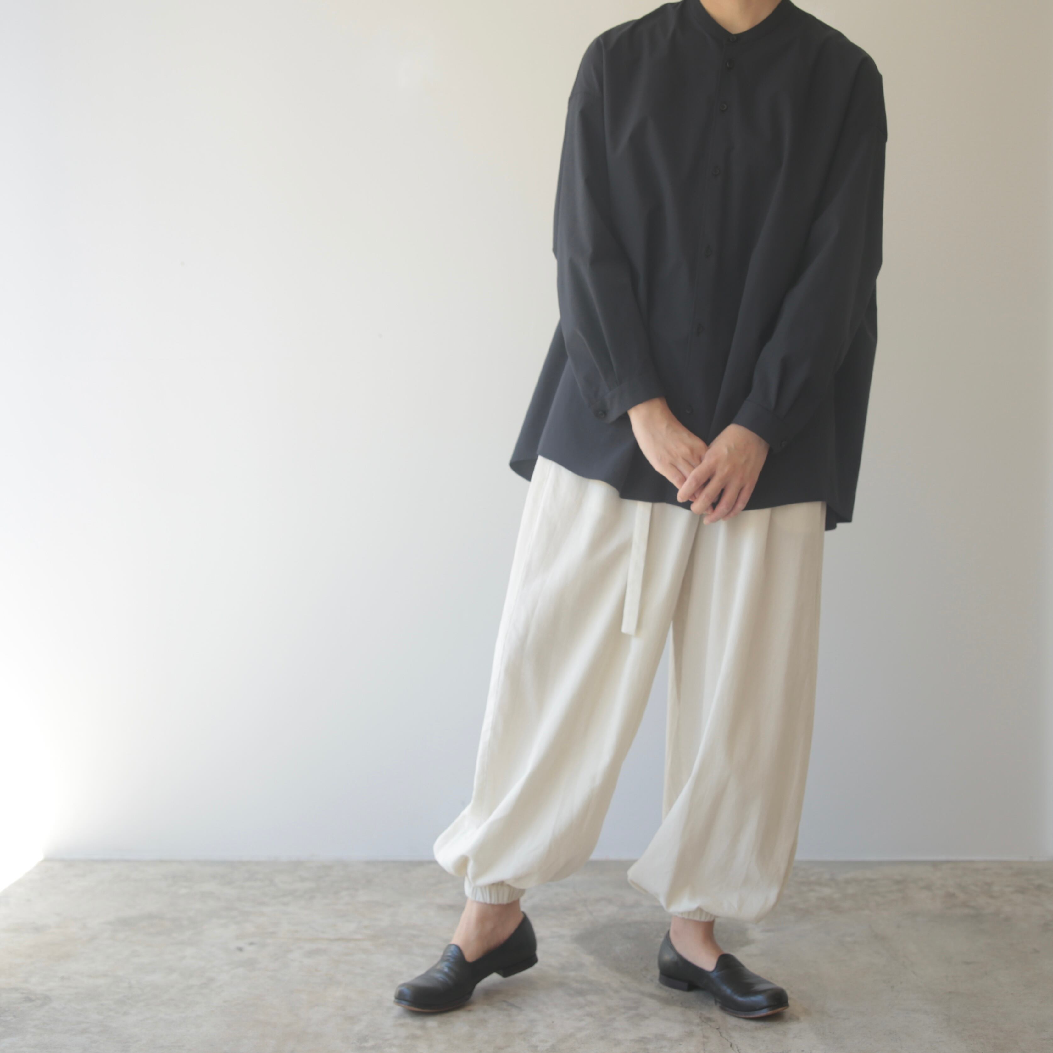 毎シーズン、色や素材を変えて登場するアタッチメントパンツ。ウエストのギャザーと、丸みを帯びたシルエットが印象的な一本です。