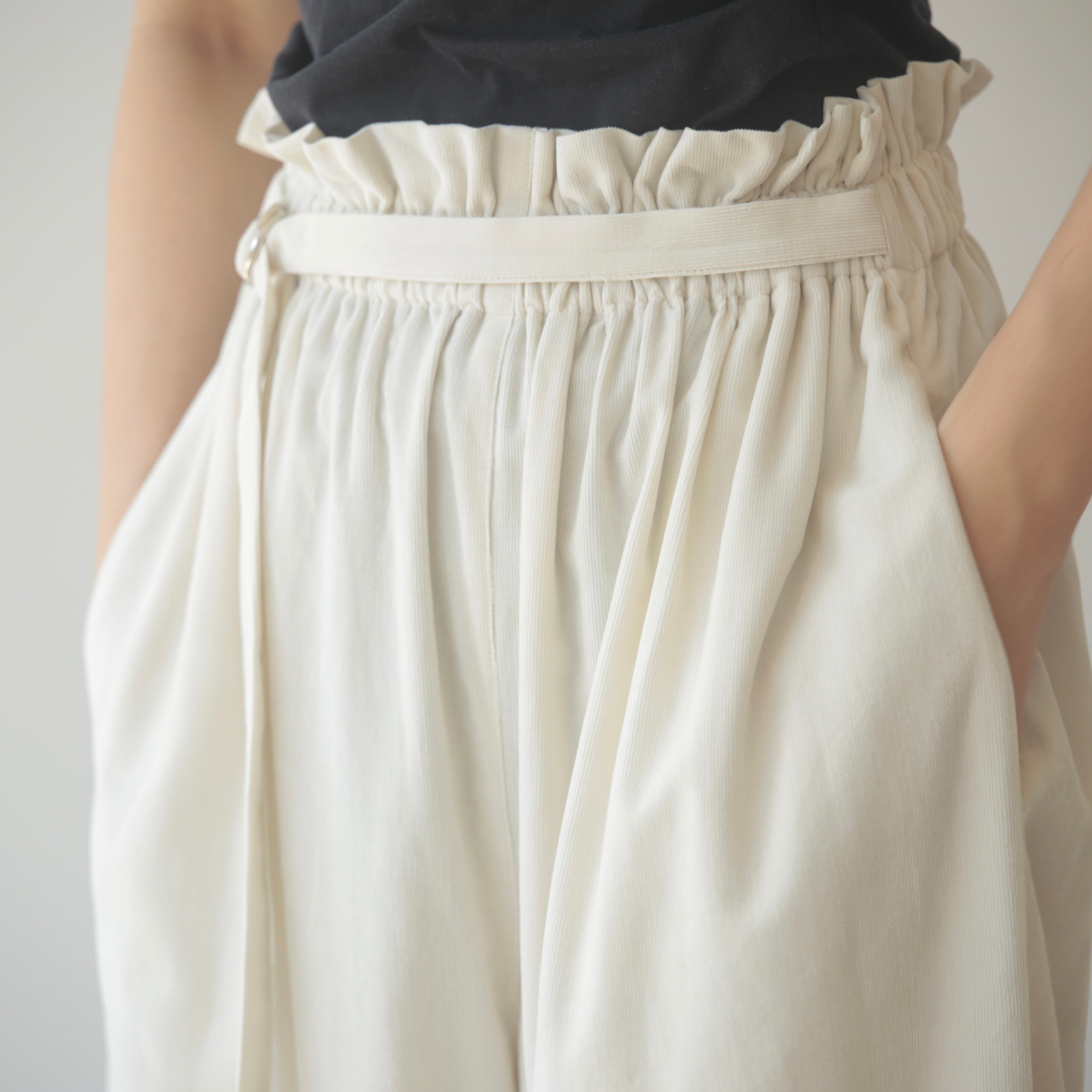 ウエストはゴム仕様で快適な穿き心地。フロントのベルトでサイズ調整も可能で、さりげないアクセントにもなります。