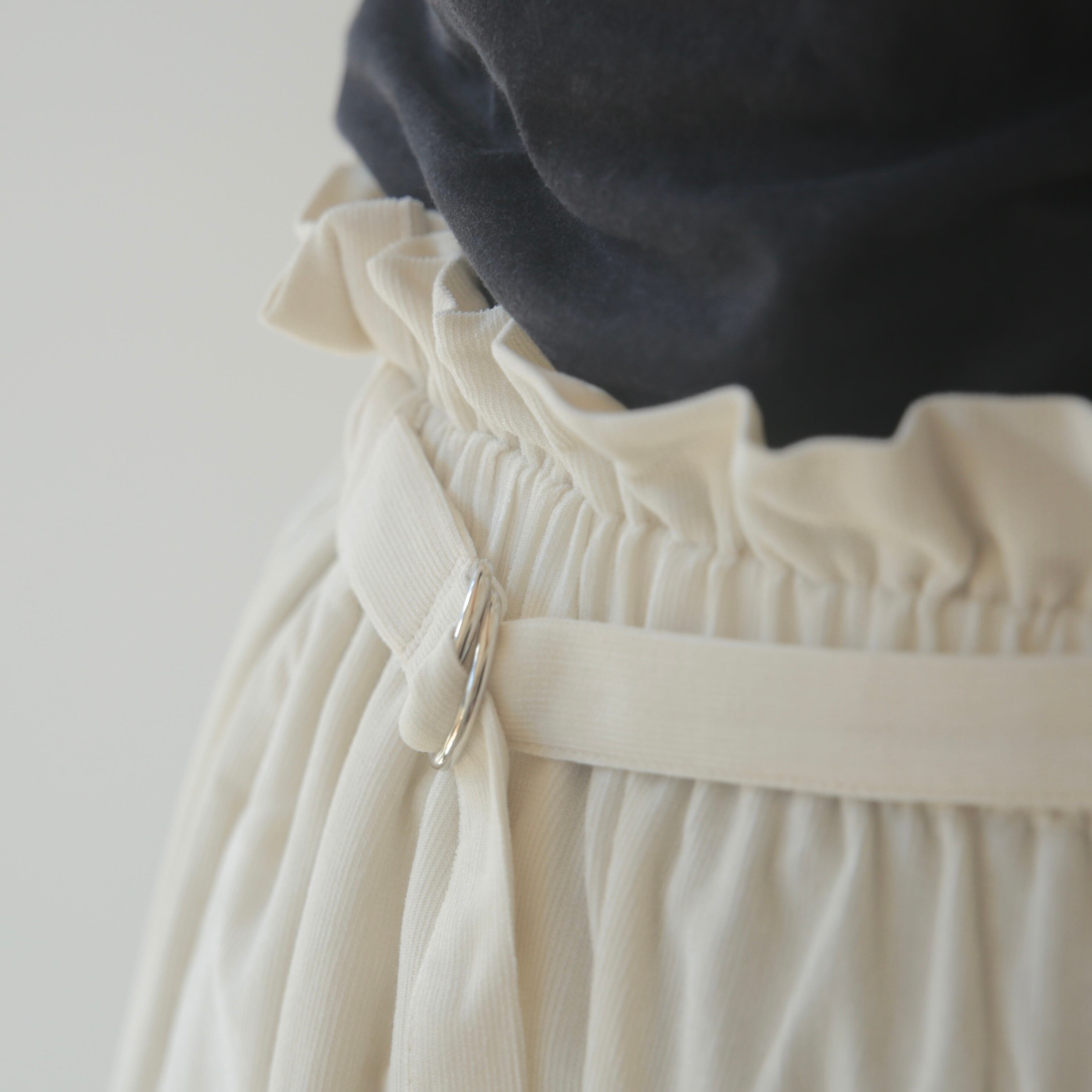 トップスをインしてウエストをぎゅっと絞れば、ギャザーがきれいに収まり、ボトムスを主役にした着こなしも楽しめます。