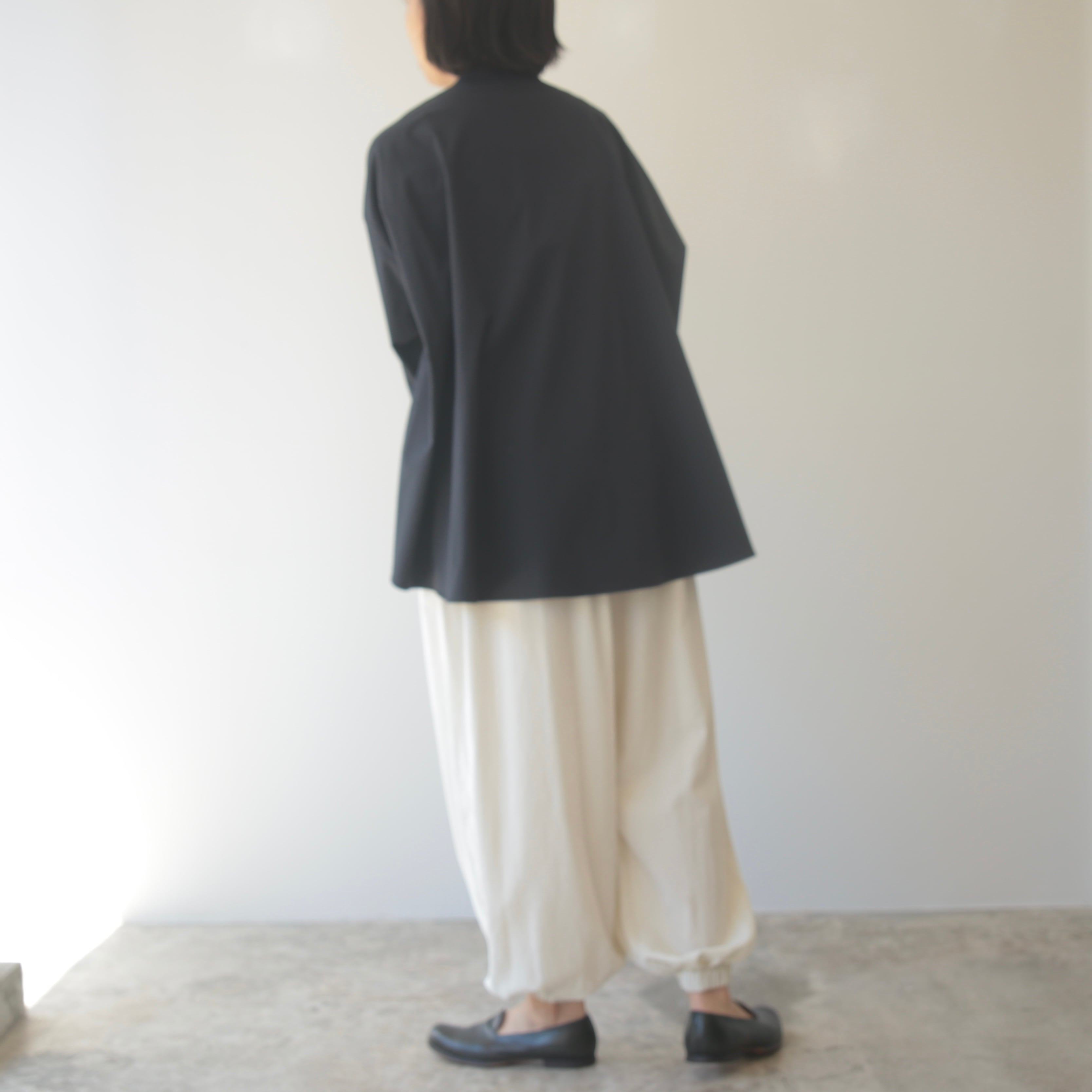 ゆったりとしたフォルムながら、落ち感のある生地がすっきりと見せてくれるので、ボリュームが出すぎず上品な佇まいに。