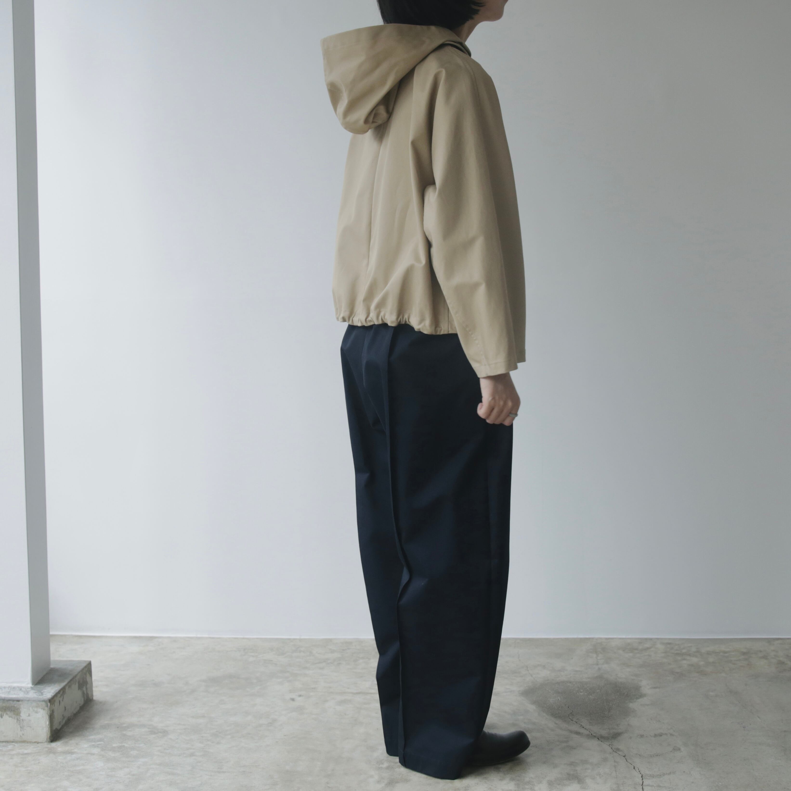 ウエスト後ろはゴム仕様で、内側にはサイズ調整ができる紐付き。ベルトループも備えているので、お手持ちのベルトでアレンジも可能です。シルエットが美しいので、トップスをインしてボトムを主役にしたコーディネートもおすすめです。