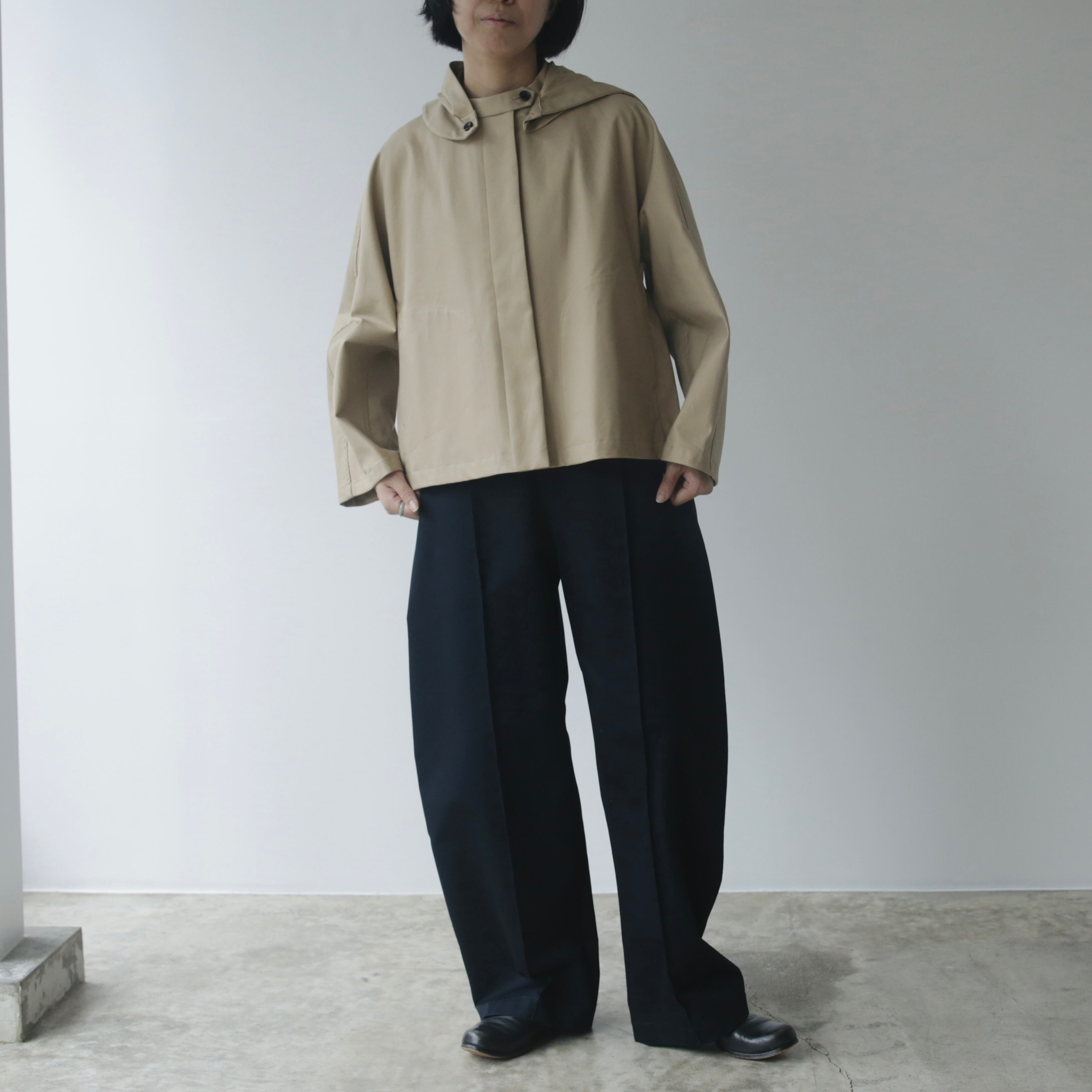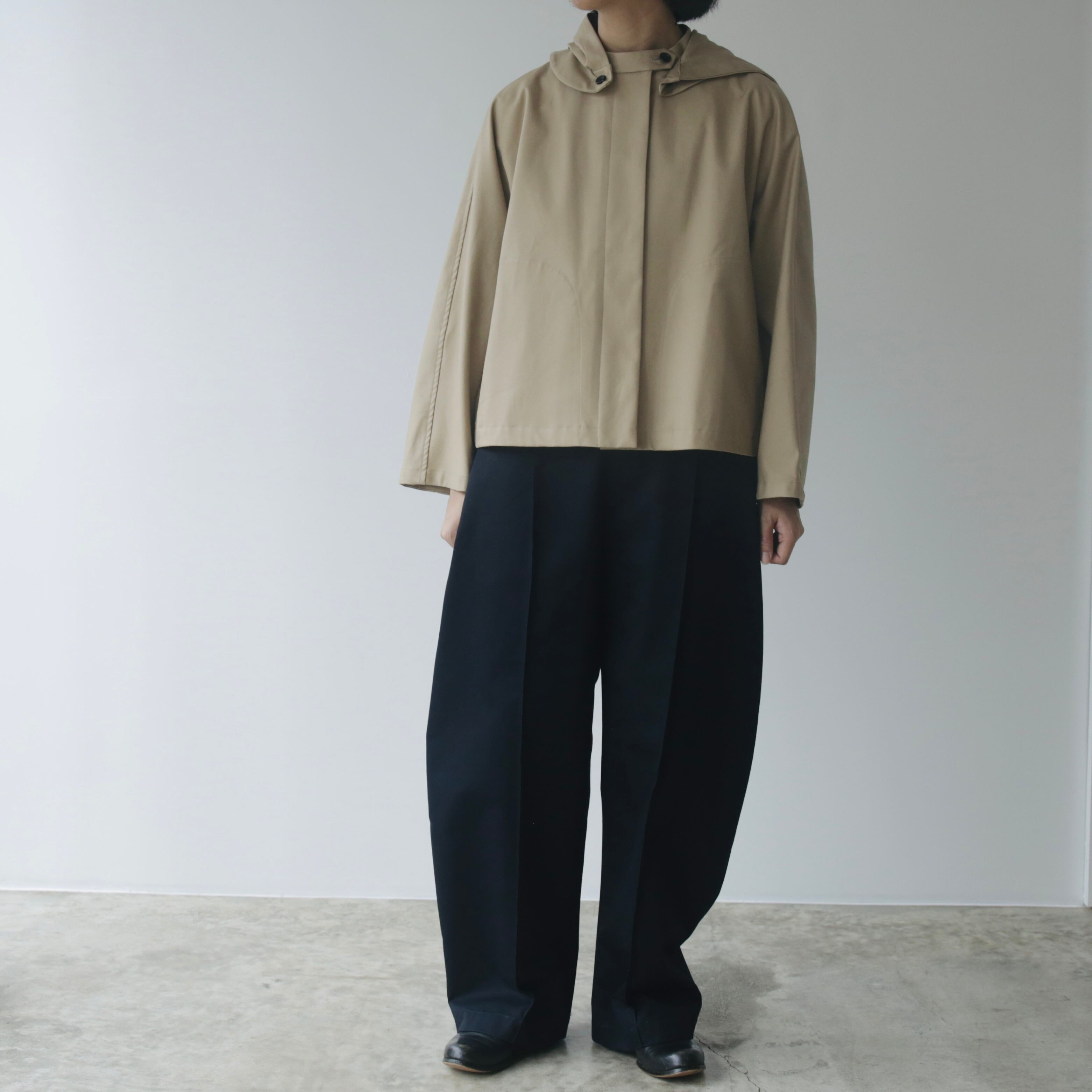 裾に向かって緩やかにテーパードしたラインに、ワイドパンツのようなゆとりをもたせたシルエット。ほんのり丸みを帯びたカーブが柔らかく印象的です。やや長めの丈感に、前後へ施したセンタープレス風のステッチが立体感を生み、脚をすっきりと見せてくれます。丈が気になる方はロールアップしてもバランスがよく、美しいシルエットのまま着こなせます。