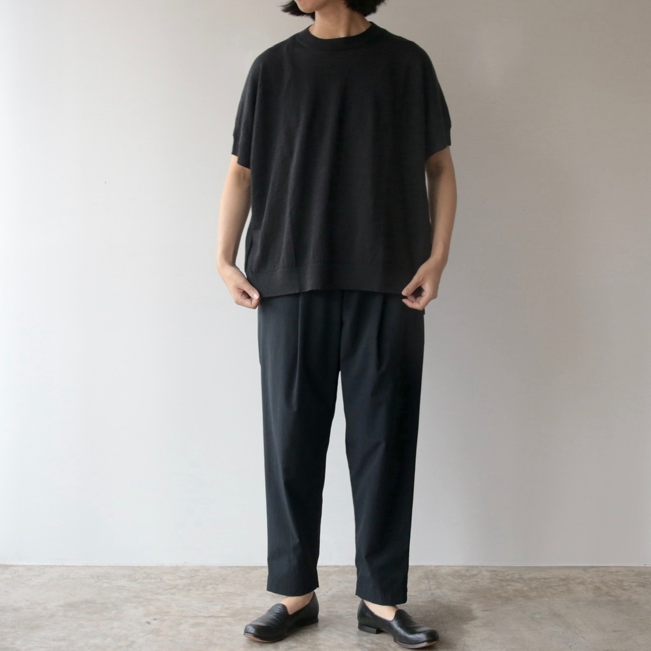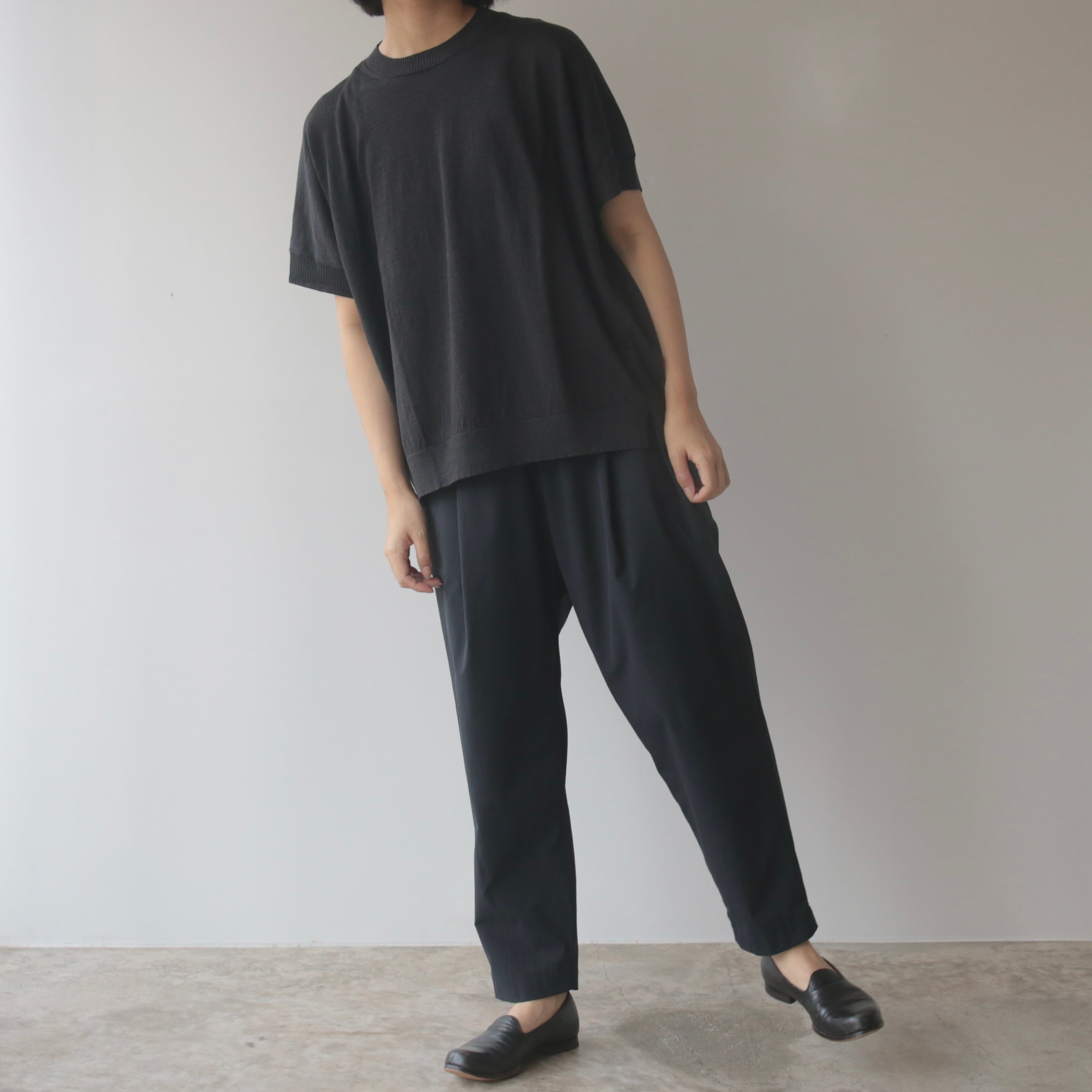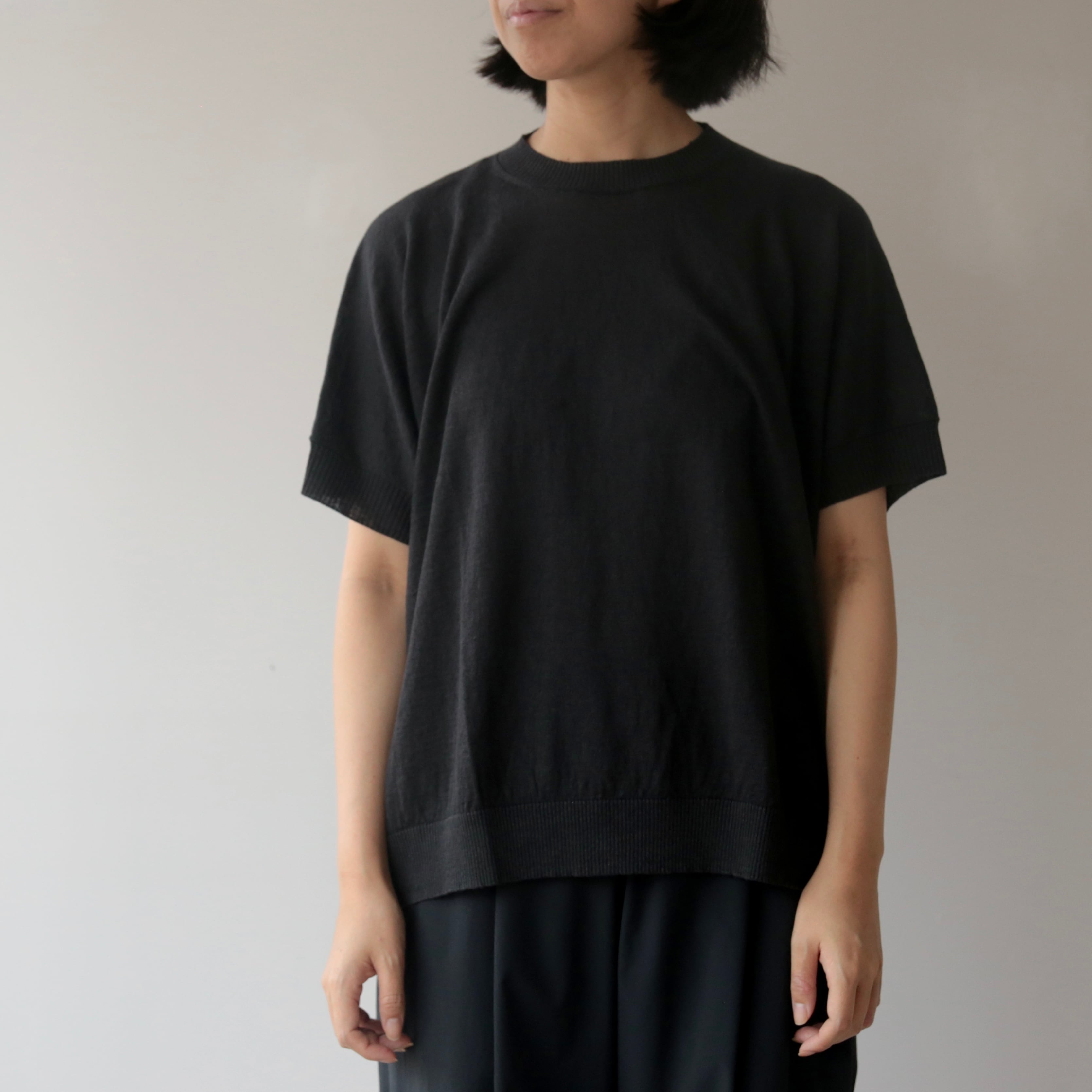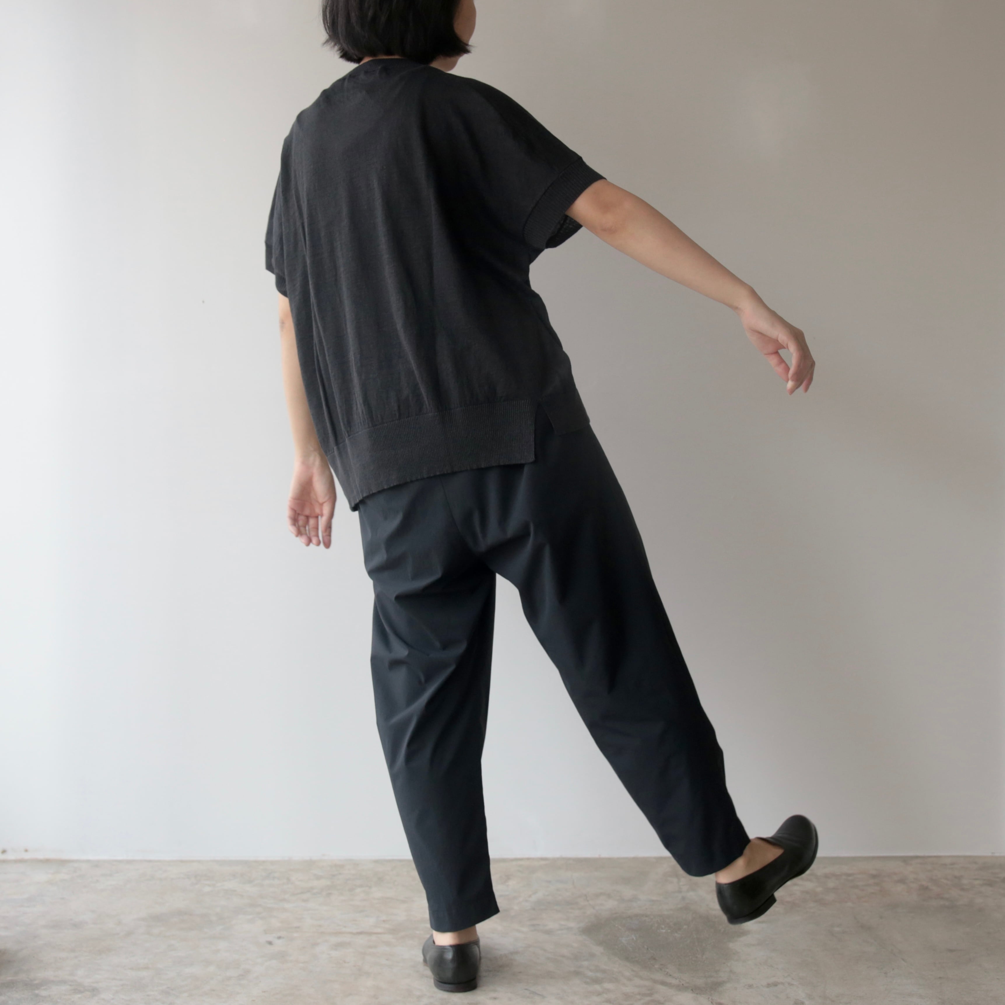 ややドロップした肩のラインと、袖口から裾にかけて施されたリブの切り替えが、さりげないアクセントに。肩まわりや腕を自然にカバーしてくれる絶妙な袖丈は、安心感がありながらも見た目に重さを感じさせることなく着て頂けます。