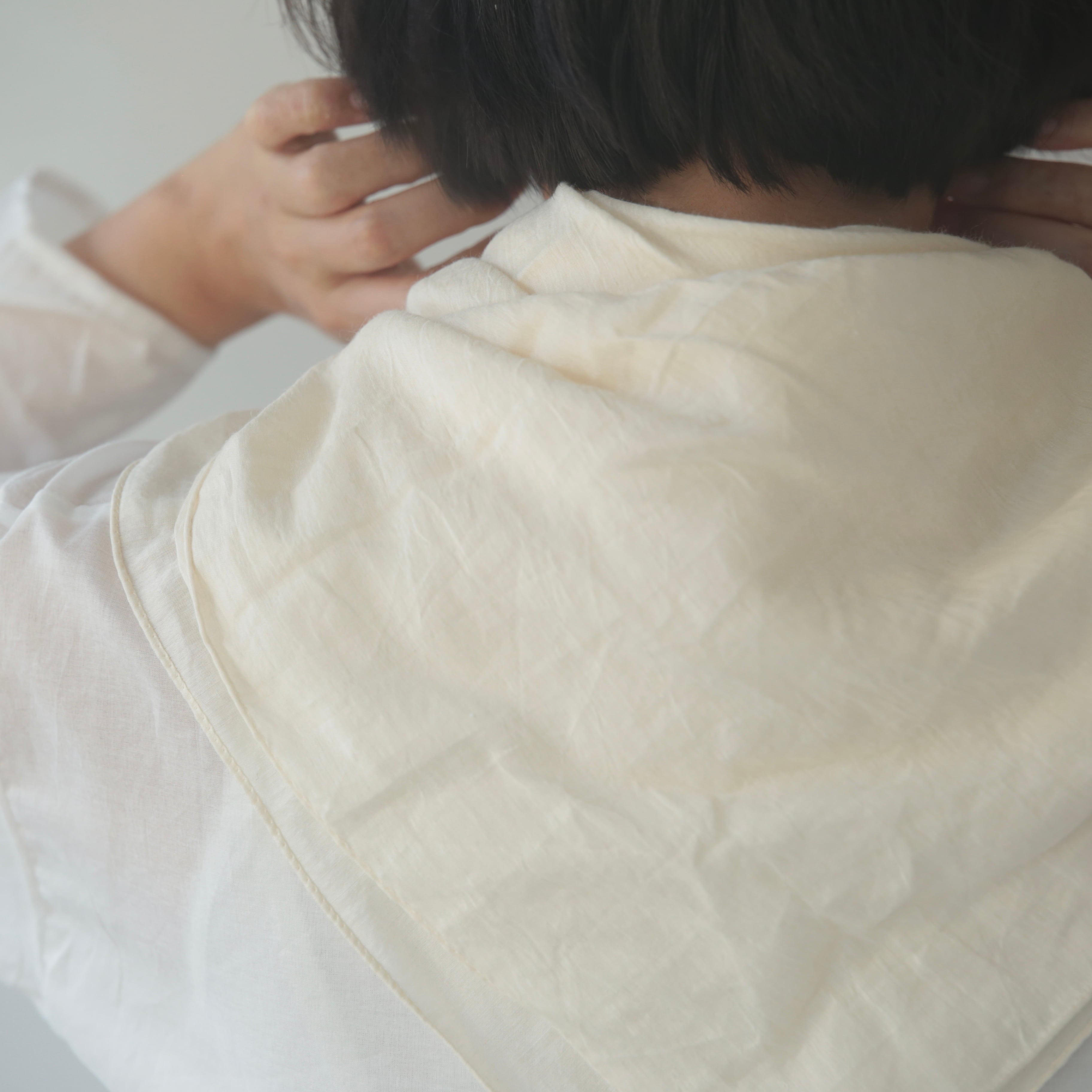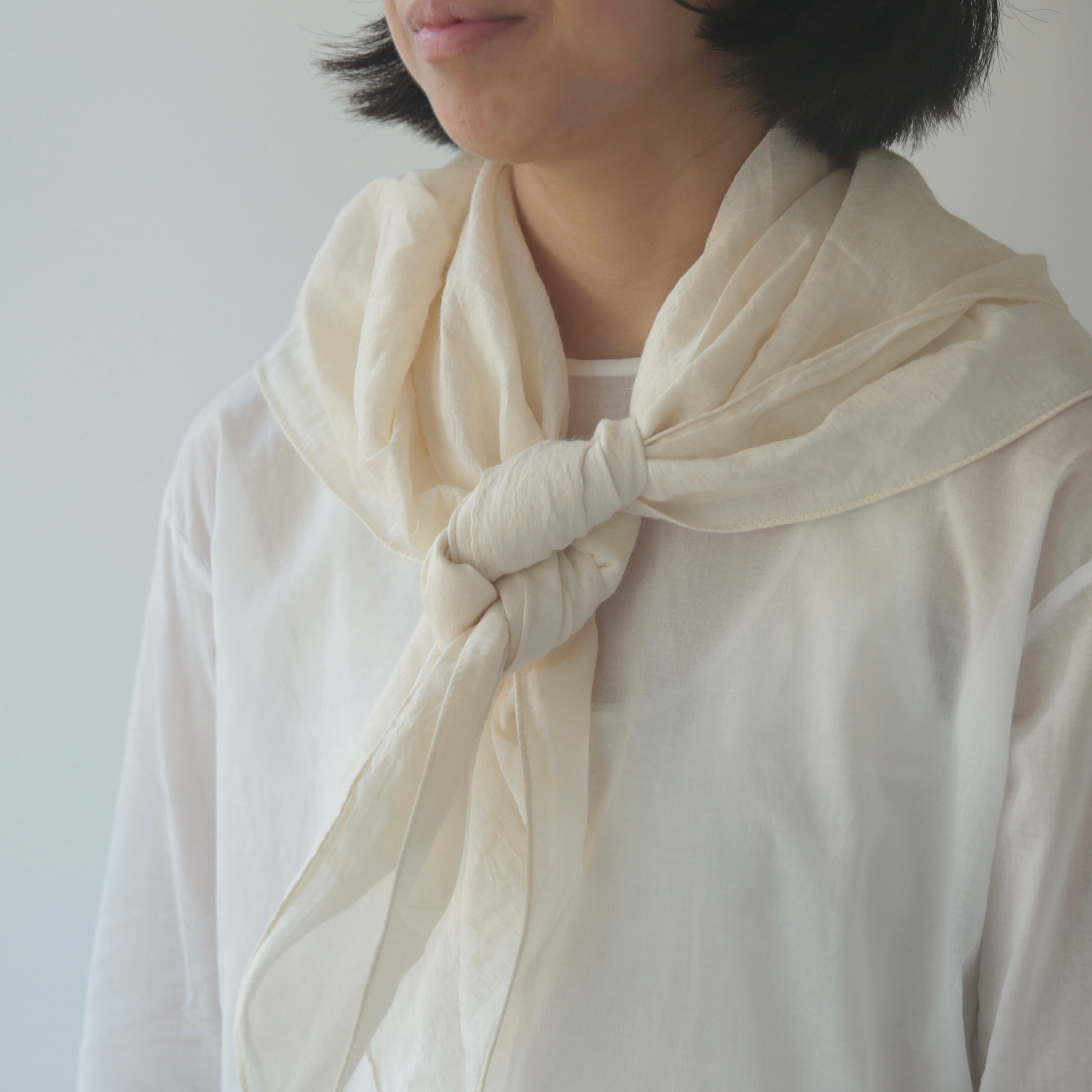 ふわりと軽く、風をまとうようなラミーコットンスカーフ。大判サイズながら、薄くやわらかな肌ざわりで、首もとにやさしく馴染みます。使うほどにくったりとした風合いが増し、涼しげな質感が夏の装いに心地よい彩りを添えてくれます。顔まわりをやわらかく、そして明るく見せてくれるのも魅力。日差しよけや冷房対策にも、季節を問わずそっと寄り添ってくれる一枚です。