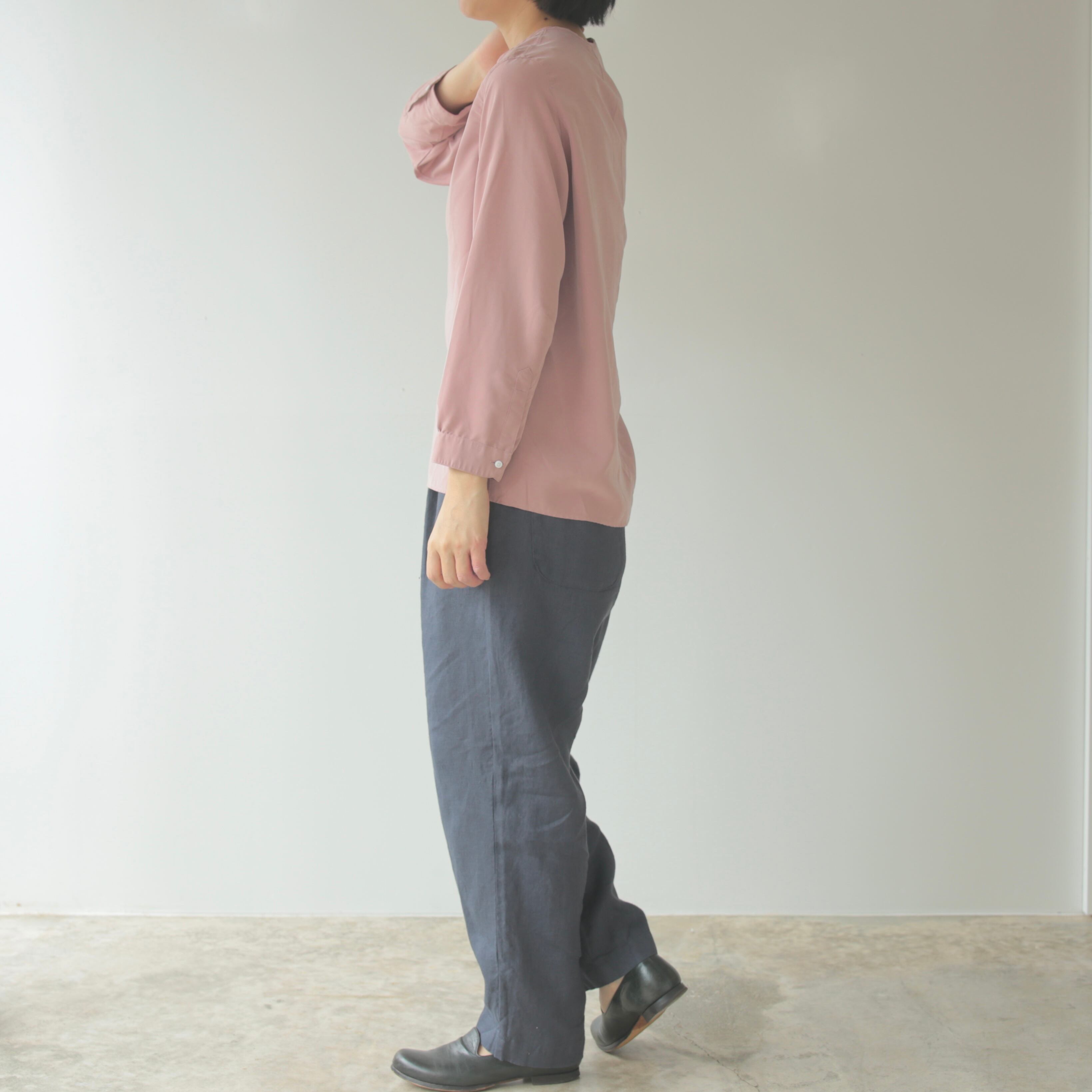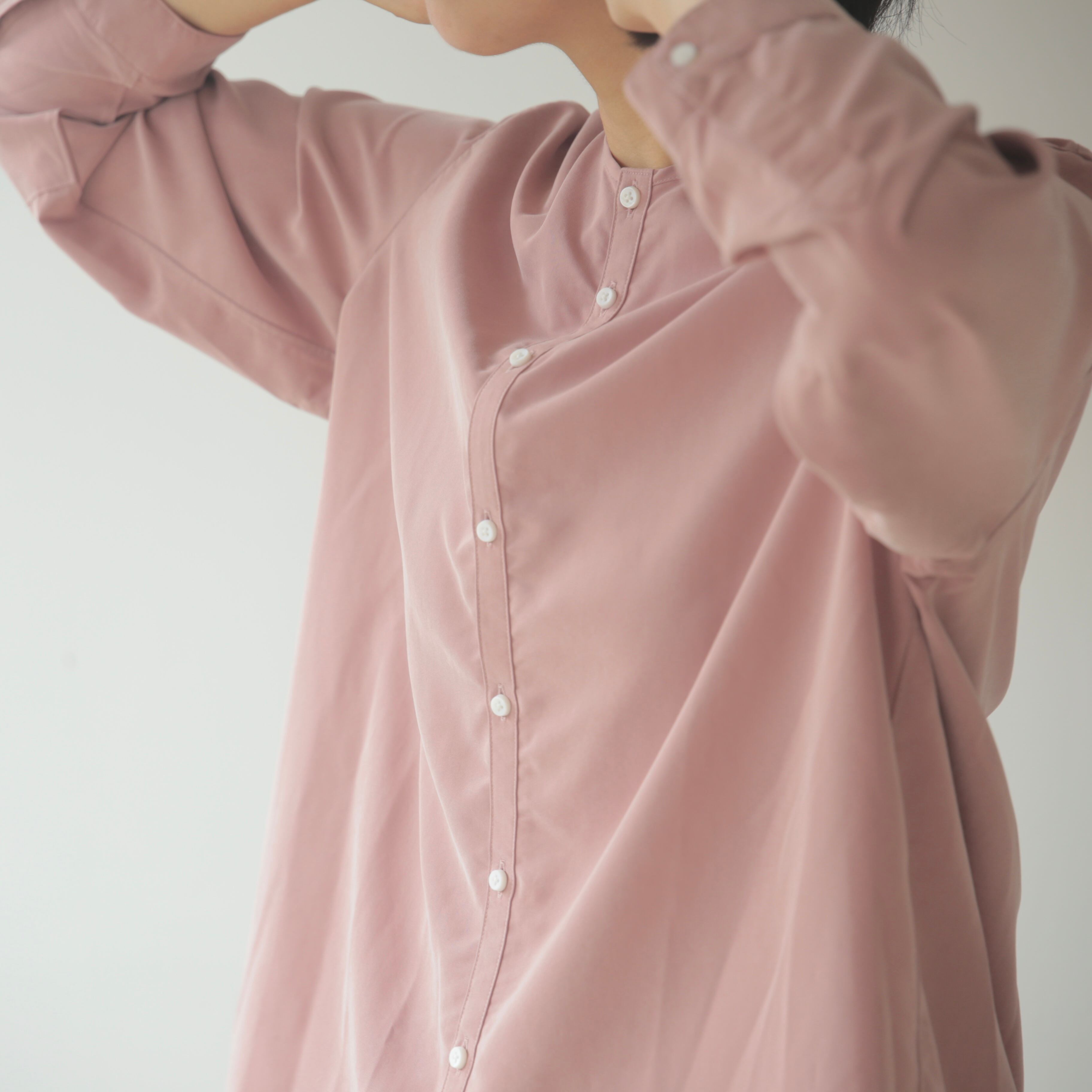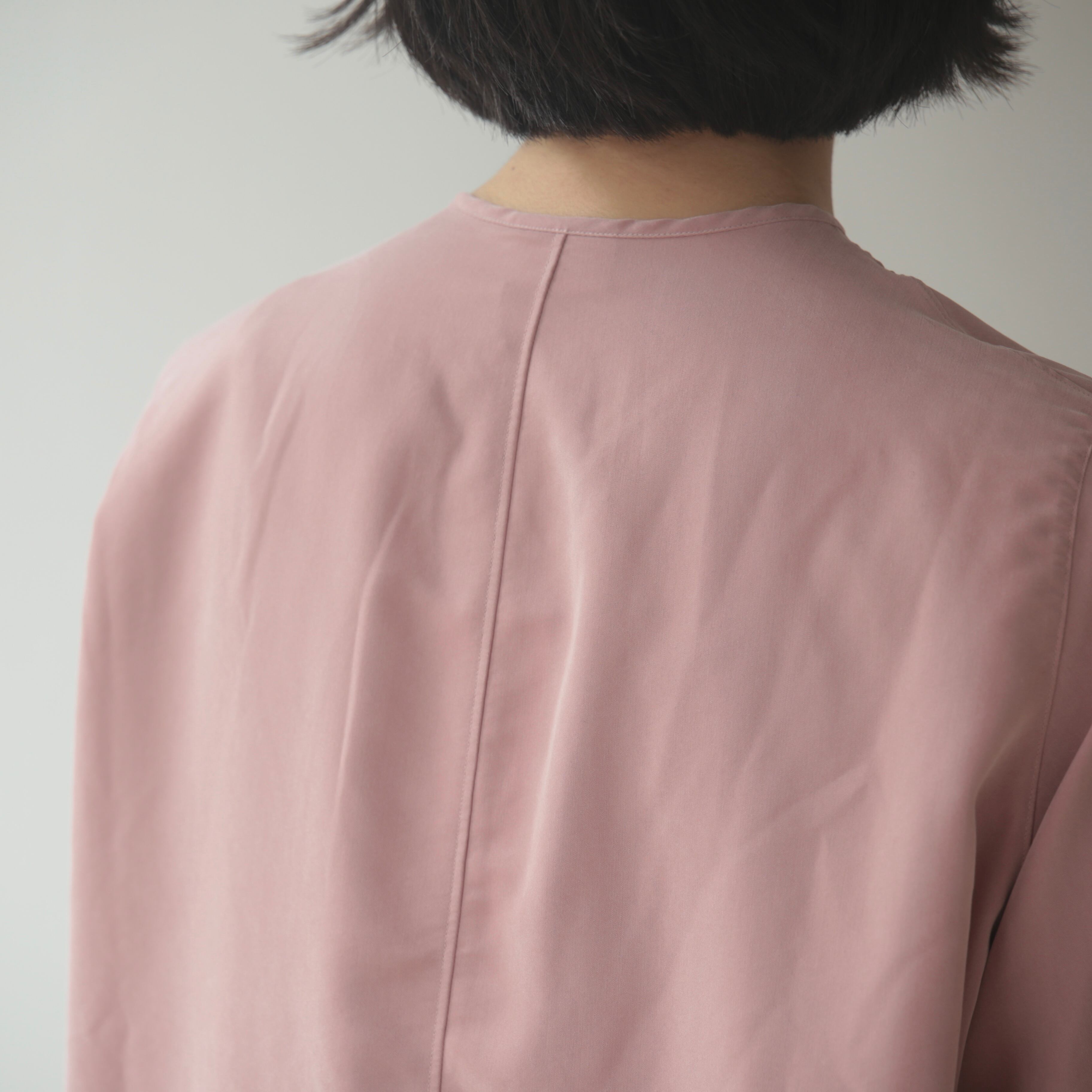レーヨンにほんのりと毛羽立ちを加えたフィブレル加工の生地は、なめらかな肌触りと、わずかに光を含んだようなやさしい艶が魅力です。まるで赤ちゃんの肌に触れるようなやわらかさと、すとんと落ちる自然なドレープが、着る人の動きにしなやかに寄り添います。