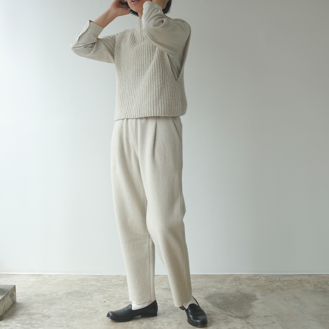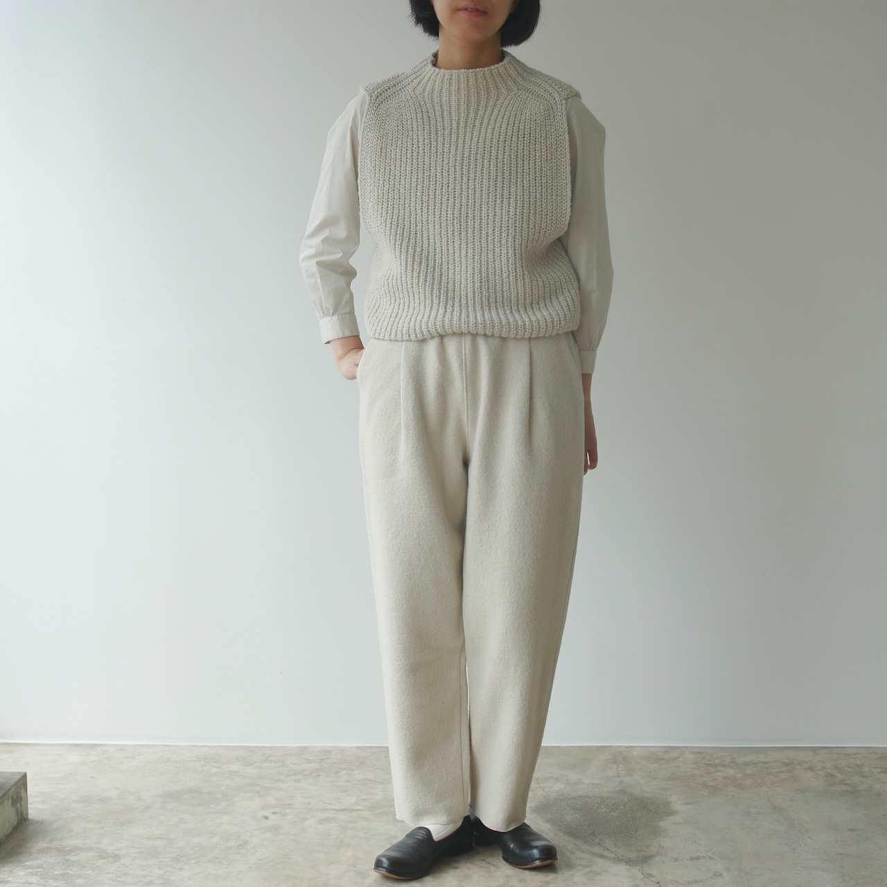 ベビーアルパカとウールの毛羽立ちを抑え、滑らかさを引き出した畦編みのニットベスト。程よい厚みと畦の表情、ニュアンスのあるカラーが、奥行きを感じます。