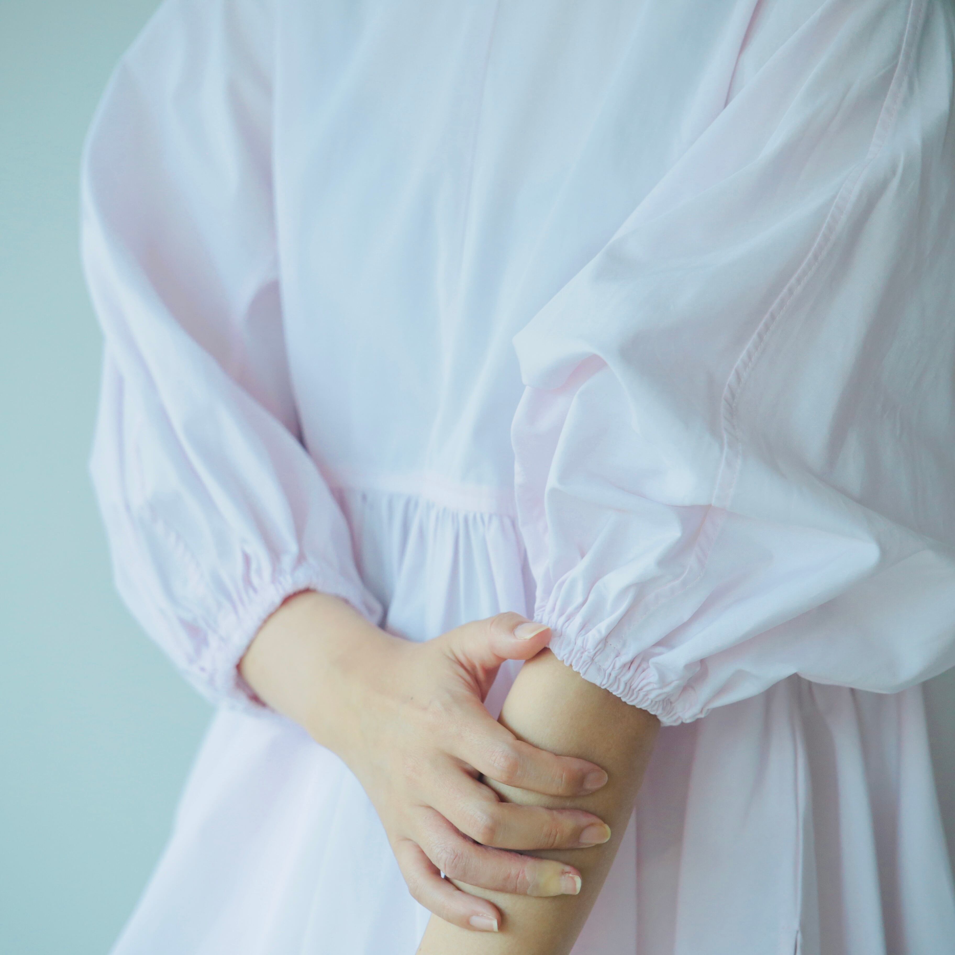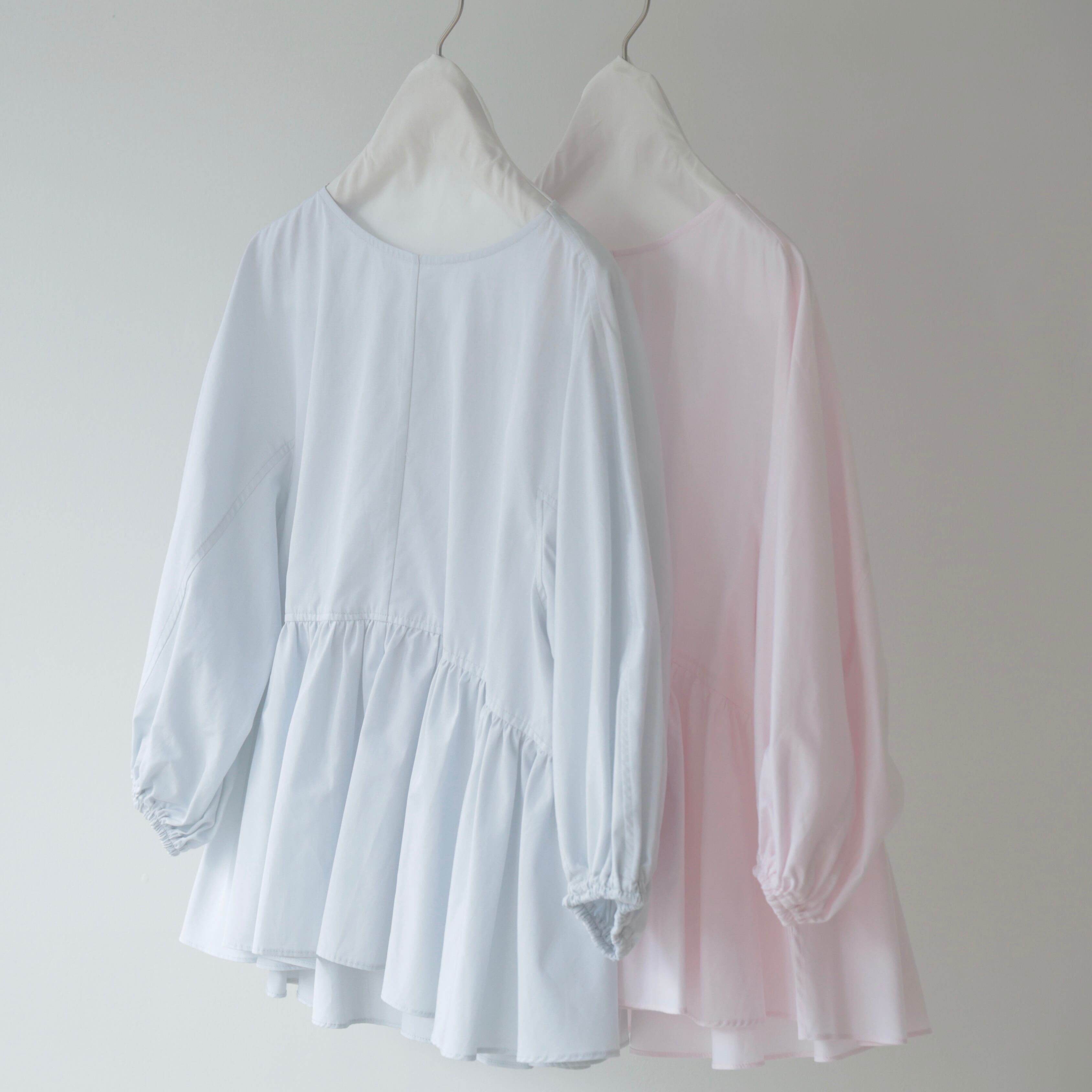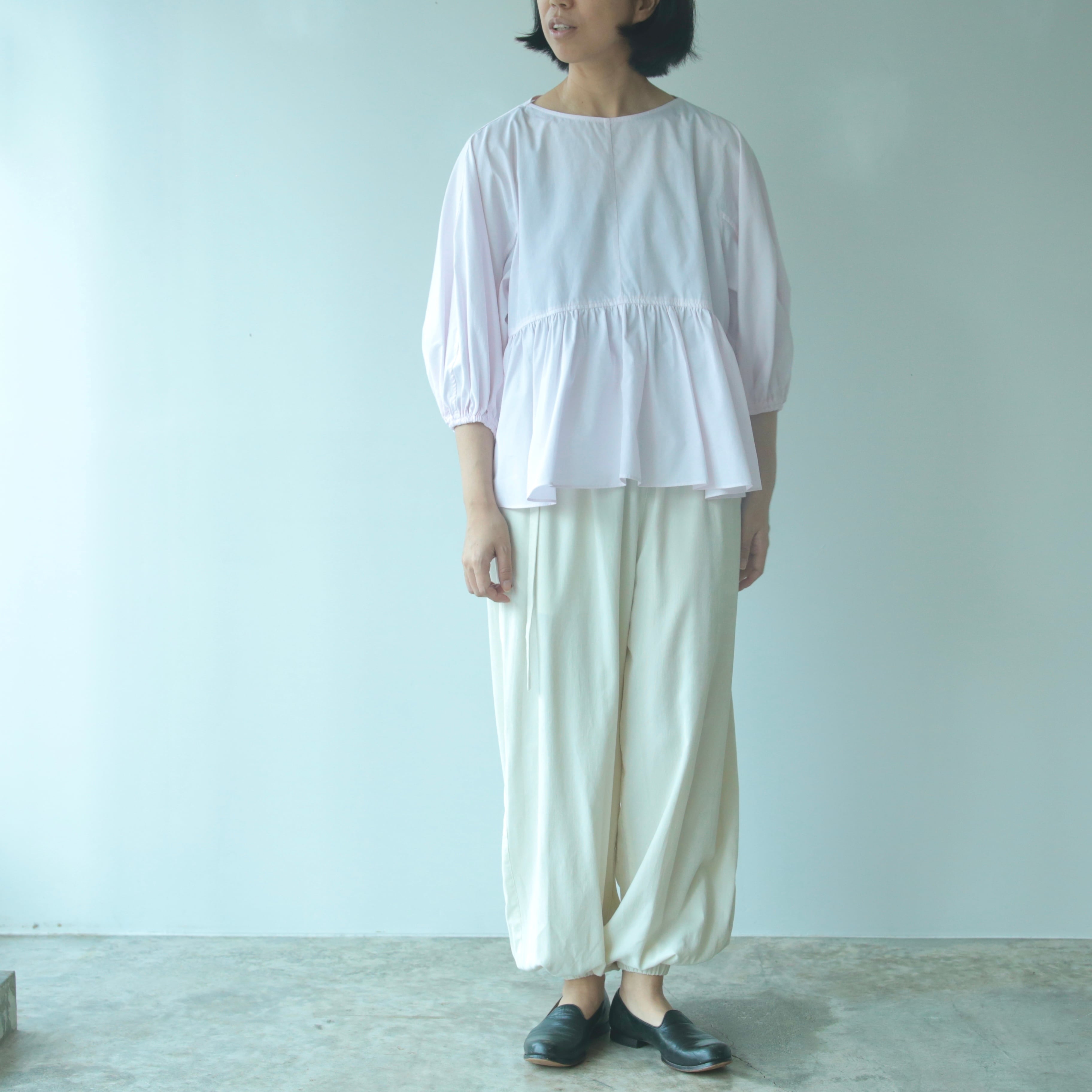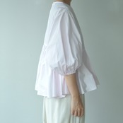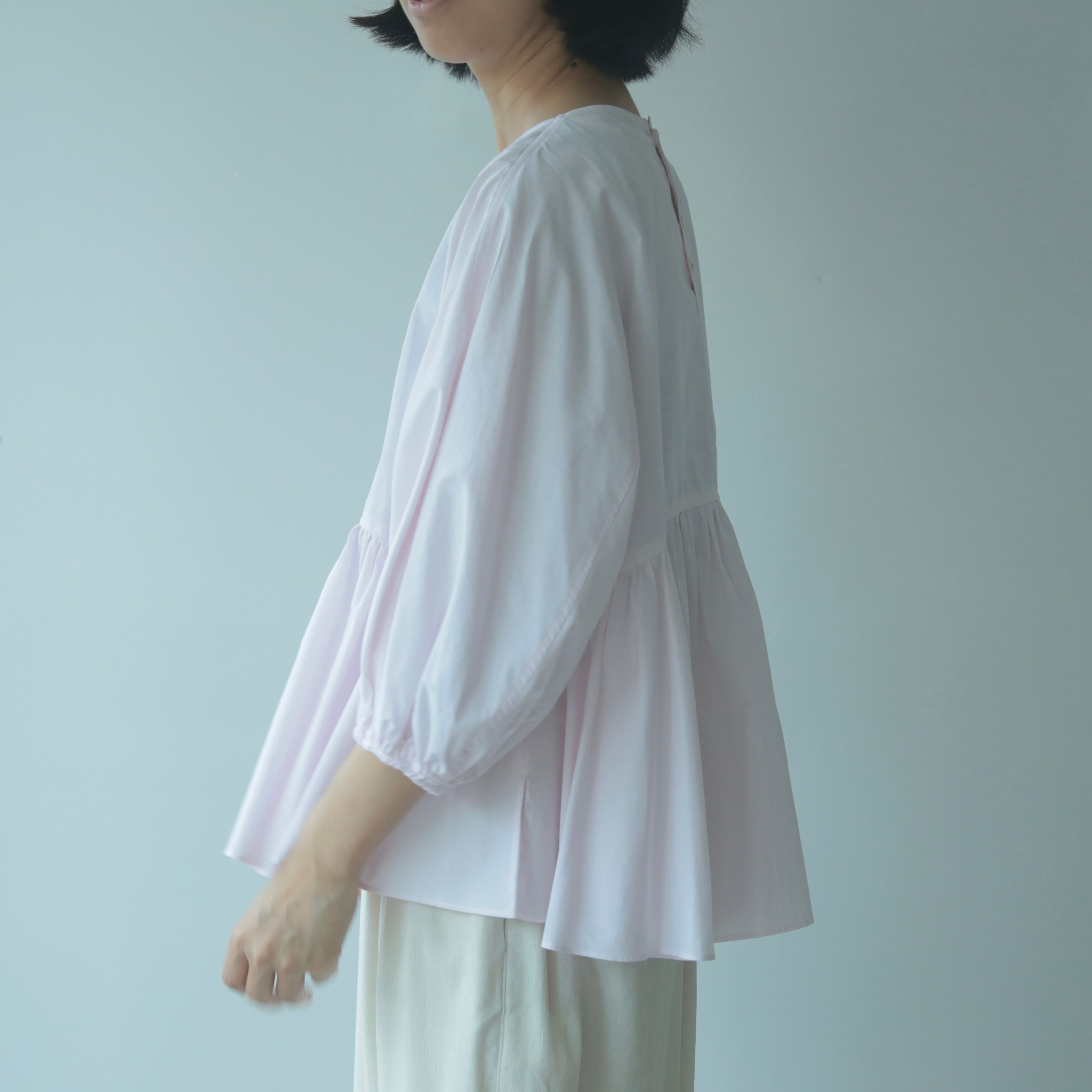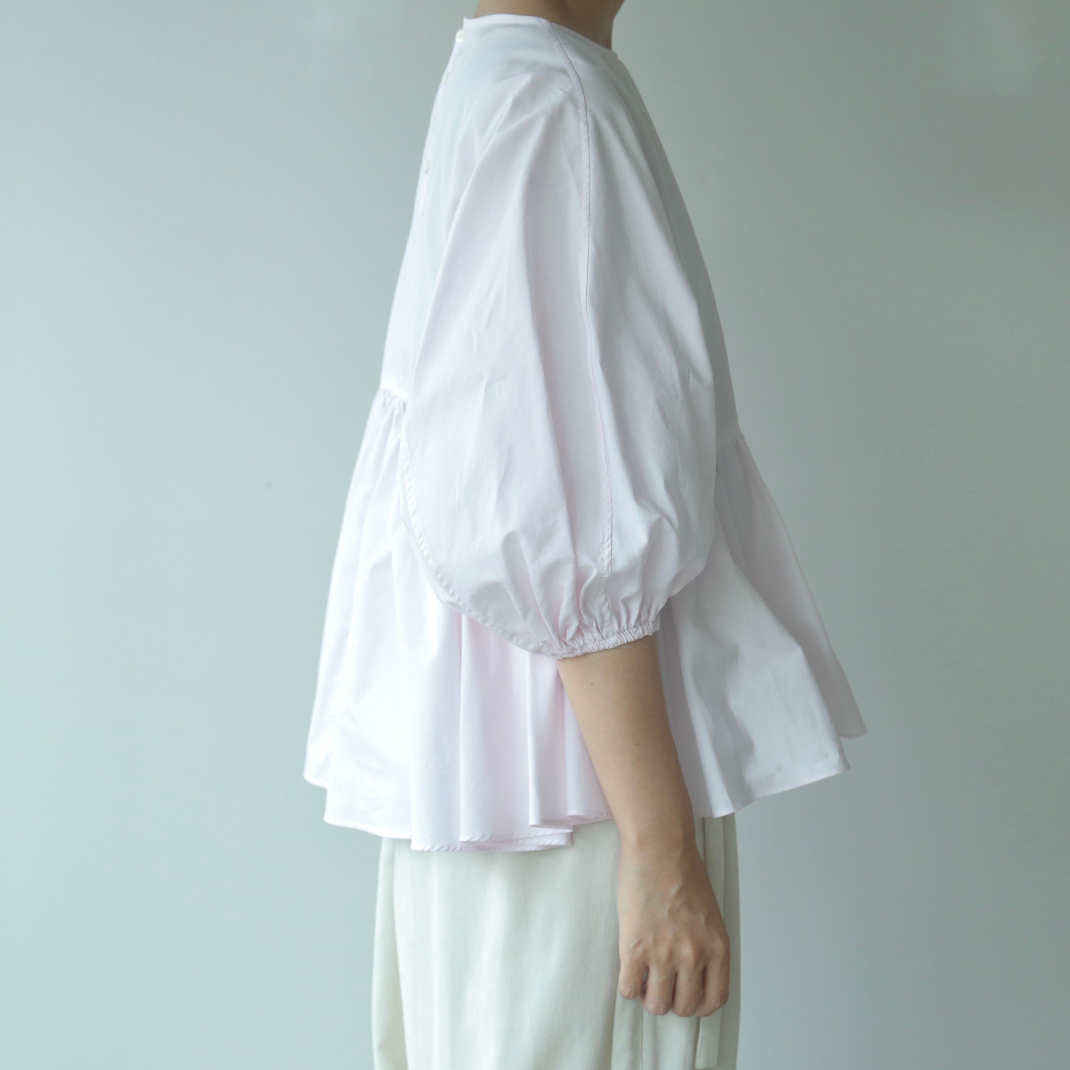 前後にたっぷりと寄せられたギャザーは、花びらのように整った美しいシルエットを描きます。丸みを帯びたフォルムは、胸元の切り替えや袖に立体感を与え、着る人を柔らかく包み込みます。袖口にはゴムを施しており、少し上げて袖に丸みを持たせると、より愛らしい印象に。