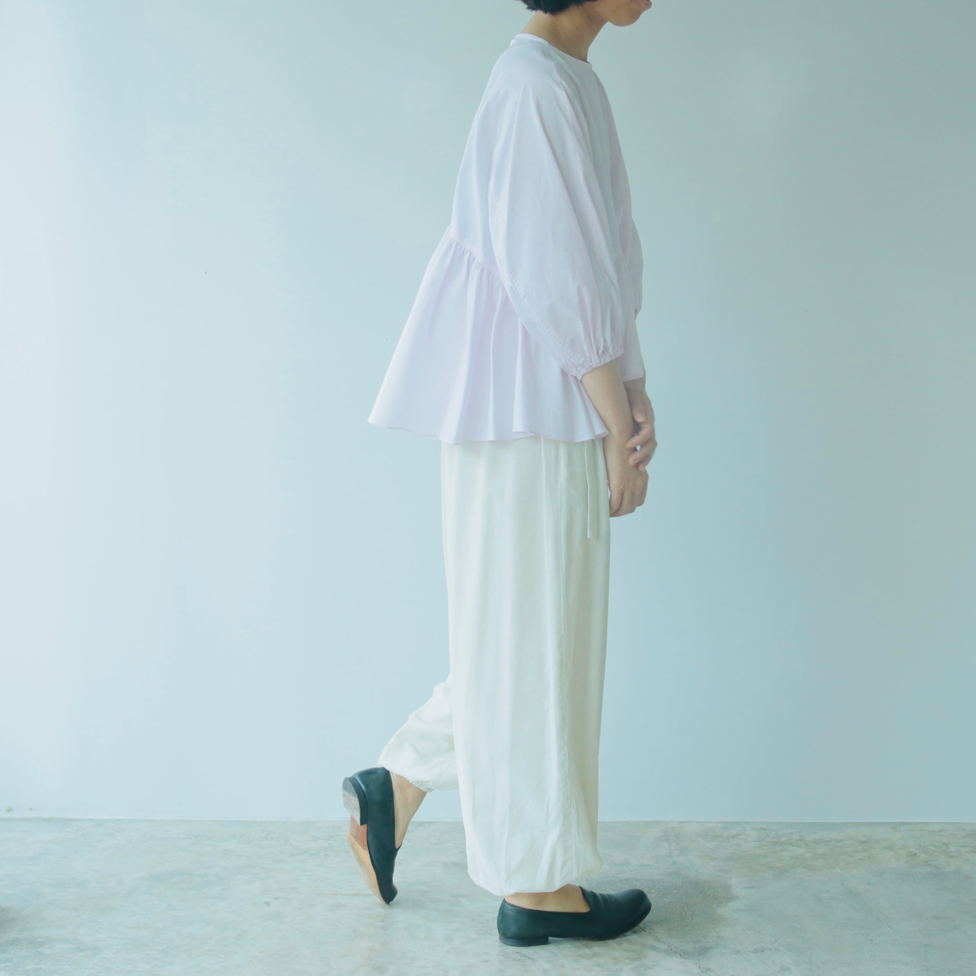 生地を変えながら展開されているギャザープルオーバー。私自身もとても気に入っている形のひとつで、今季は品のある艶と滑らかさに定評のあるイギリス・トーマスメイソン社の生地を使用しています。