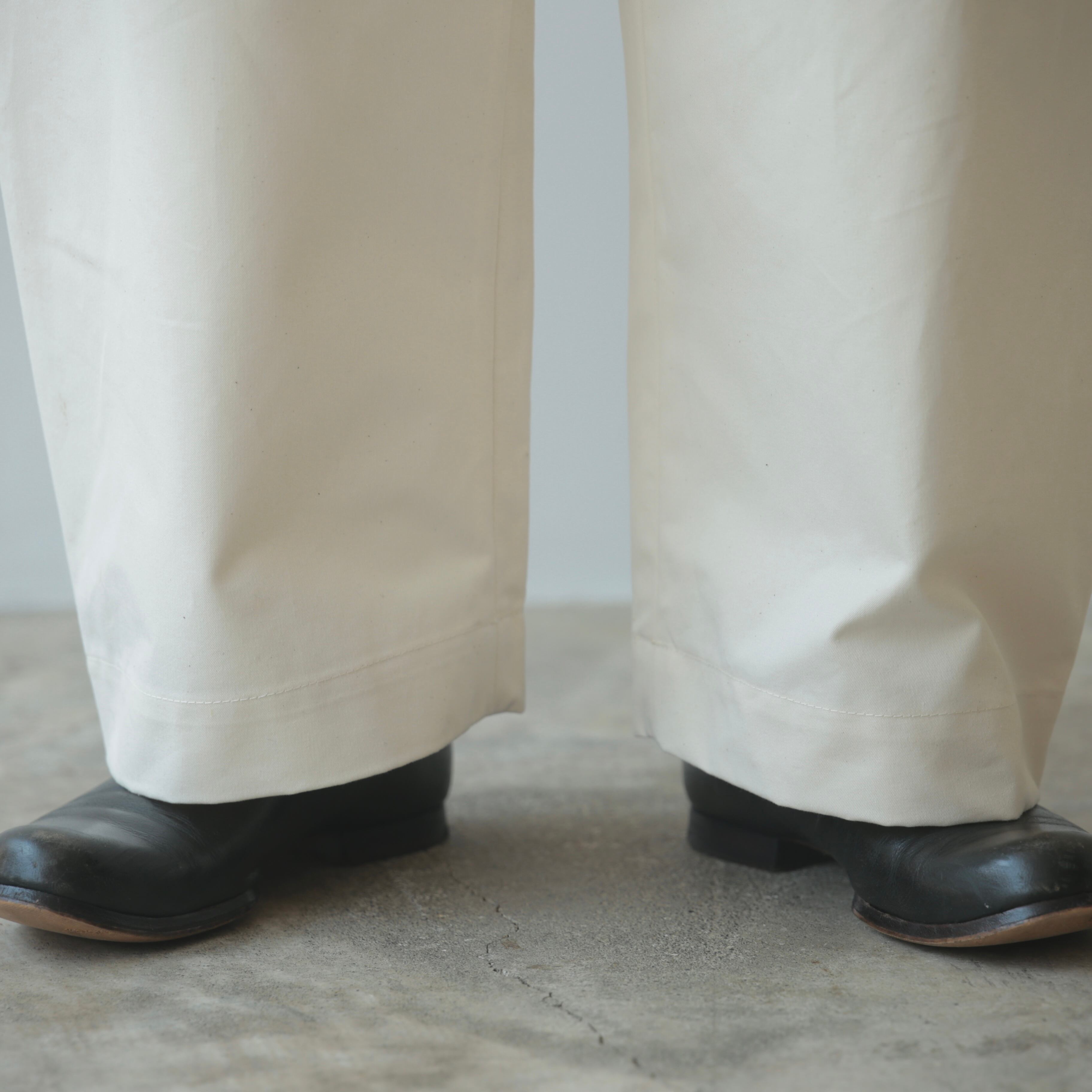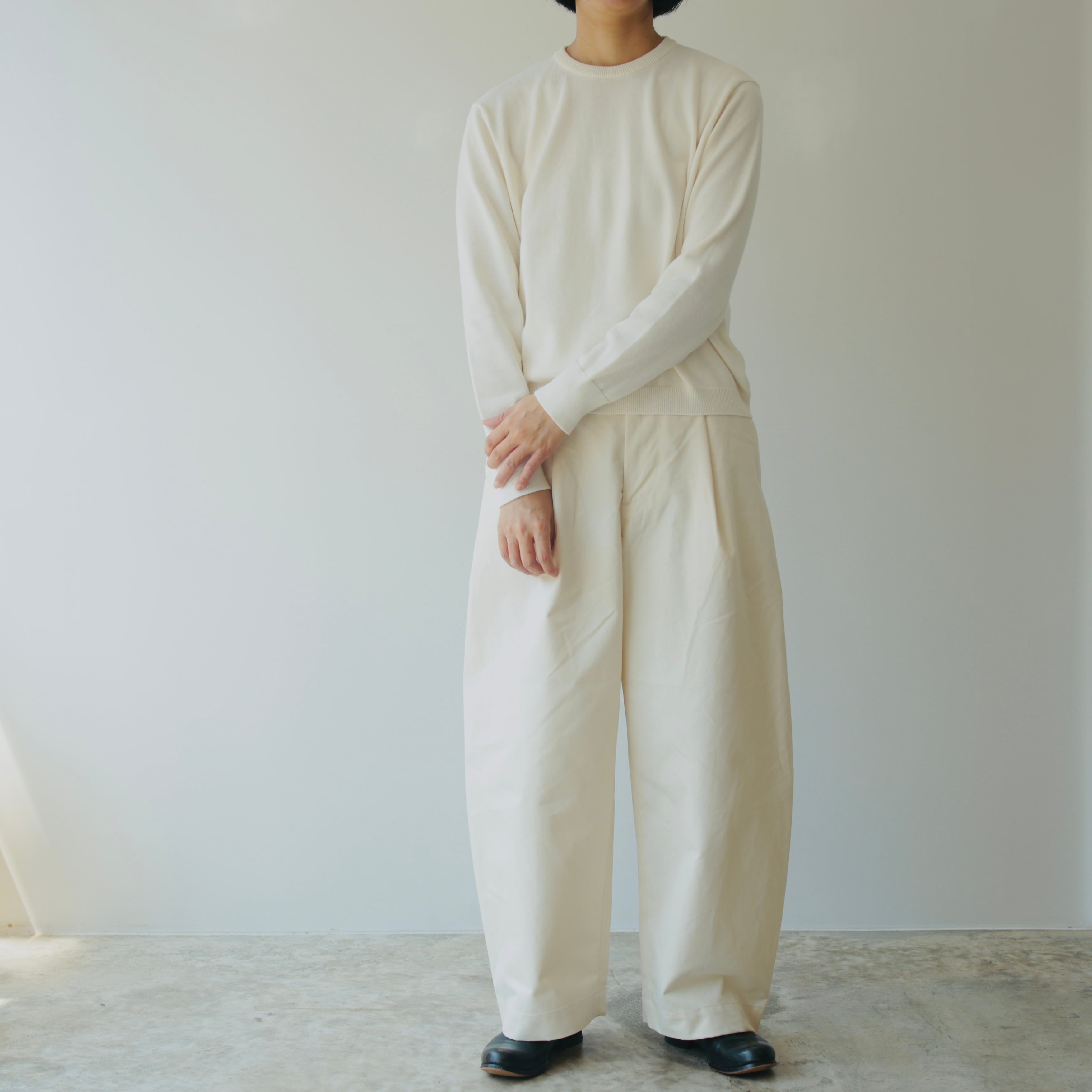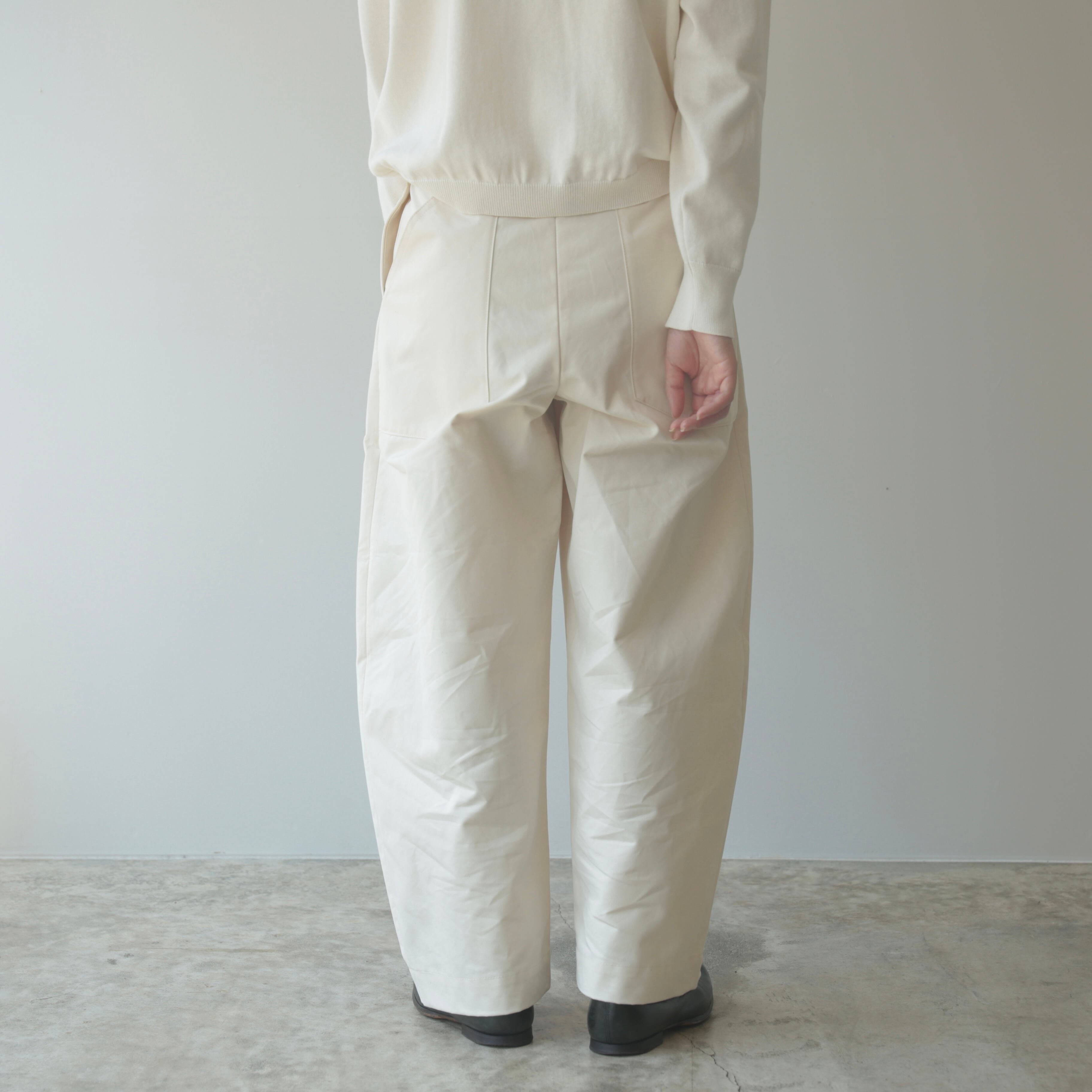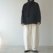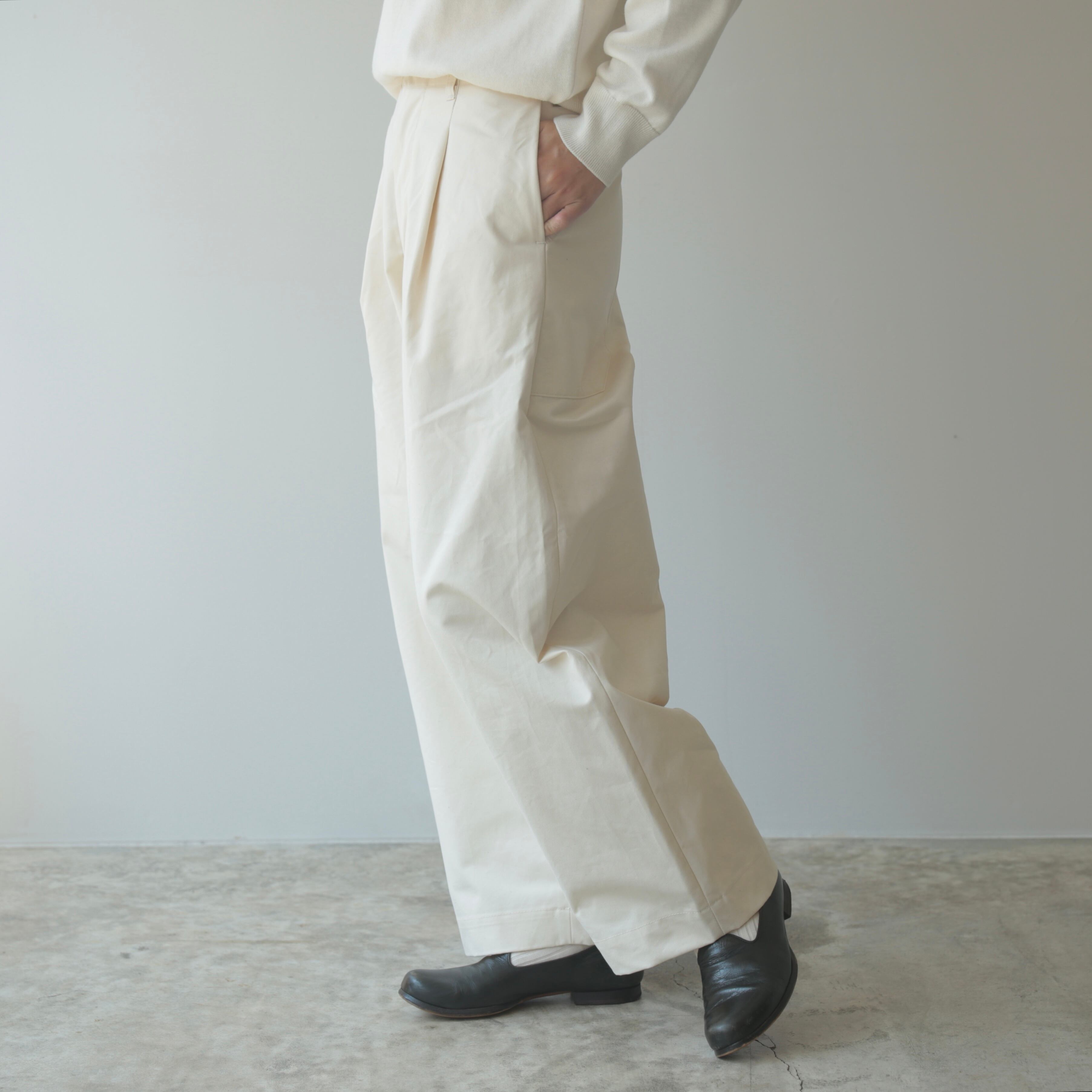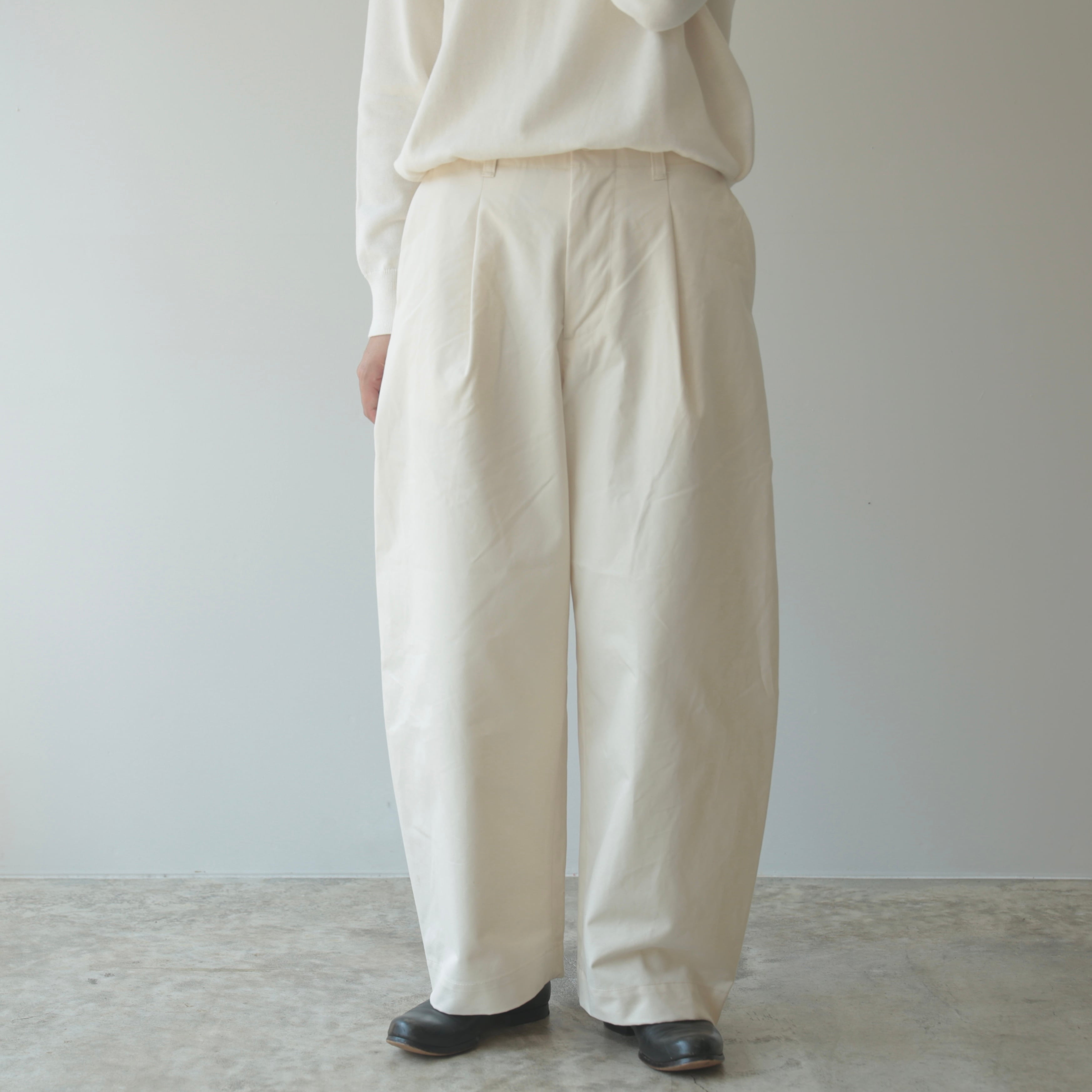 ワイドシルエットながら、お尻まわりをすっきりと見せる工夫が施された一本。深めのワンタックにより、脚をまっすぐ美しく見せ、横からのラインもきれいに映ります。膝下からは緩やかにテーパードが入り、全体は丸みを帯びた柔らかなシルエットに。後ろにはワークパンツを思わせるステッチが効き、シンプルながら存在感を放ちます。