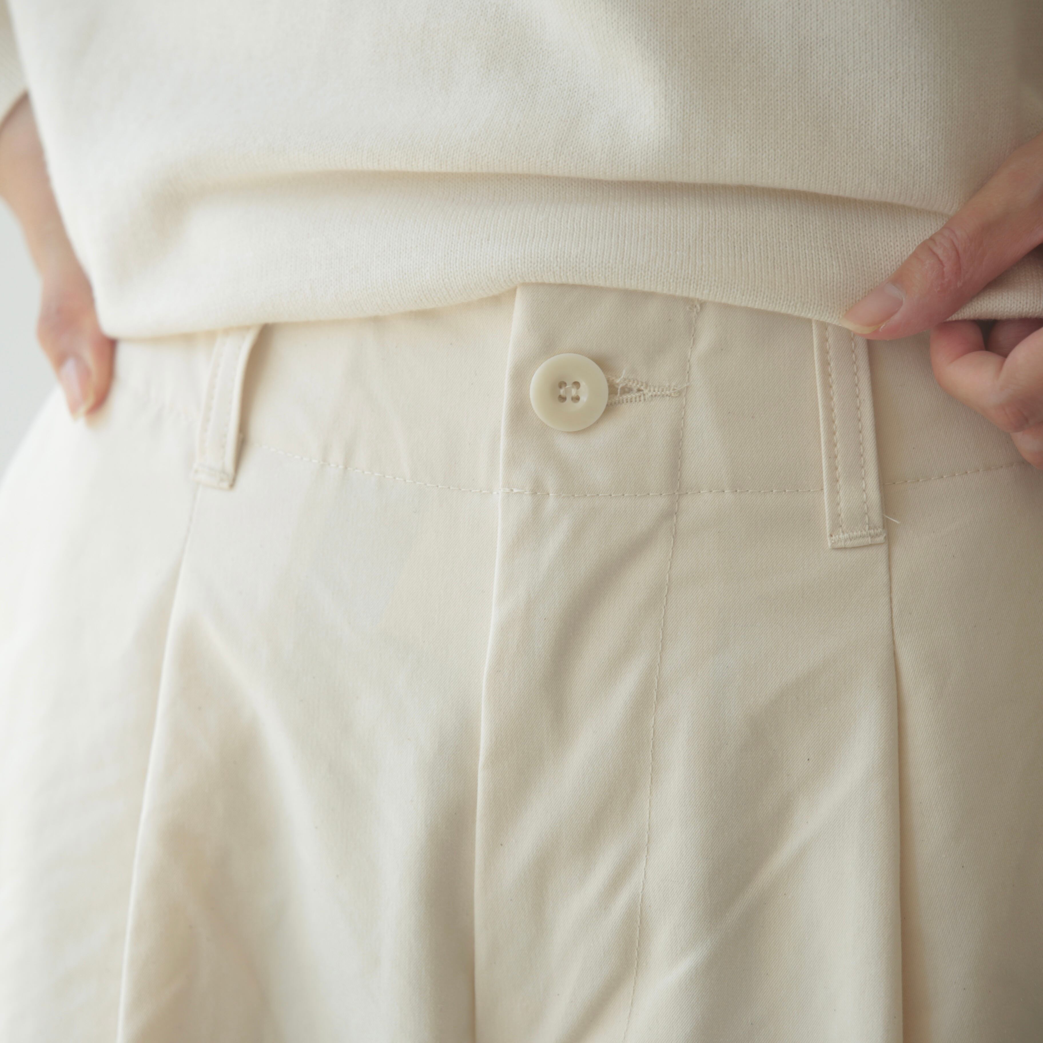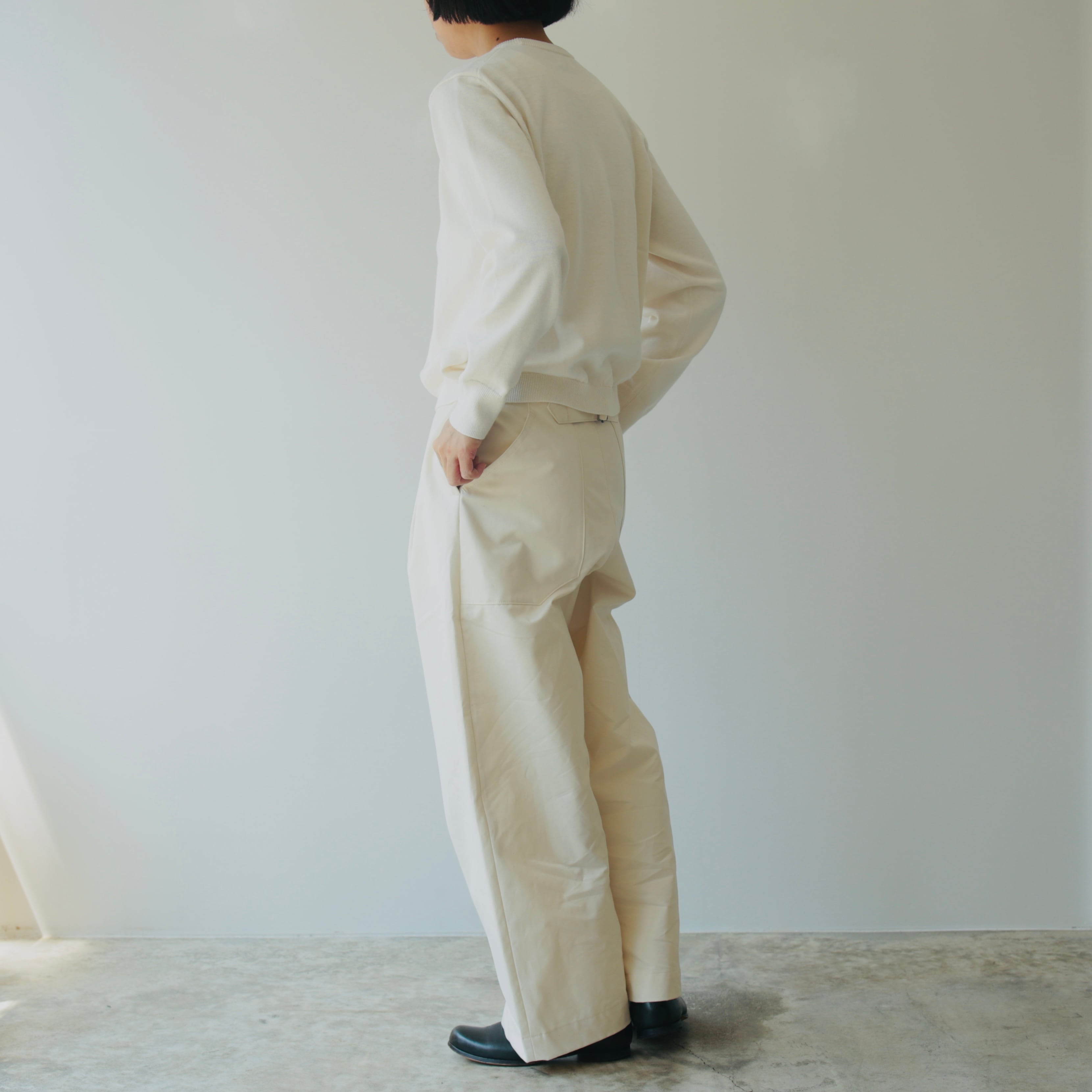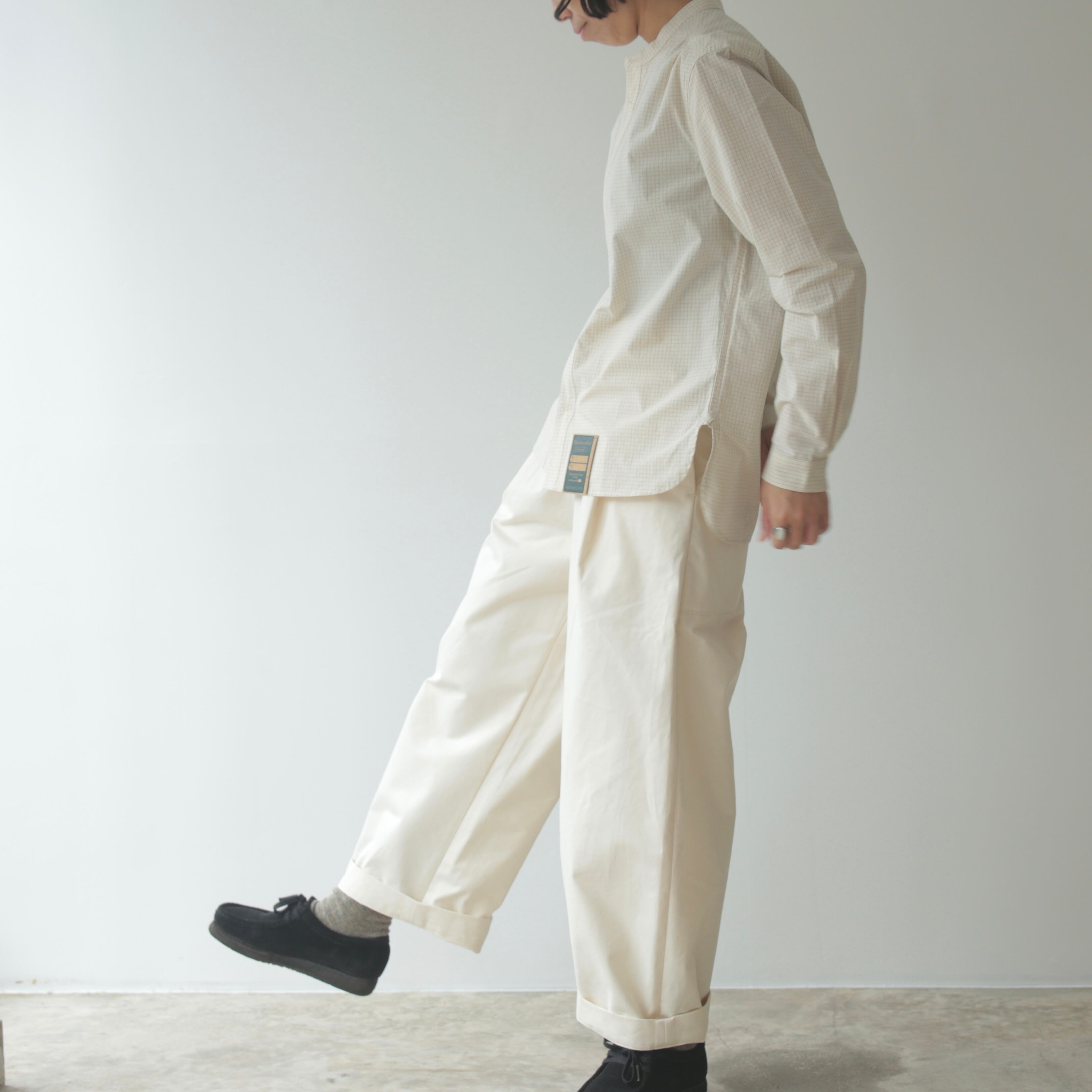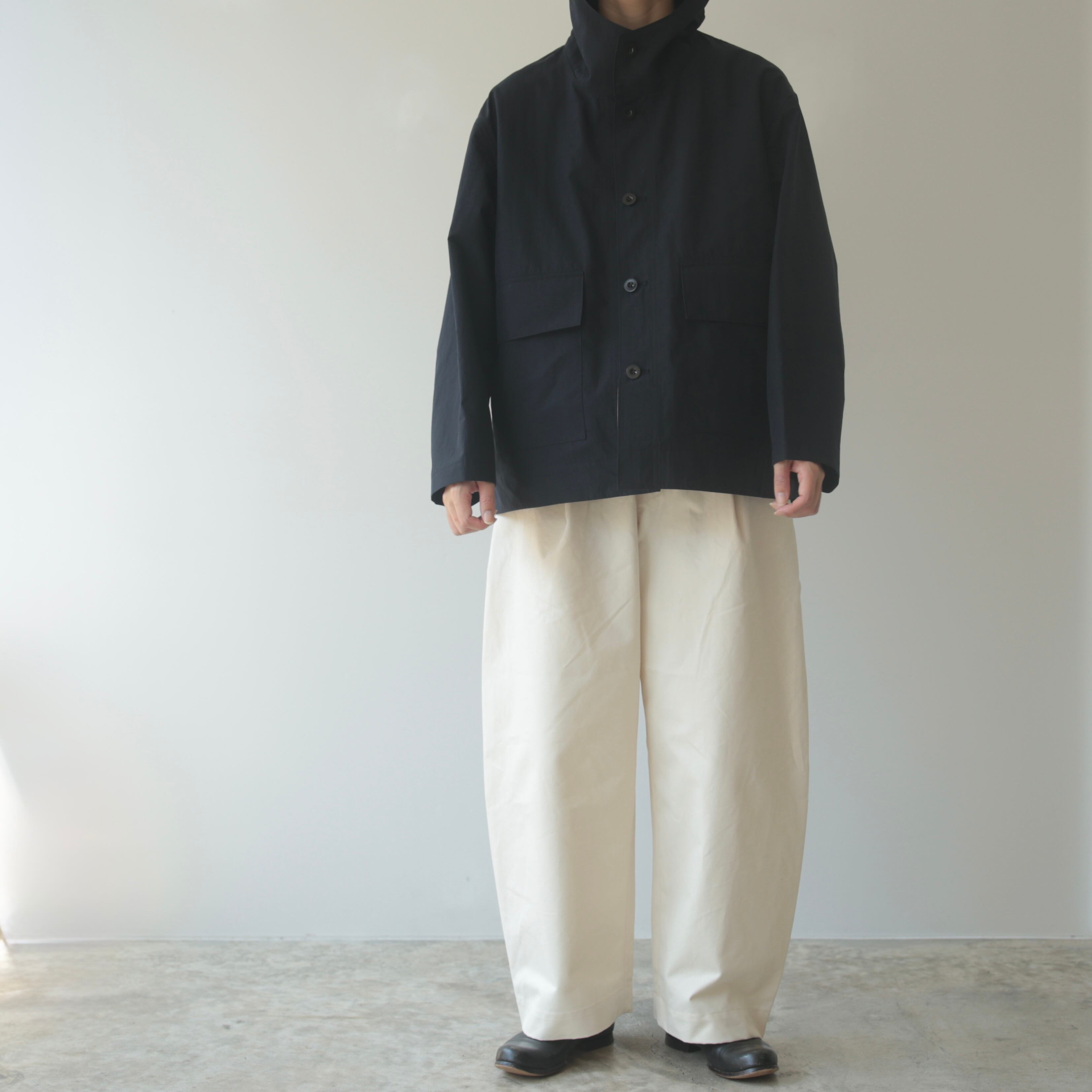ワイドシルエットながら、お尻まわりをすっきりと見せる工夫が施された一本。深めのワンタックにより、脚をまっすぐ美しく見せ、横からのラインもきれいに映ります。膝下からは緩やかにテーパードが入り、全体は丸みを帯びた柔らかなシルエットに。後ろにはワークパンツを思わせるステッチが効き、シンプルながら存在感を放ちます。