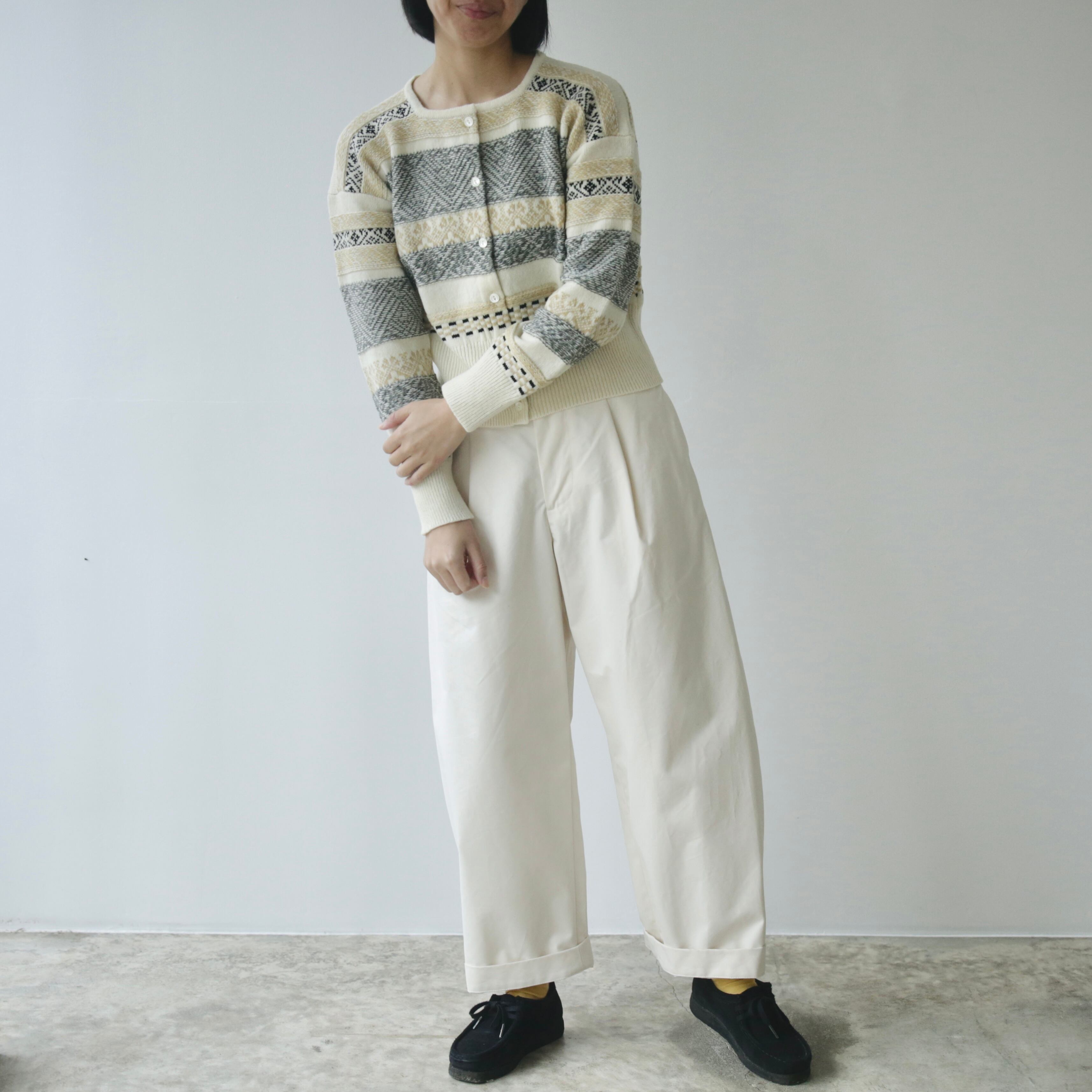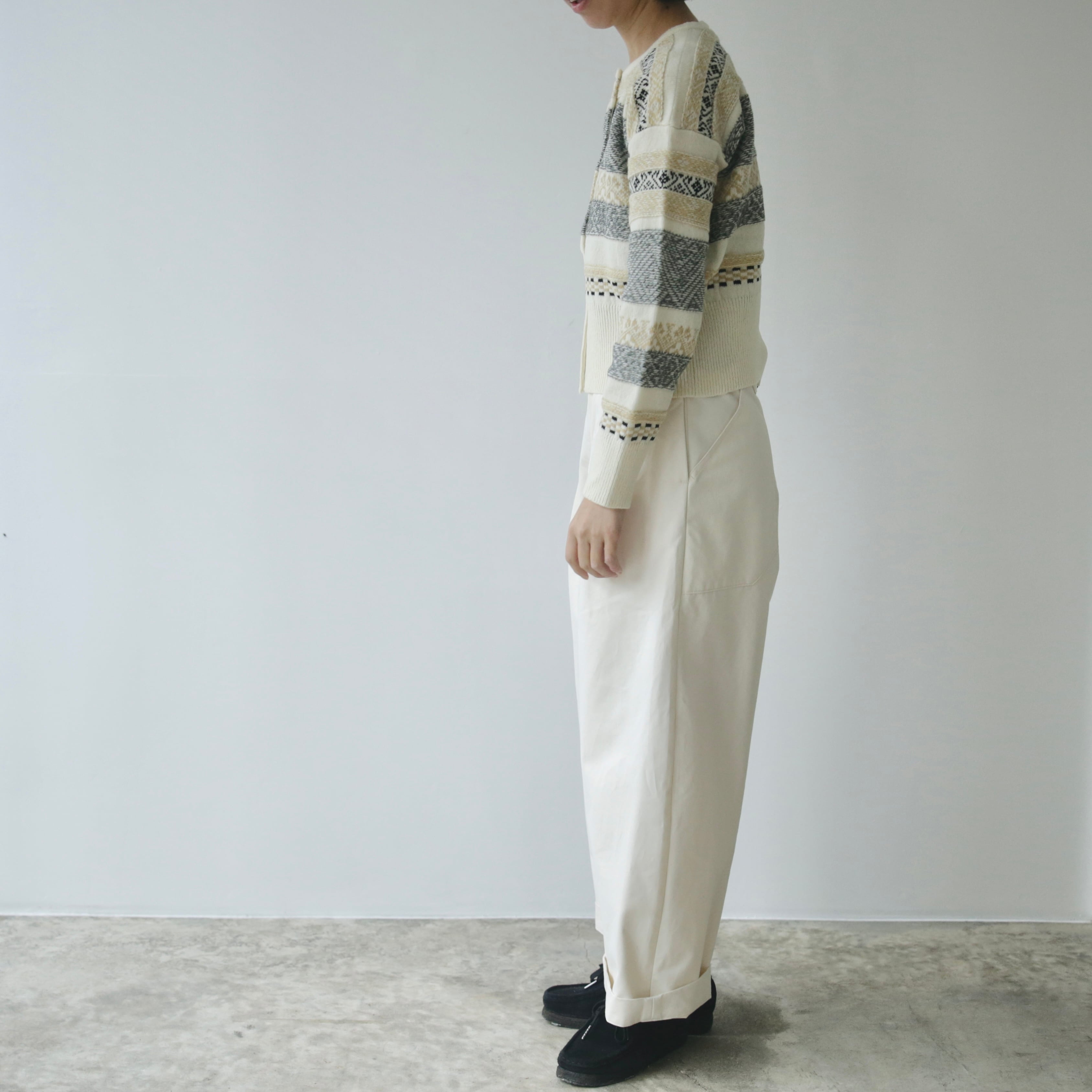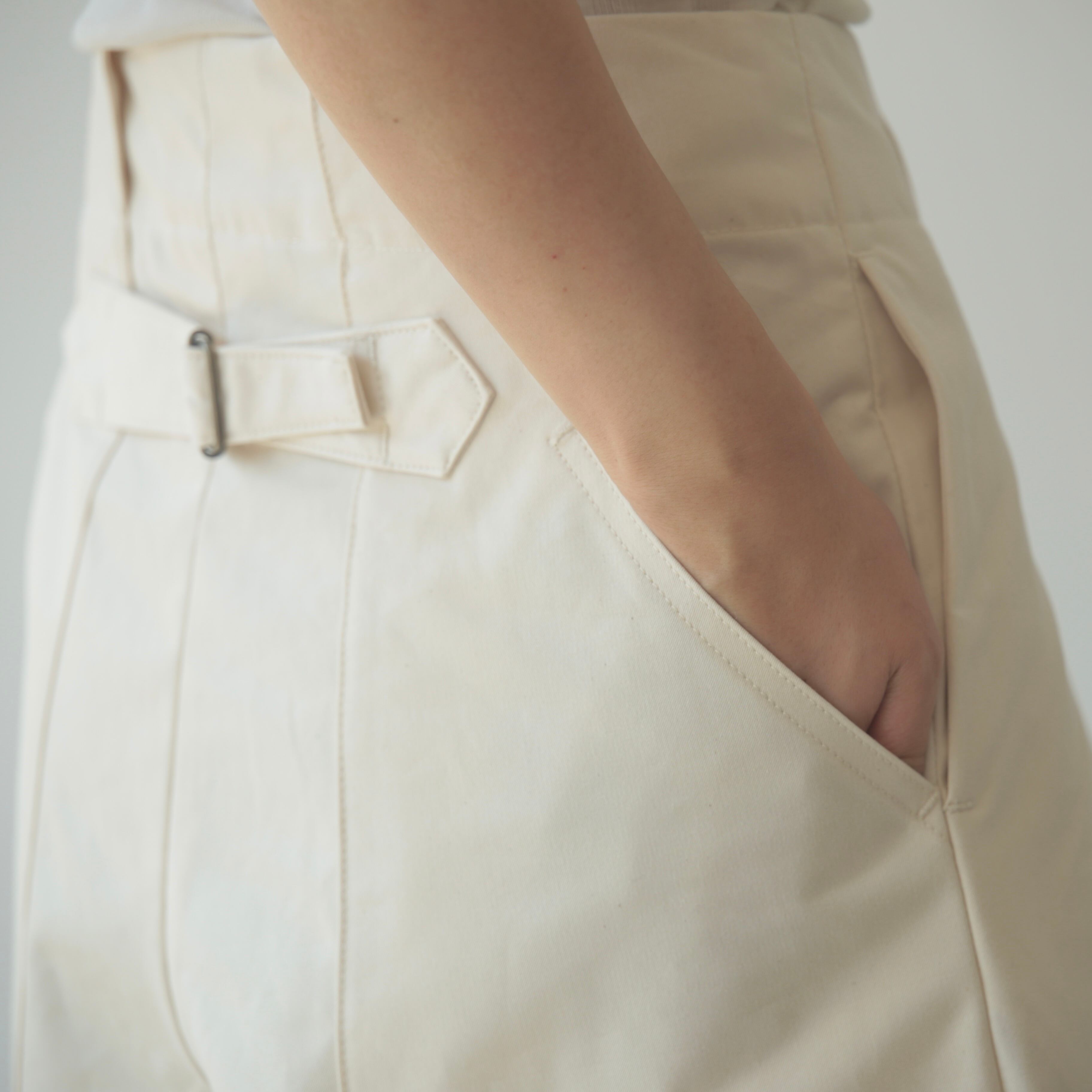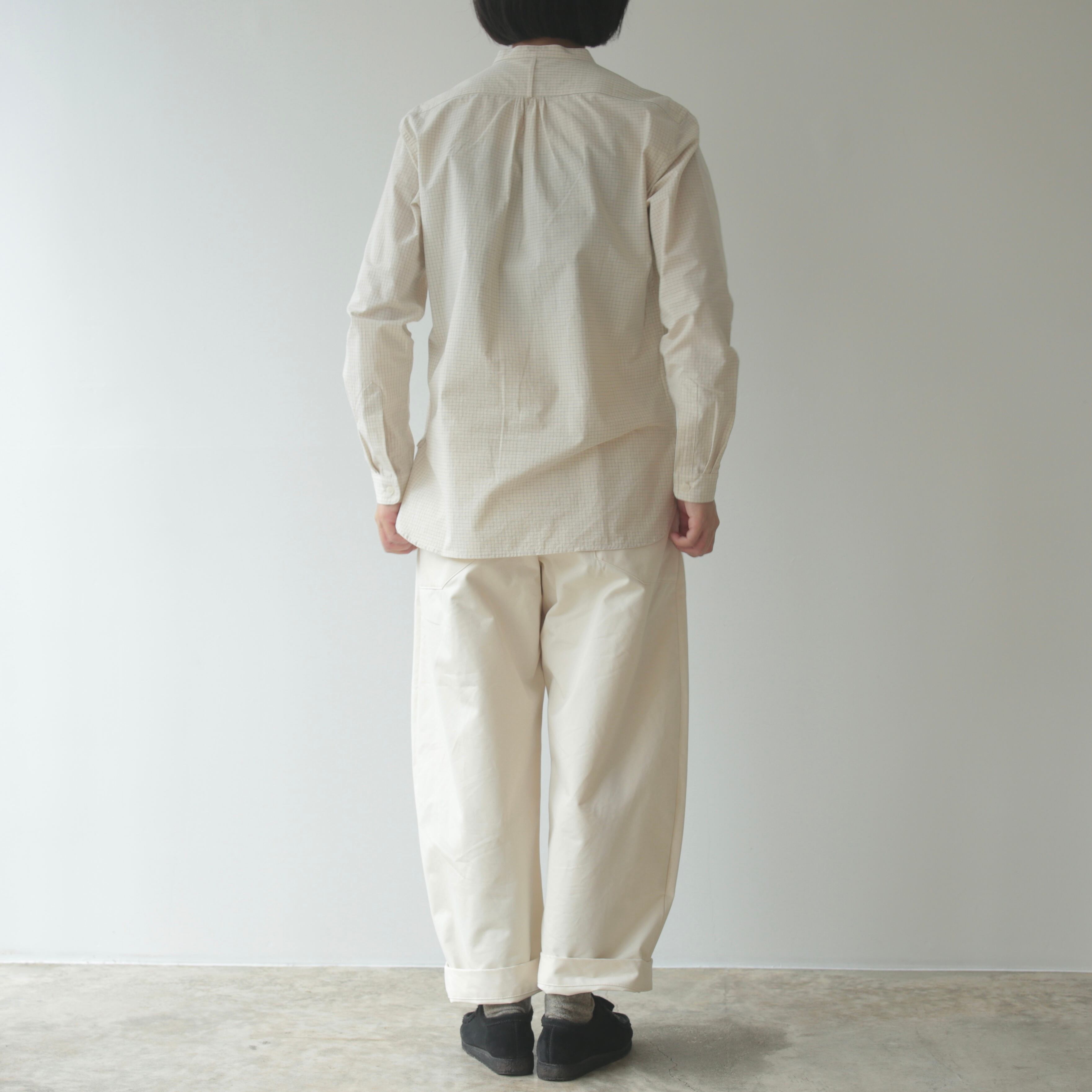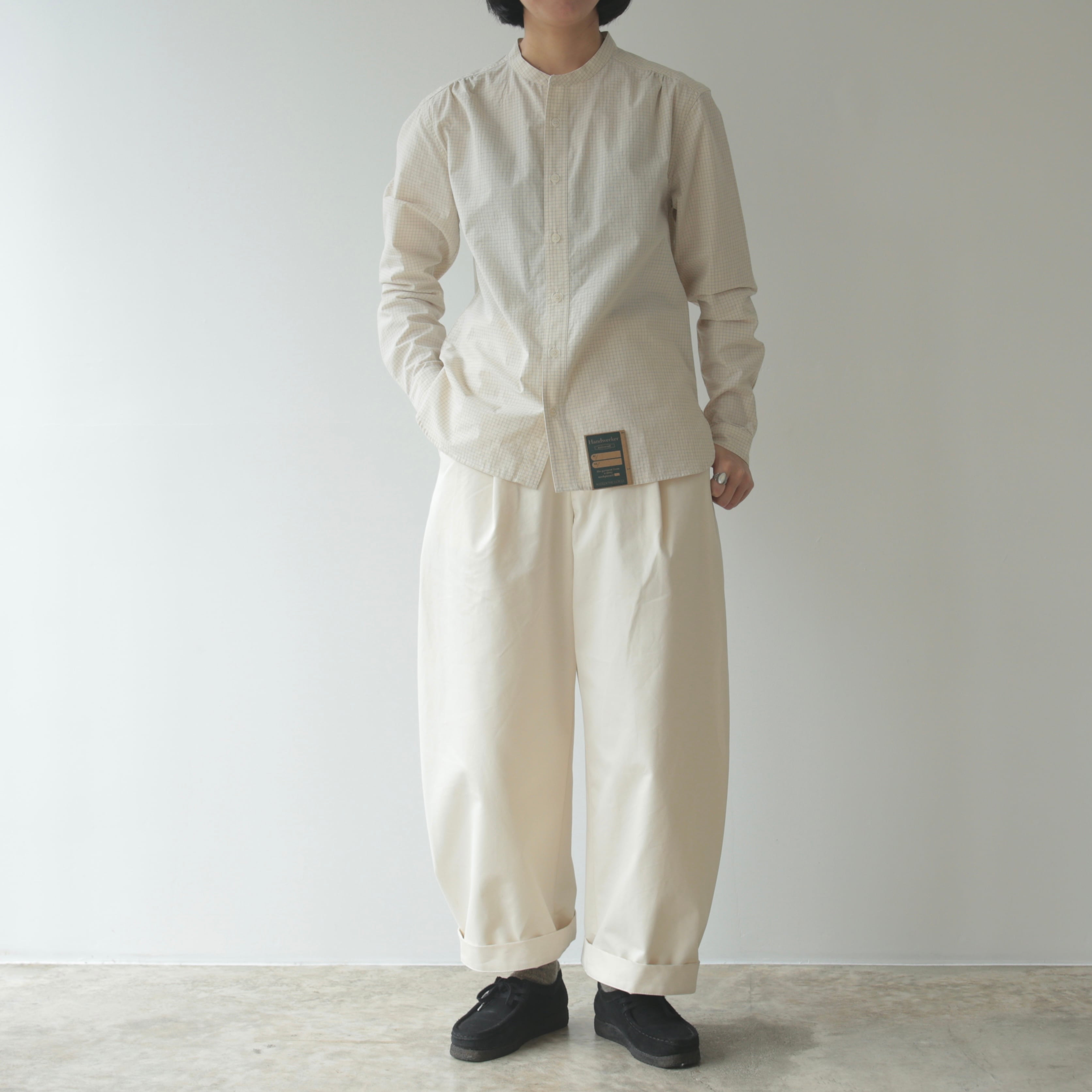 ワイドシルエットながら、お尻まわりをすっきりと見せる工夫が施された一本。深めのワンタックにより、脚をまっすぐ美しく見せ、横からのラインもきれいに映ります。膝下からは緩やかにテーパードが入り、全体は丸みを帯びた柔らかなシルエットに。後ろにはワークパンツを思わせるステッチが効き、シンプルながら存在感を放ちます。