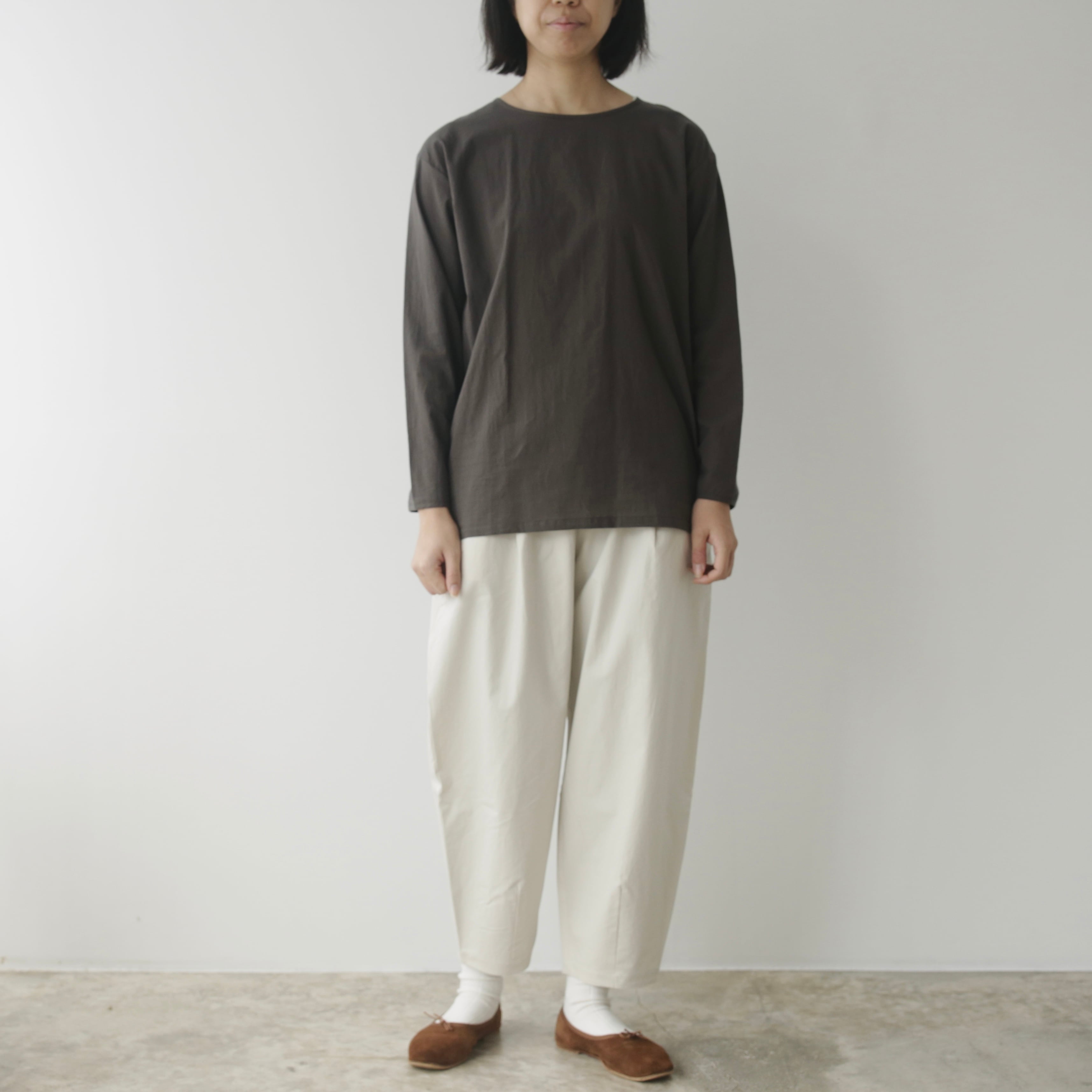 毎シーズン展開される定番シリーズに、新しく加わったクロップドパンツ。丸みのあるシルエットは体のラインを拾わず、立体的で美しい形をつくります。ヒップまわりには切り替えがあり、ゆとりがありながらも大きく見せない工夫を。裾のタックによって程よくテーパードされたラインは、可愛らしさと品の良さを兼ね備えています。