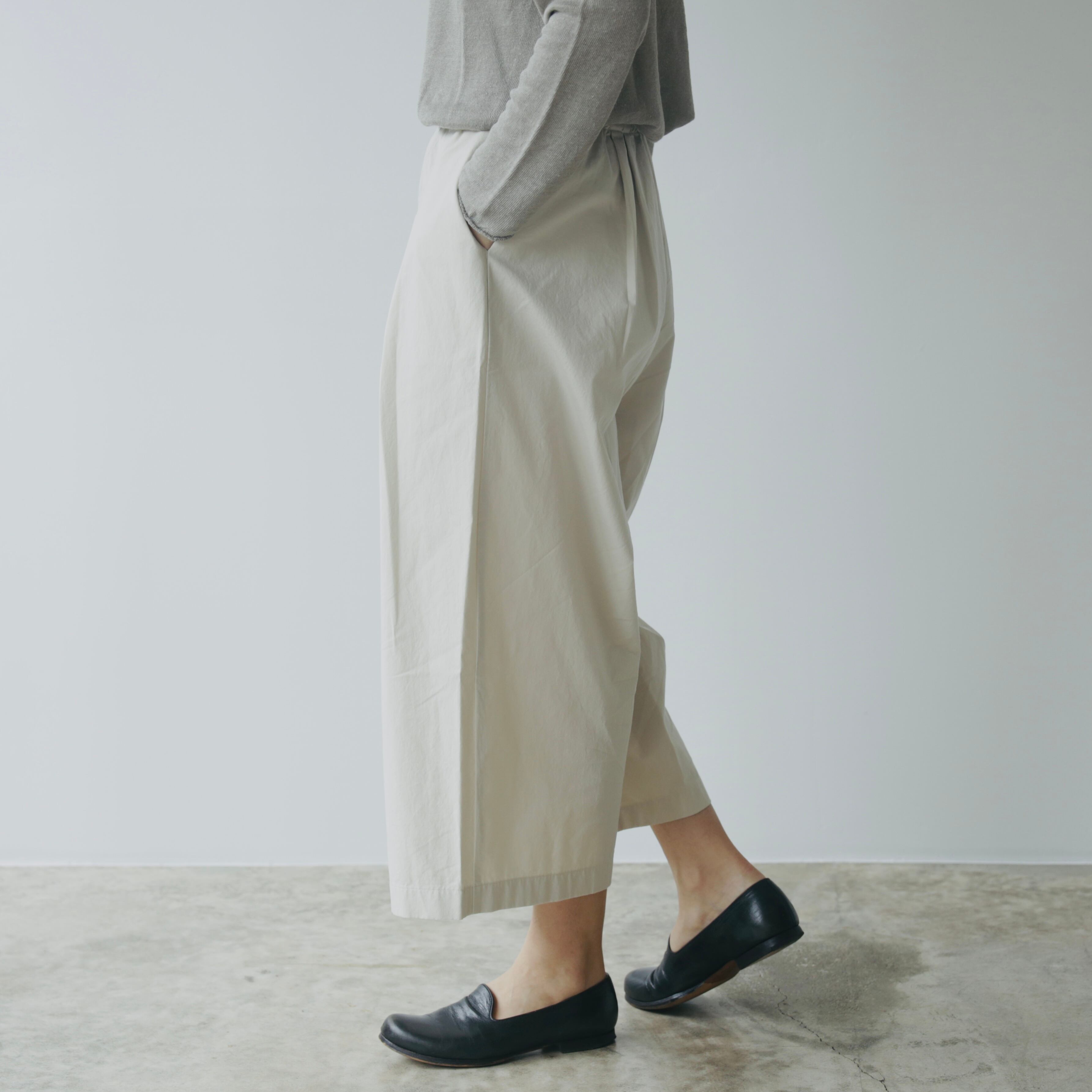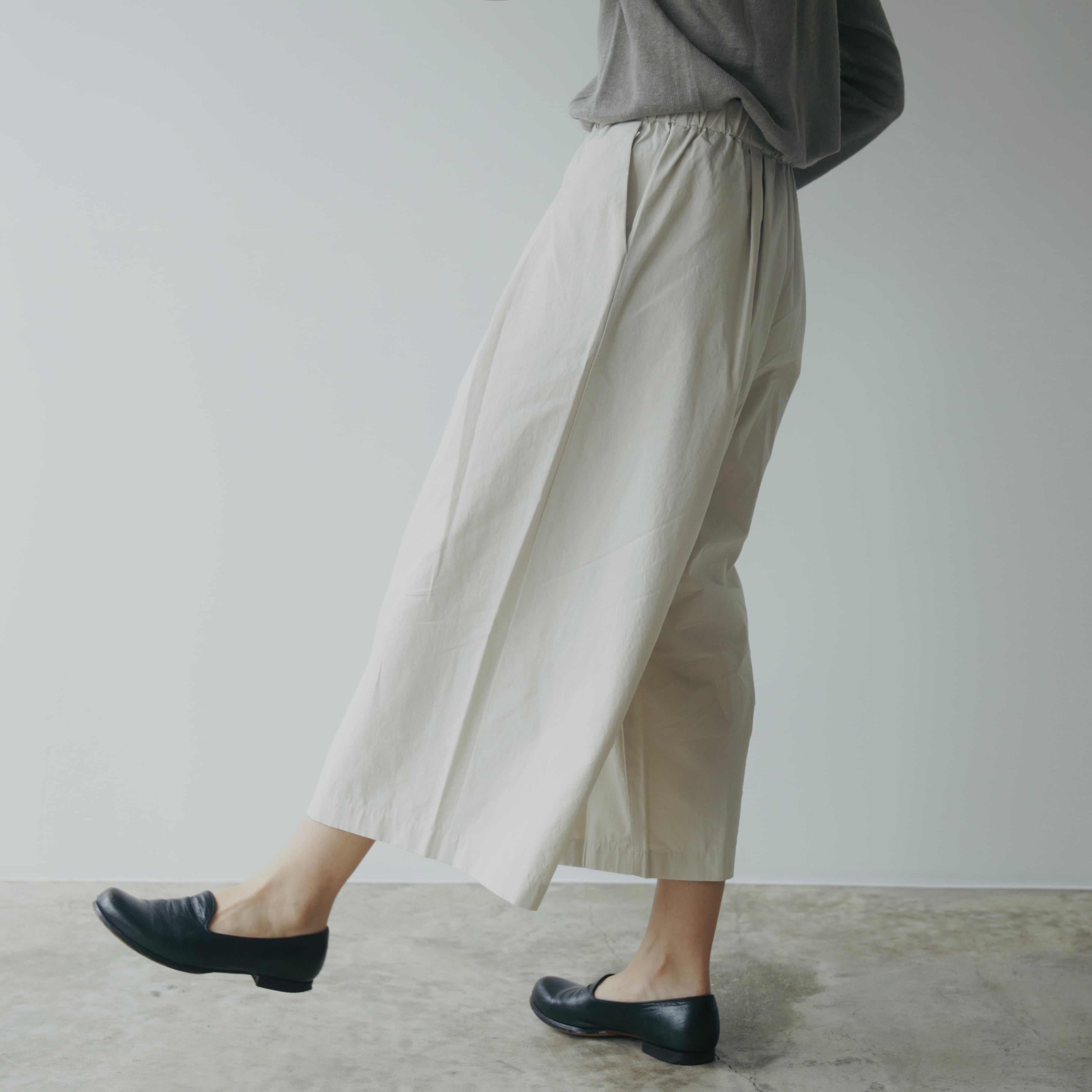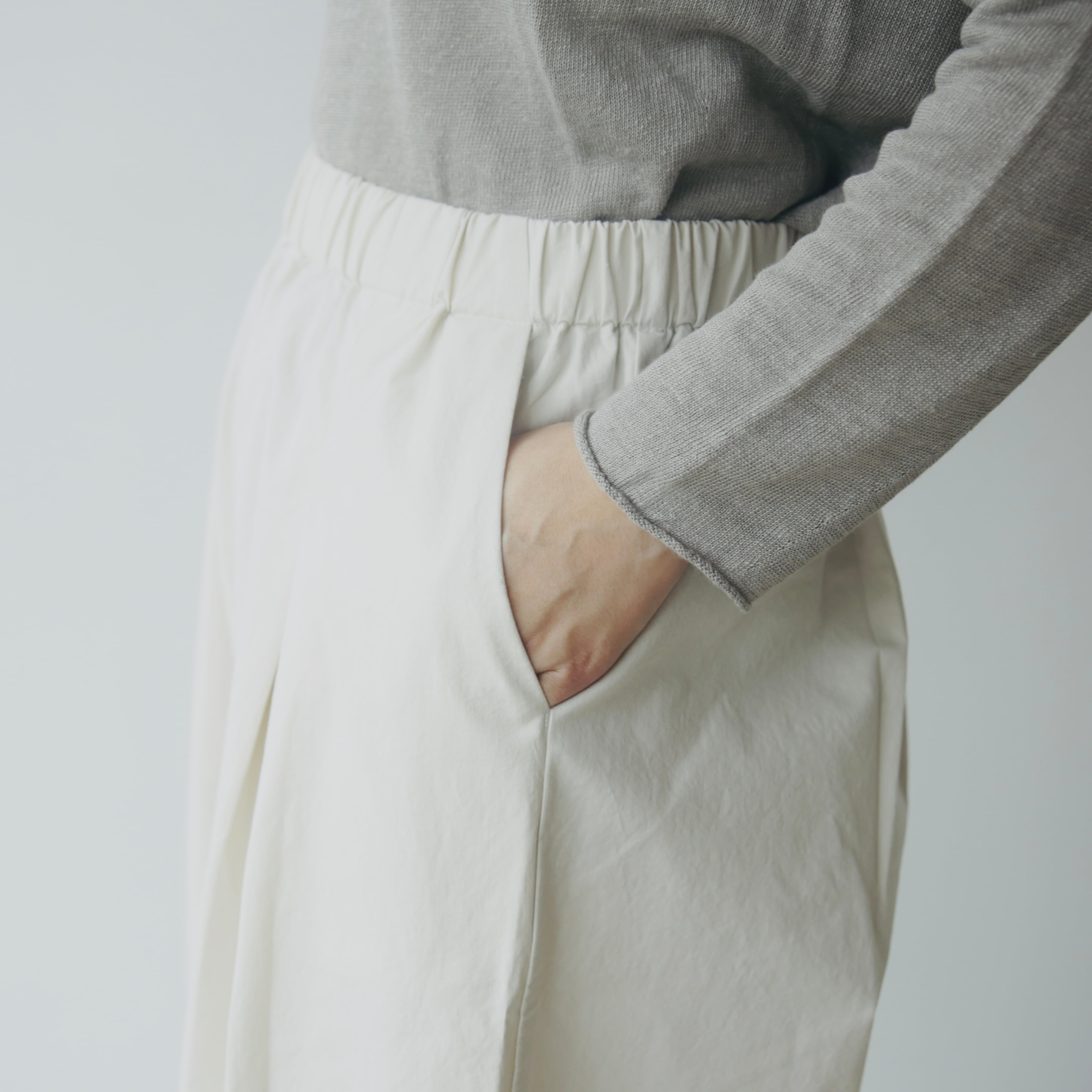 ウエストはゴム仕様で、ポケットも付いた安心のデザイン。日常に心地よく寄り添いながら、ニットやワンピース、チュニックとのレイヤードも楽しめます。サンダルからブーツまで、季節を越えて合わせやすい一枚です。