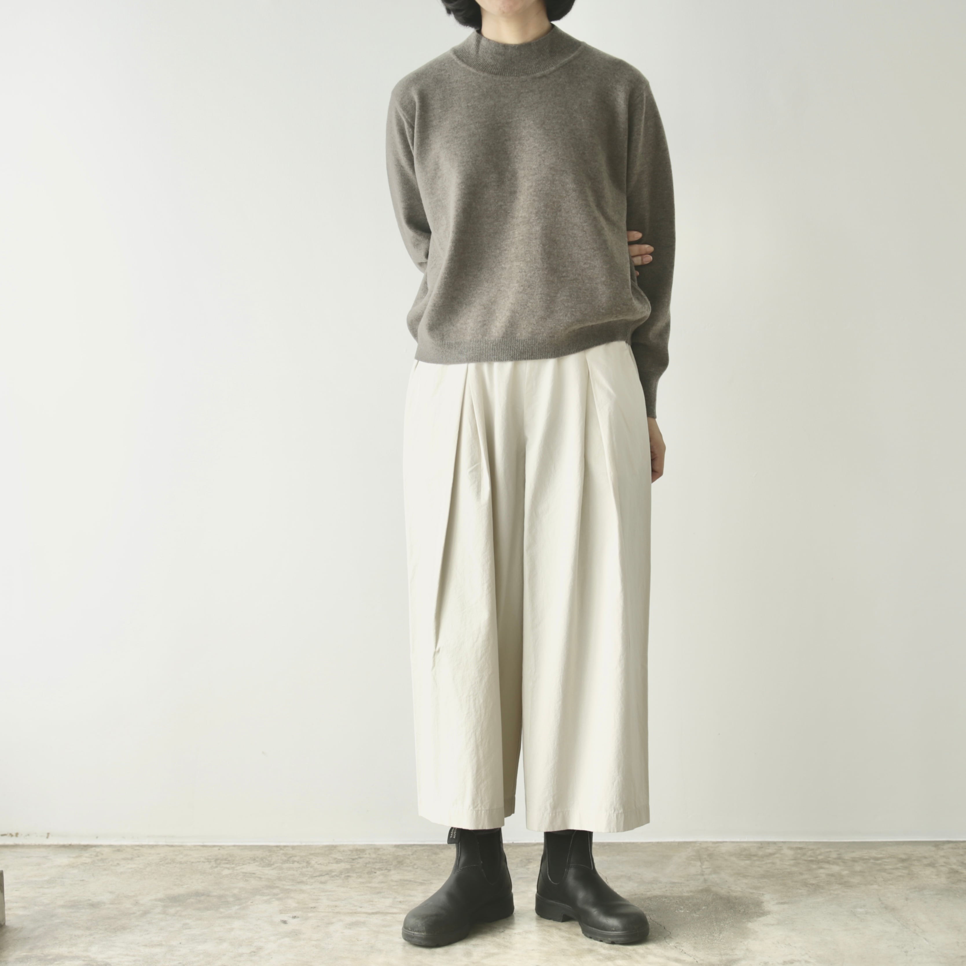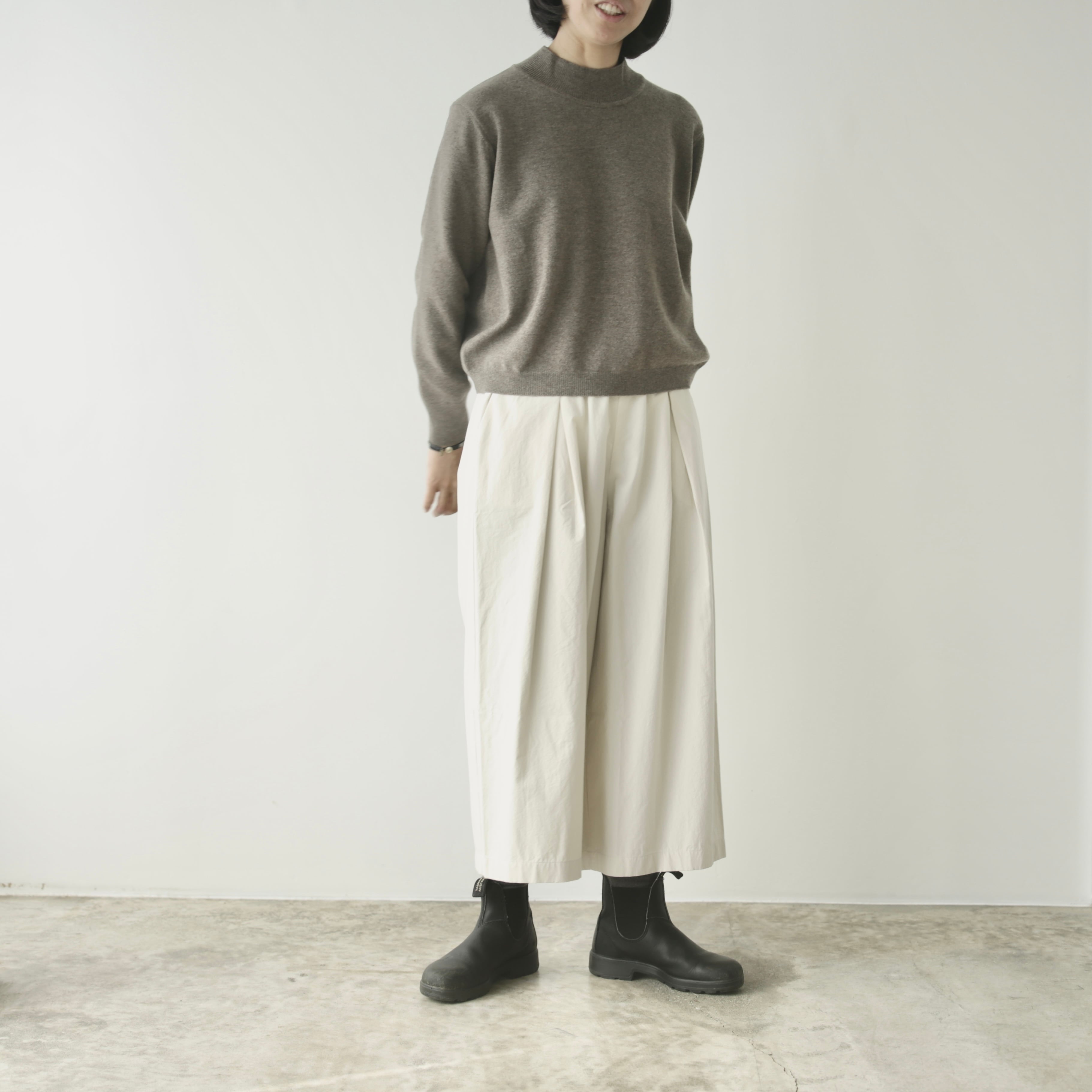 体のラインを拾わず、裾にかけてふんわりと広がる立体的なシルエットは、スカートのようにも見える柔らかさ。ゆったりとしながらも上品さを添えてくれます。