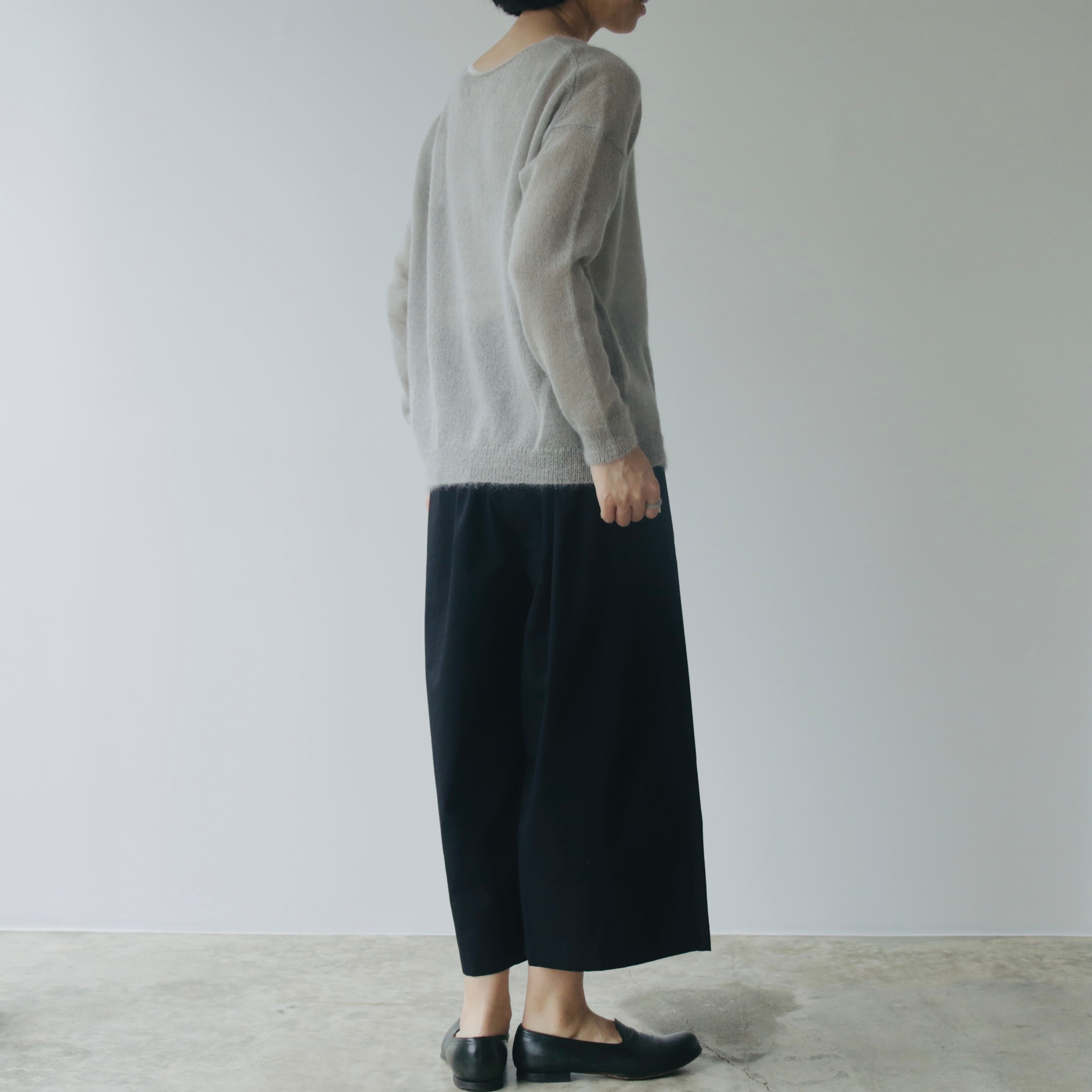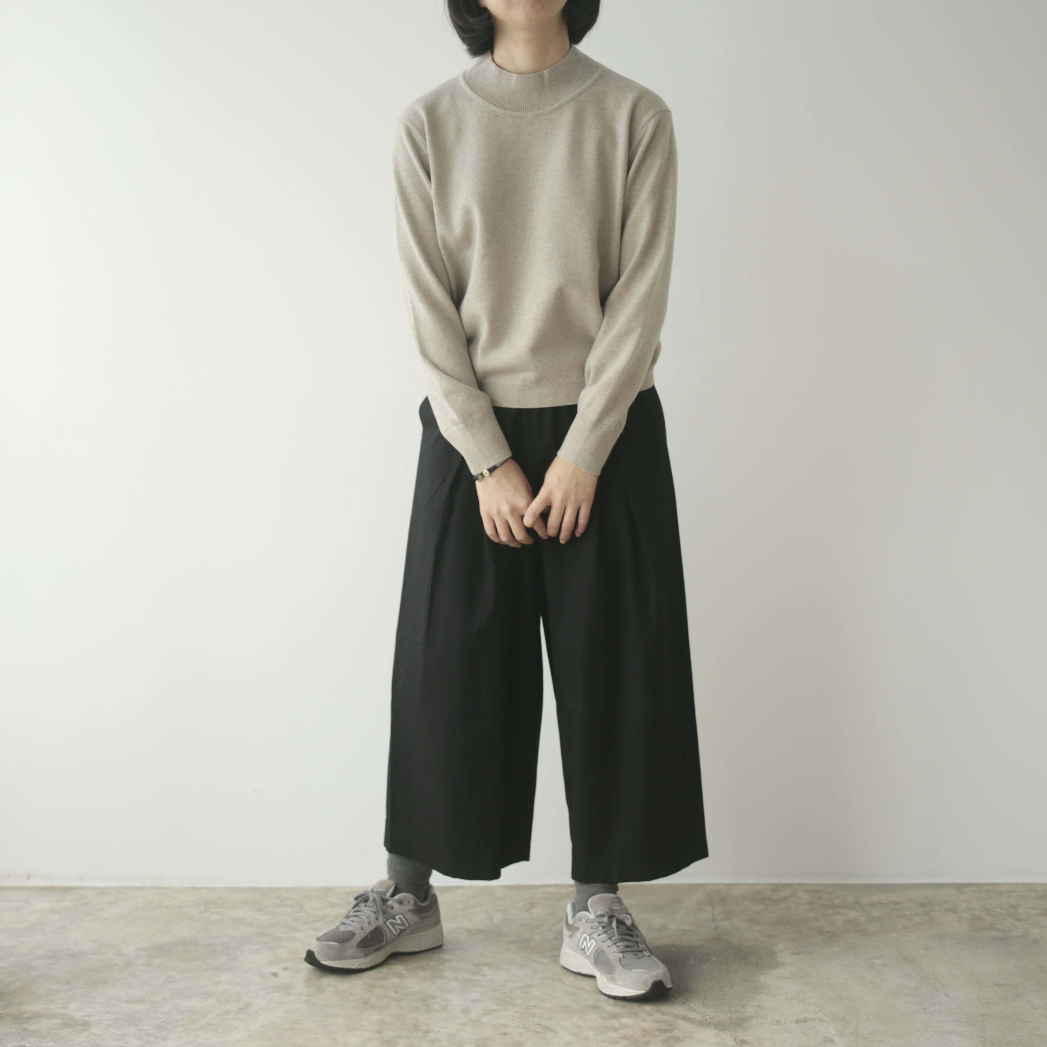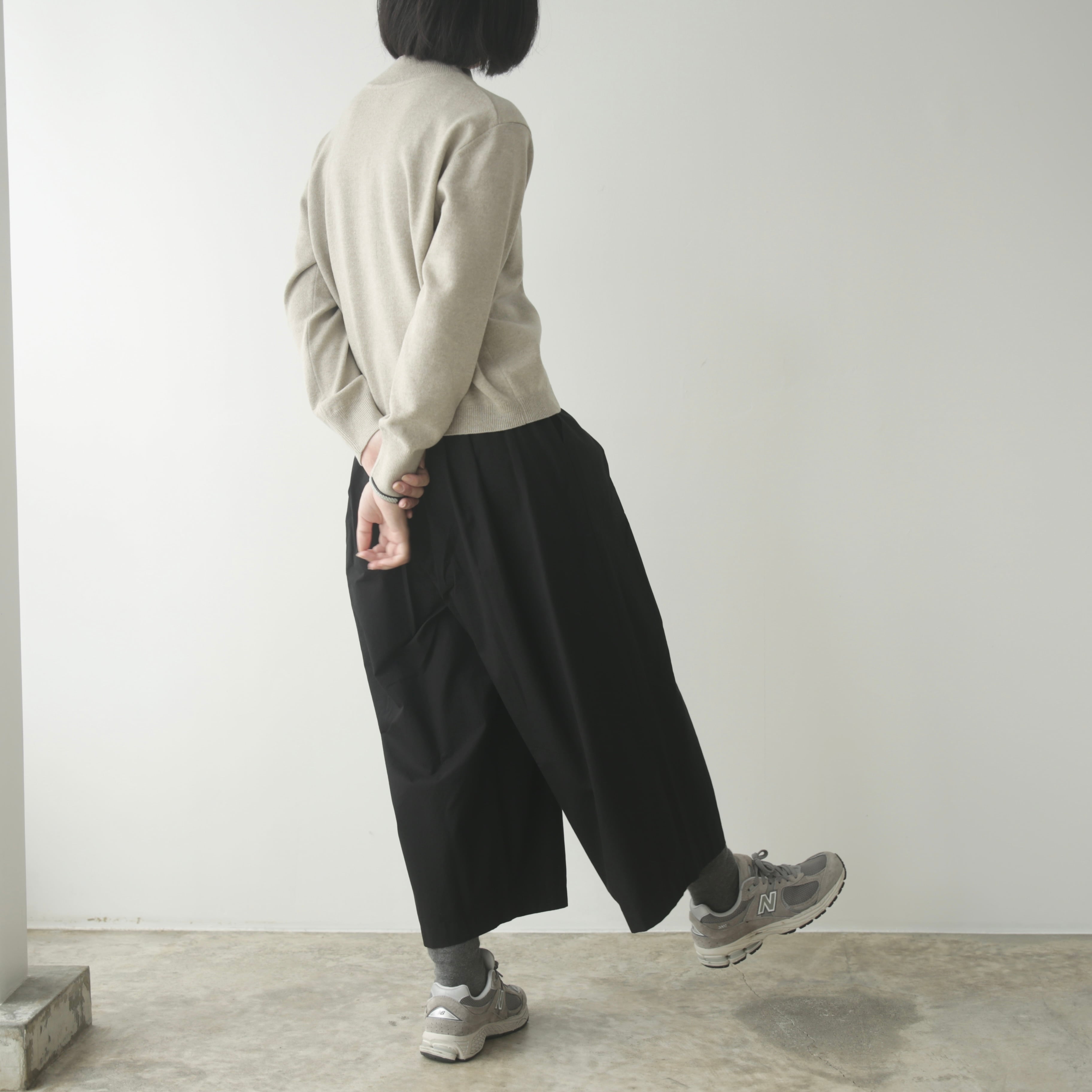 体のラインを拾わず、裾にかけてふんわりと広がる立体的なシルエットは、スカートのようにも見える柔らかさ。ゆったりとしながらも上品さを添えてくれます。