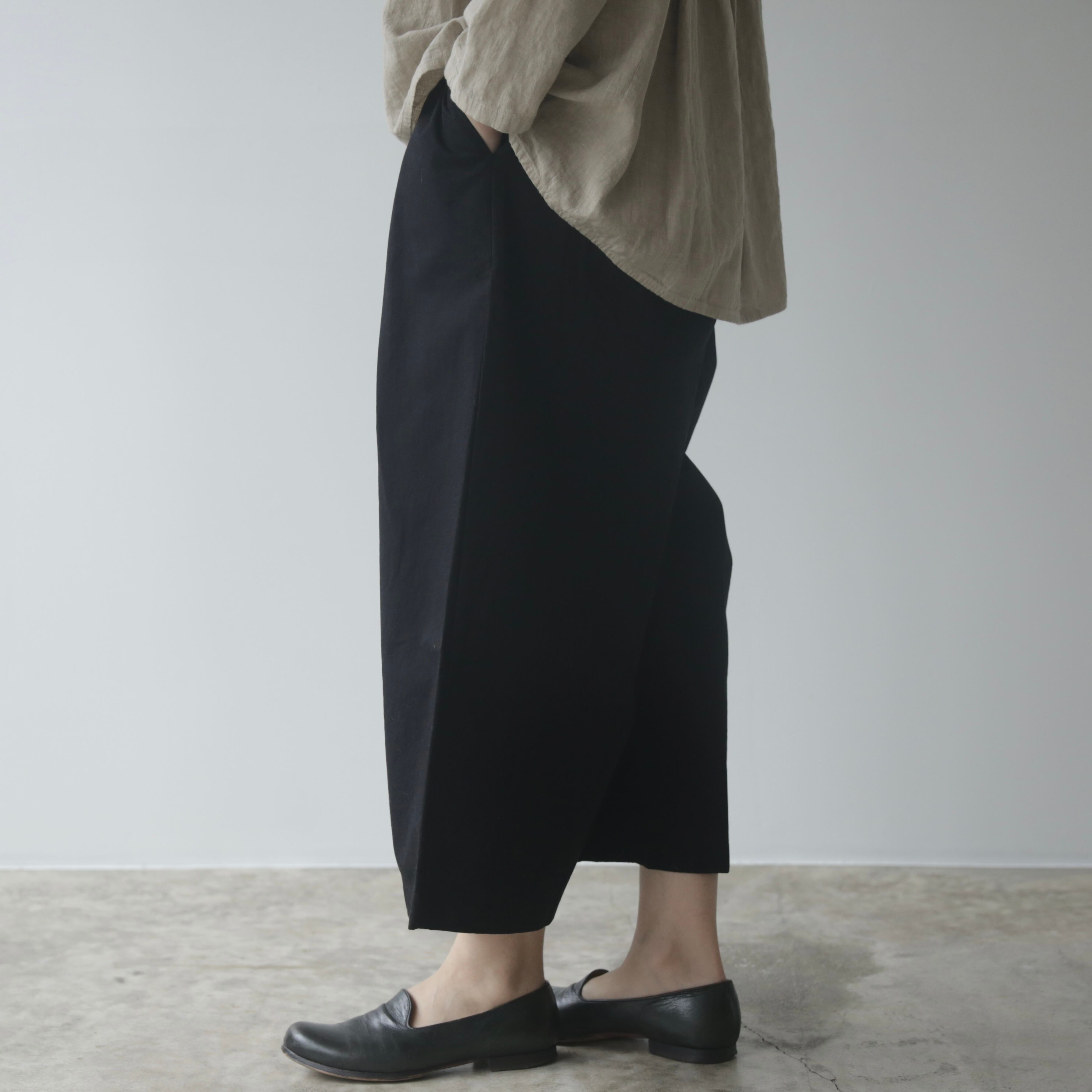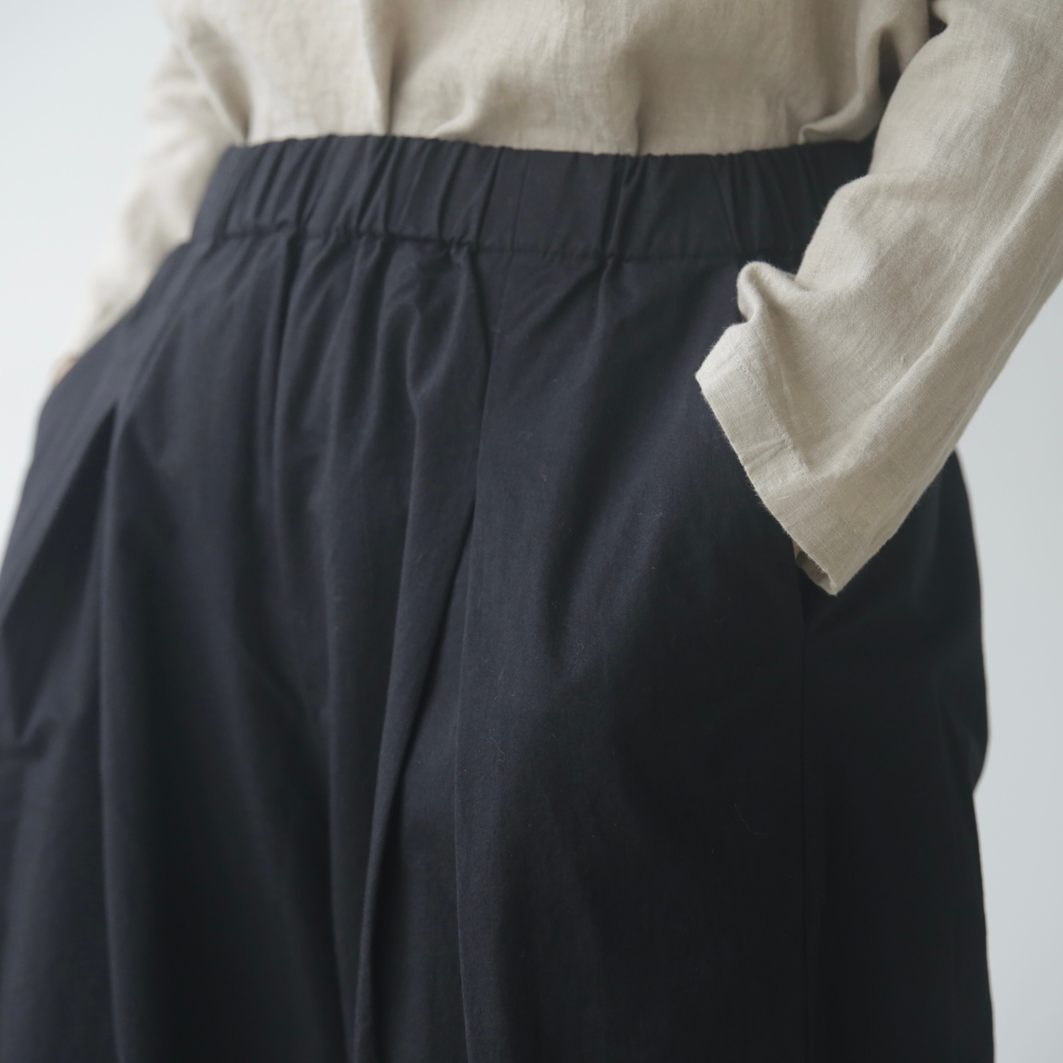ウエストはゴム仕様で、ポケットも付いた安心のデザイン。日常に心地よく寄り添いながら、ニットやワンピース、チュニックとのレイヤードも楽しめます。サンダルからブーツまで、季節を越えて合わせやすい一枚です。
