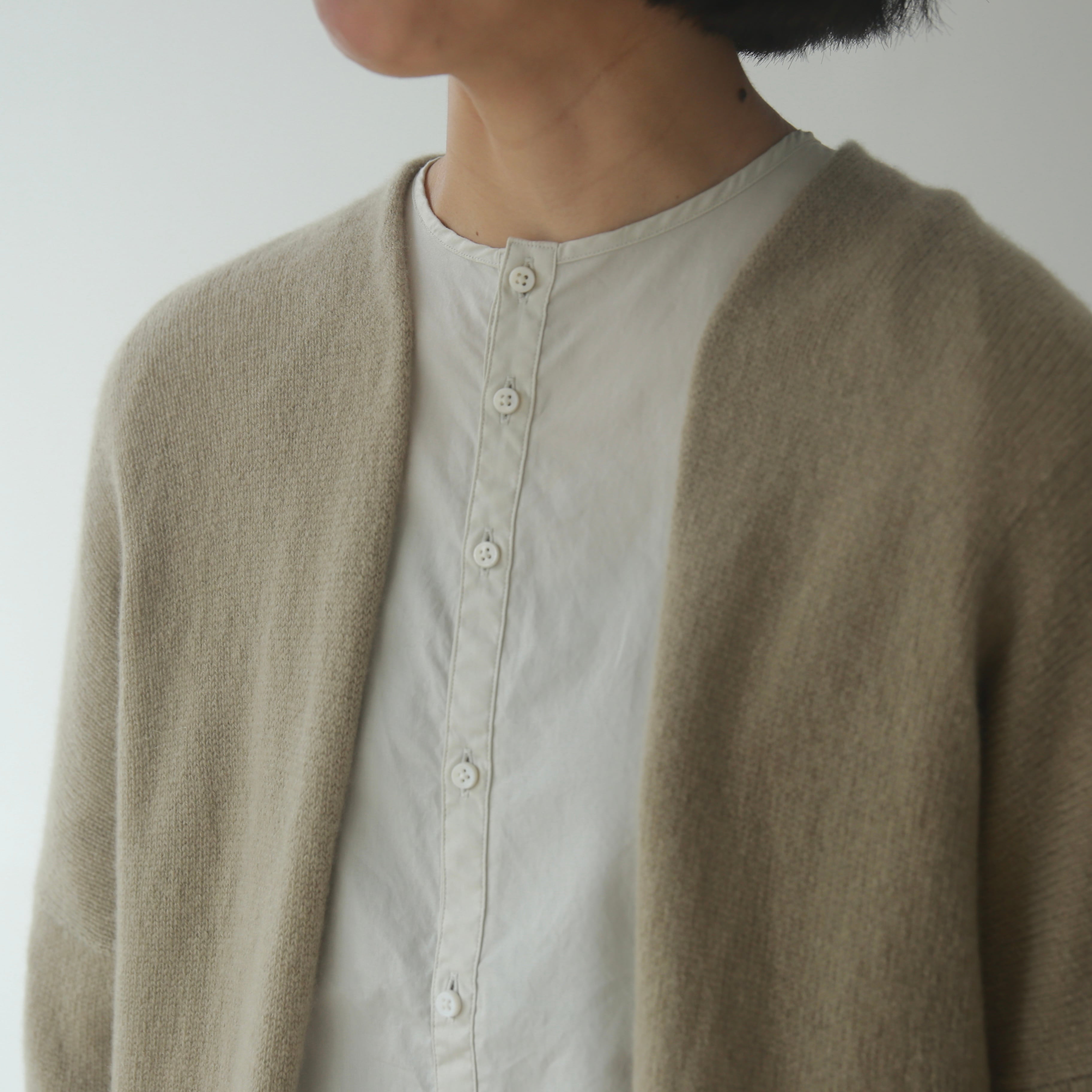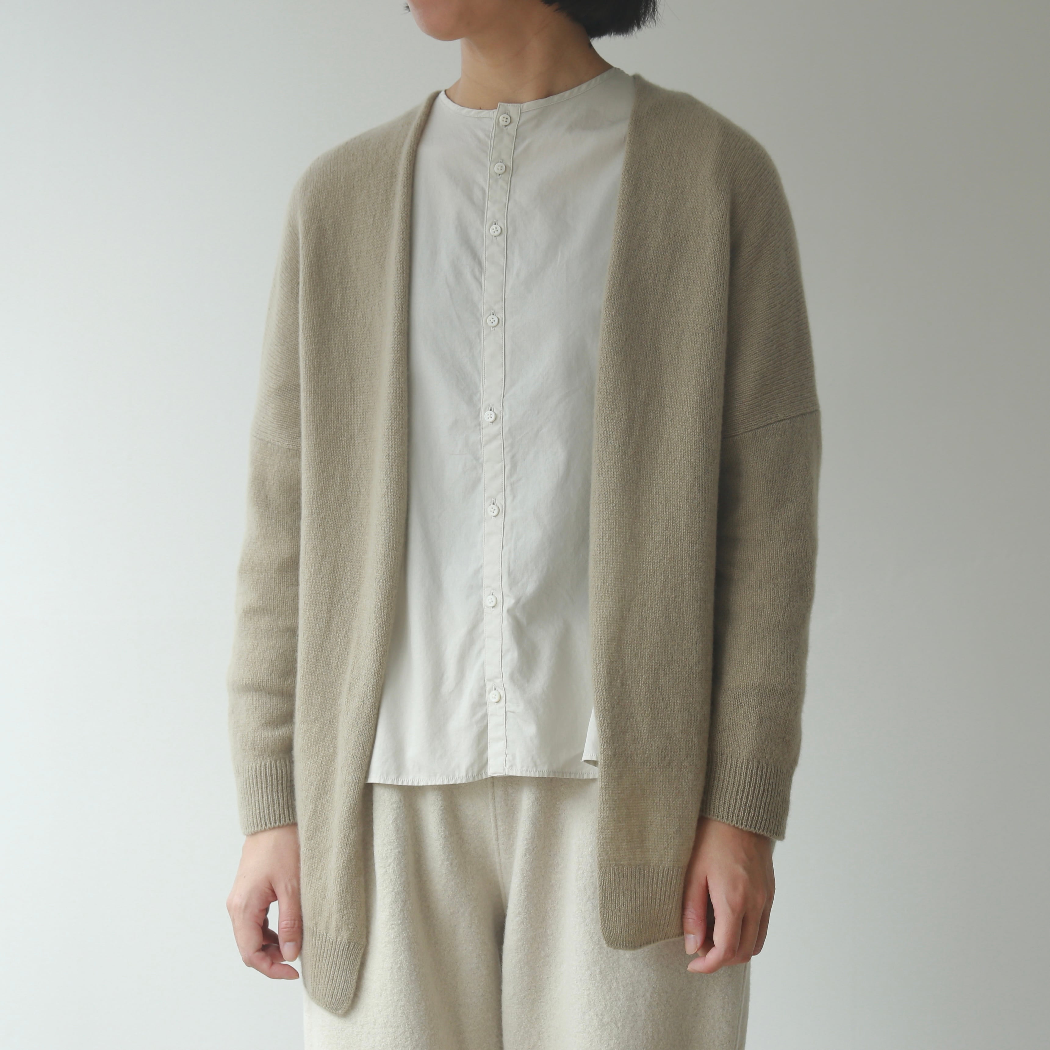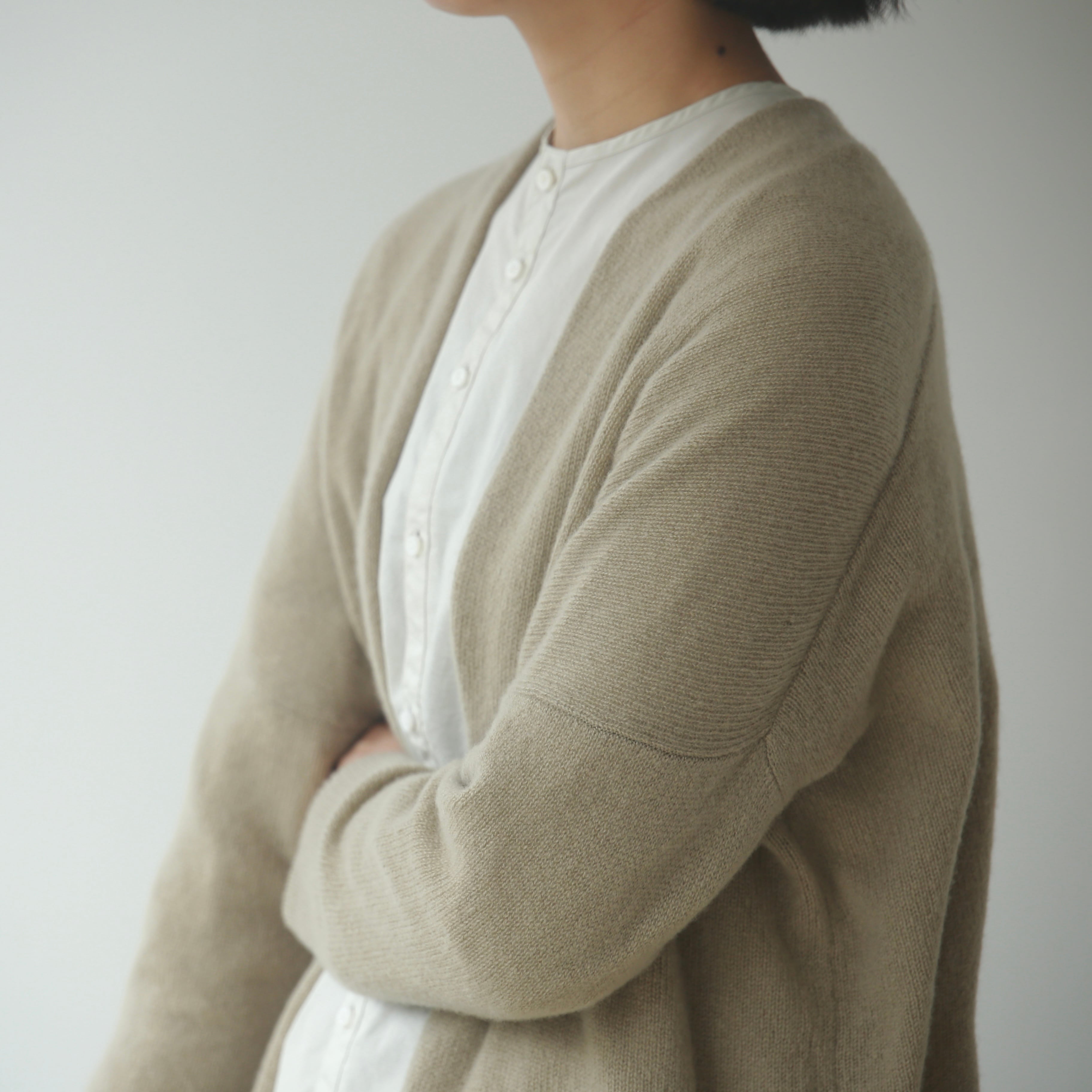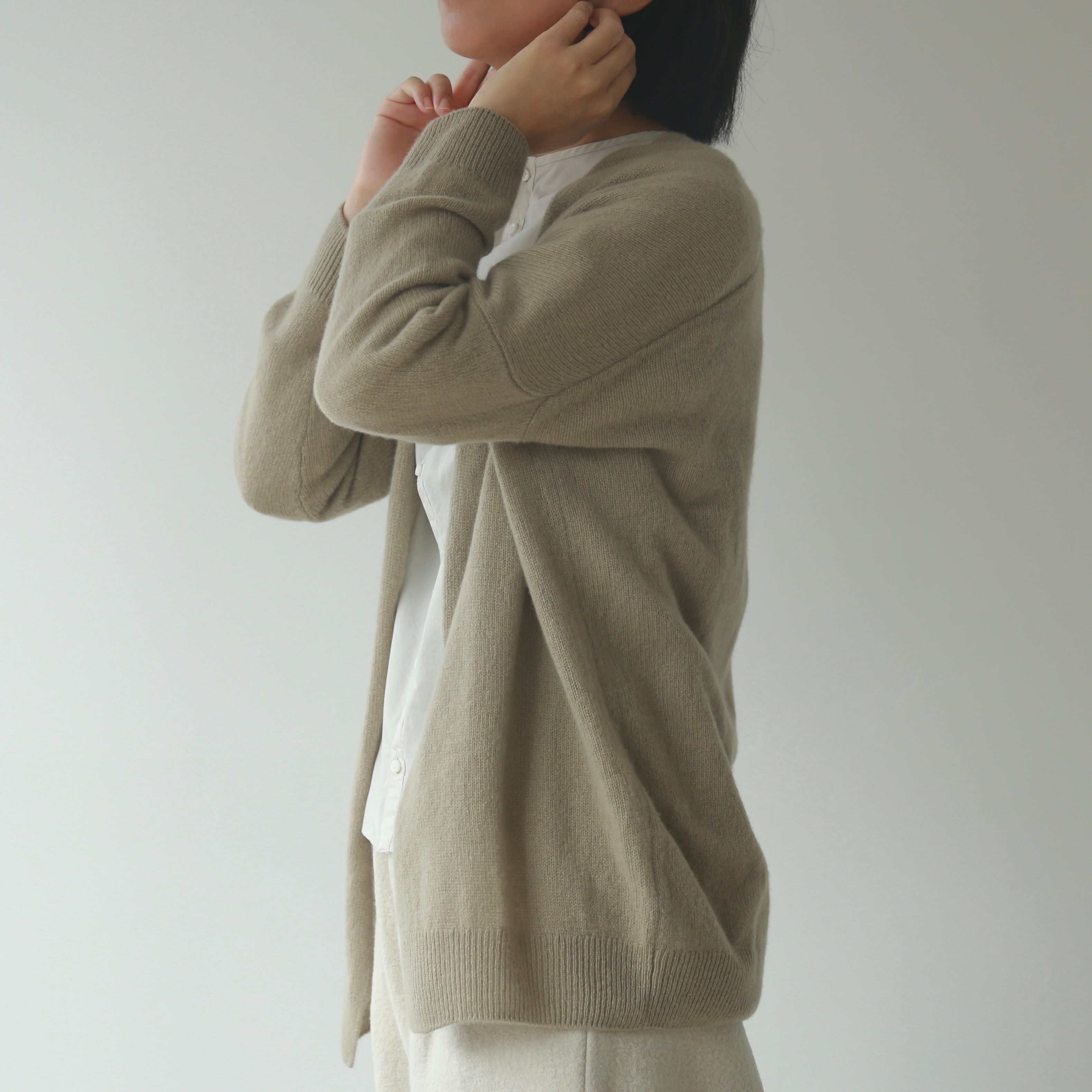 定番のカシミヤシリーズと同じ糸で編み立てられた、ふわりと軽やかなカーディガン。
