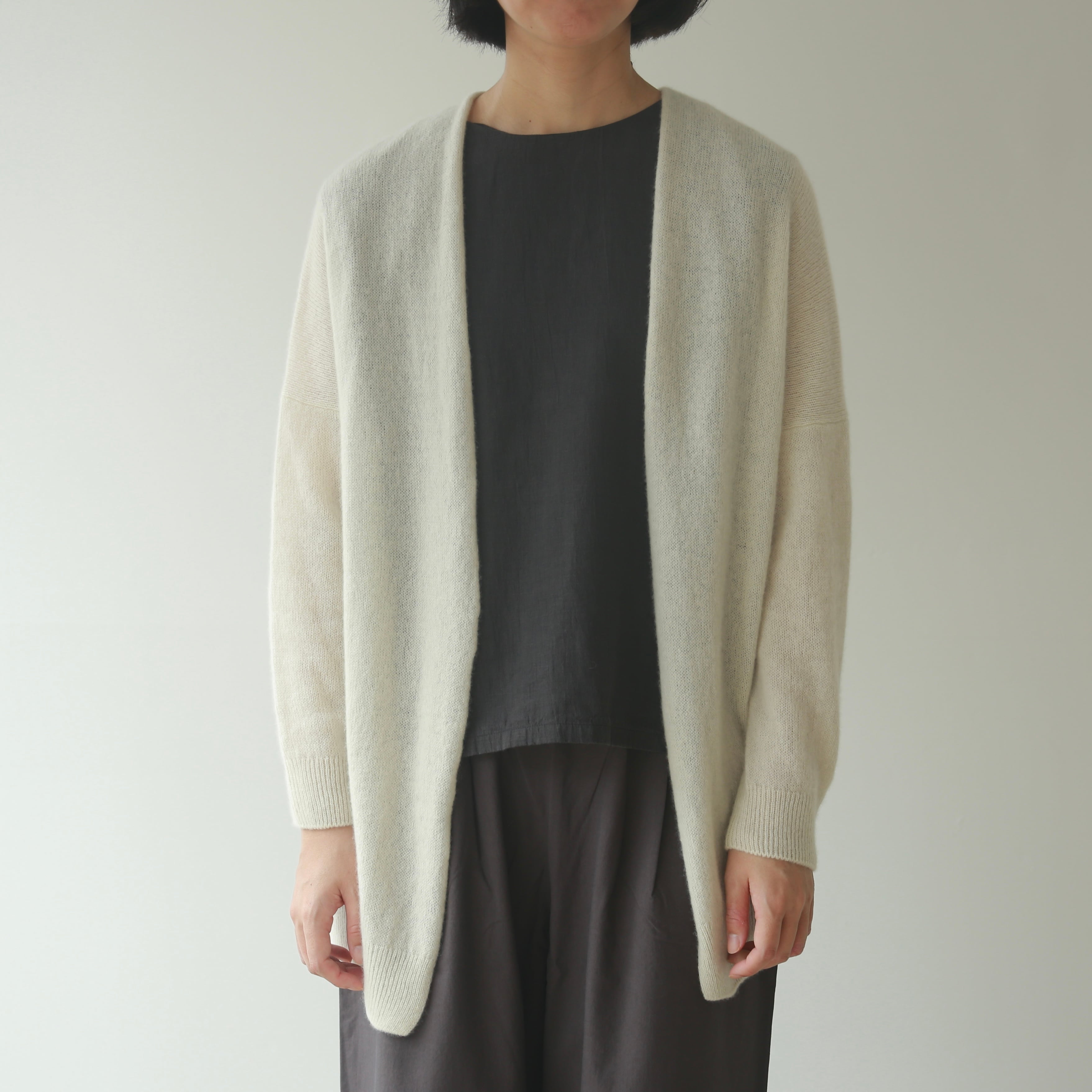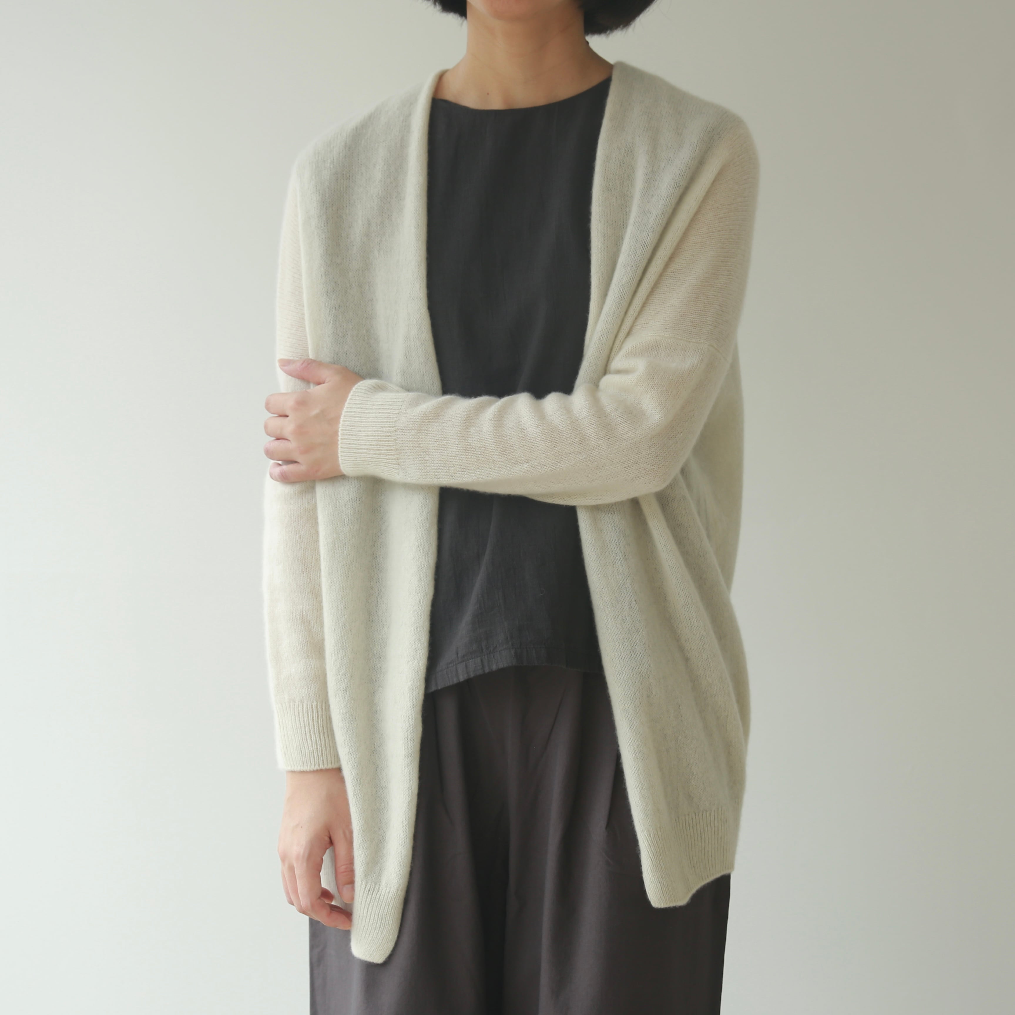 定番のカシミヤシリーズと同じ糸で編み立てられた、ふわりと軽やかなカーディガン。