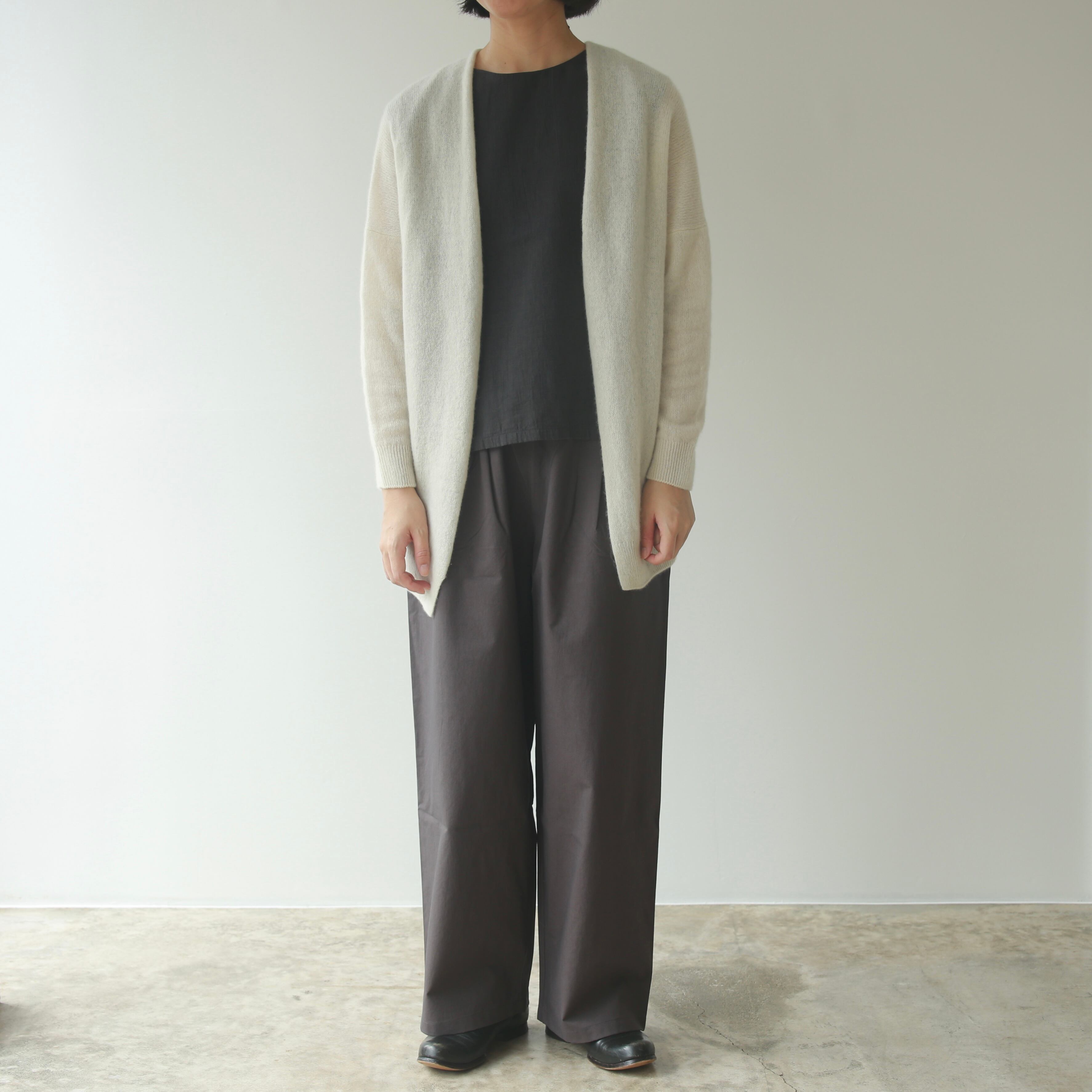 肌寒い朝にはパジャマの上に羽織っても心地よく、シャツやワンピースの上からさらりと合わせたり、ロングコートの中に忍ばせたりと幅広い着こなしに対応。少し長めの着丈が暖かさを添え、お尻まですっぽりと包み込んでくれる安心感も魅力です。