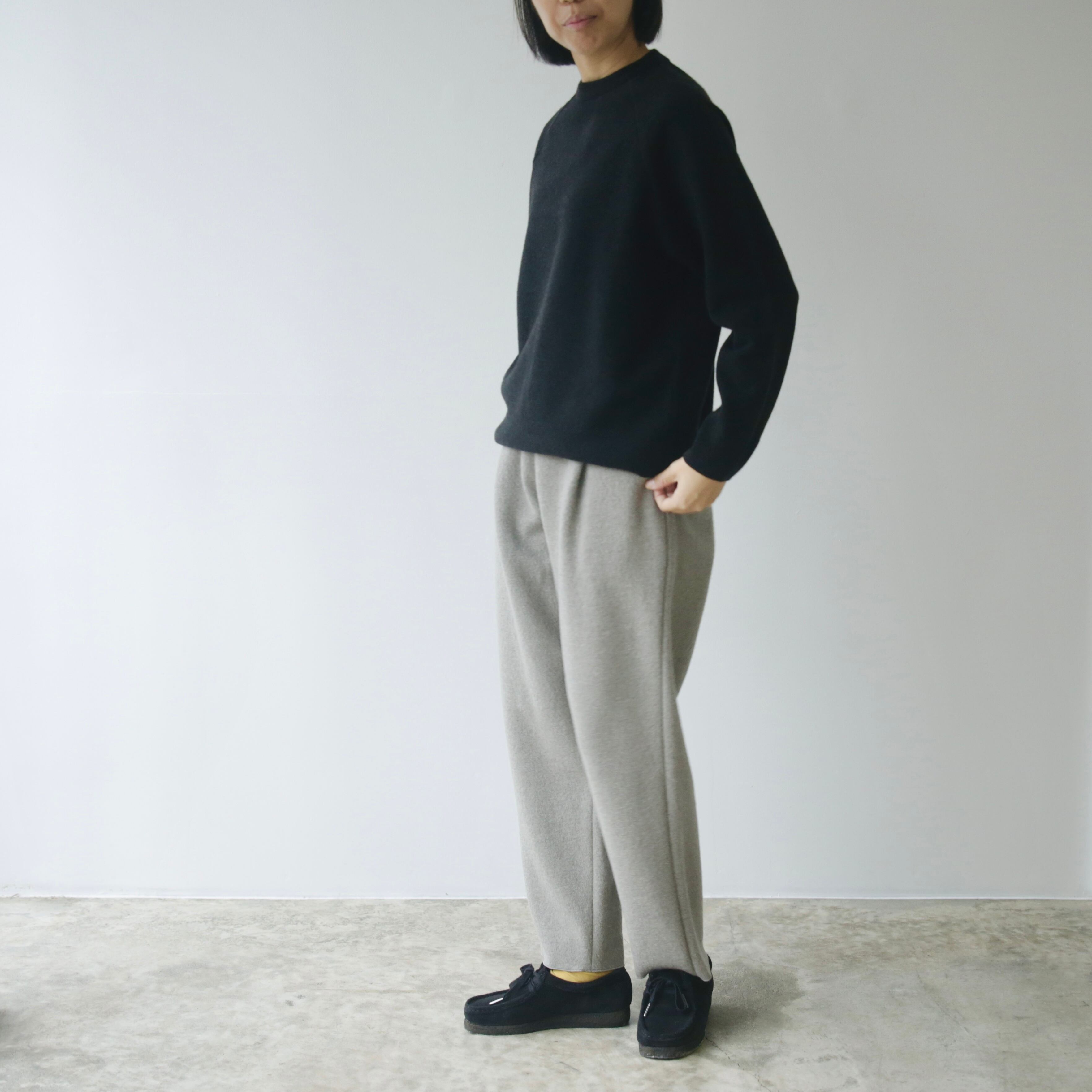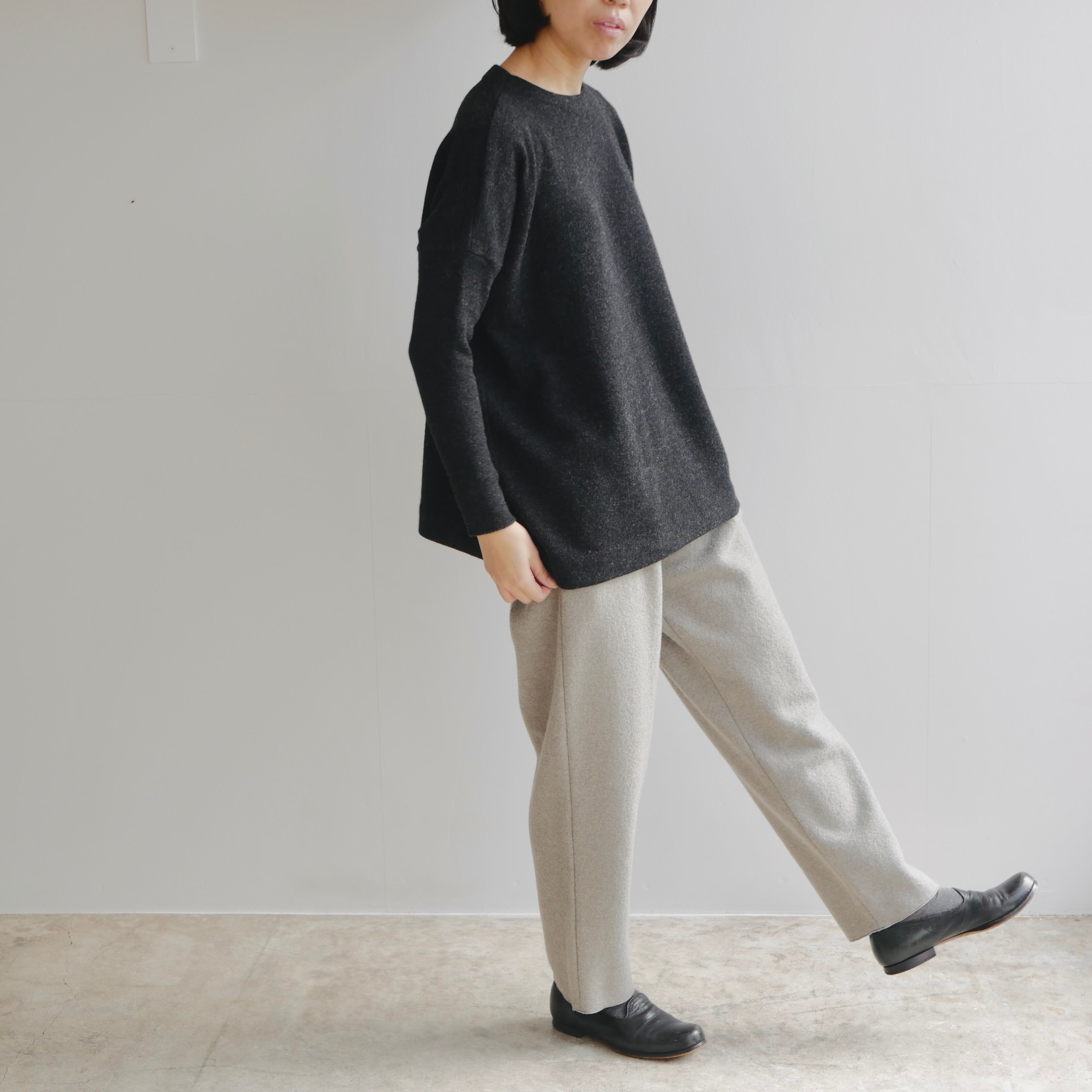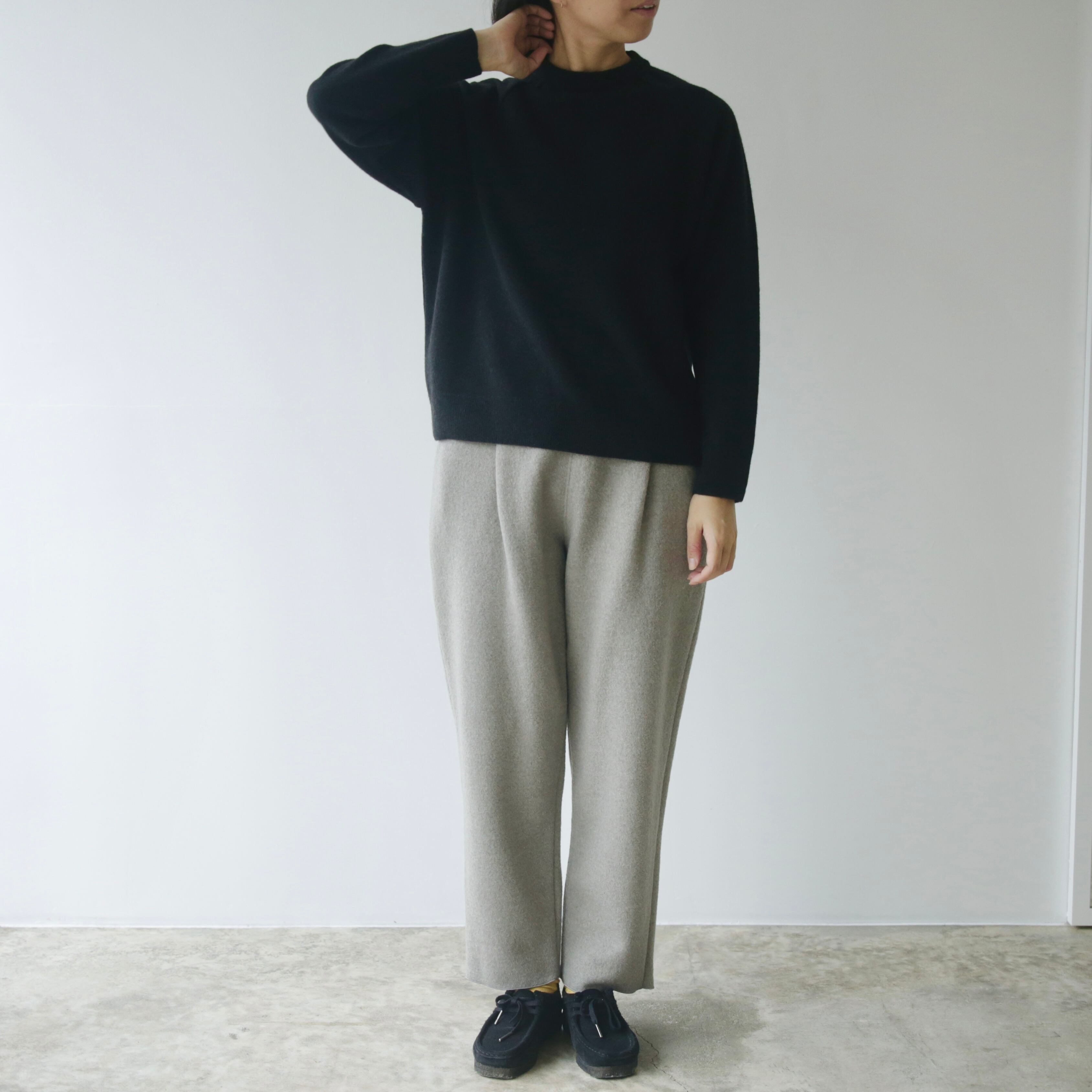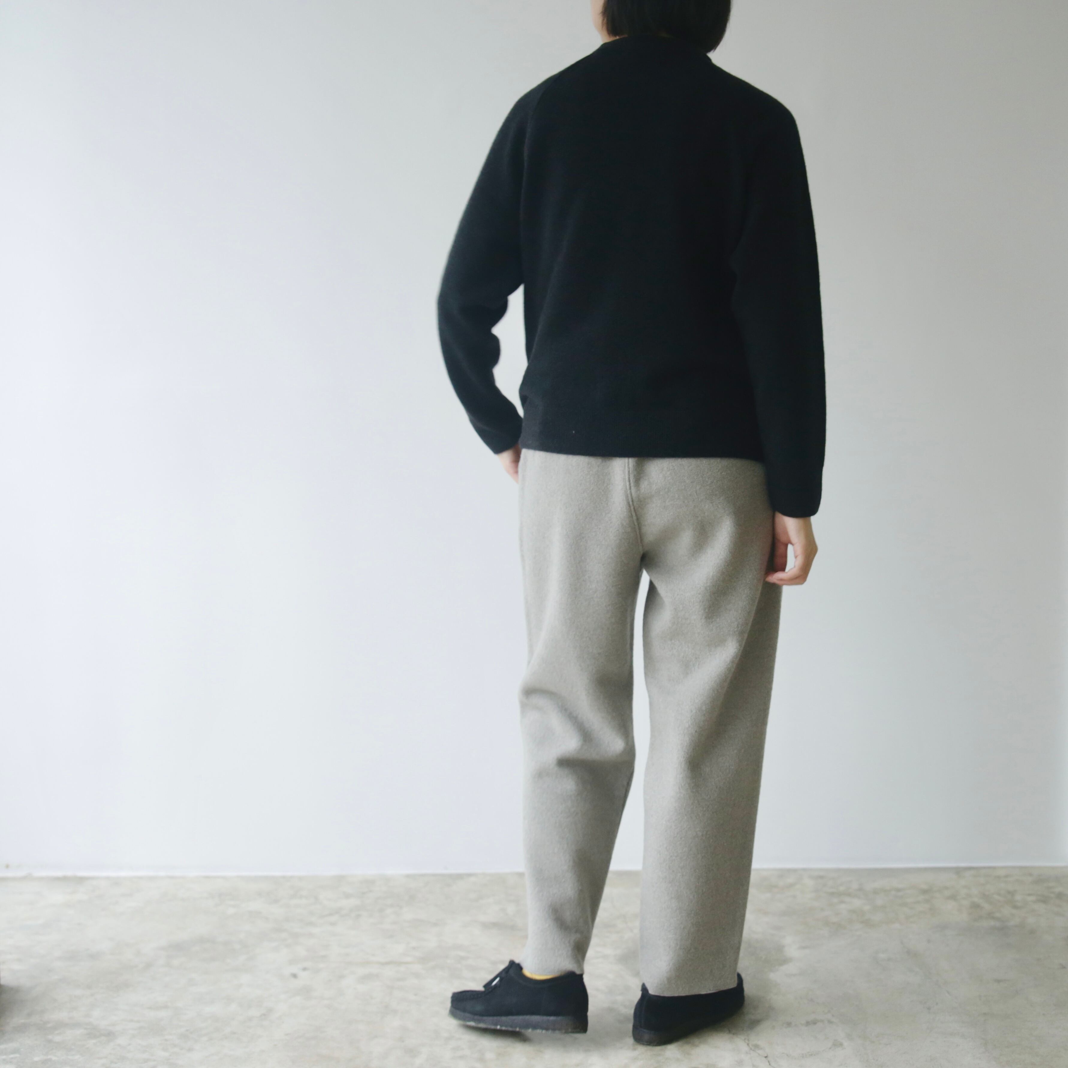 冬の装いにやさしく寄り添う、プレスウールパンツ。ふんわりともこもことしたウール素材は、見た目にも温かく、触れると柔らかい手触り。穿いたときにも軽やかで、自然と心地よさに包まれます。