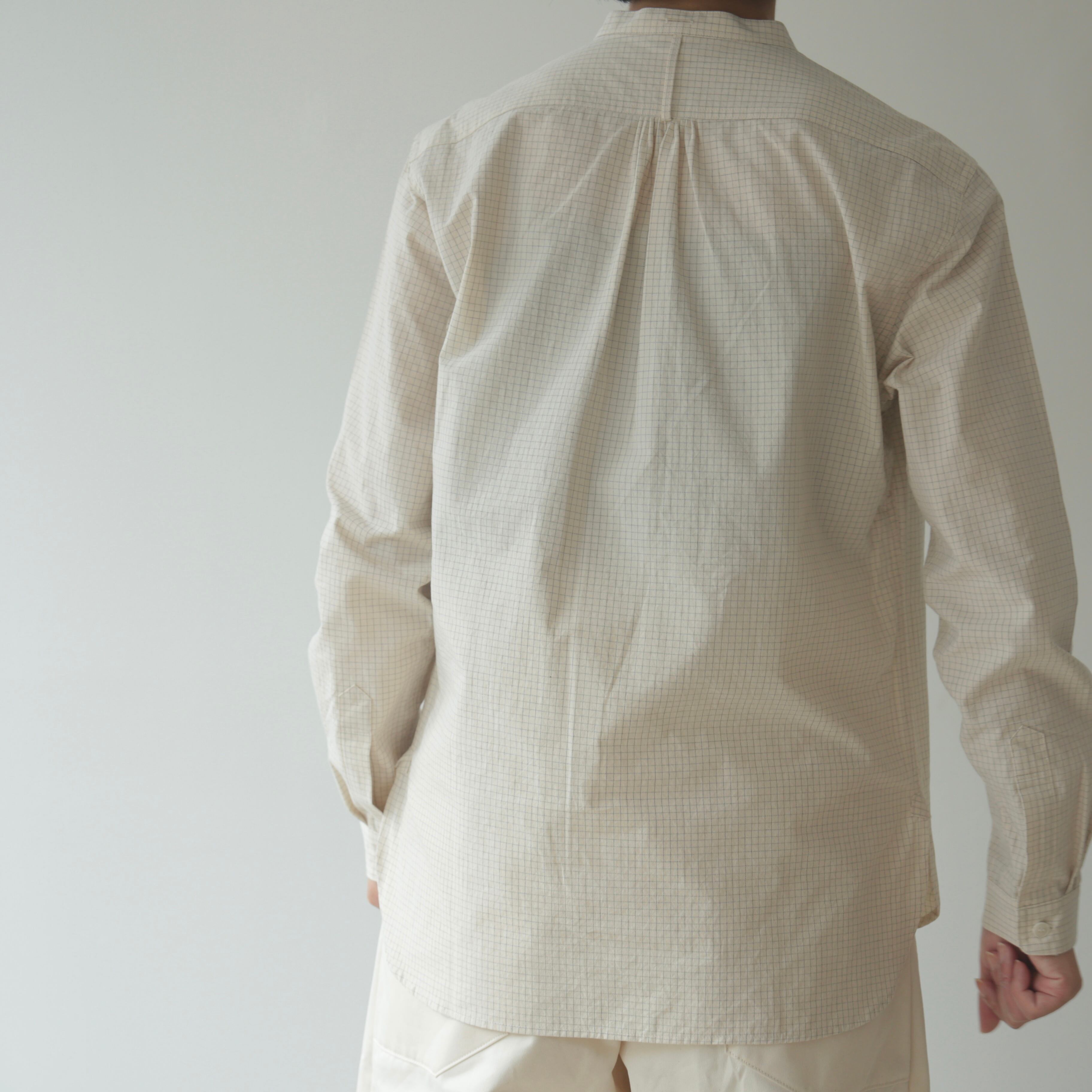 ベーシックな中に遊び心のあるディテールが光るノーカラーシャツは、ボタンにまでこだわりが感じられる仕様。