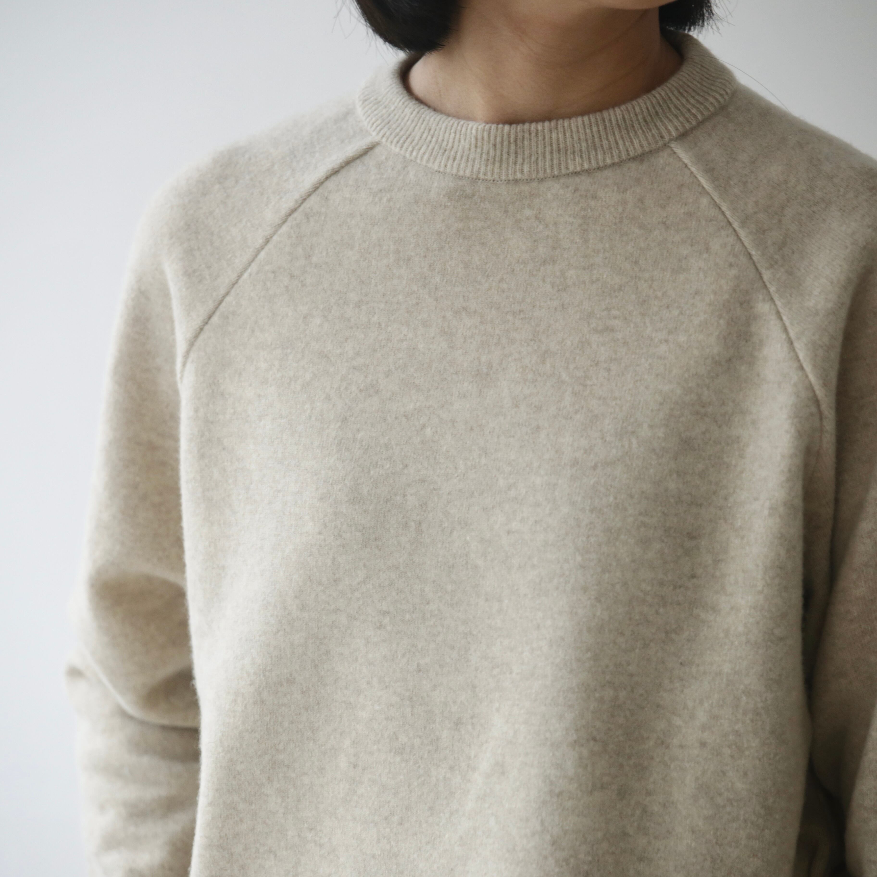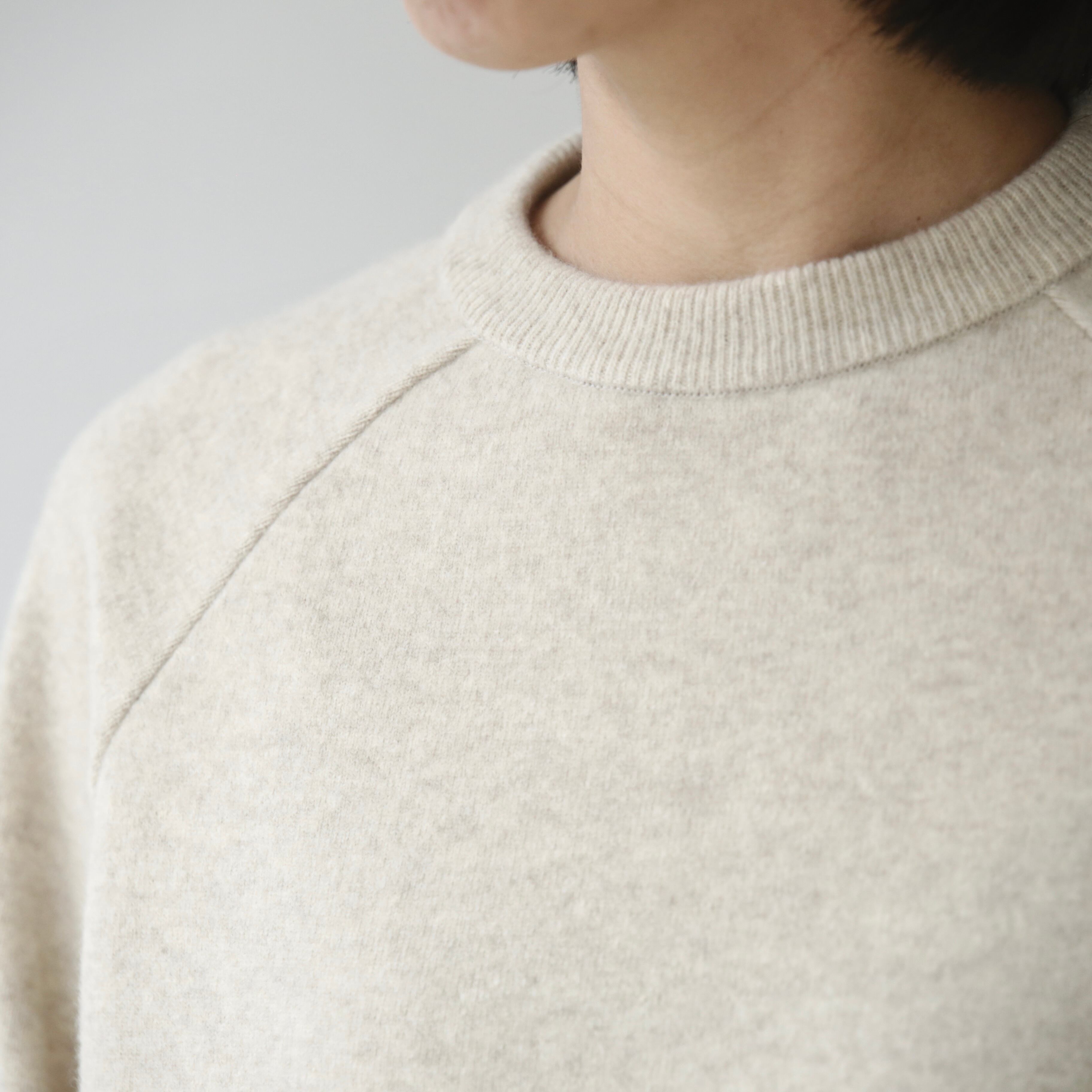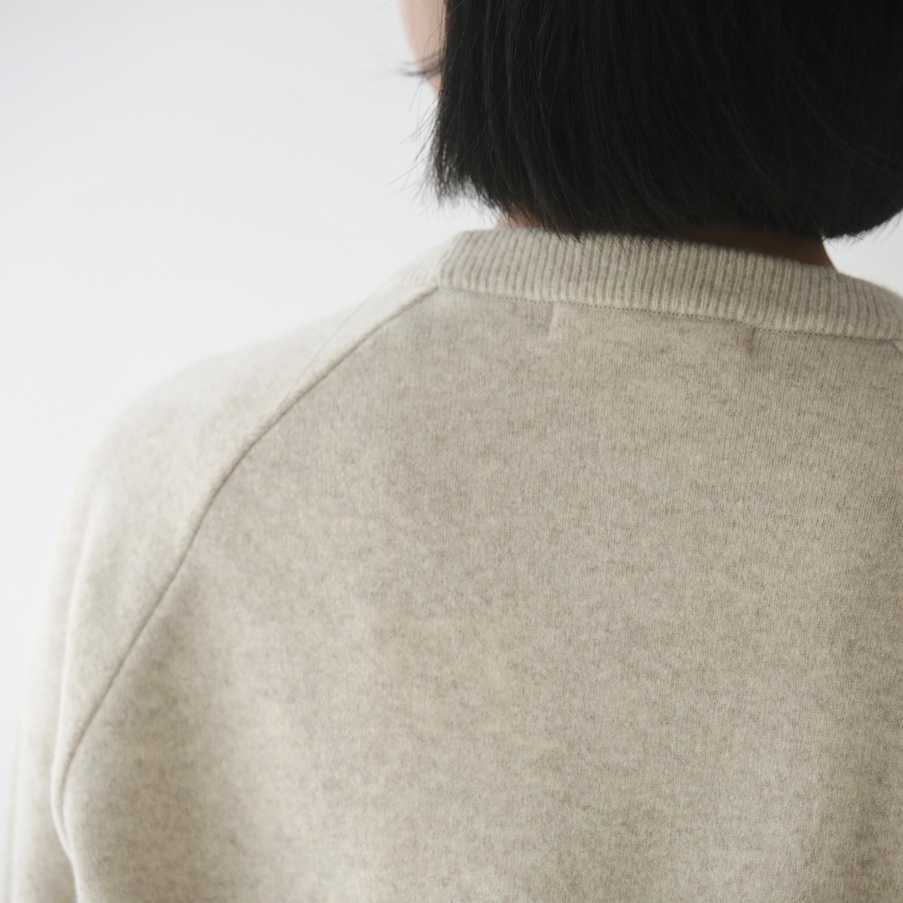 上品さとリラックス感のあるシルエットで、カジュアルになりすぎず、大人の装いにも馴染みます。ラグランスリーブで腕まわりも動かしやすく、ゆったりとした着心地です。