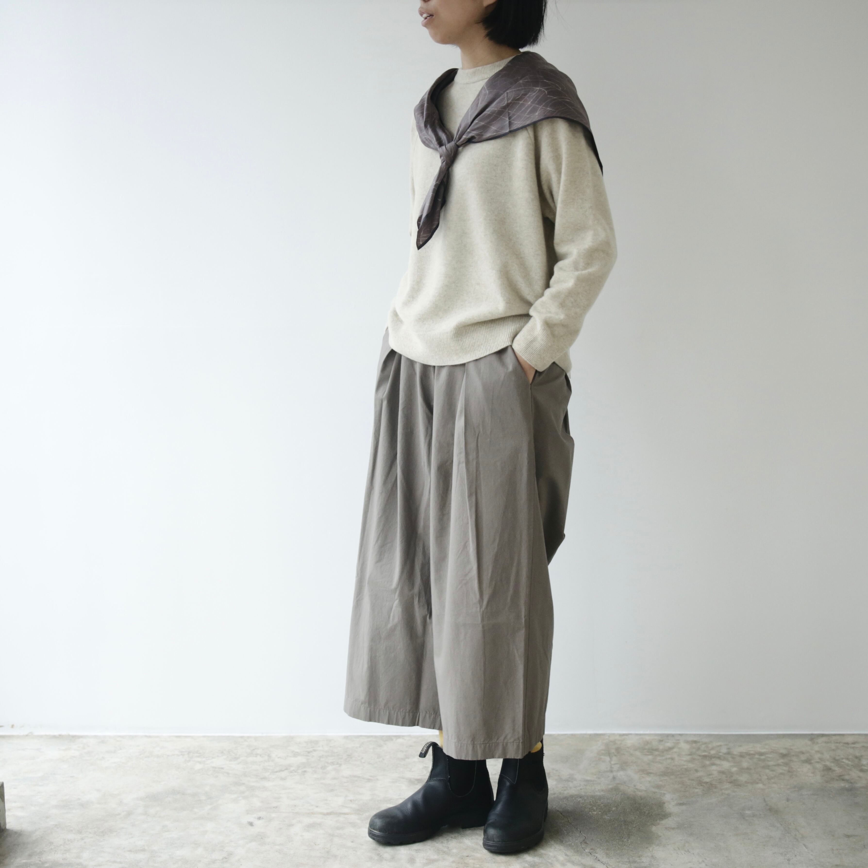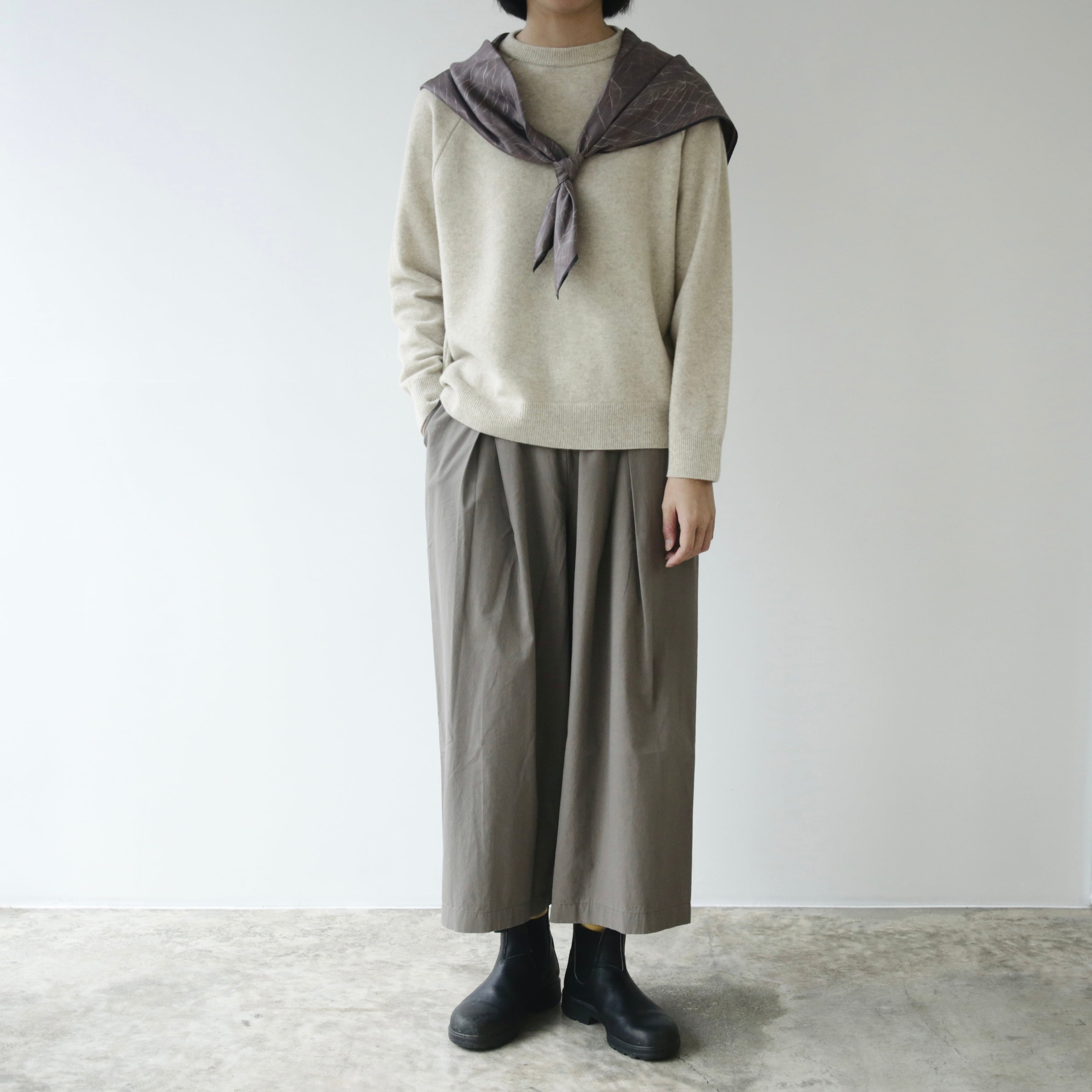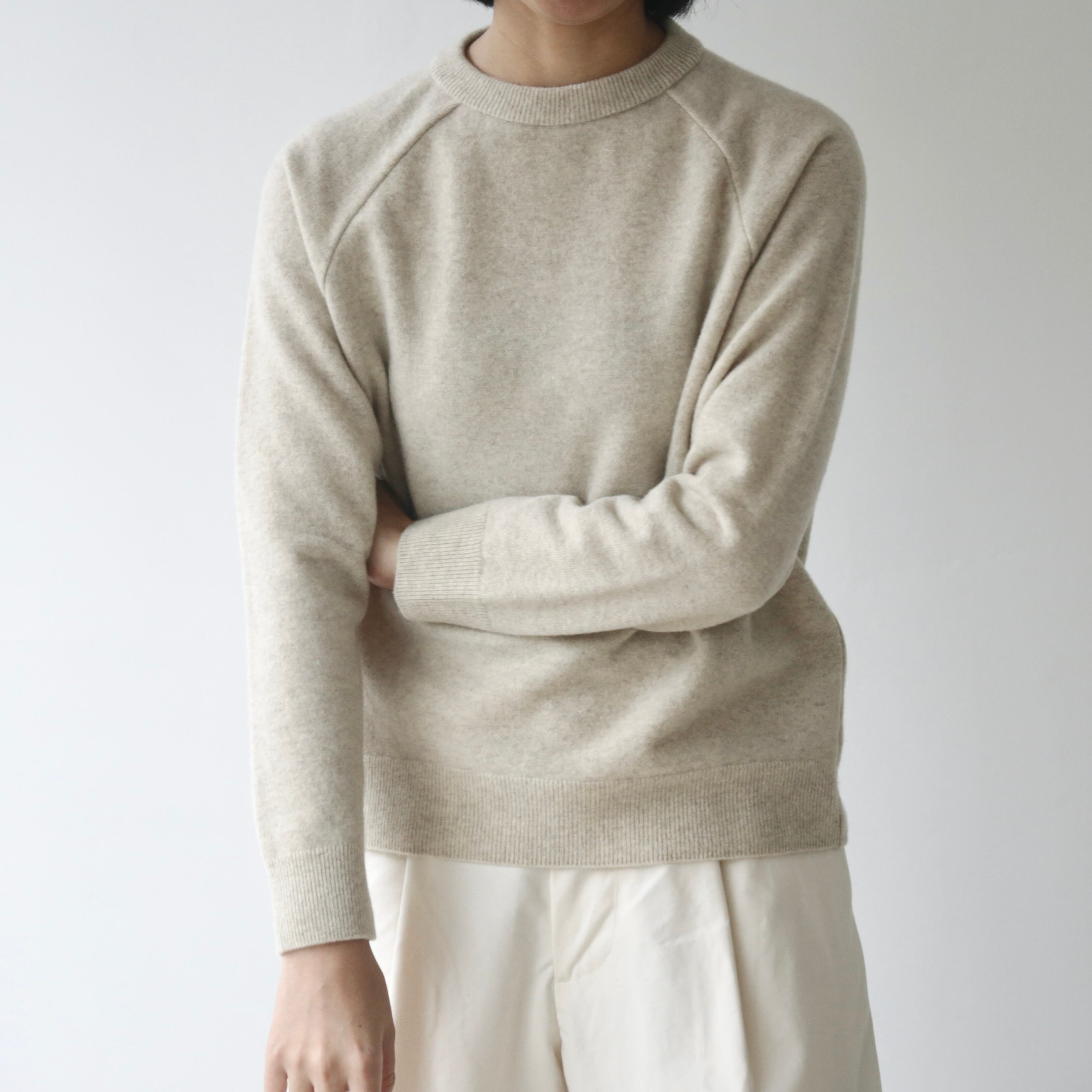 上品さとリラックス感のあるシルエットで、カジュアルになりすぎず、大人の装いにも馴染みます。ラグランスリーブで腕まわりも動かしやすく、ゆったりとした着心地です。