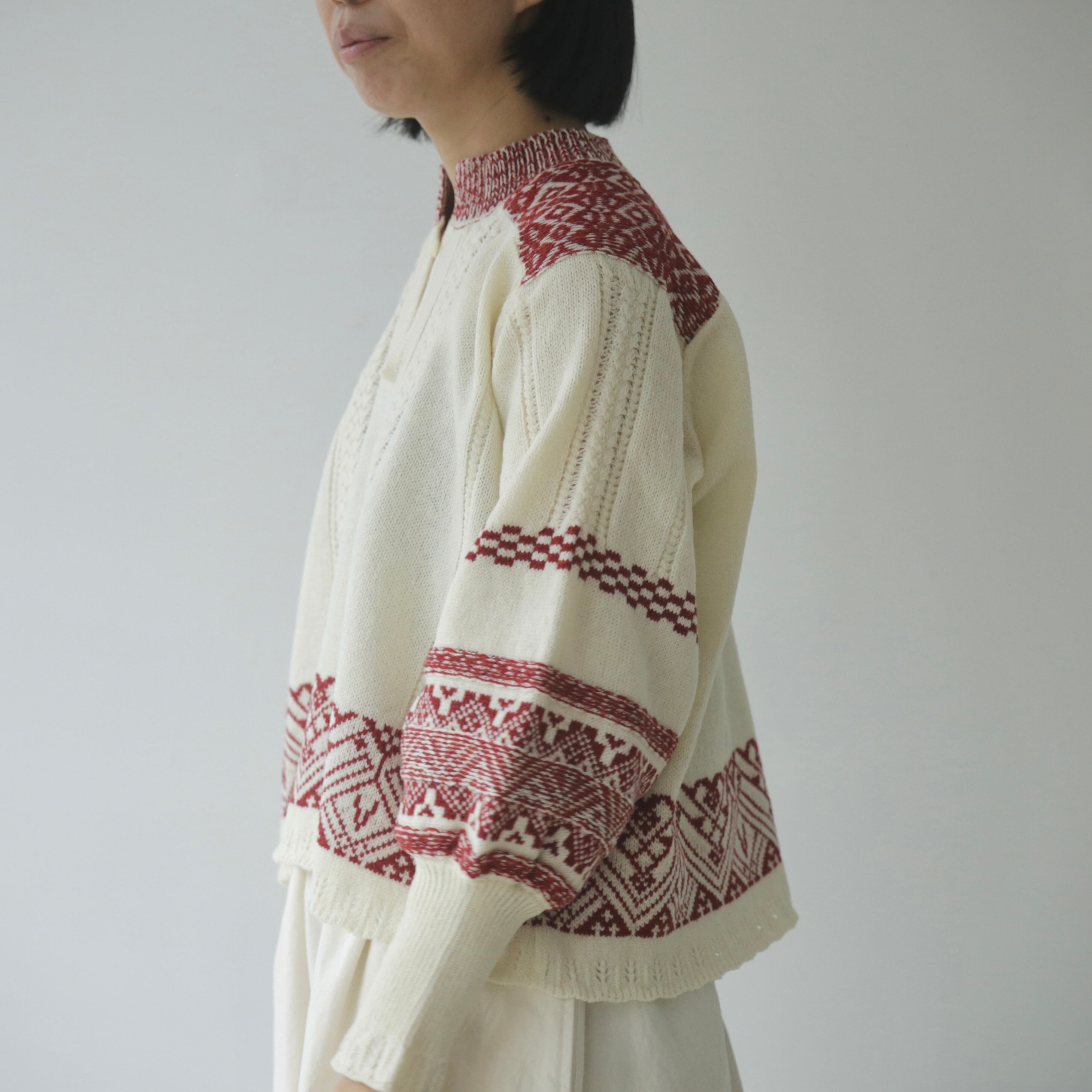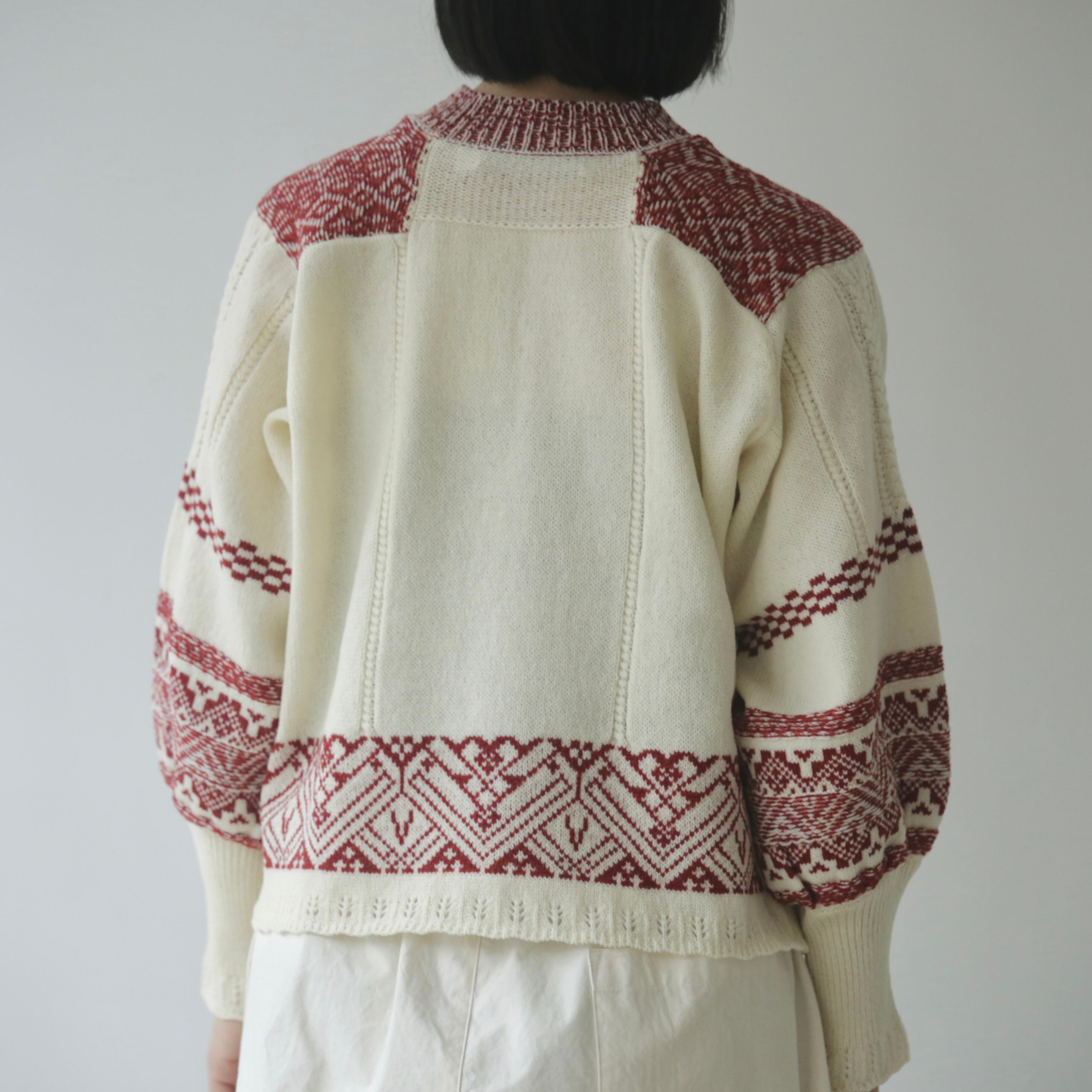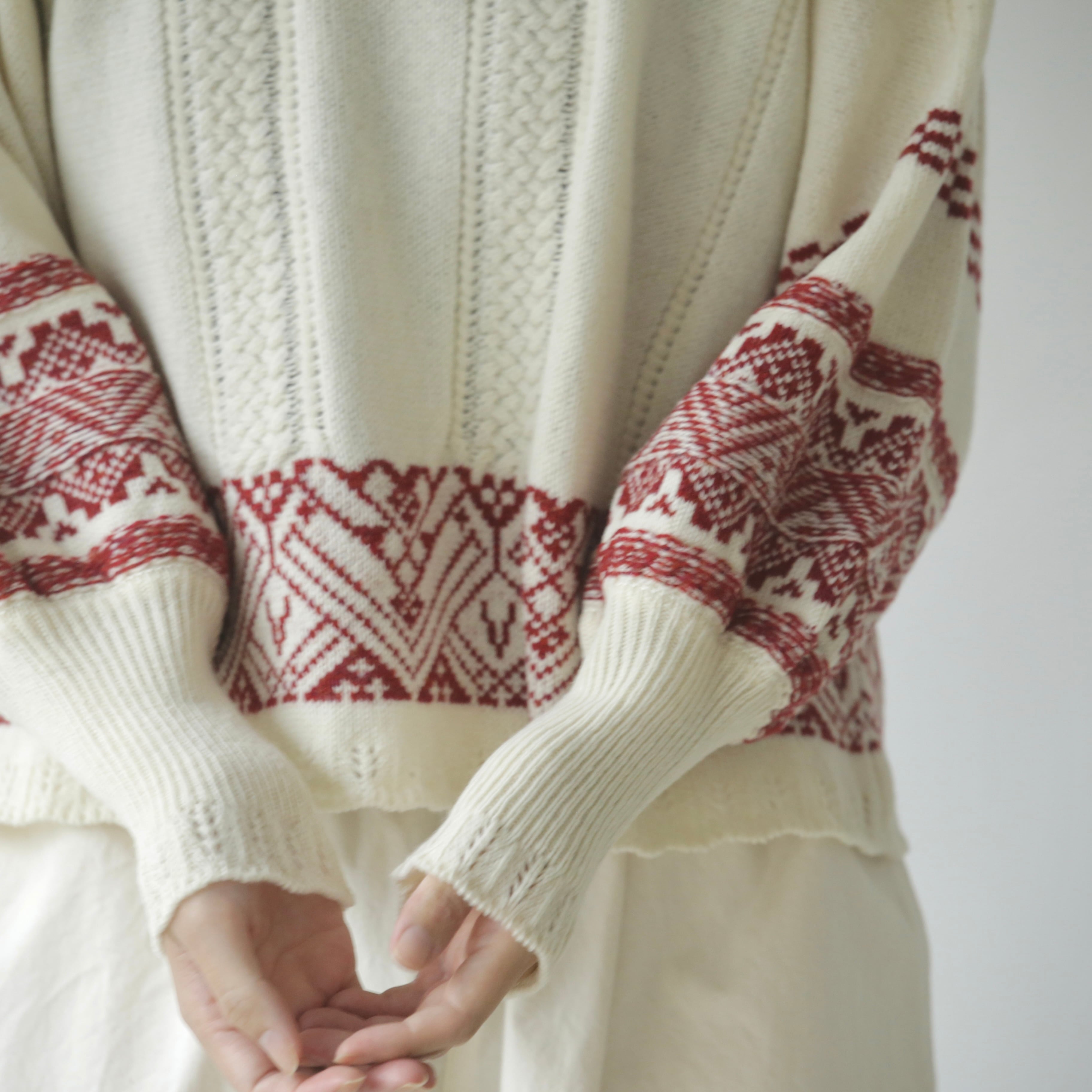 サーミ民族の装飾文化に着想を得た、ノルディック柄のプルオーバーニット。オーストラリア産のラムズウールを贅沢に使用し、ふんわりと軽く、包み込まれるような温もりがあります。