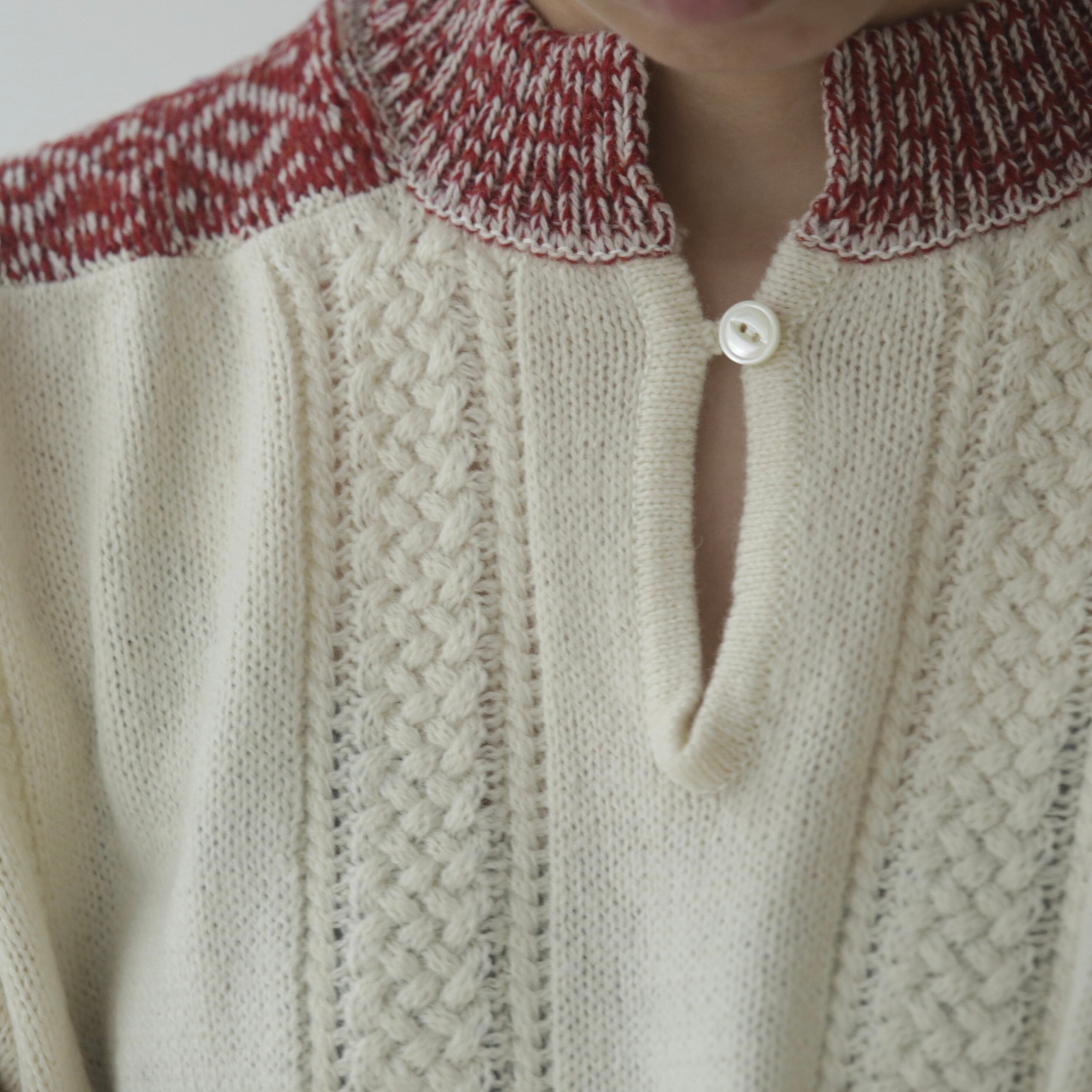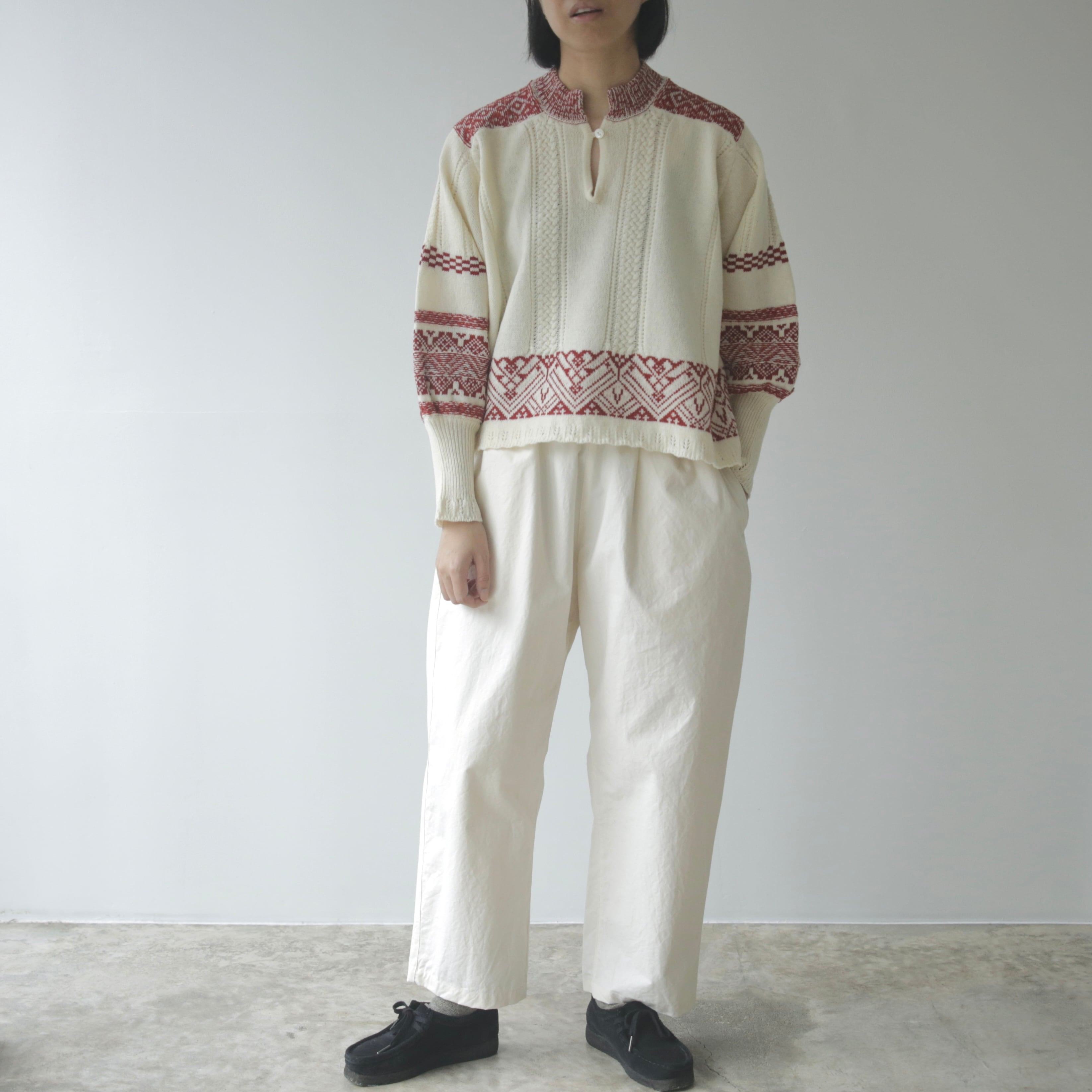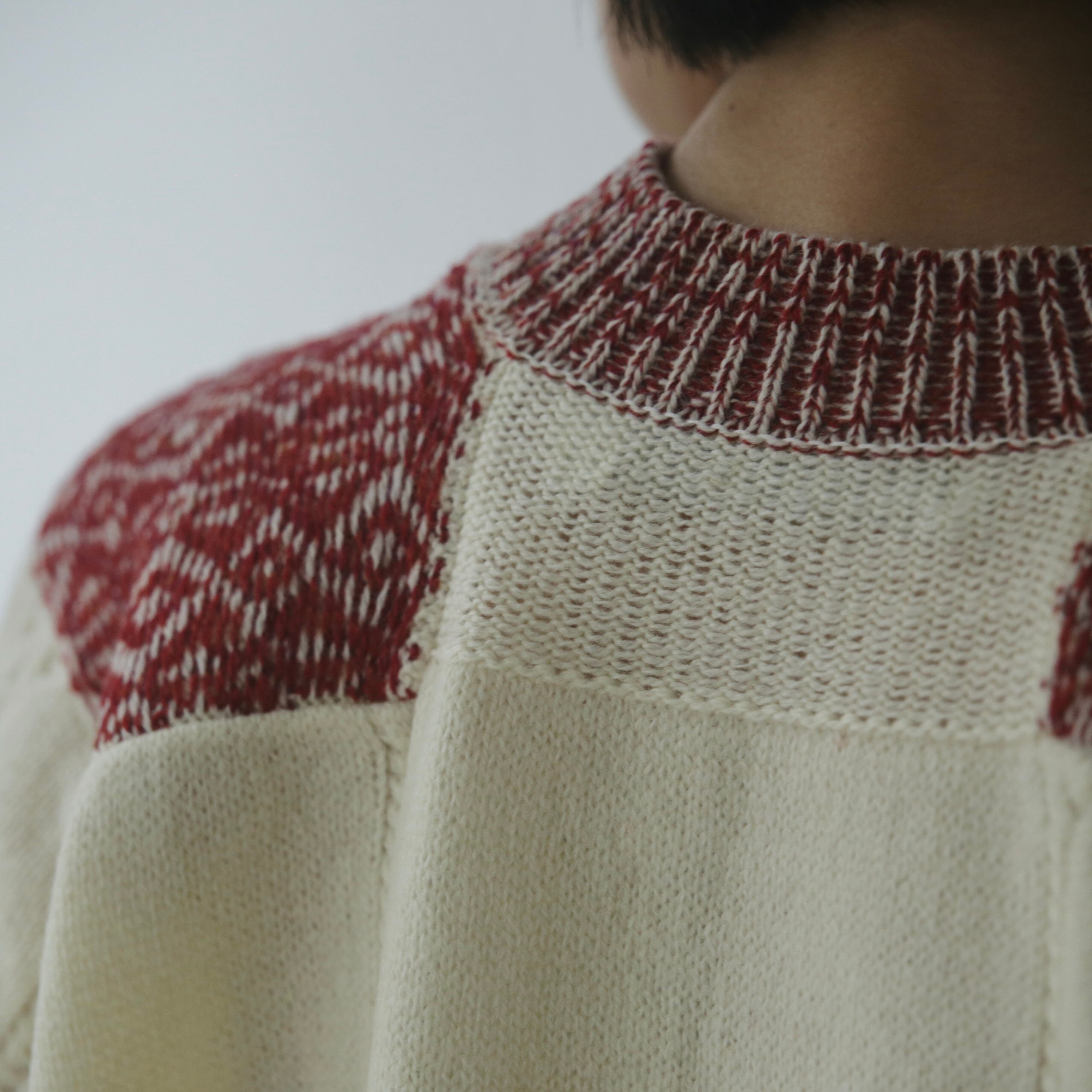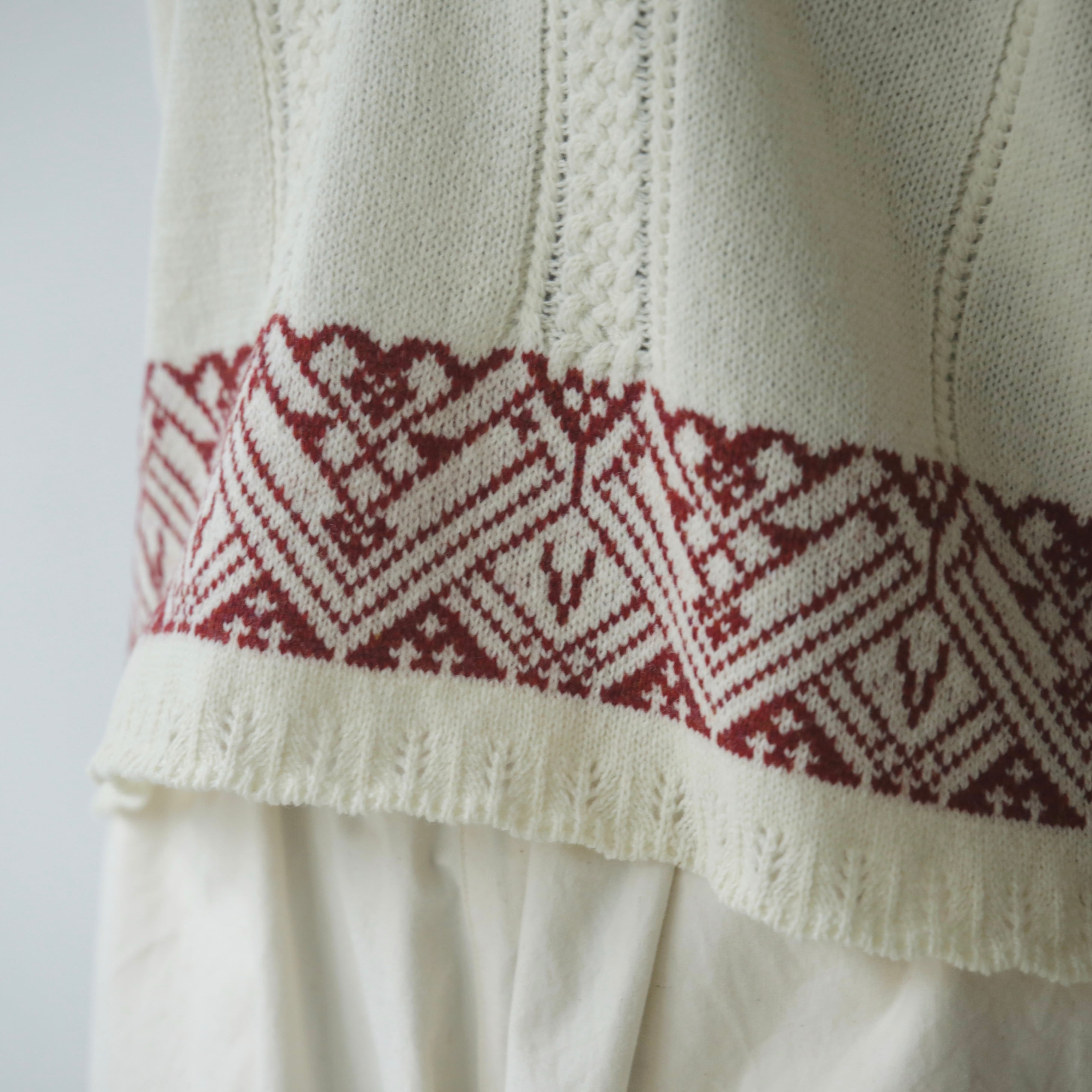 サーミ民族の装飾文化に着想を得た、ノルディック柄のプルオーバーニット。オーストラリア産のラムズウールを贅沢に使用し、ふんわりと軽く、包み込まれるような温もりがあります。