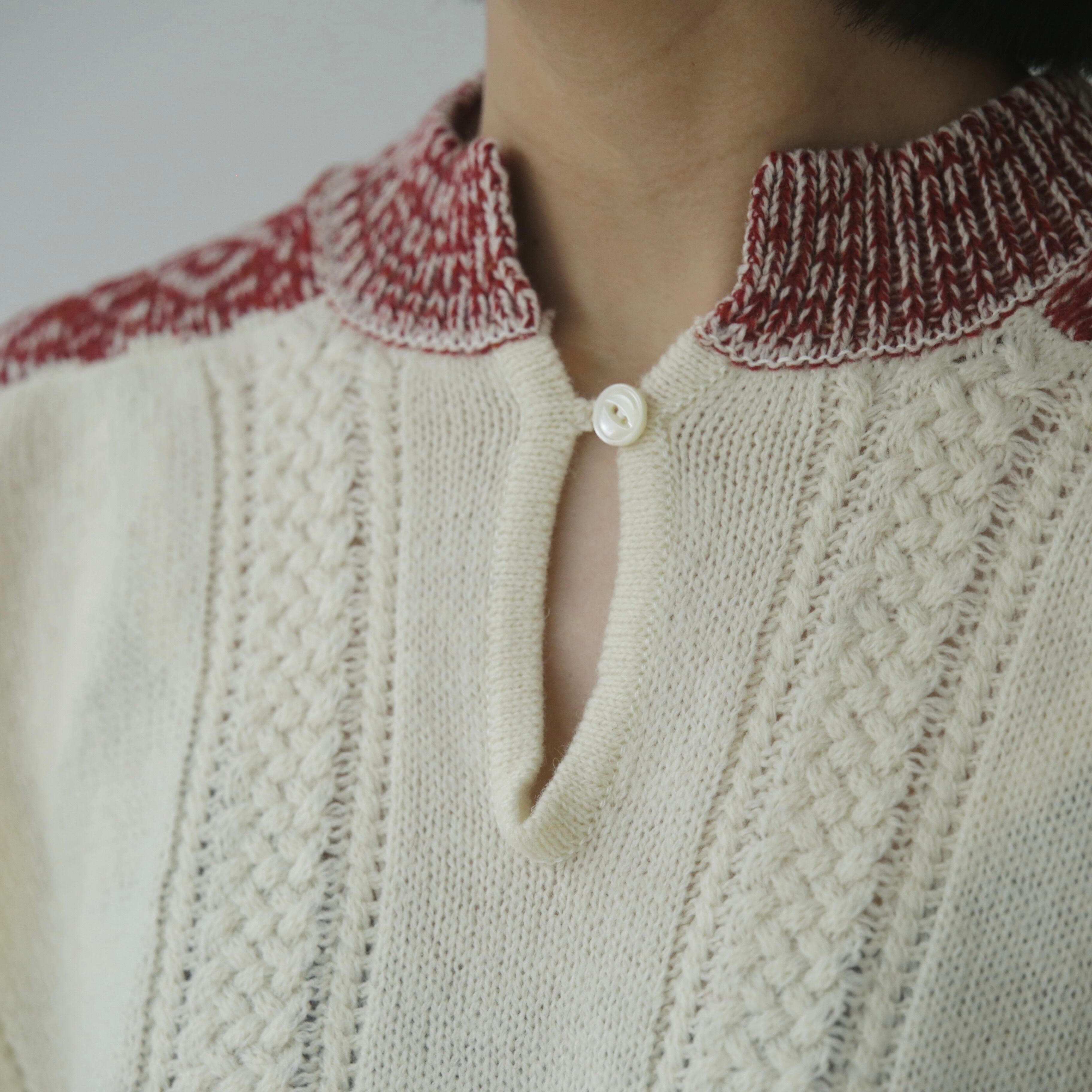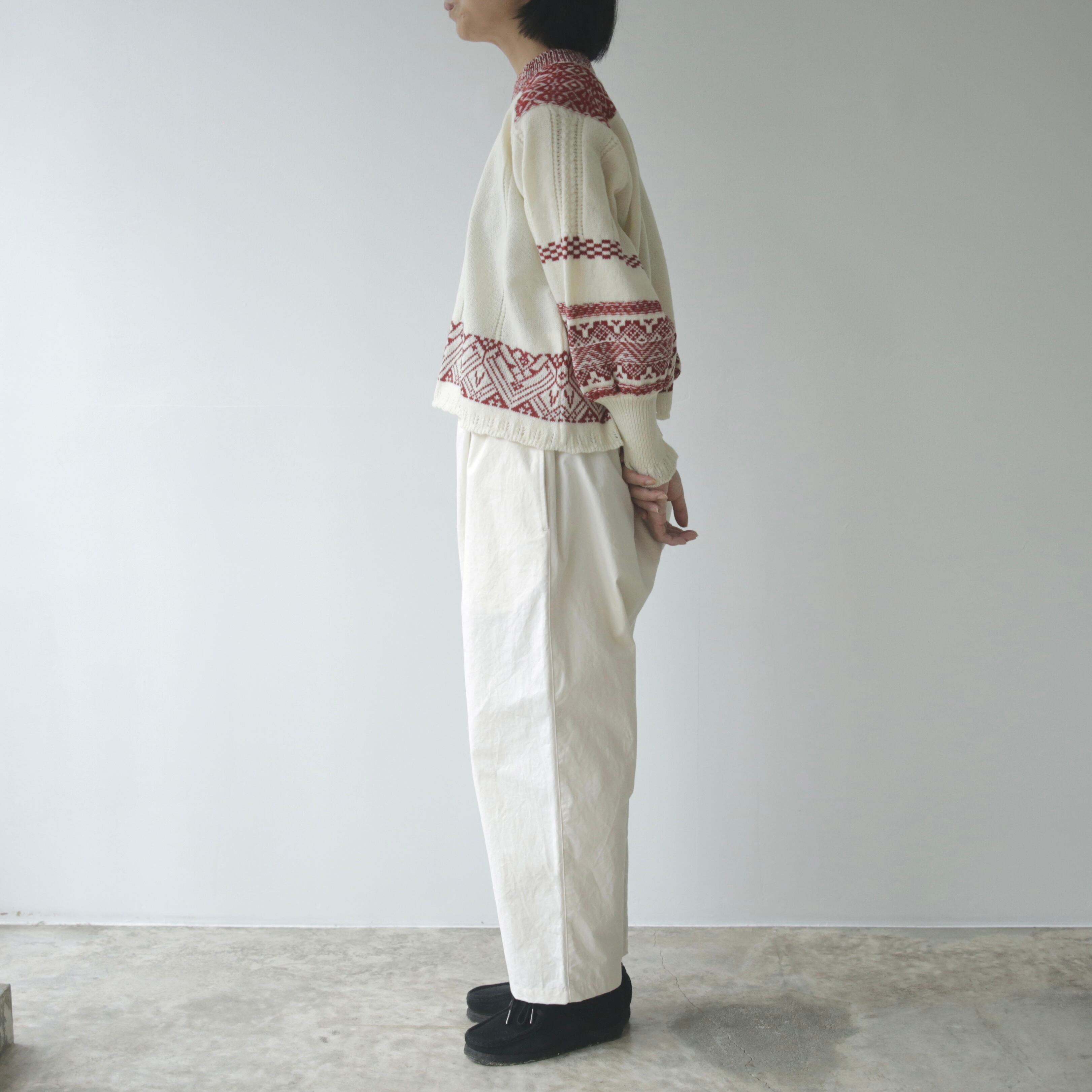 チノパンツやデニムとの相性が良く、シンプルなボトムと合わせることで柄の美しさが際立ちます。ワンピースの上から重ねてもバランスが良く、着こなしに温もりと、ほどよい存在感を添えてくれます。