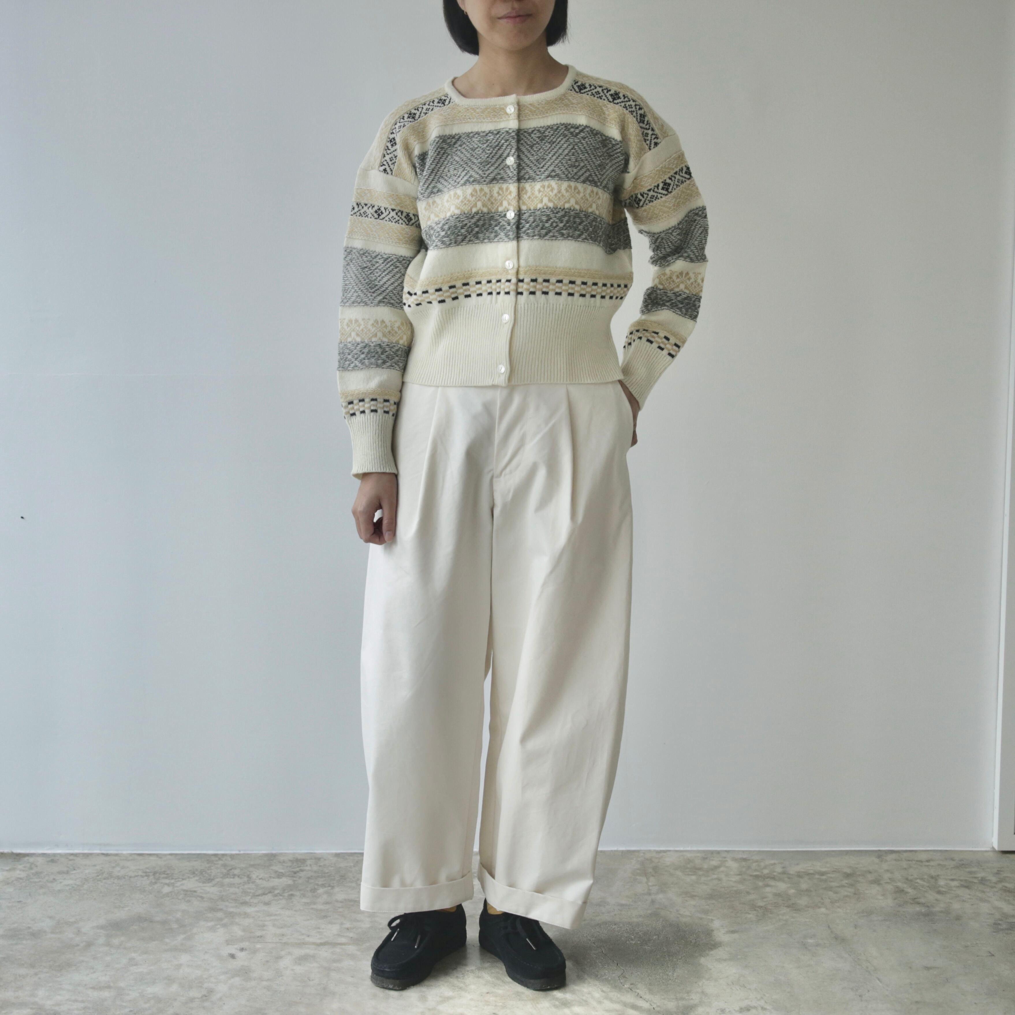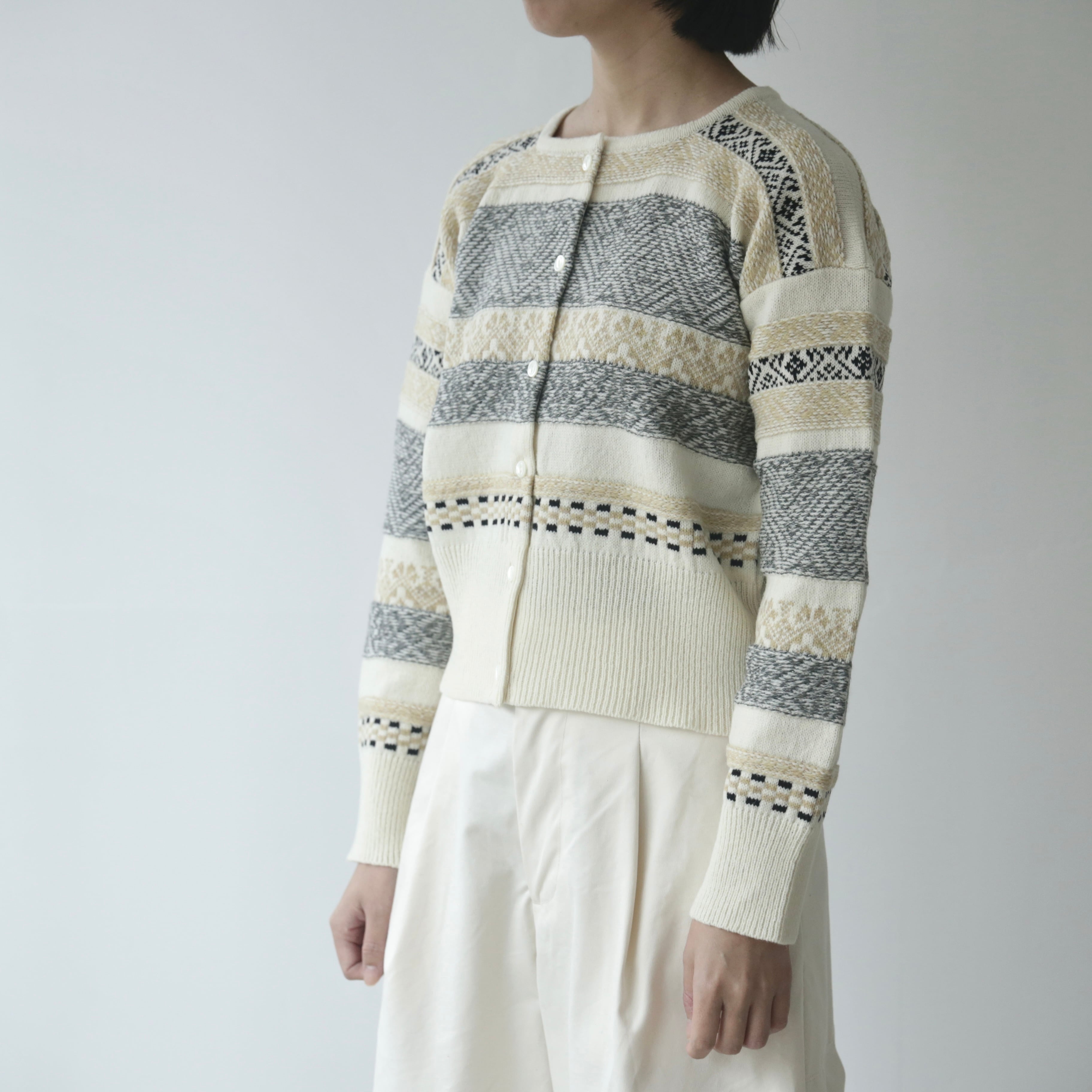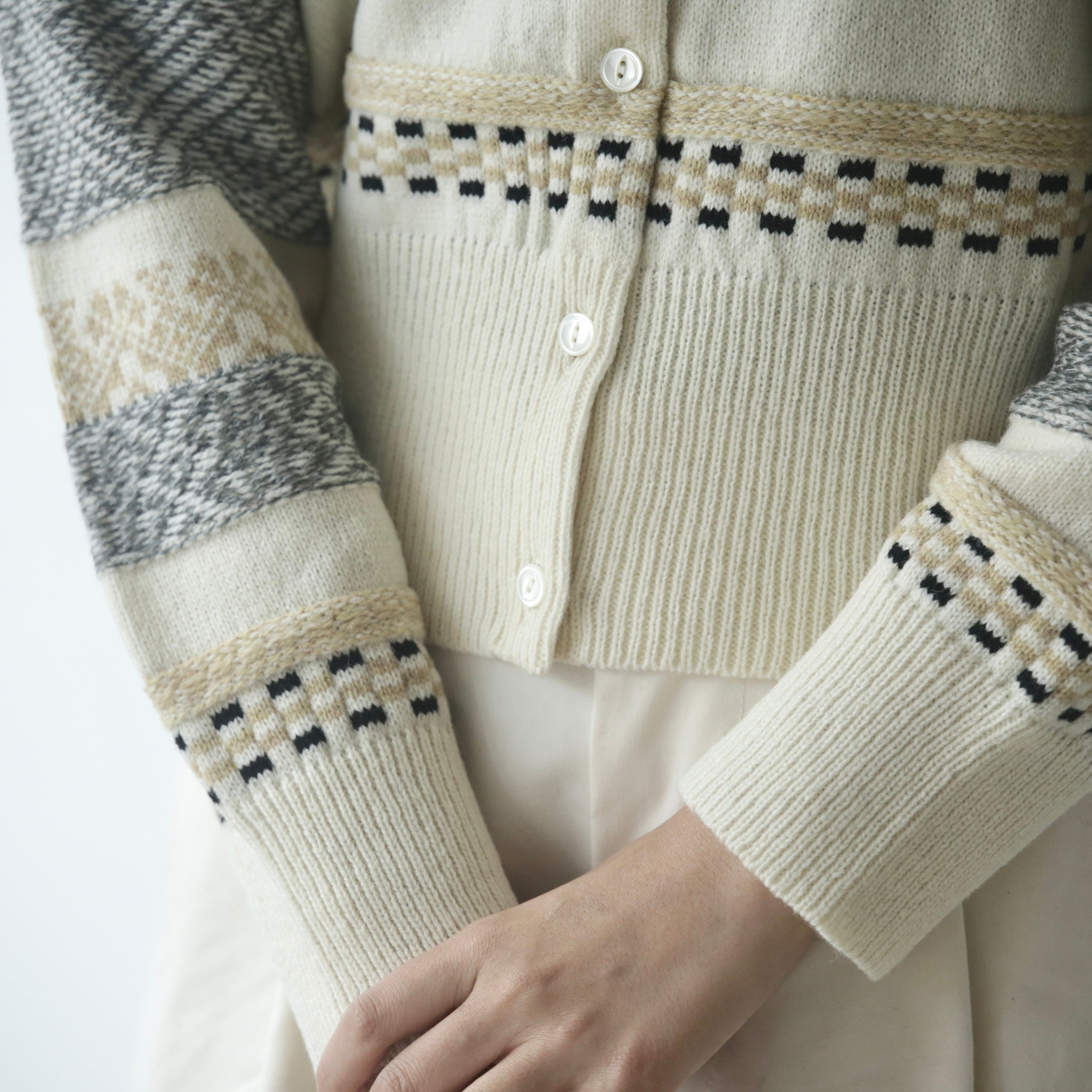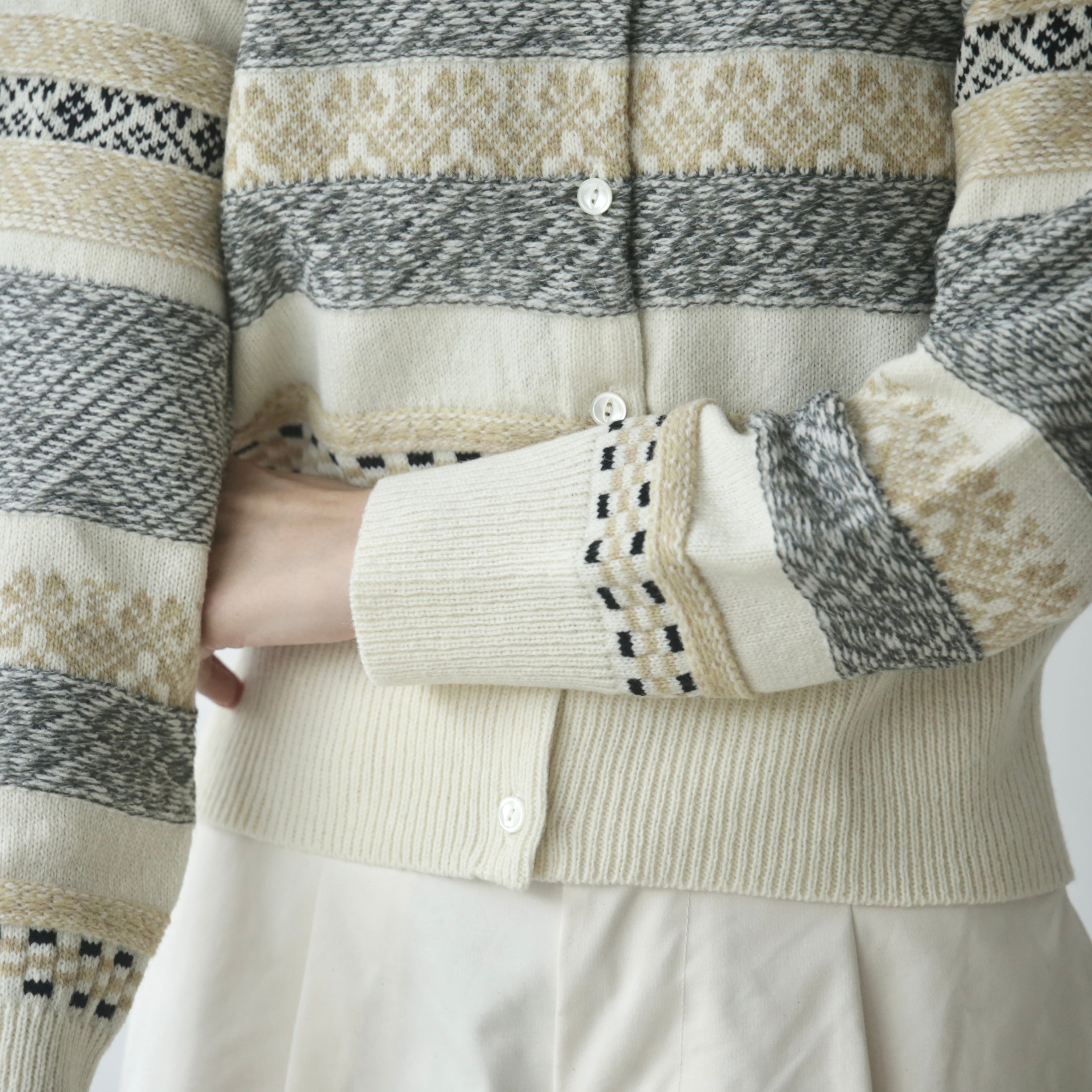 サーミ民族の装飾文化に着想を得た、ノルディック柄のカーディガン。オーストラリア産のラムズウールを贅沢に使用し、ふんわりと軽く、包み込まれるような温もりがあります。