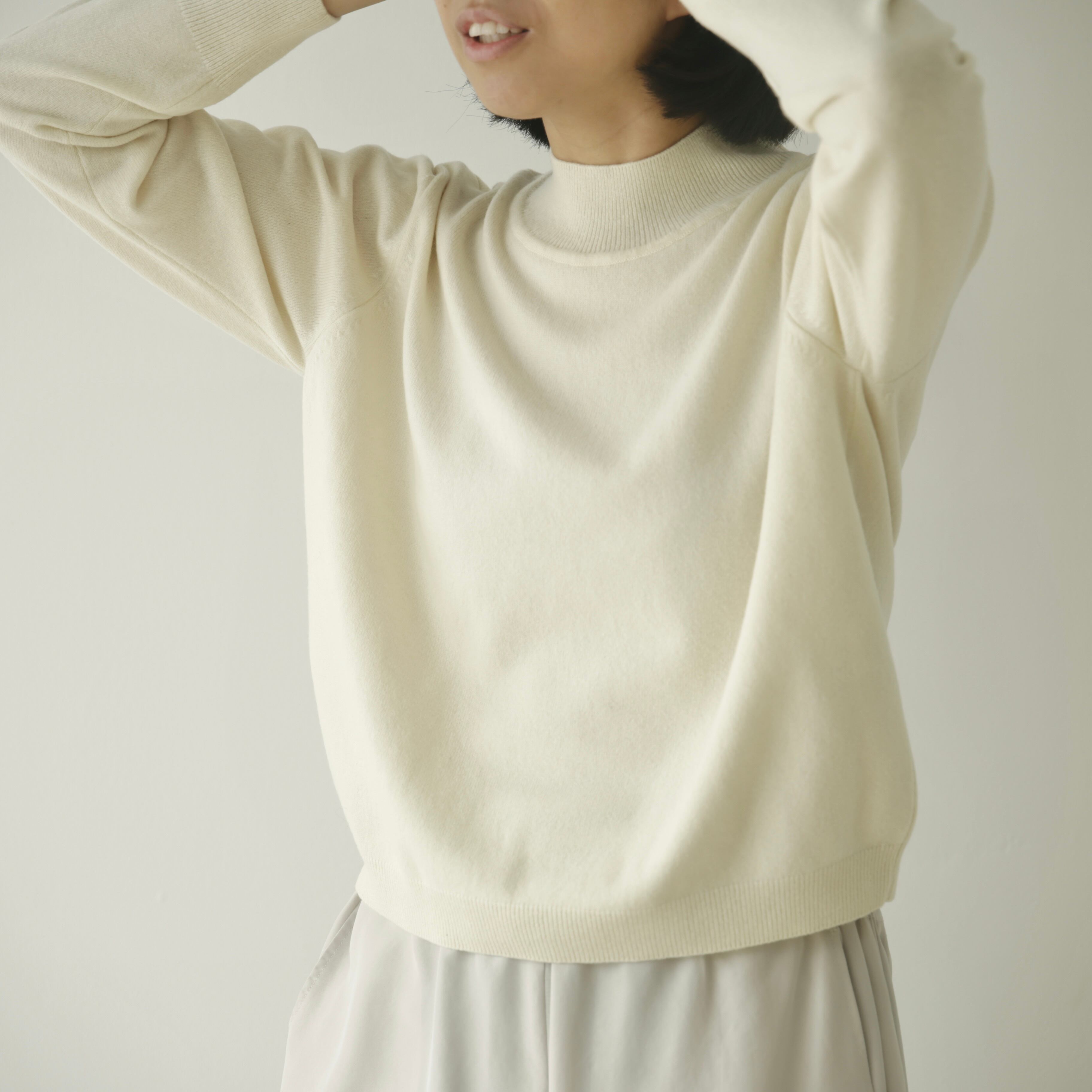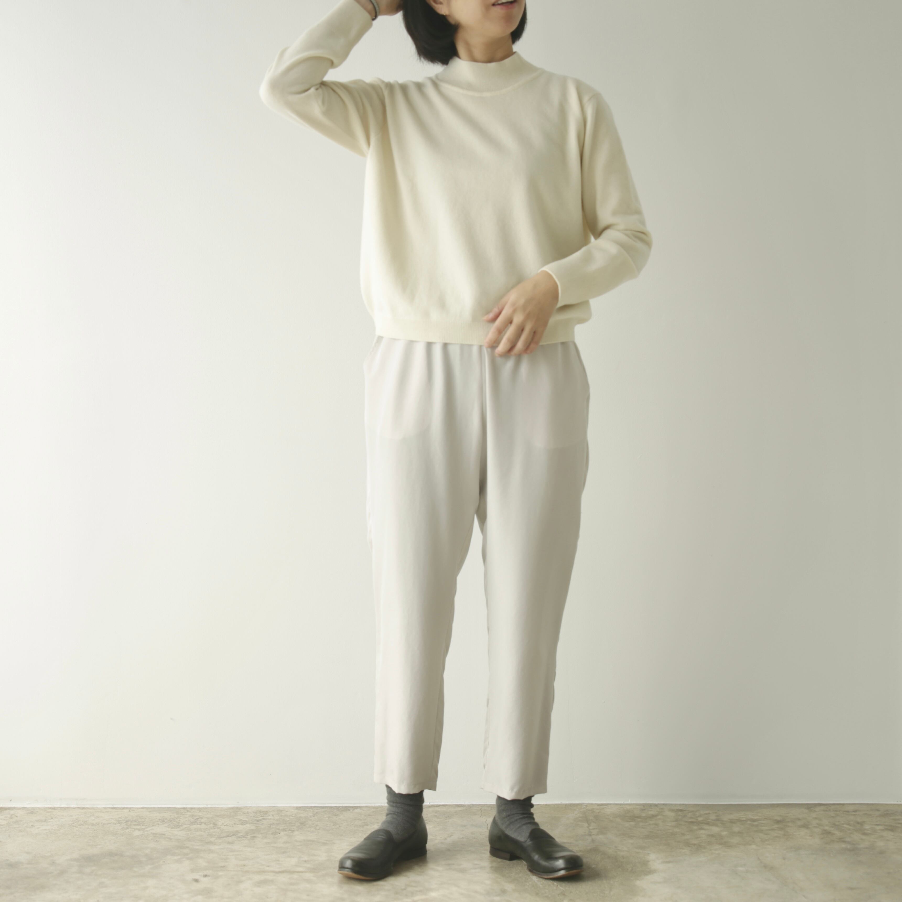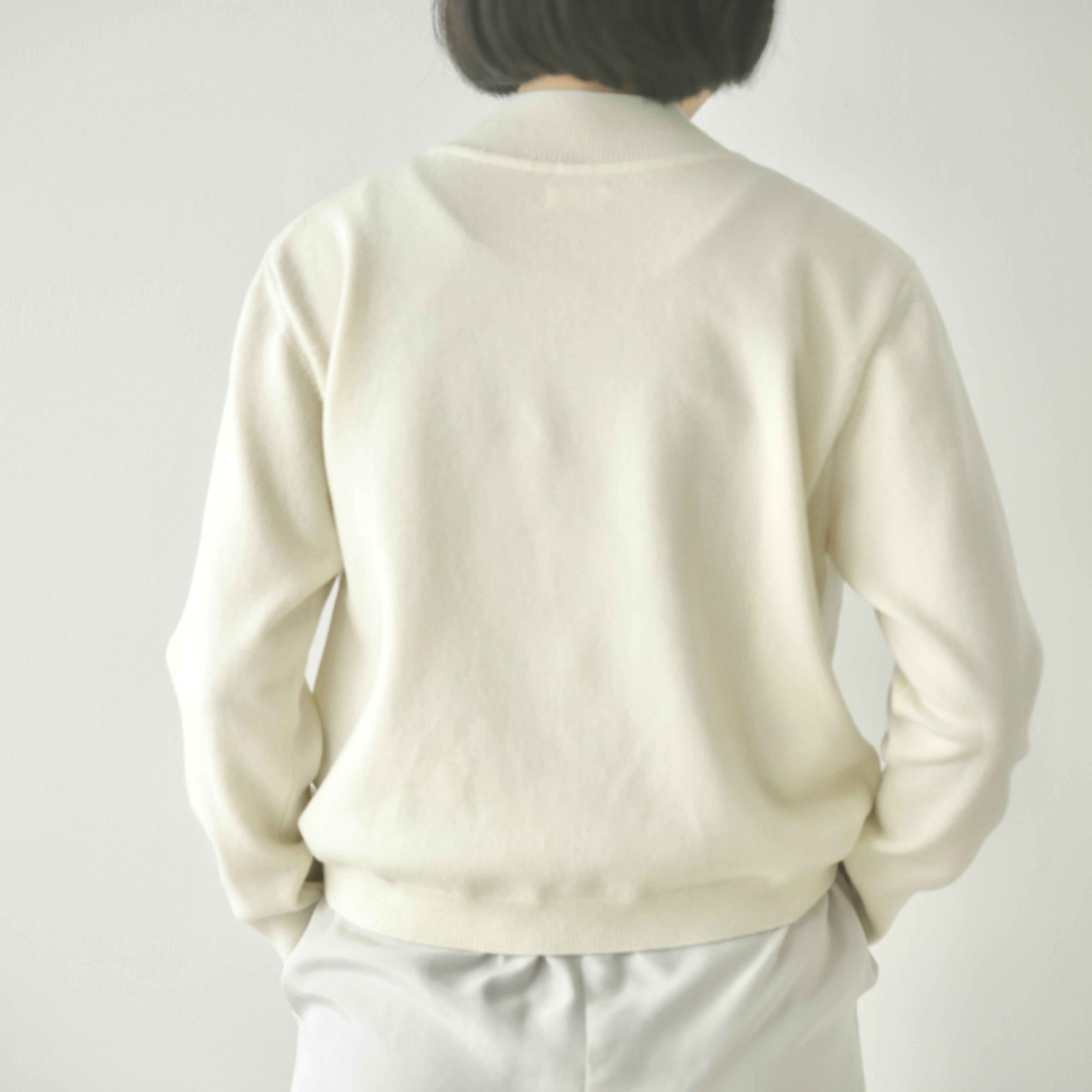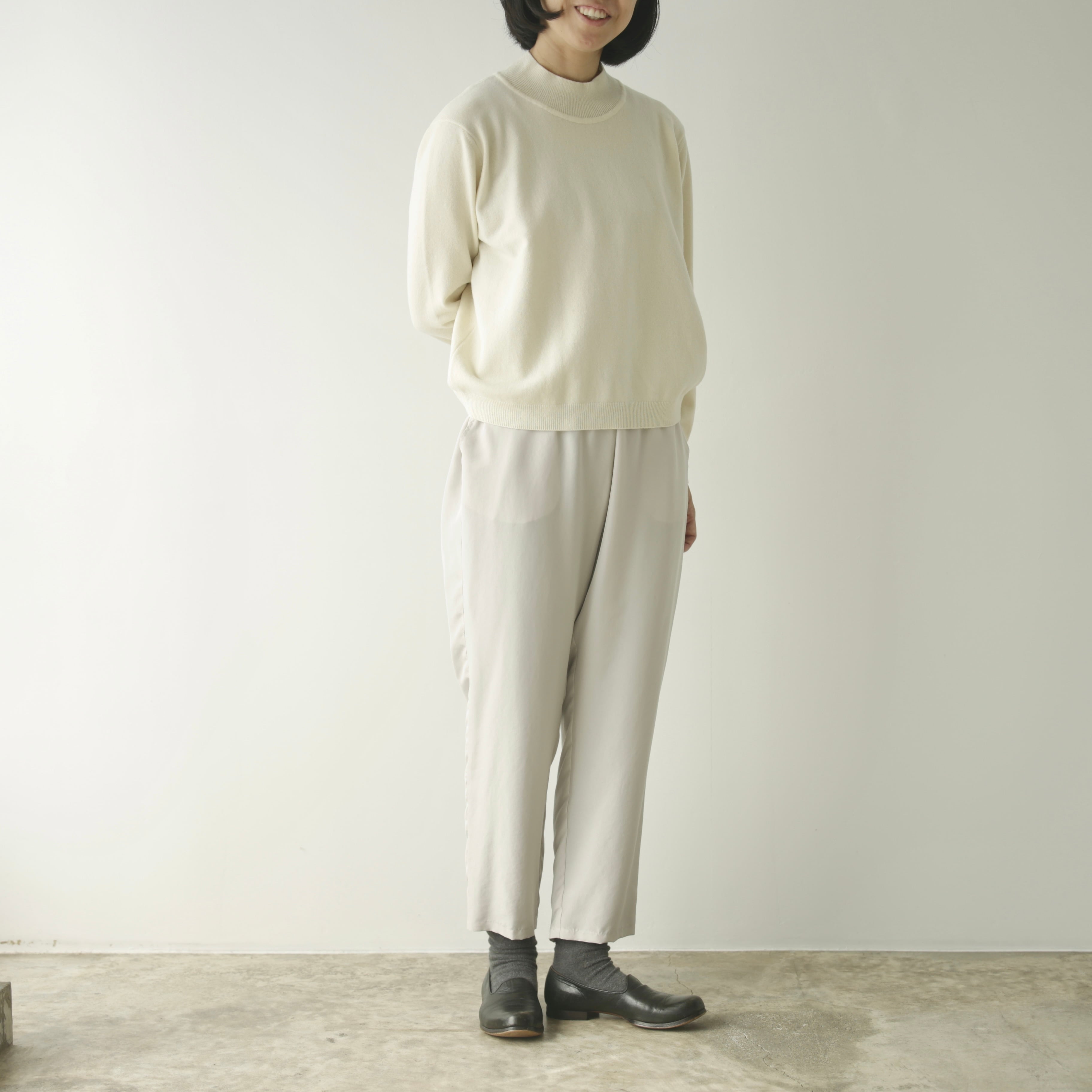 チノパンやデニムを合わせてベーシックに、同系色のパンツを合わせれば、やわらかな抜け感のあるスタイルに。丁寧にケアを重ねながら、季節を越えて楽しめるニットです。