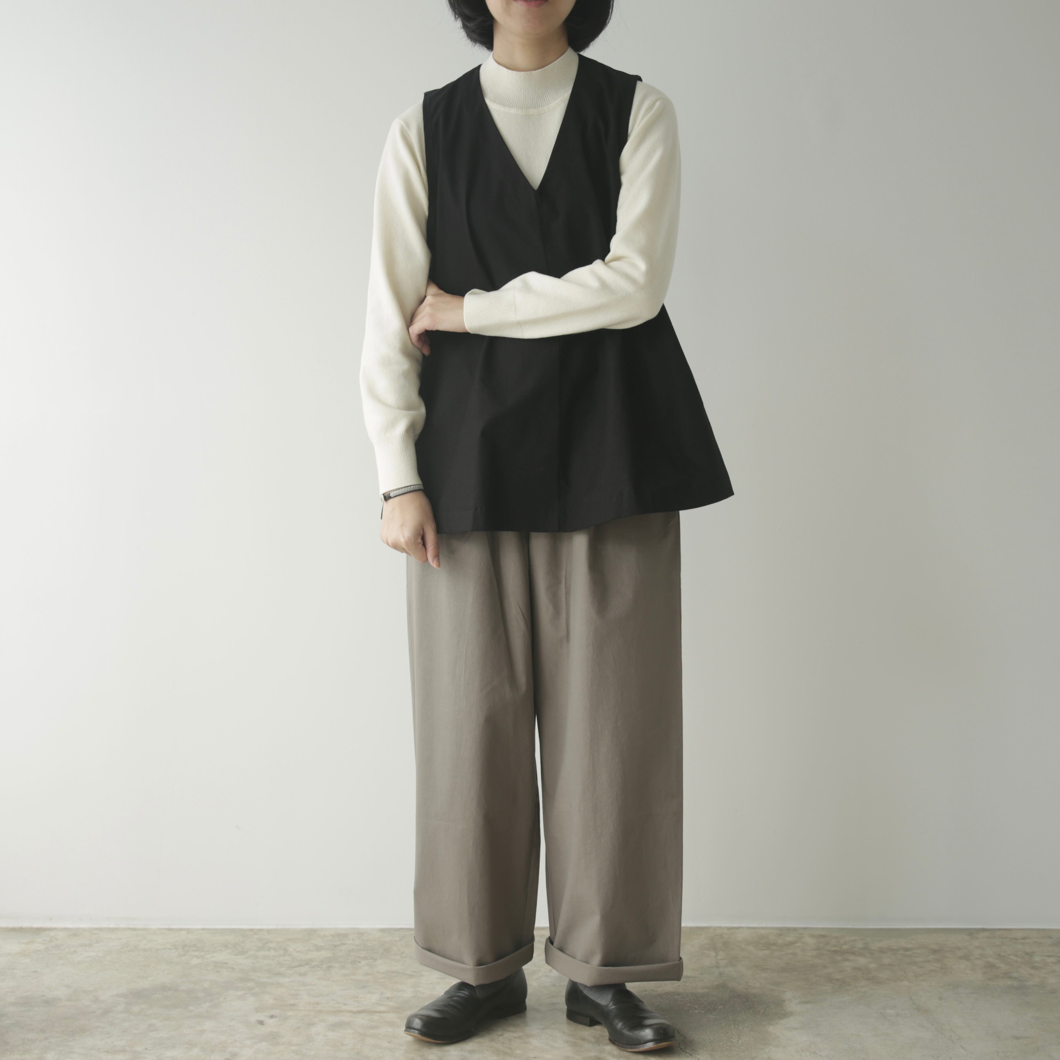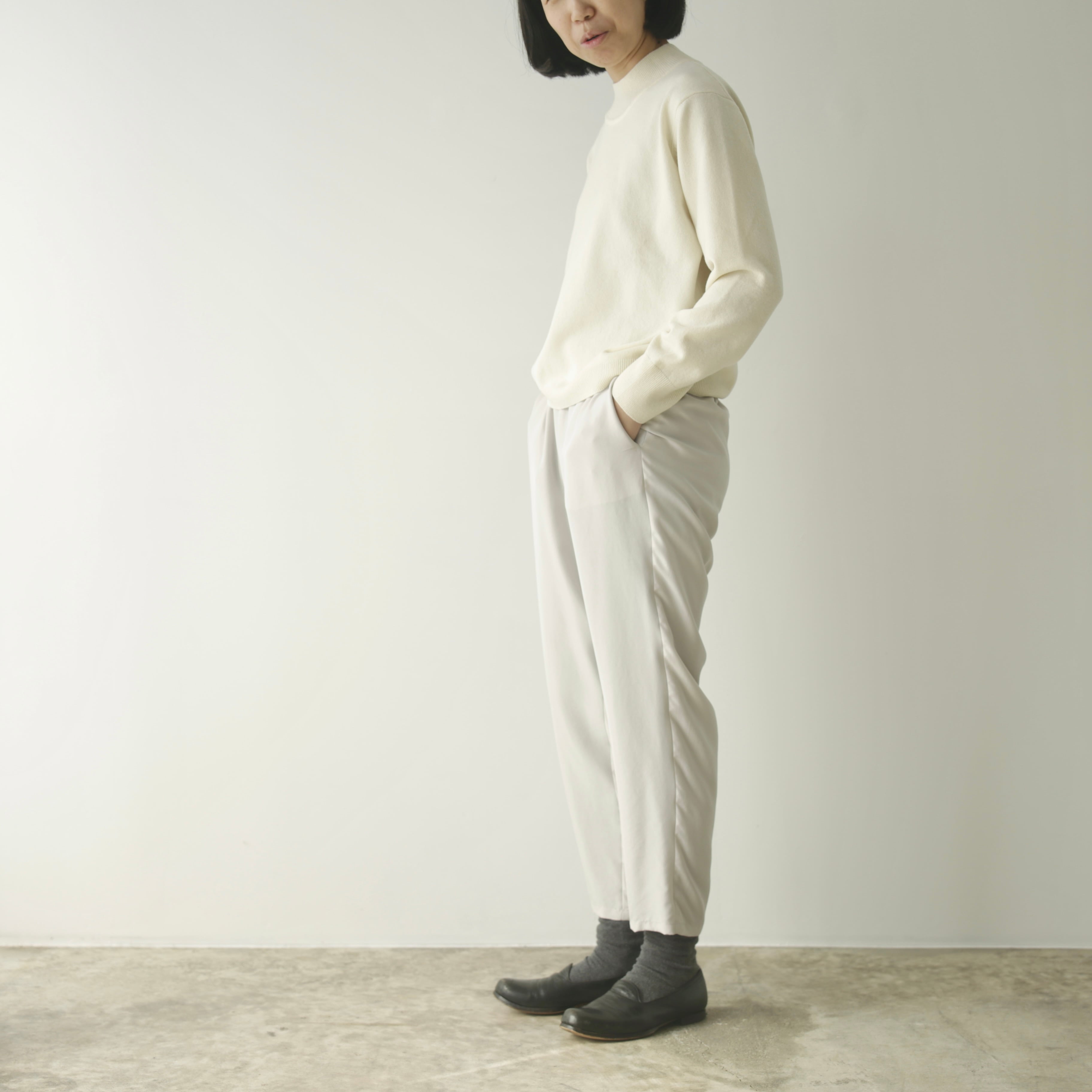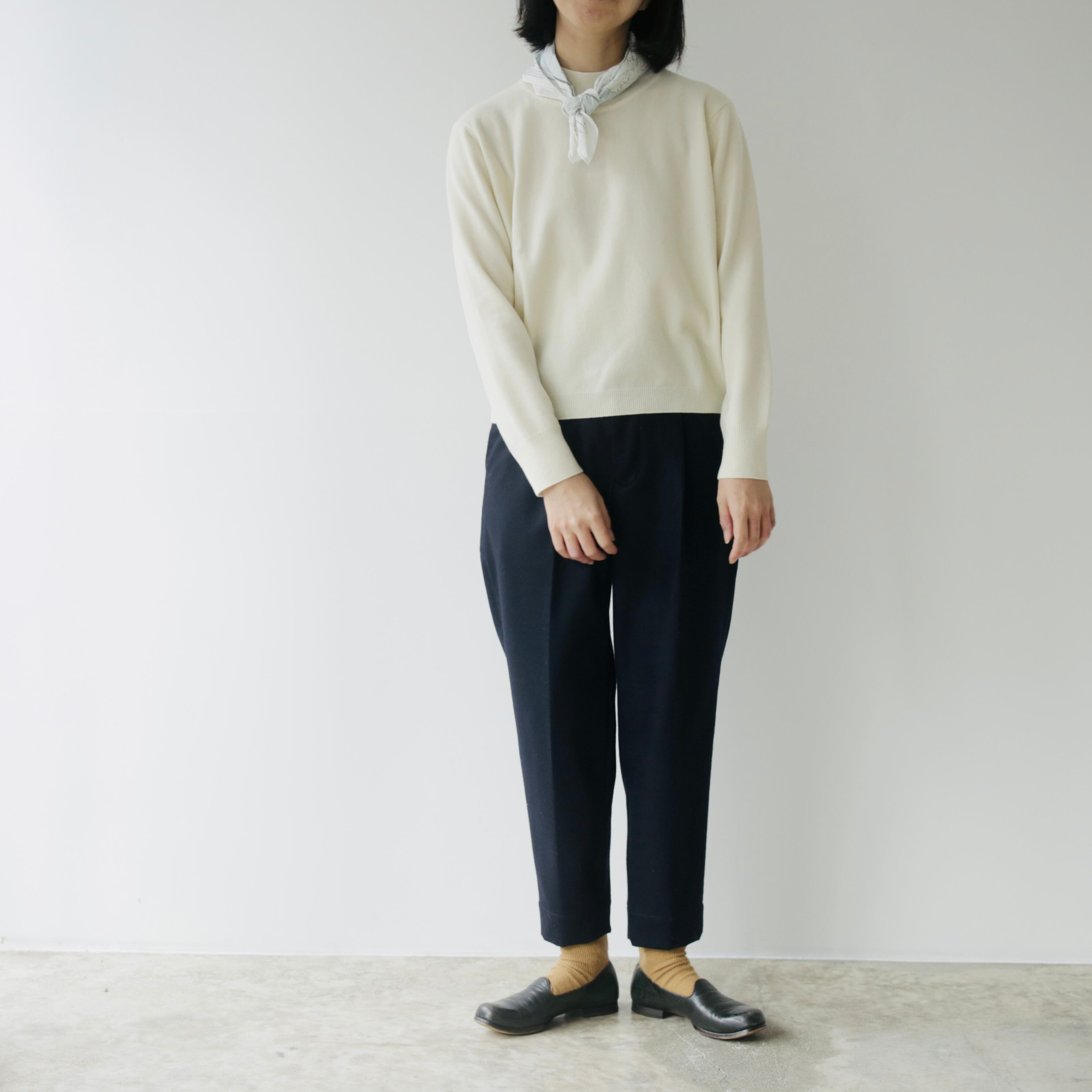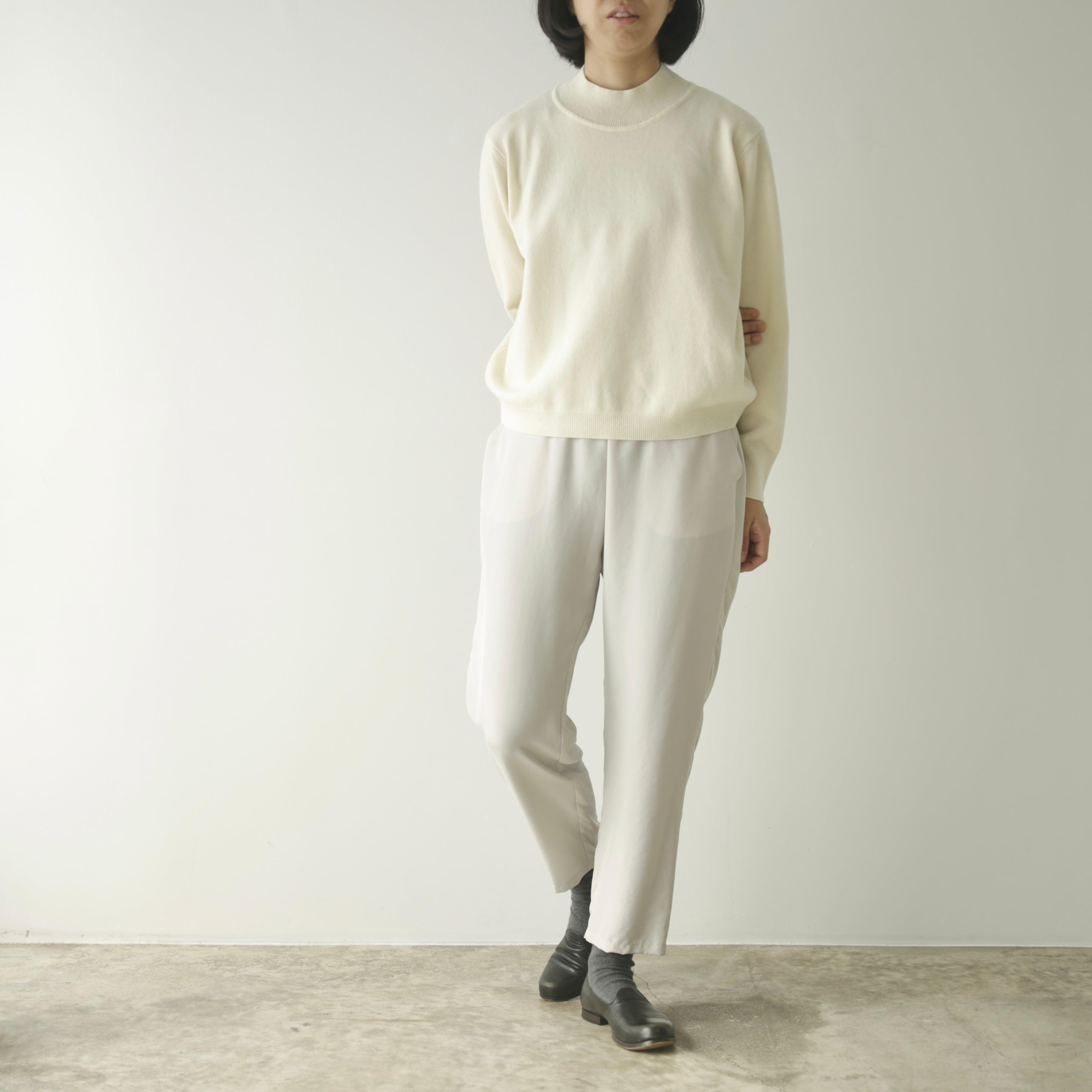 チノパンやデニムを合わせてベーシックに、同系色のパンツを合わせれば、やわらかな抜け感のあるスタイルに。丁寧にケアを重ねながら、季節を越えて楽しめるニットです。