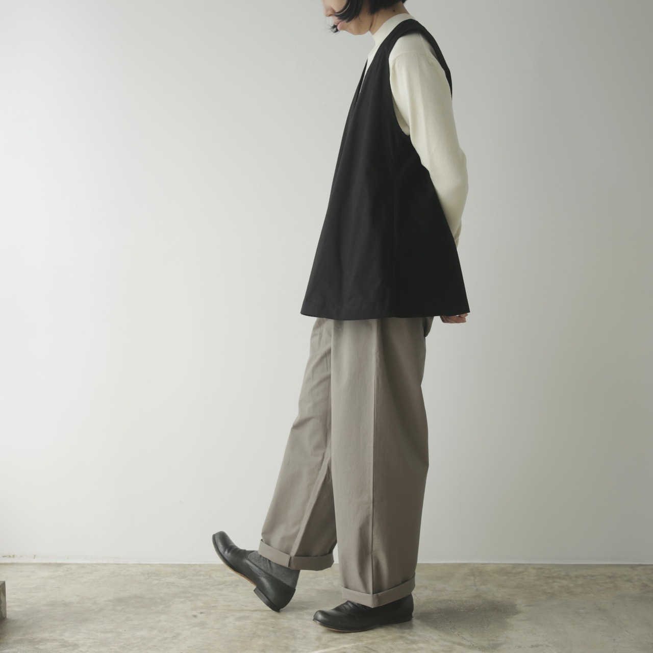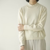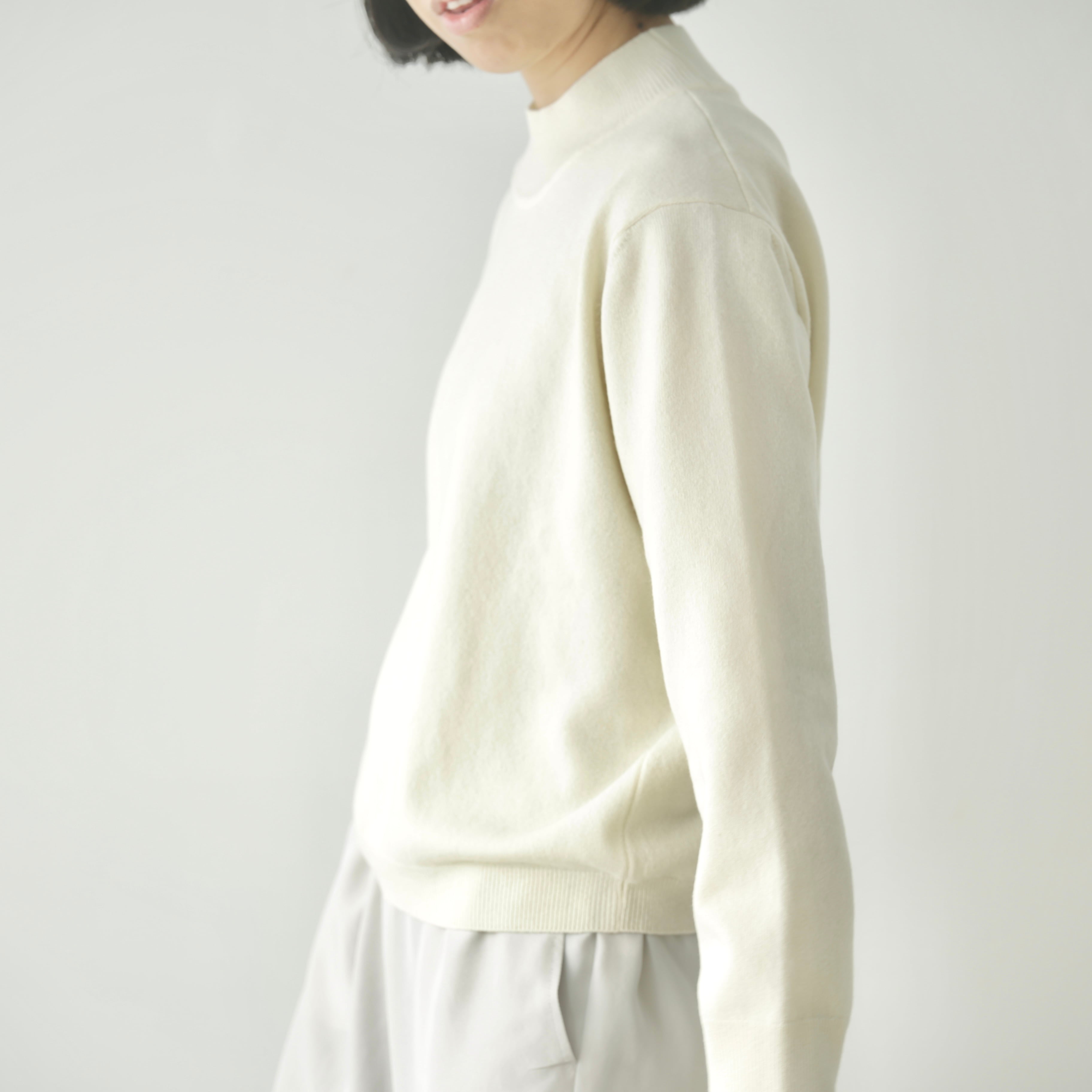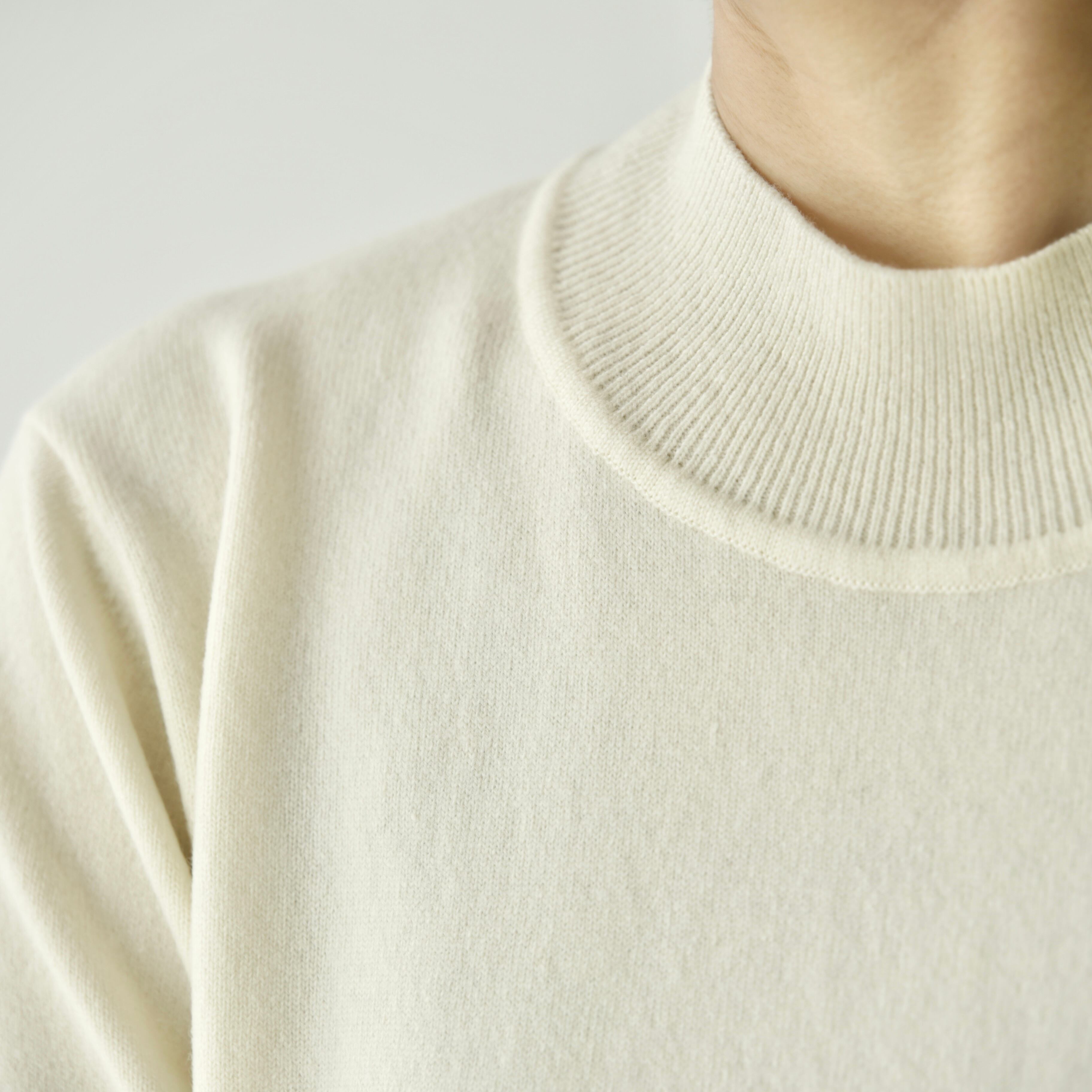 高密度に編み立てられたウールは、空気をふんわりと含みながら、適度なコシと温もりを感じさせてくれます。風を通しにくく、首もとをやさしく包み込むような着心地。ネックはやや低めに設計されており、ほどよい抜け感を添えています。