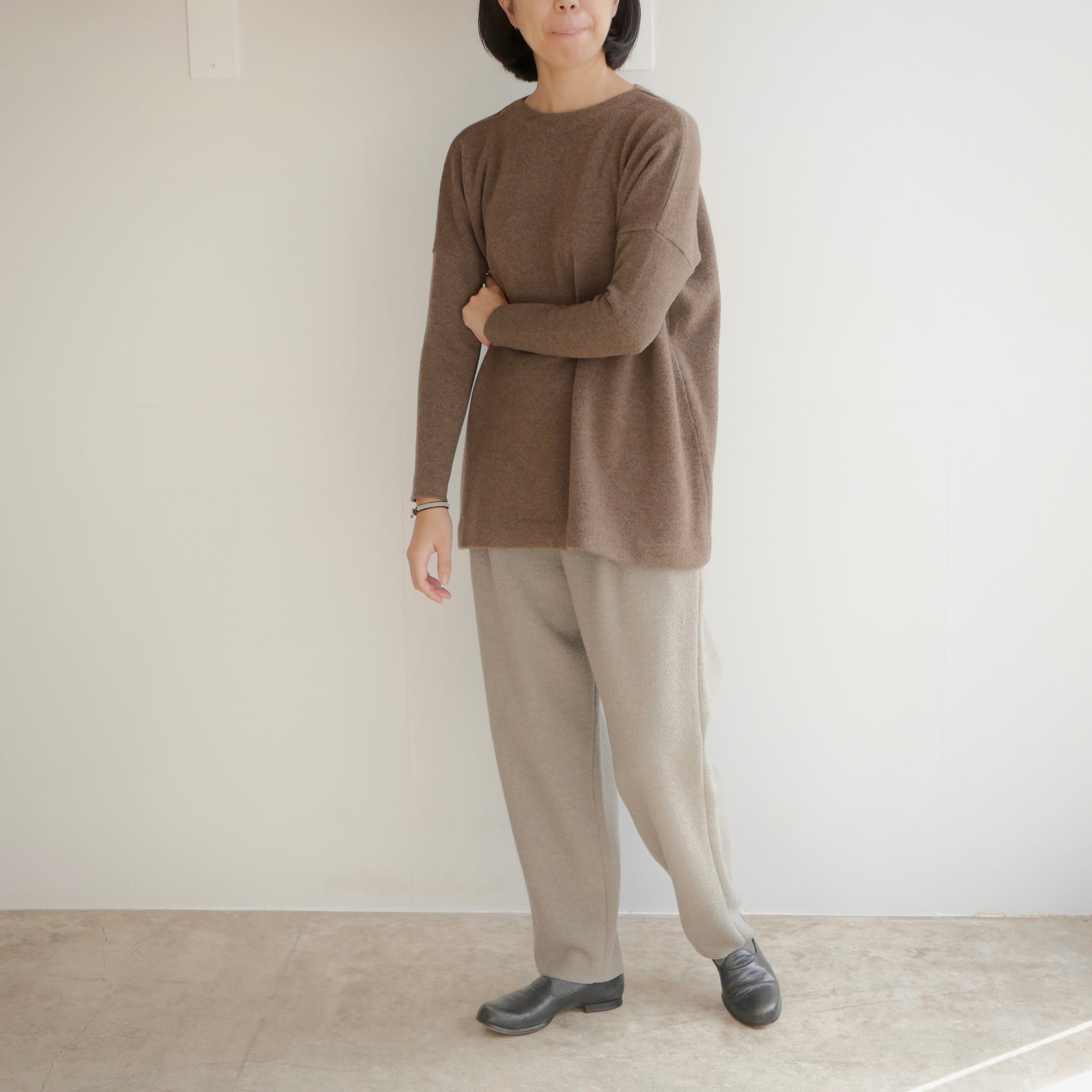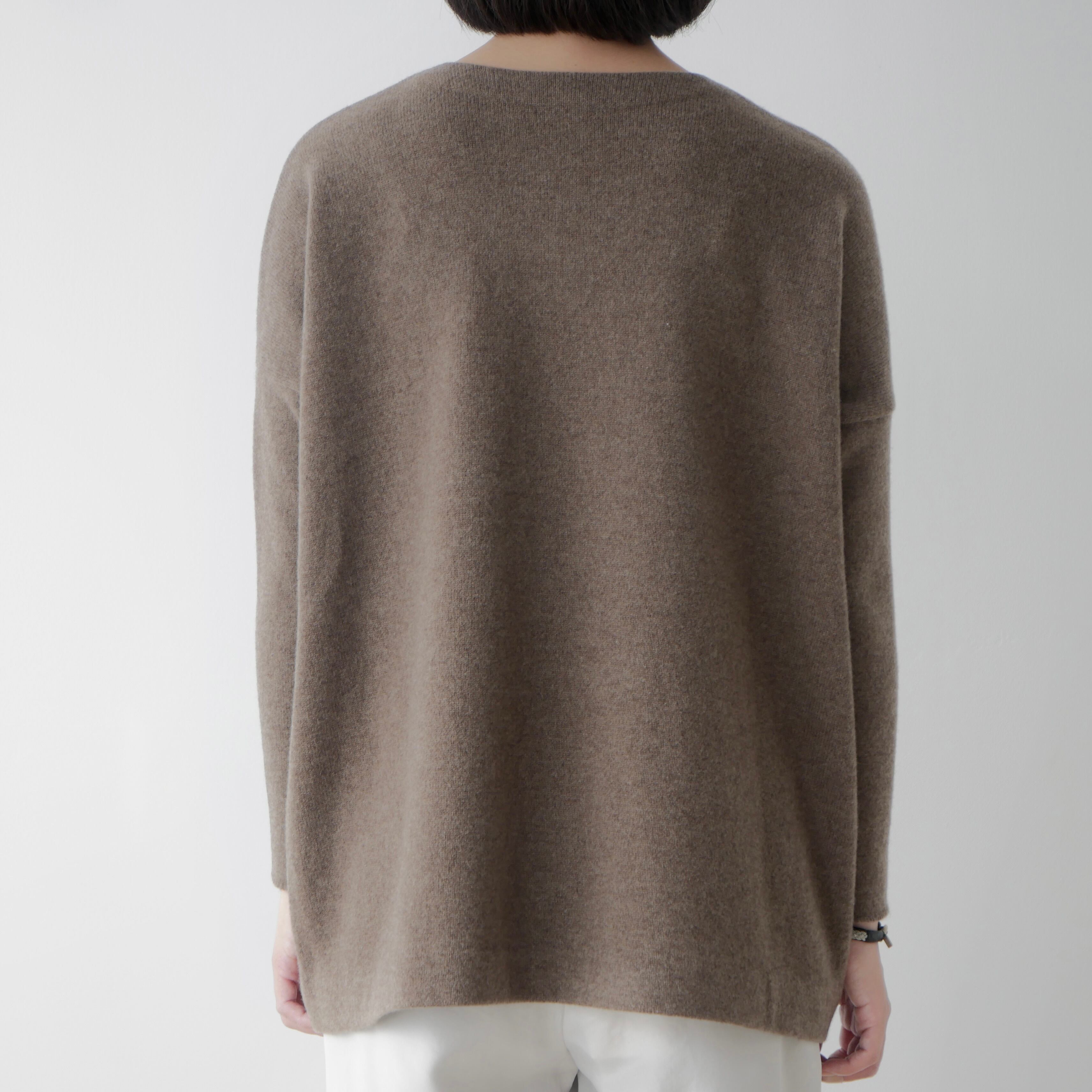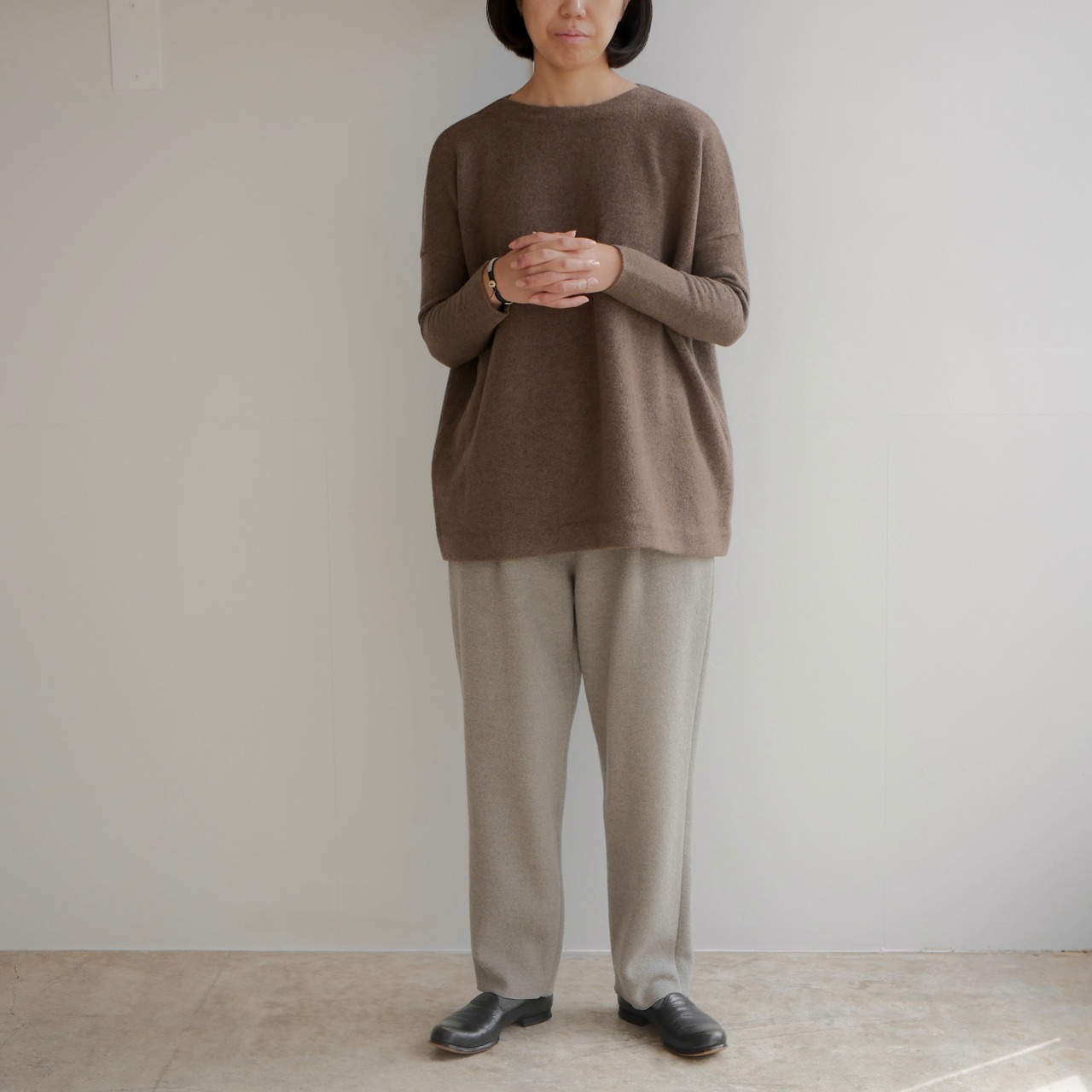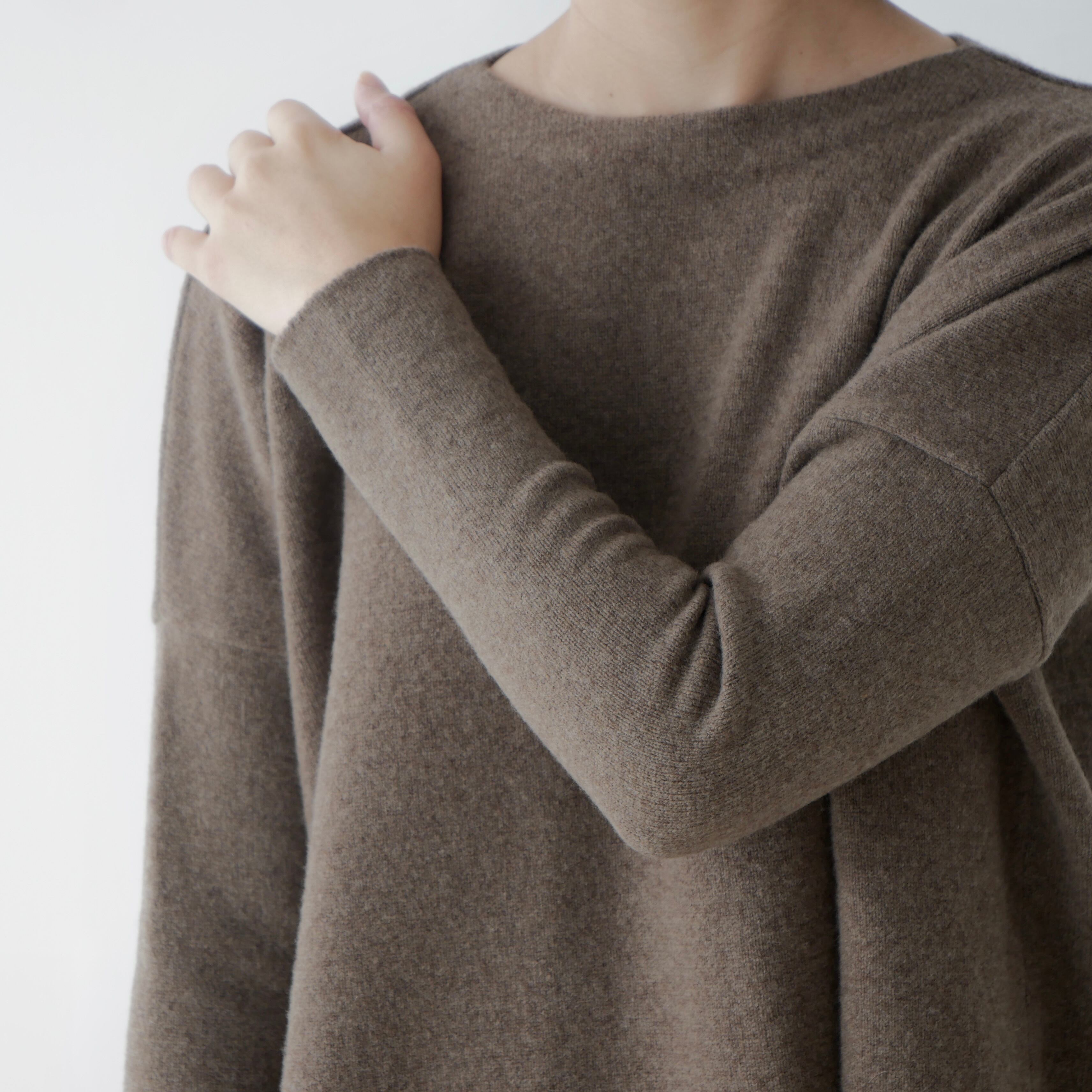 軽くてやわらかなウールで編み立てたロングニット。ほどよい開きのある首もとと、すとんと落ちる袖のラインが上品な印象を添えています。