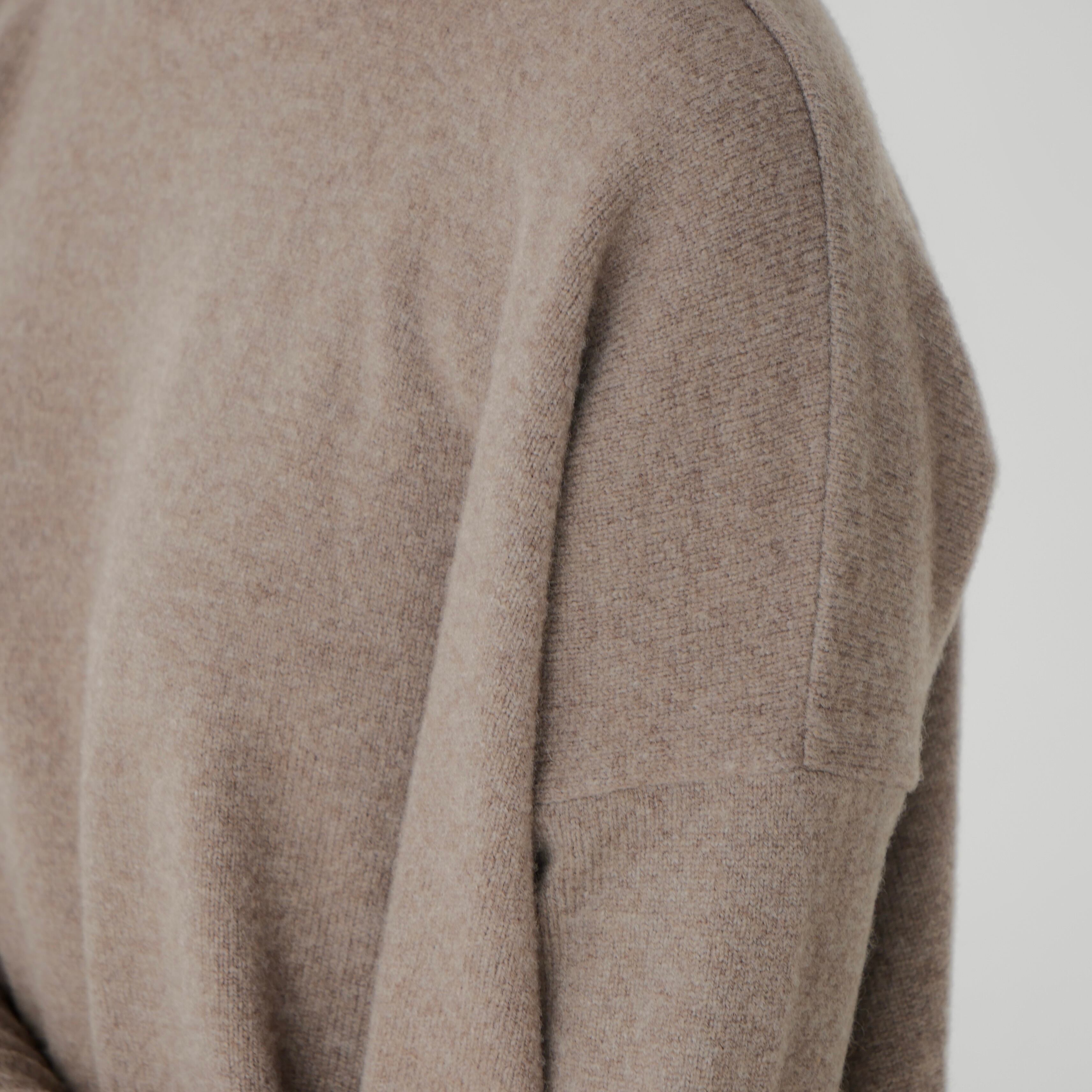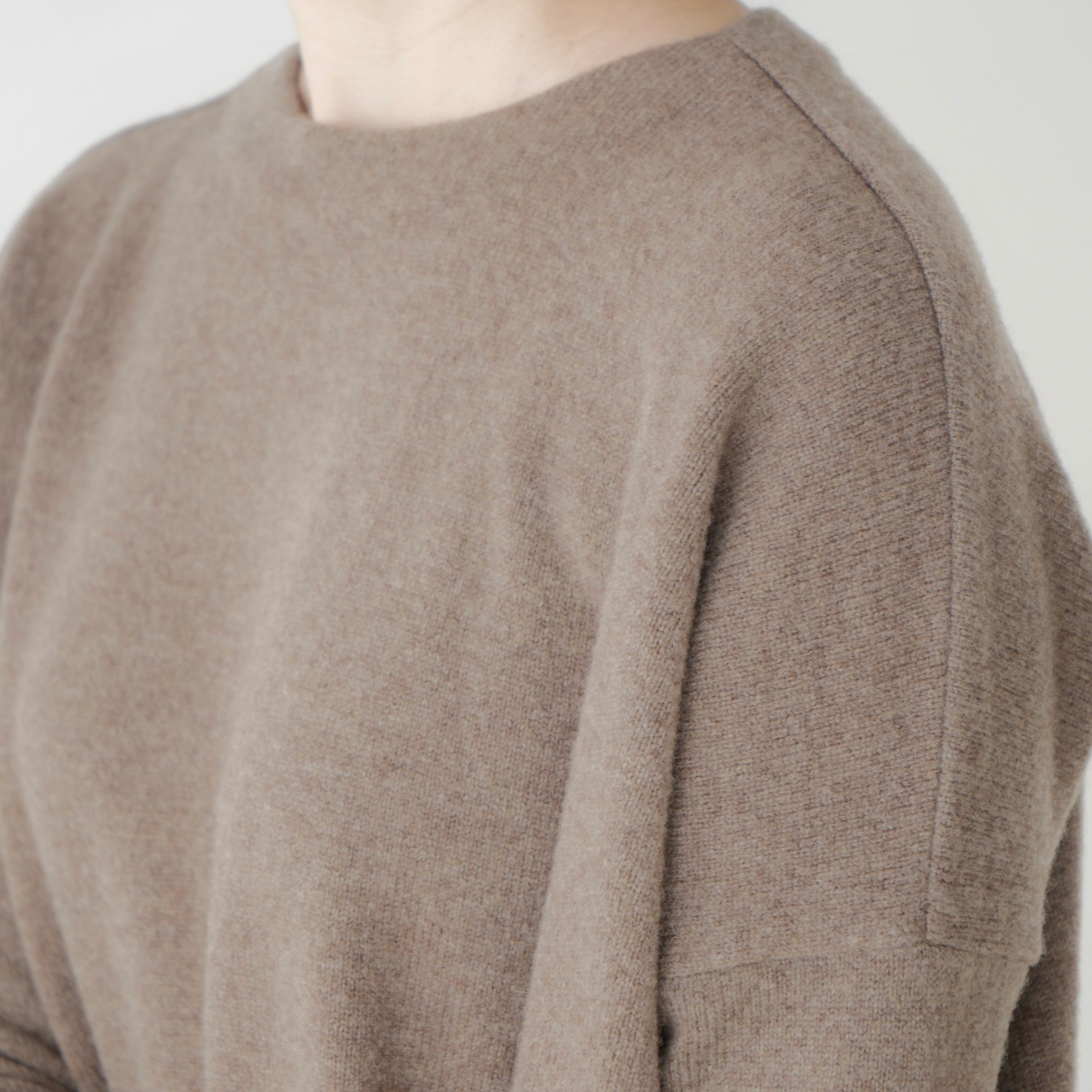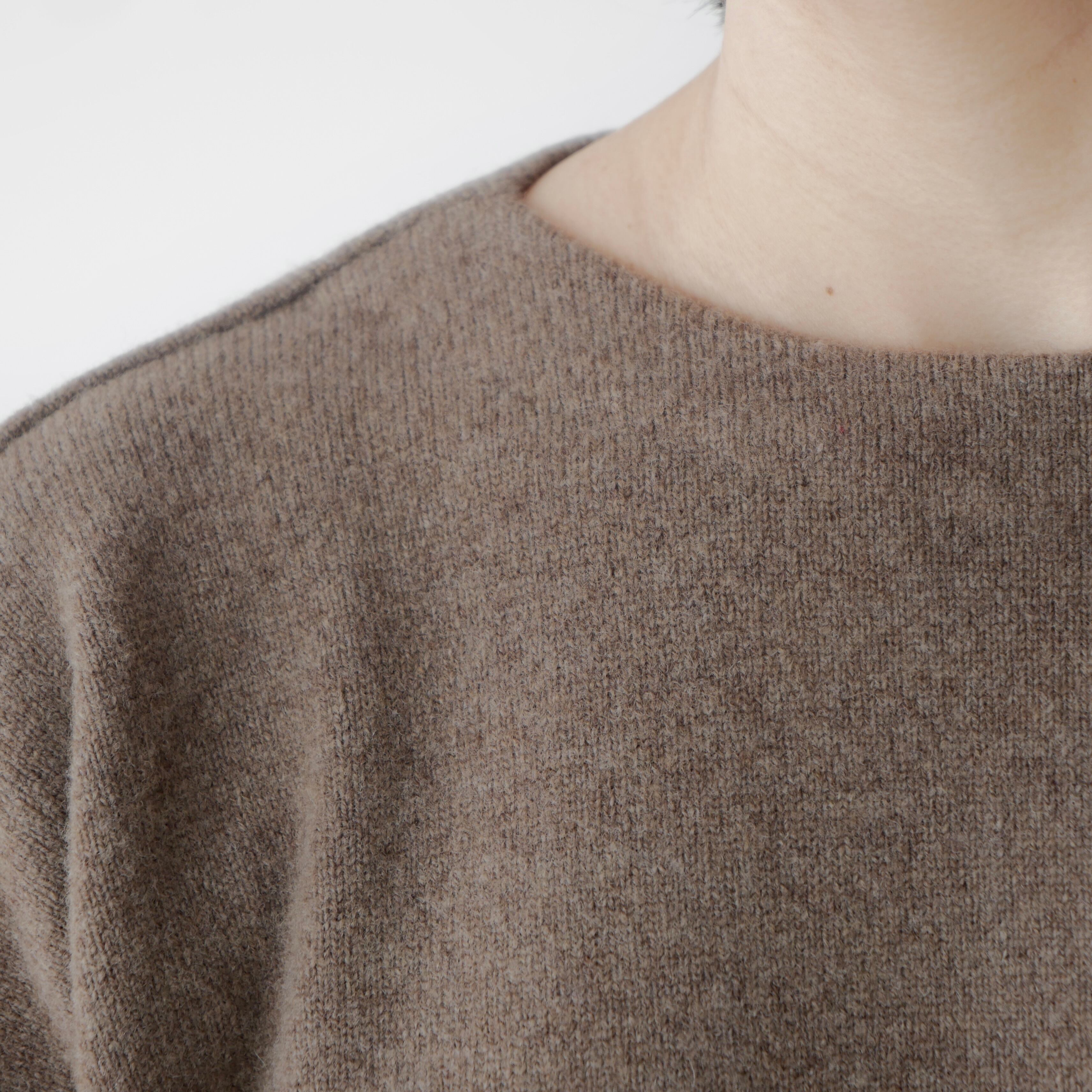軽くてやわらかなウールで編み立てたロングニット。ほどよい開きのある首もとと、すとんと落ちる袖のラインが上品な印象を添えています。