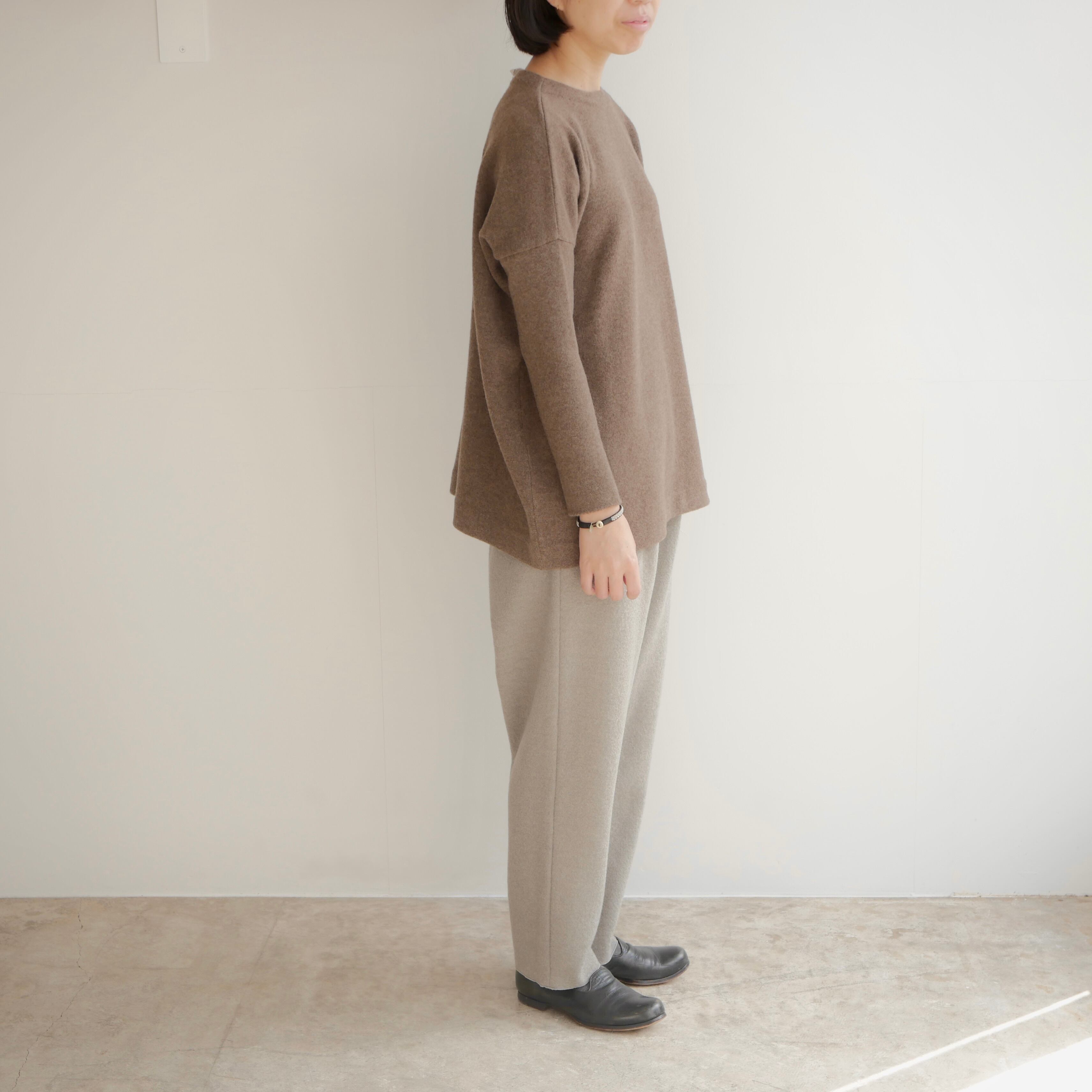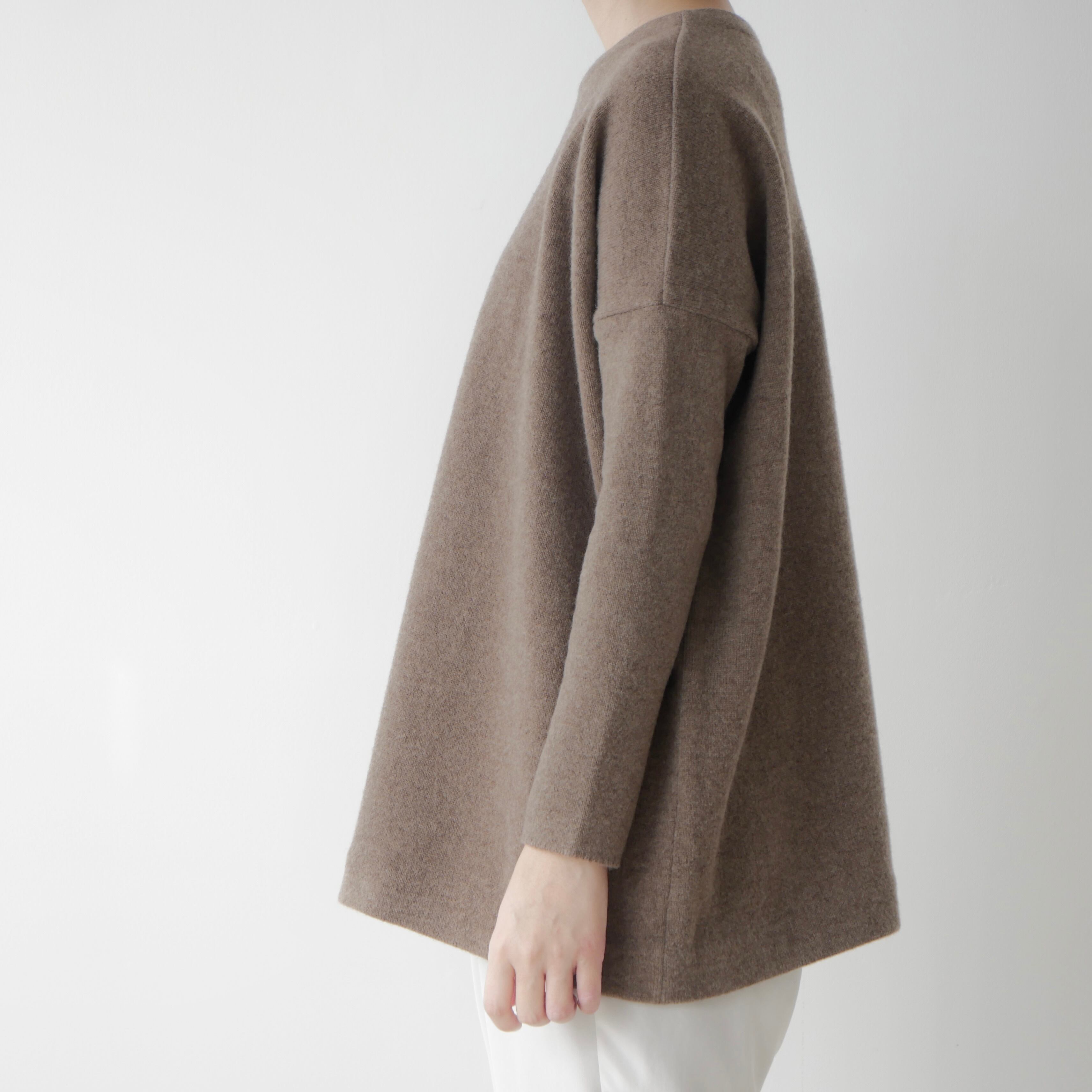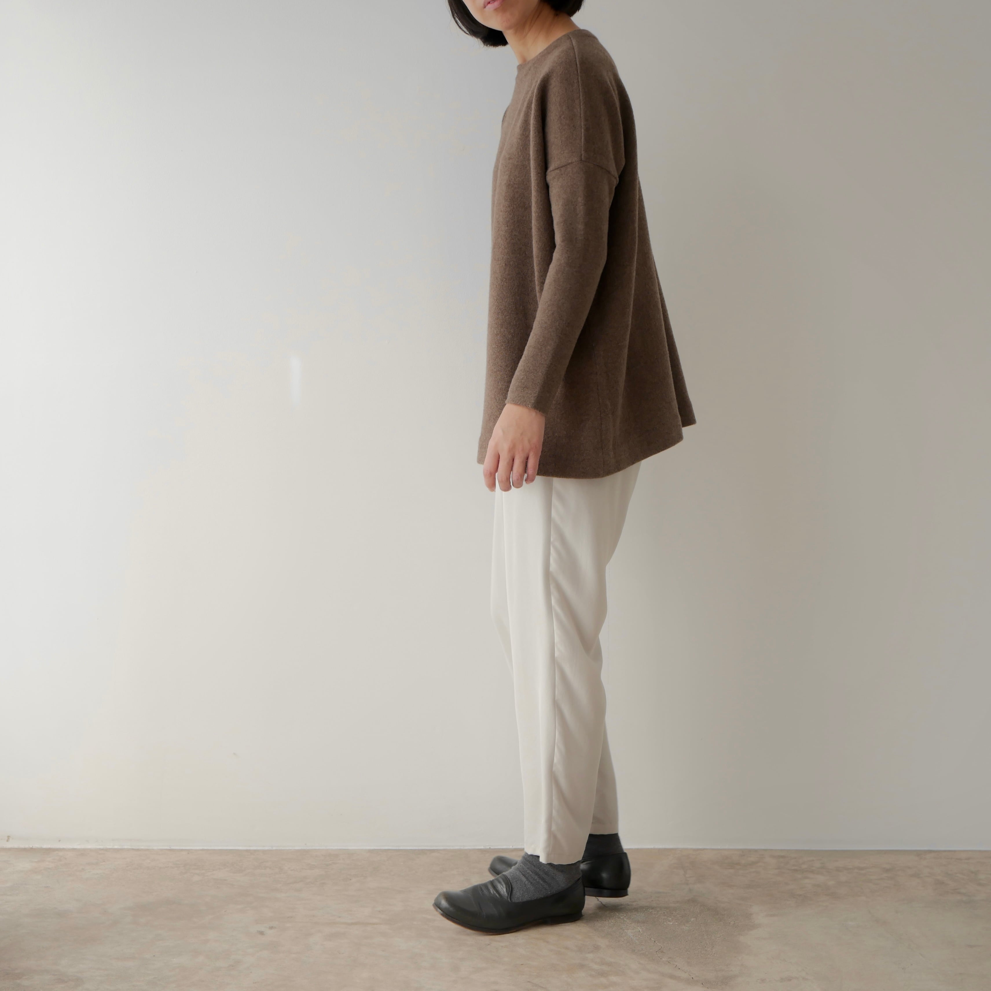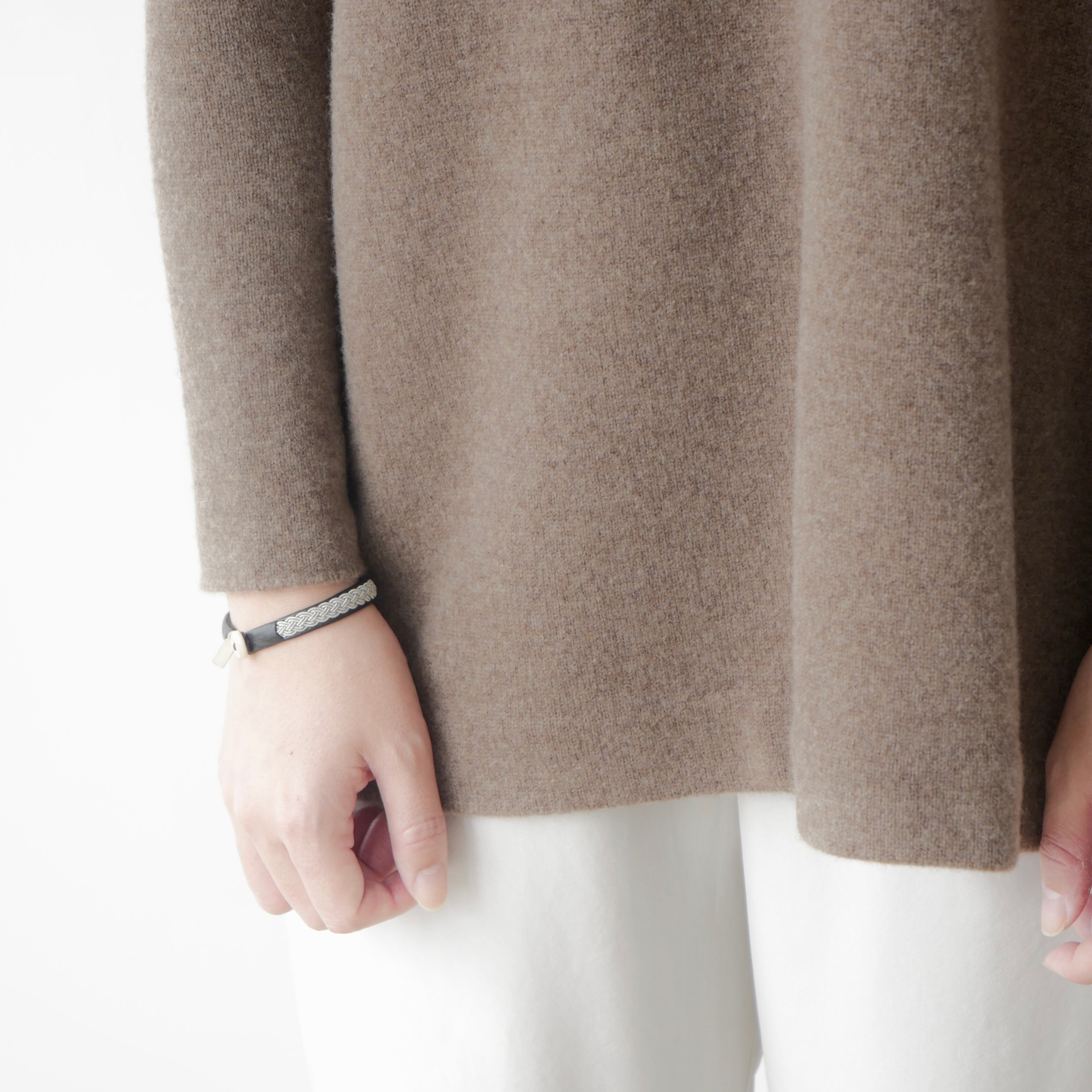 軽くてやわらかなウールで編み立てたロングニット。ほどよい開きのある首もとと、すとんと落ちる袖のラインが上品な印象を添えています。
