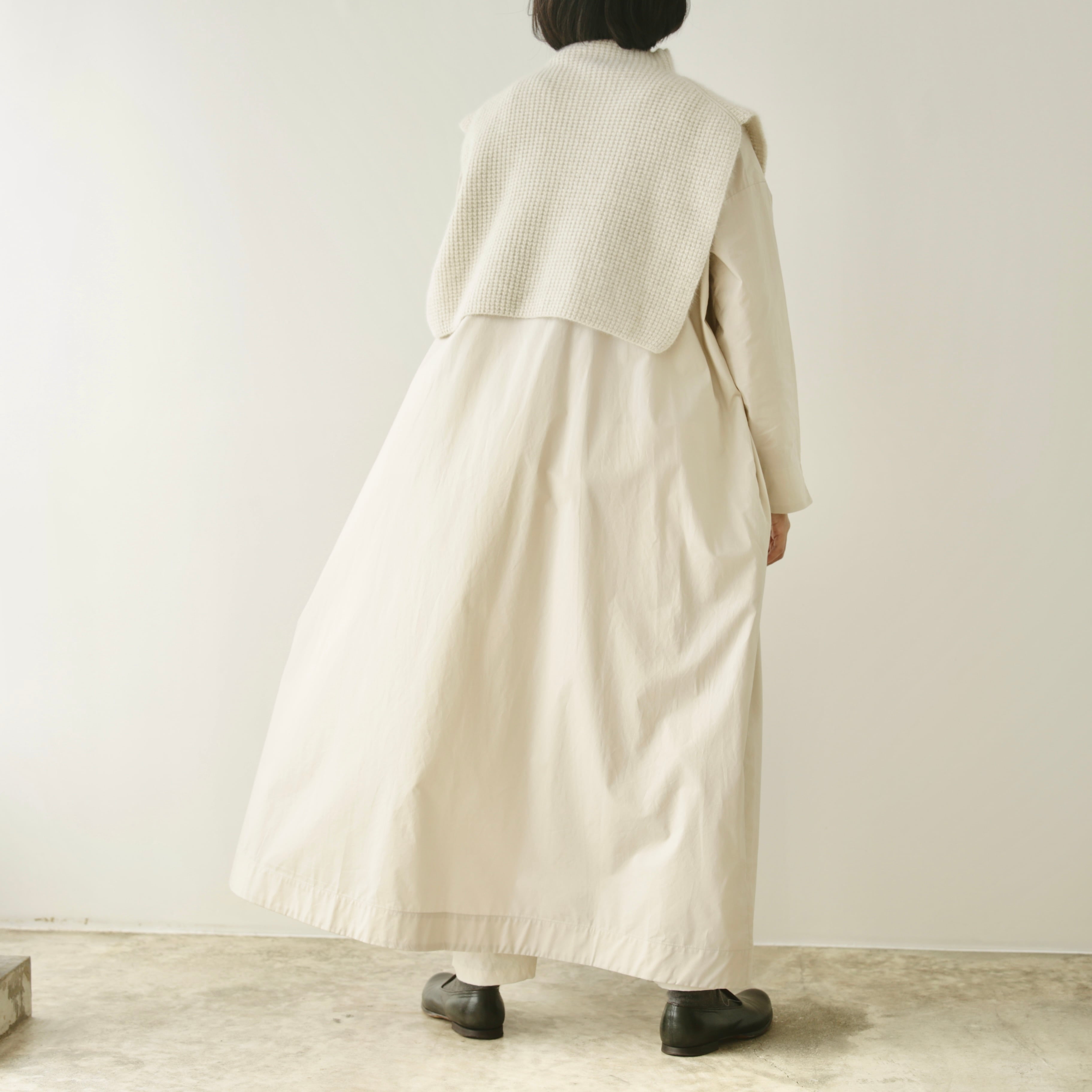 しっかりと分量を使いながらも、驚くほど軽い生地感で、着ていても体に負担がなく心地よく過ごせます。ボリュームのあるシルエットに、すっきりと開いた首元がバランスよく、軽やかで可憐な印象に。