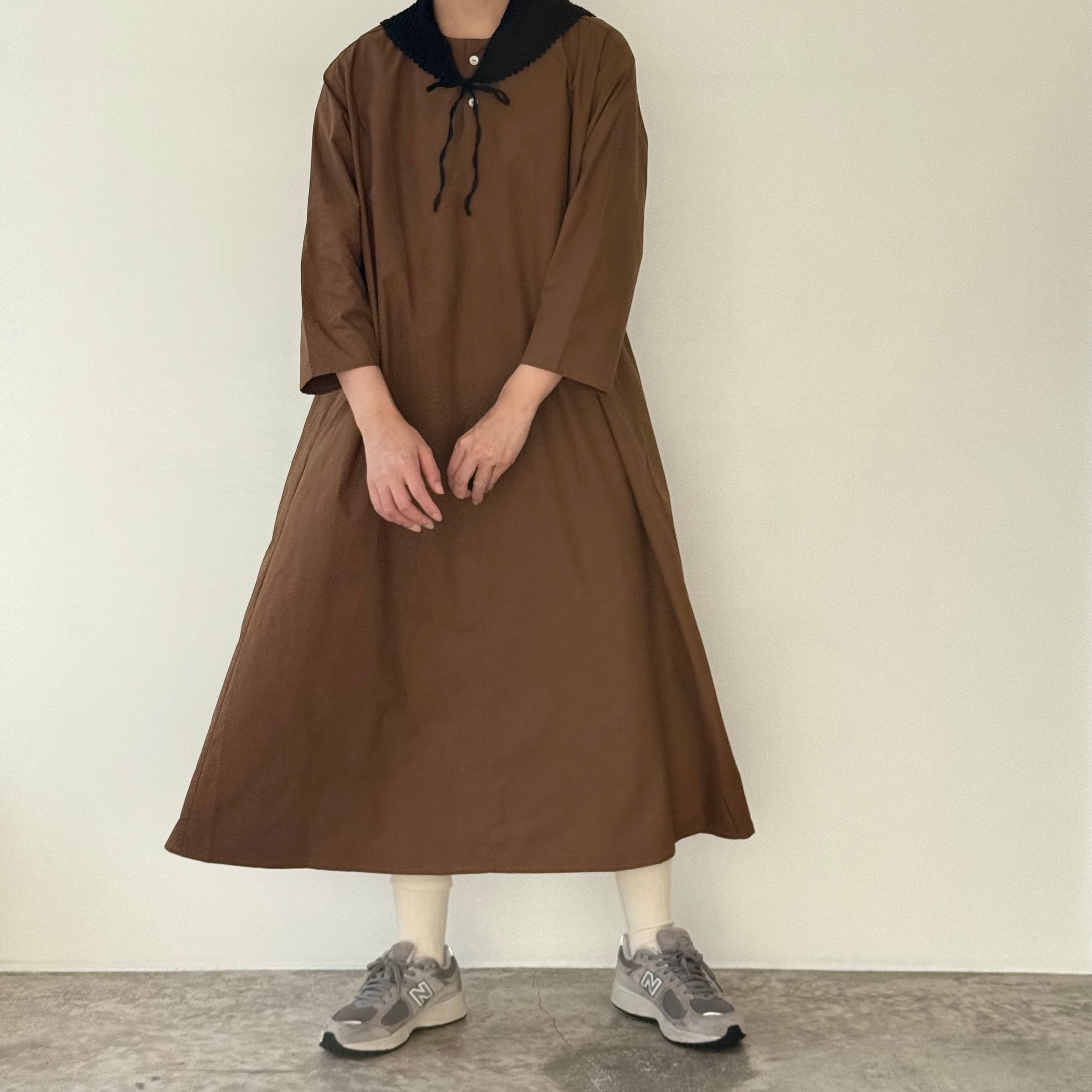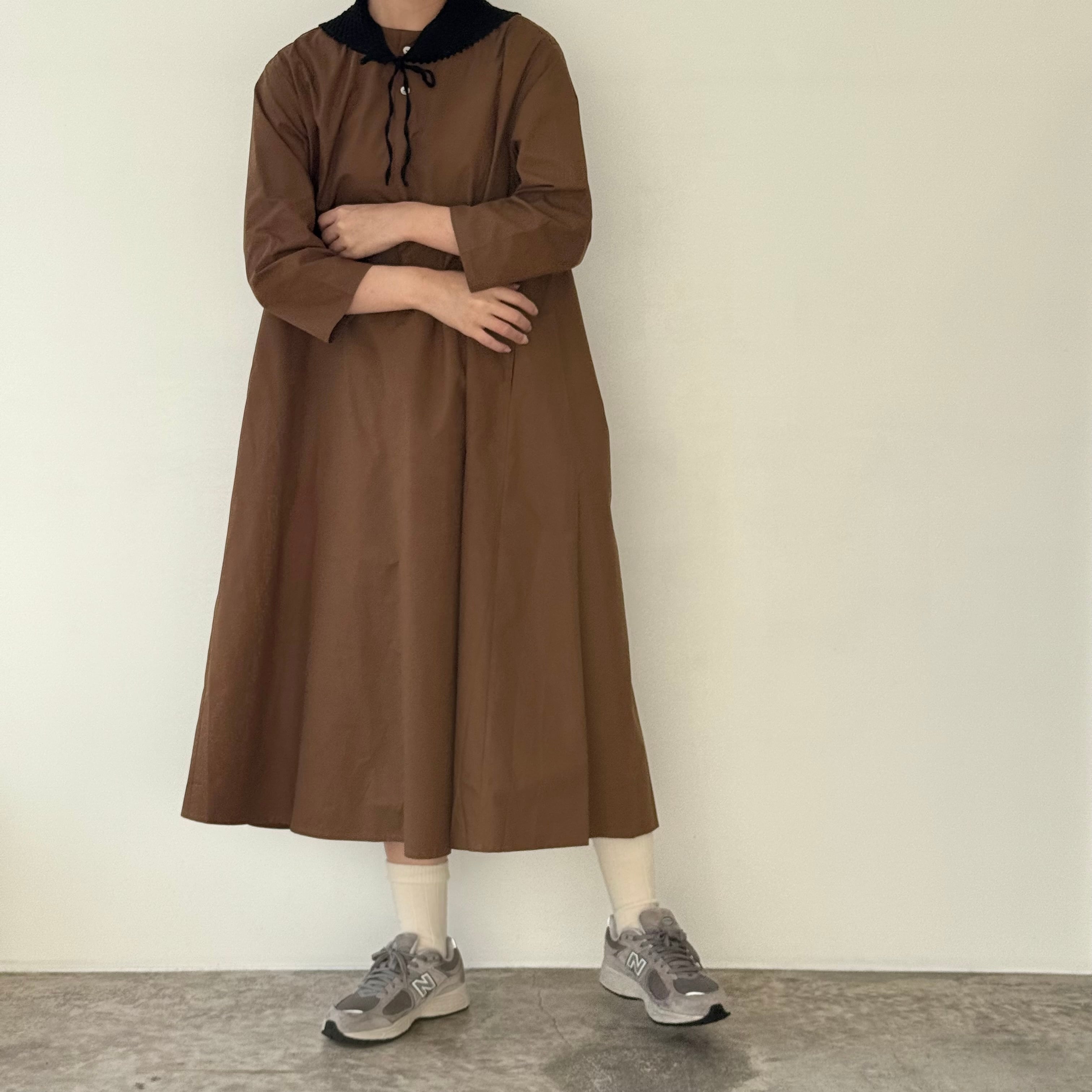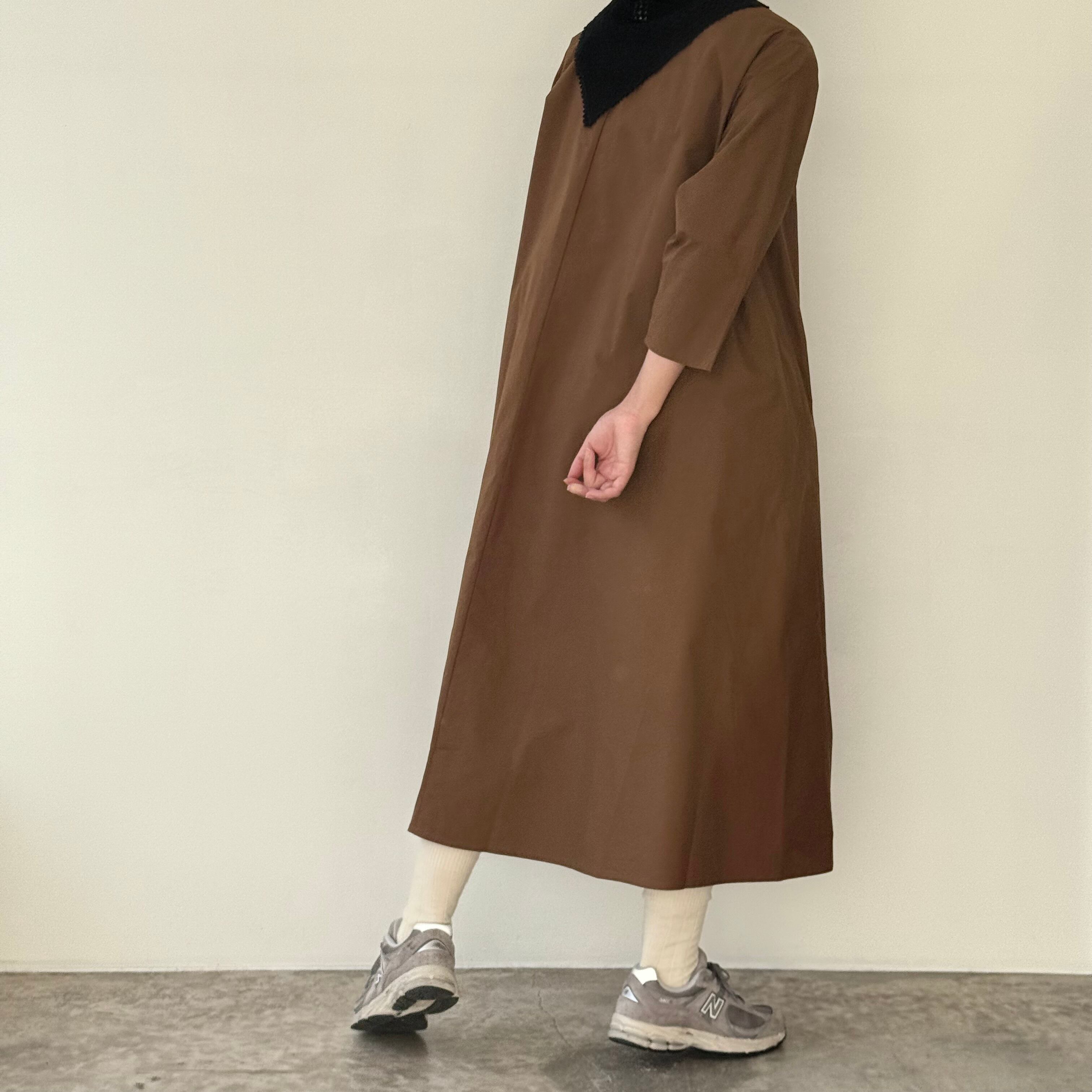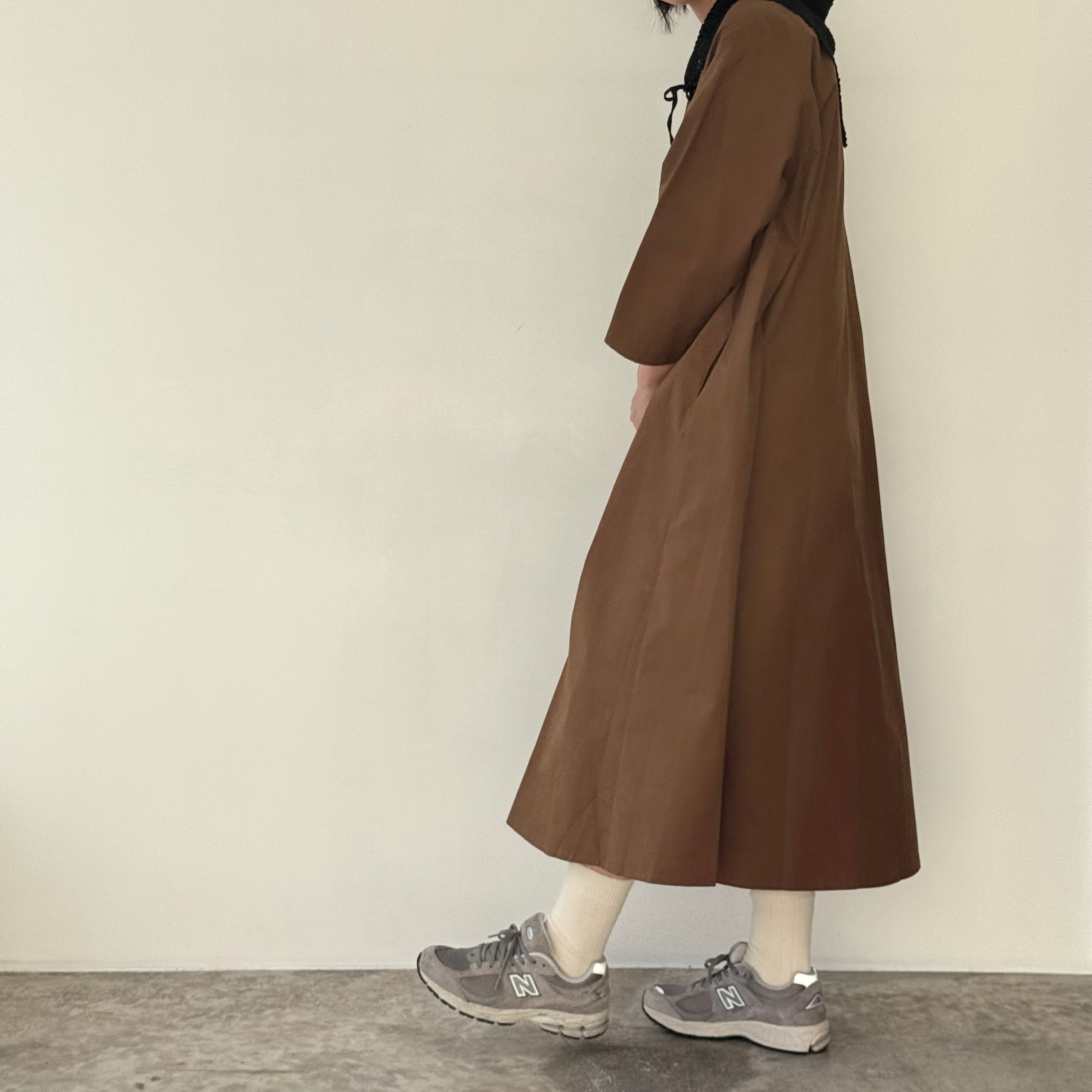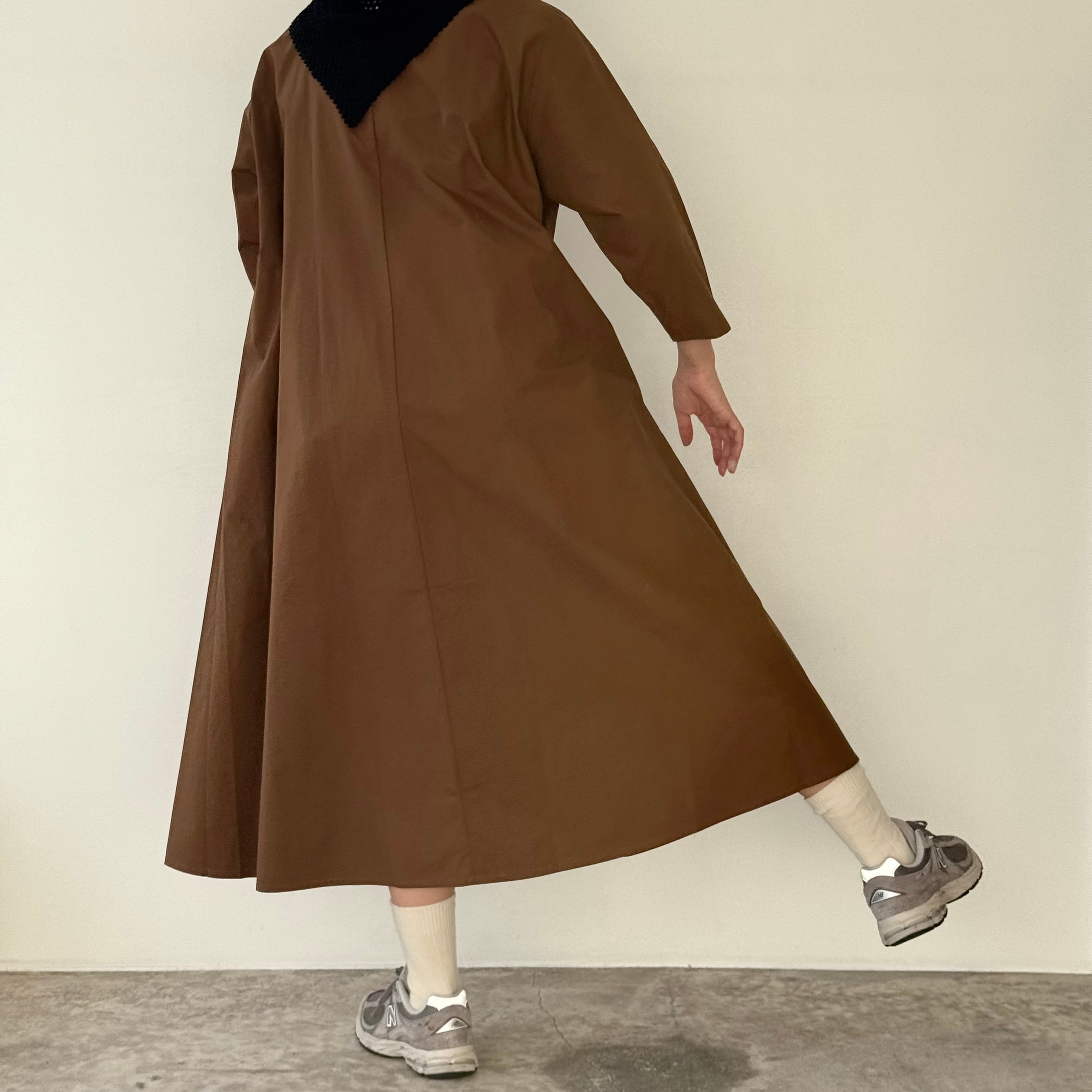 ハリのあるコットン素材で仕立てた、フルレングスのワンピース。裾に向かってゆるやかに広がるAラインシルエットが美しく、動くたびにほどよい立体感を生み出します。