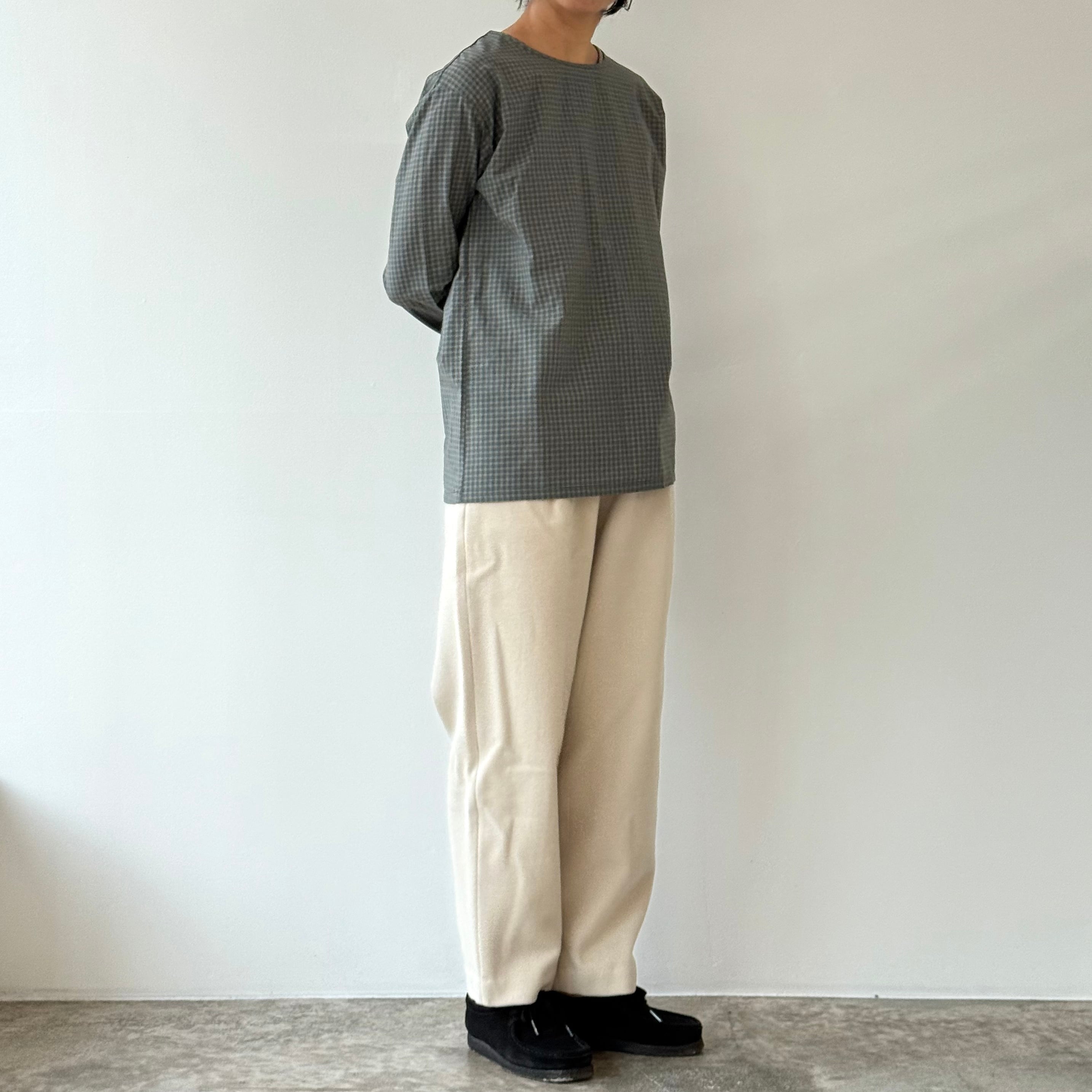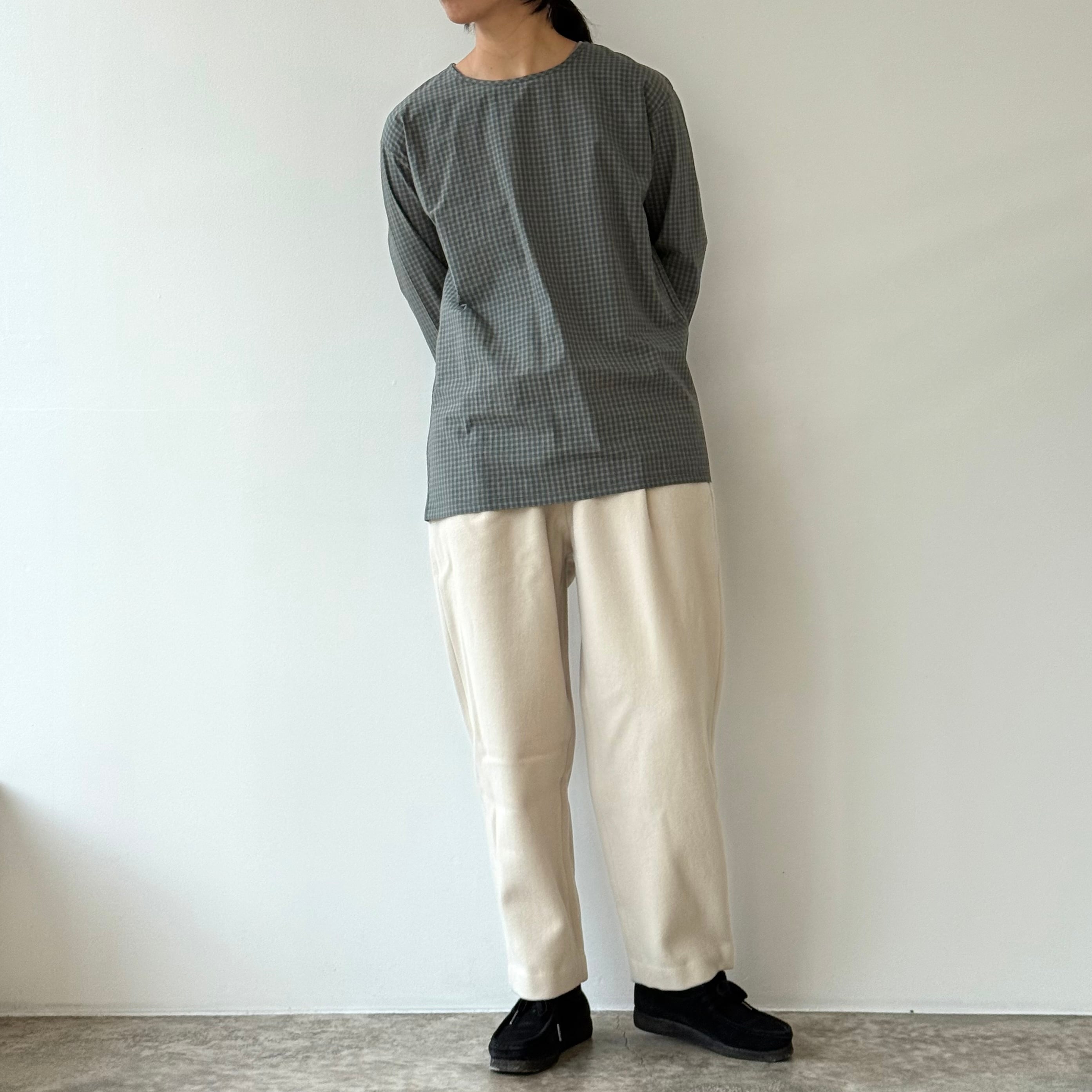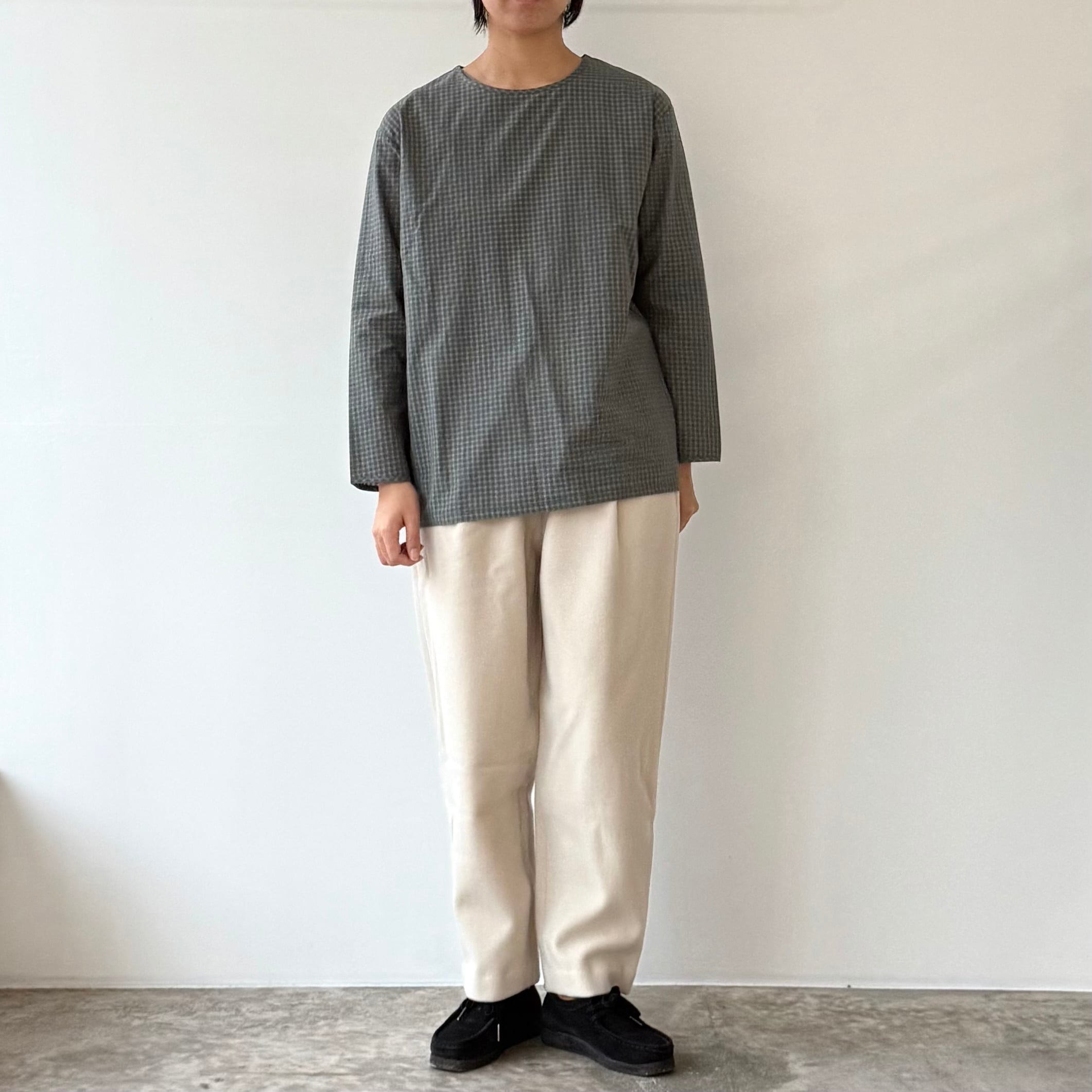 Yoliから、定番のシンプルブラウスが今シーズンも届きました。今季は、オリジナルパターンのチェック柄。大人っぽさを備えた深みのある色合いに、細かなチェックが映える一枚です。