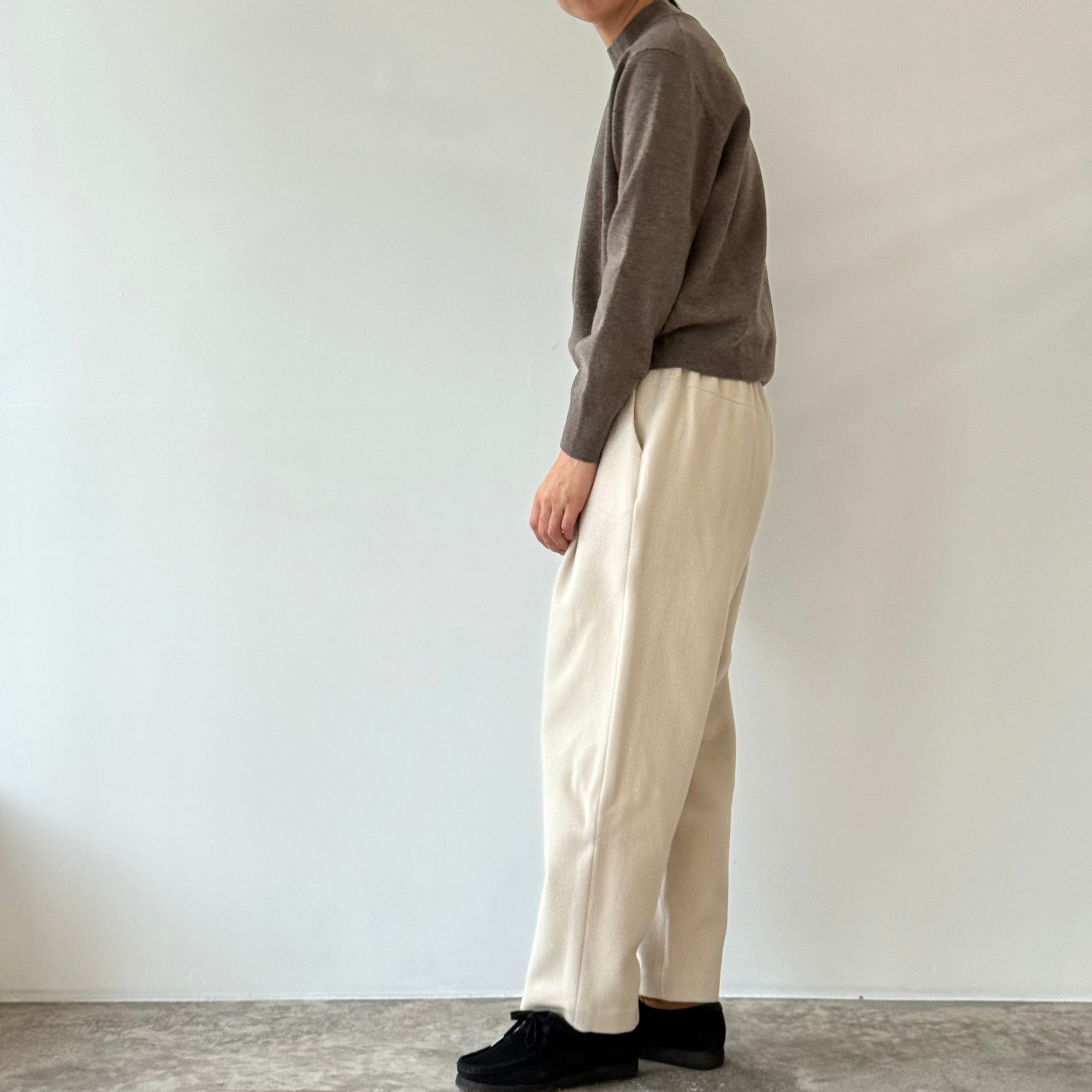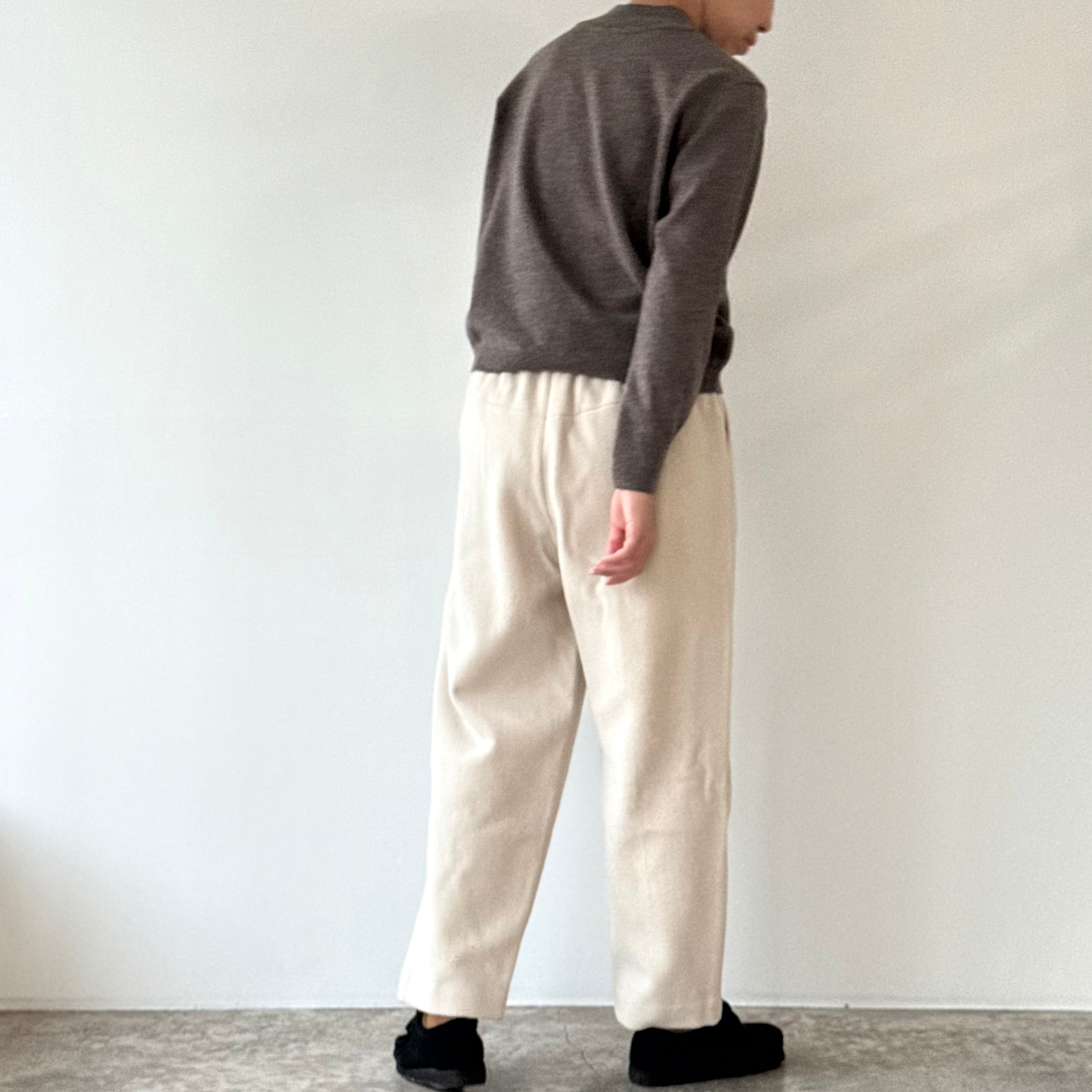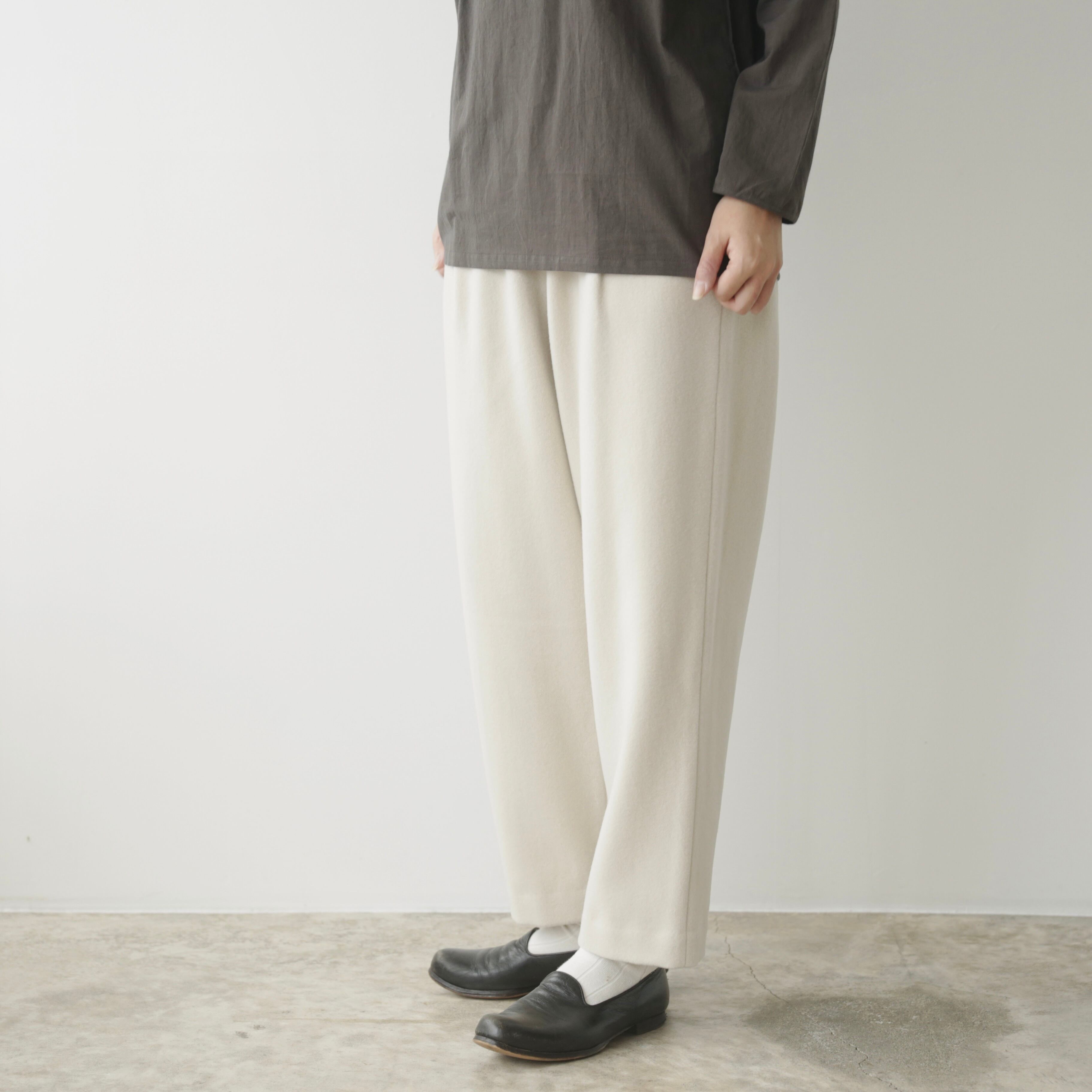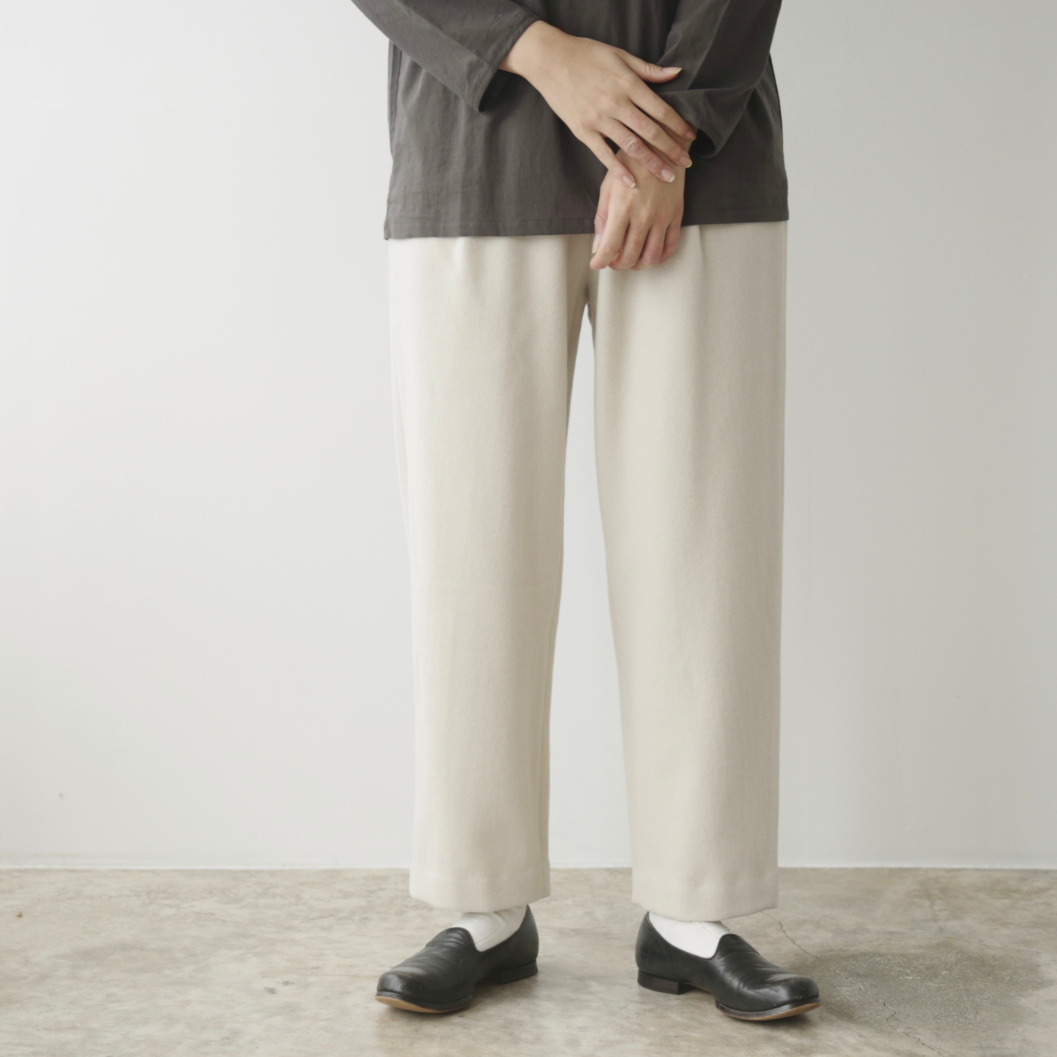 削ぎ落としたデザインの中に、余白とわずかな色気が生まれ、穿く人の佇まいを静かに引き立てます。同素材のコートと合わせたセットアップはもちろん、ざっくりとしたニットを合わせてもバランスよくまとまる。