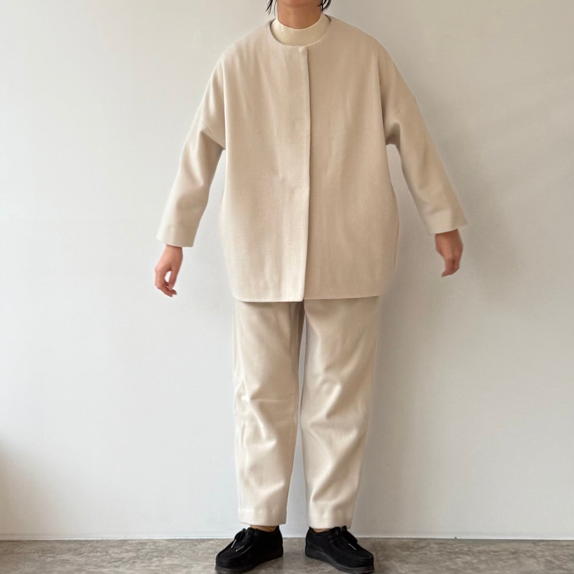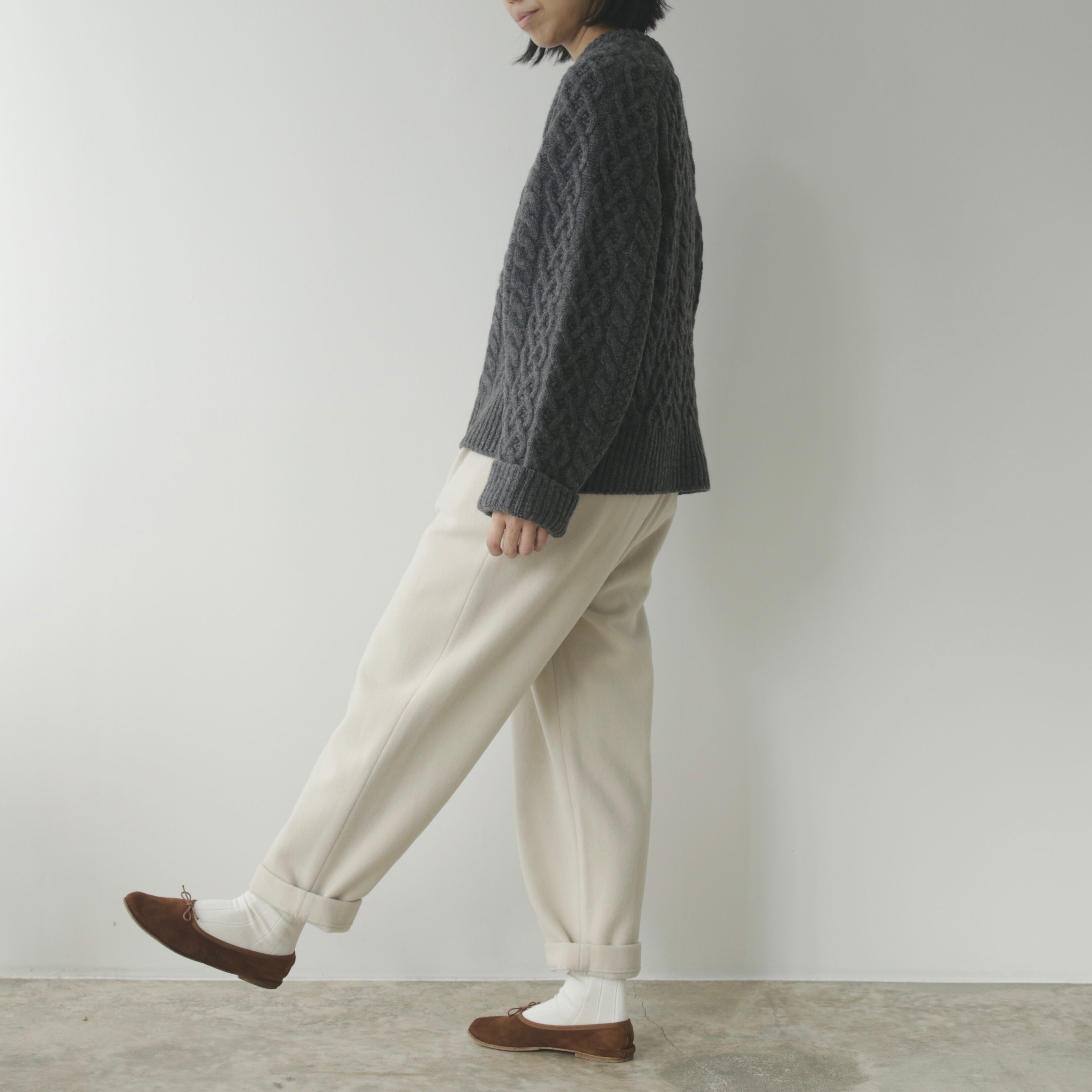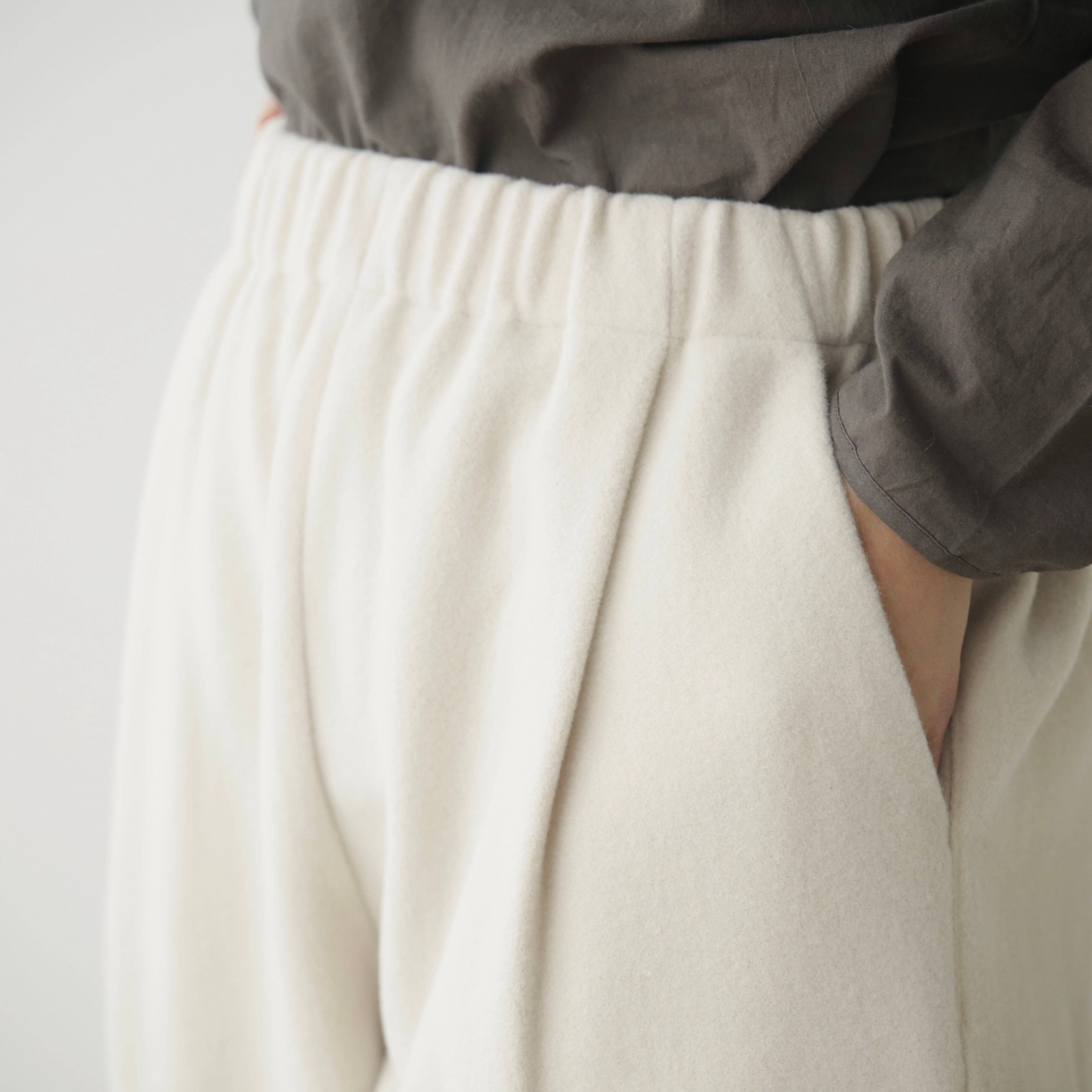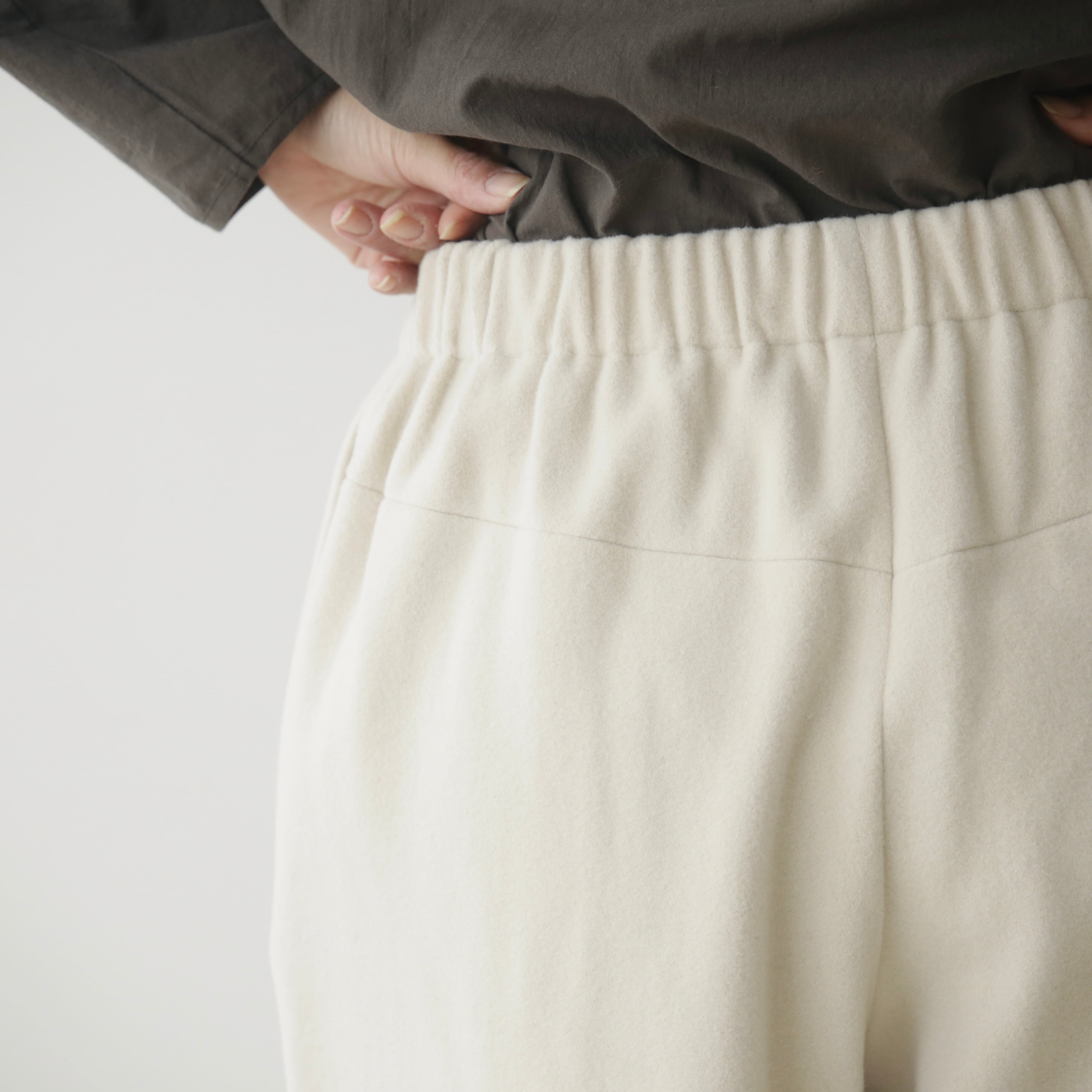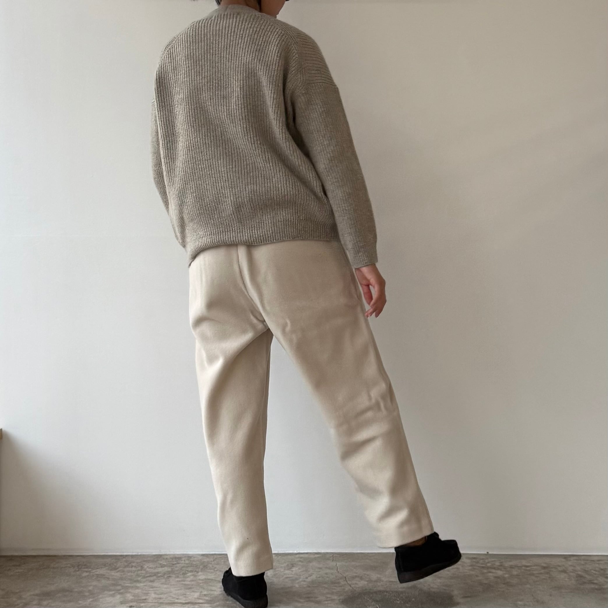 削ぎ落としたデザインの中に、余白とわずかな色気が生まれ、穿く人の佇まいを静かに引き立てます。同素材のコートと合わせたセットアップはもちろん、ざっくりとしたニットを合わせてもバランスよくまとまる。