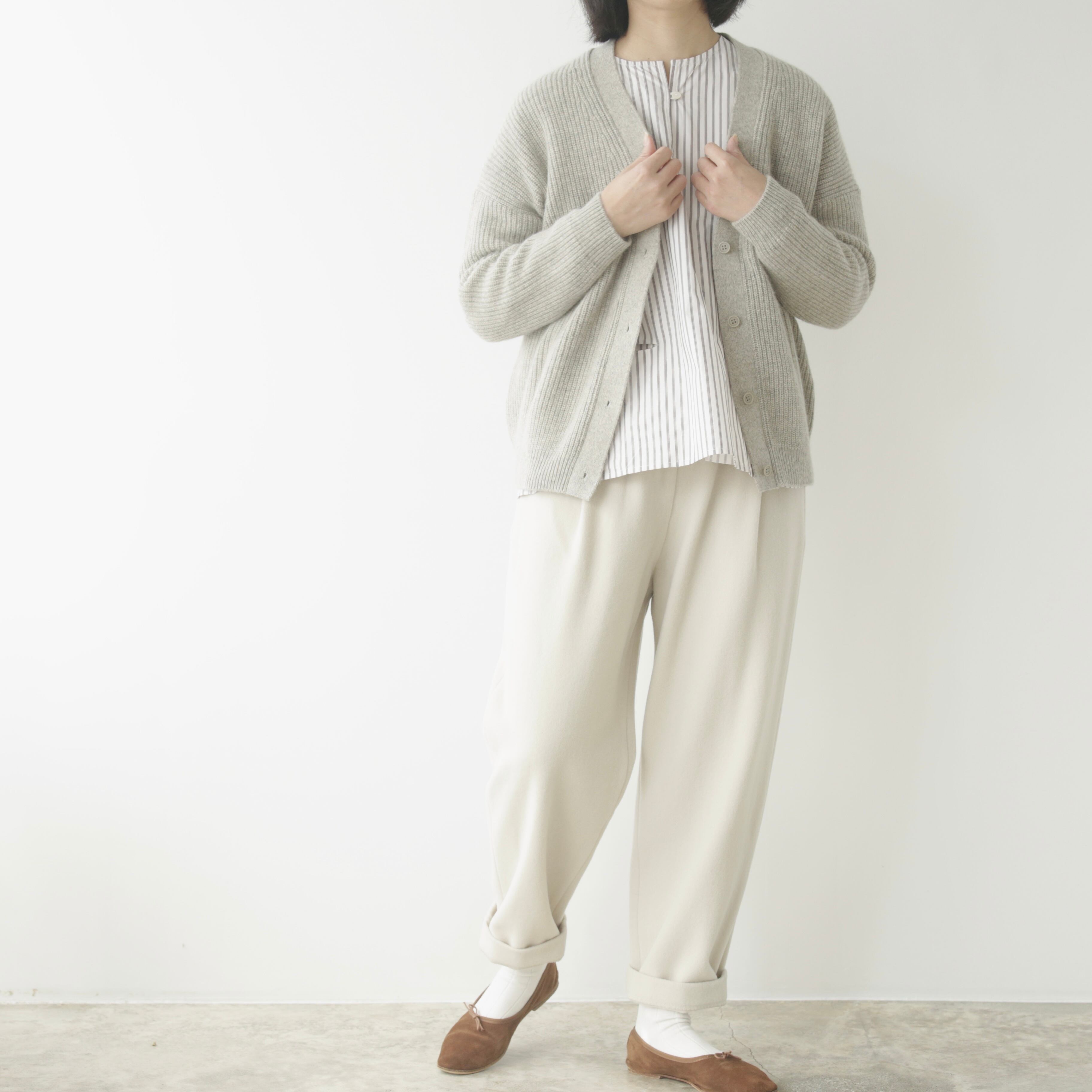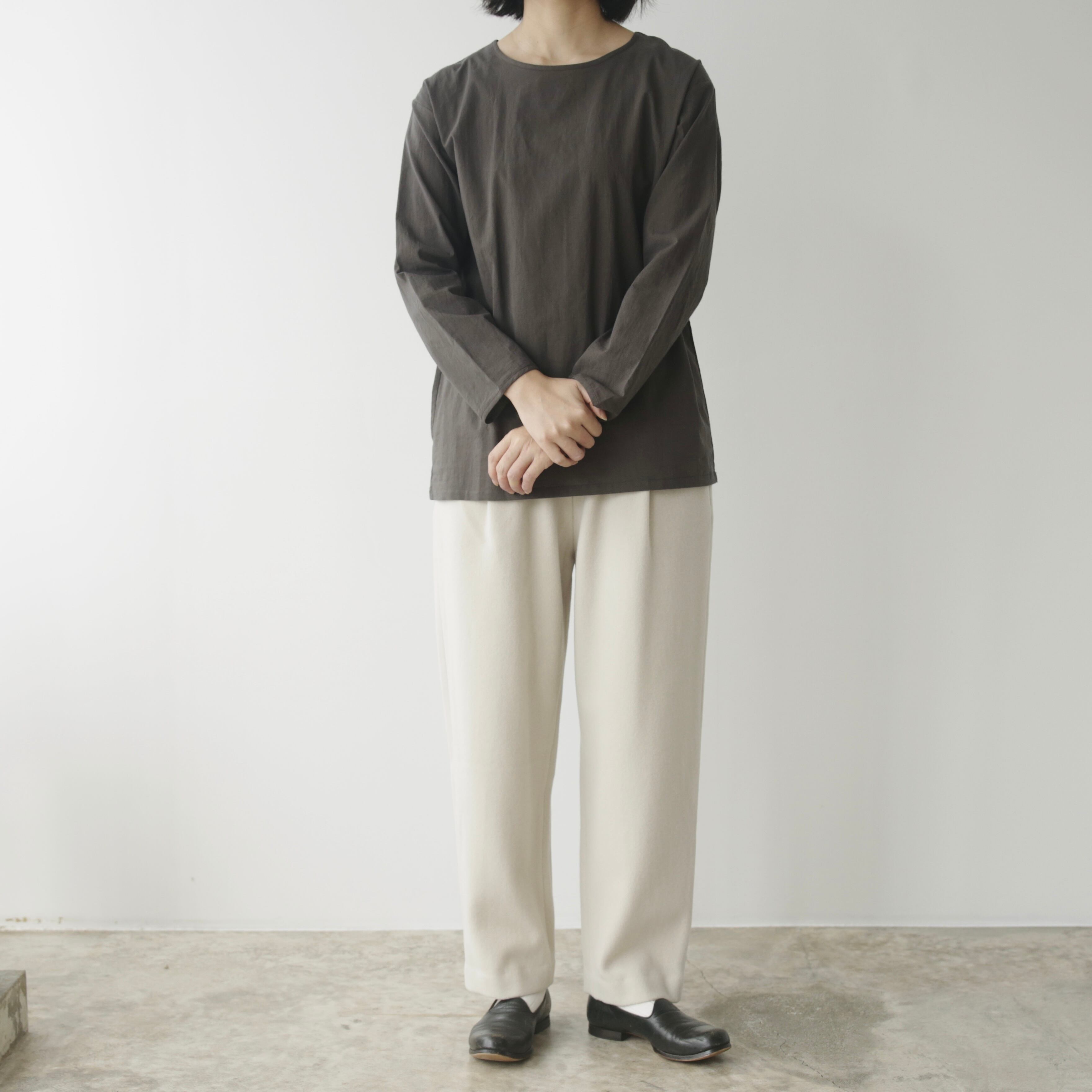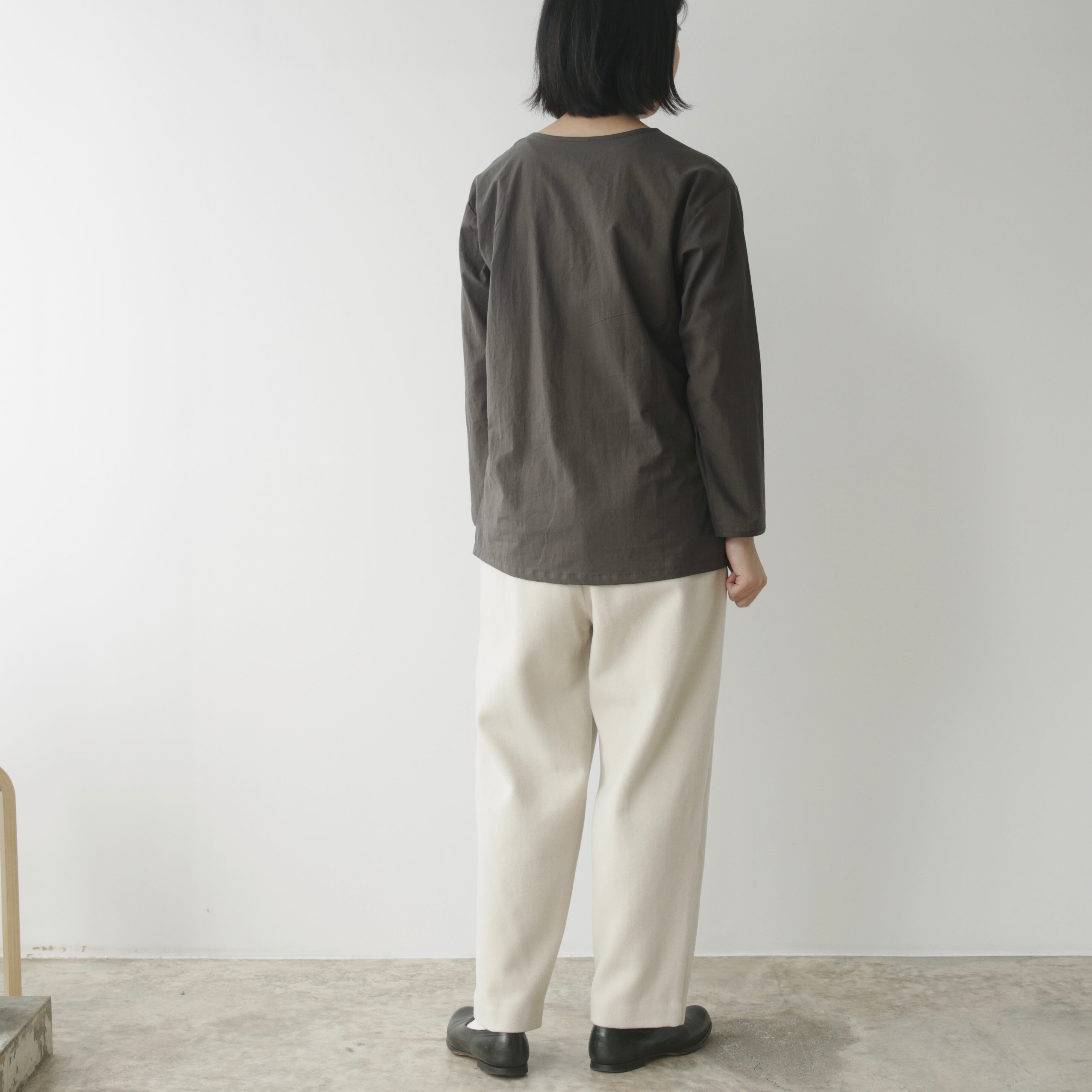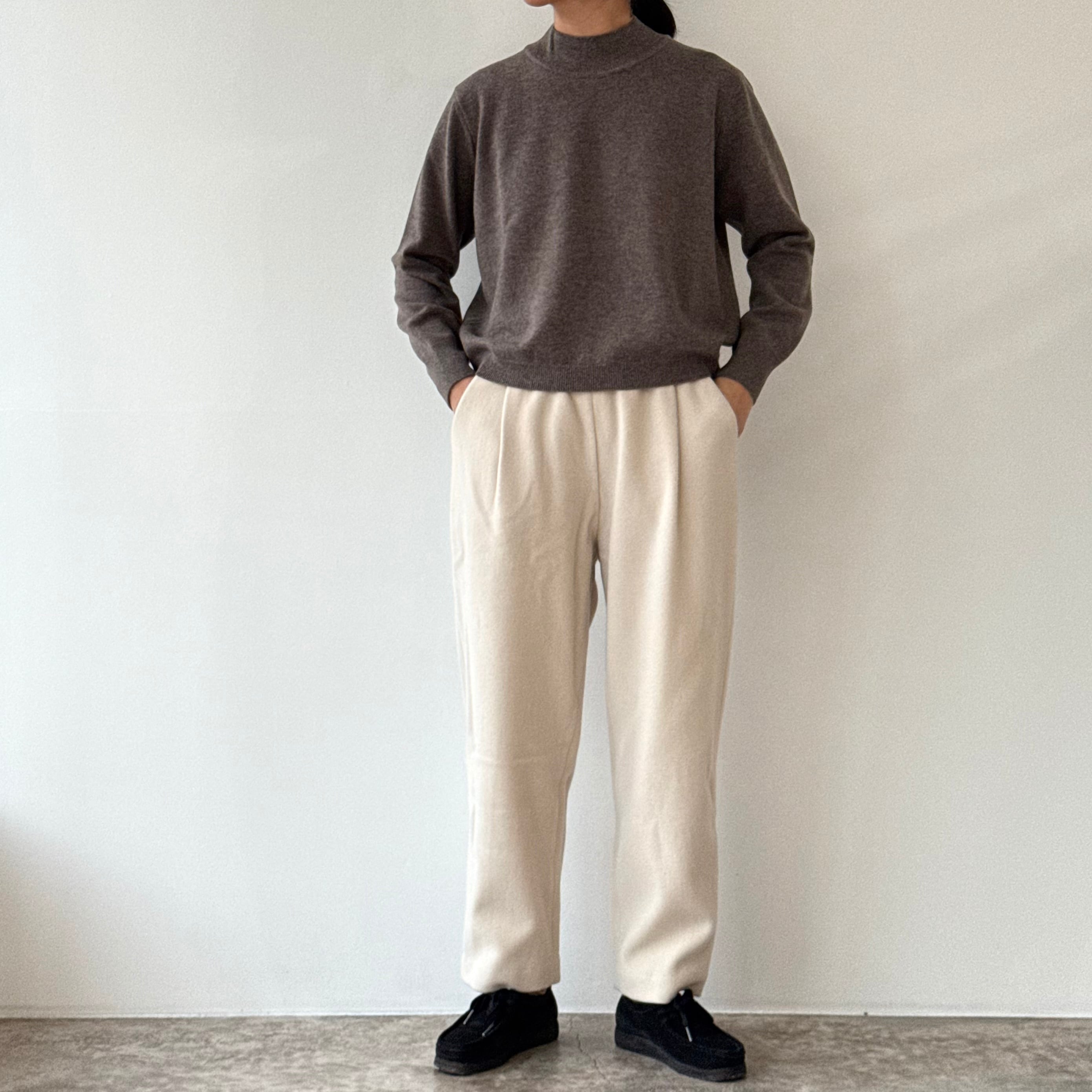 削ぎ落としたデザインの中に、余白とわずかな色気が生まれ、穿く人の佇まいを静かに引き立てます。同素材のコートと合わせたセットアップはもちろん、ざっくりとしたニットを合わせてもバランスよくまとまる。