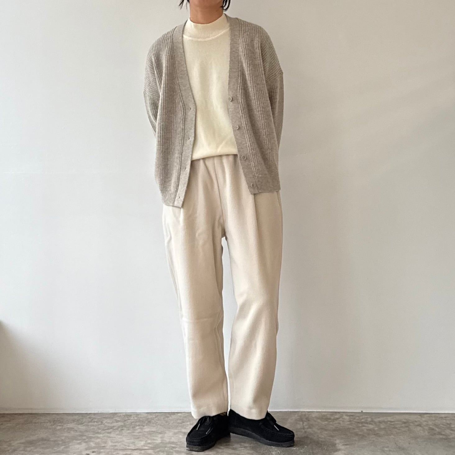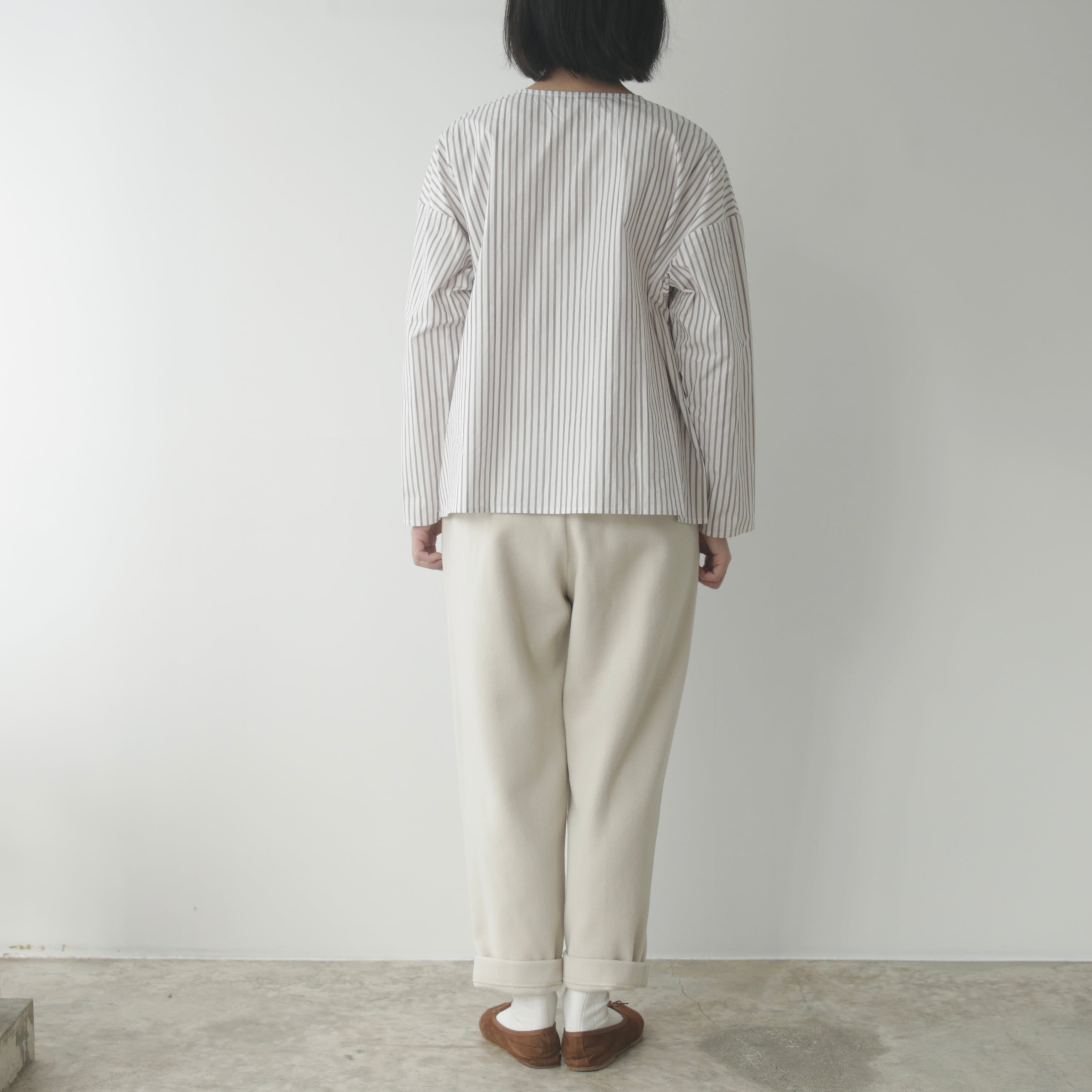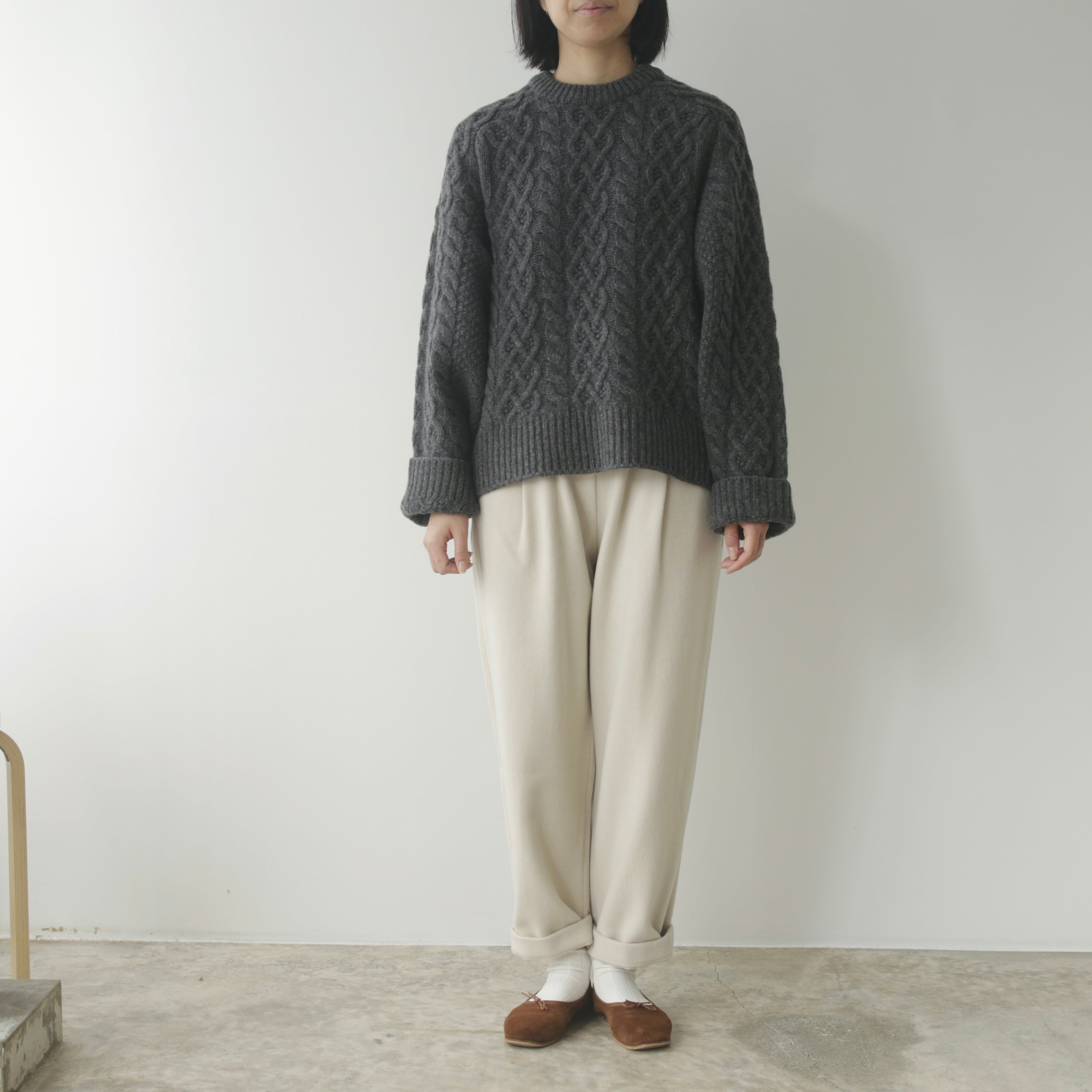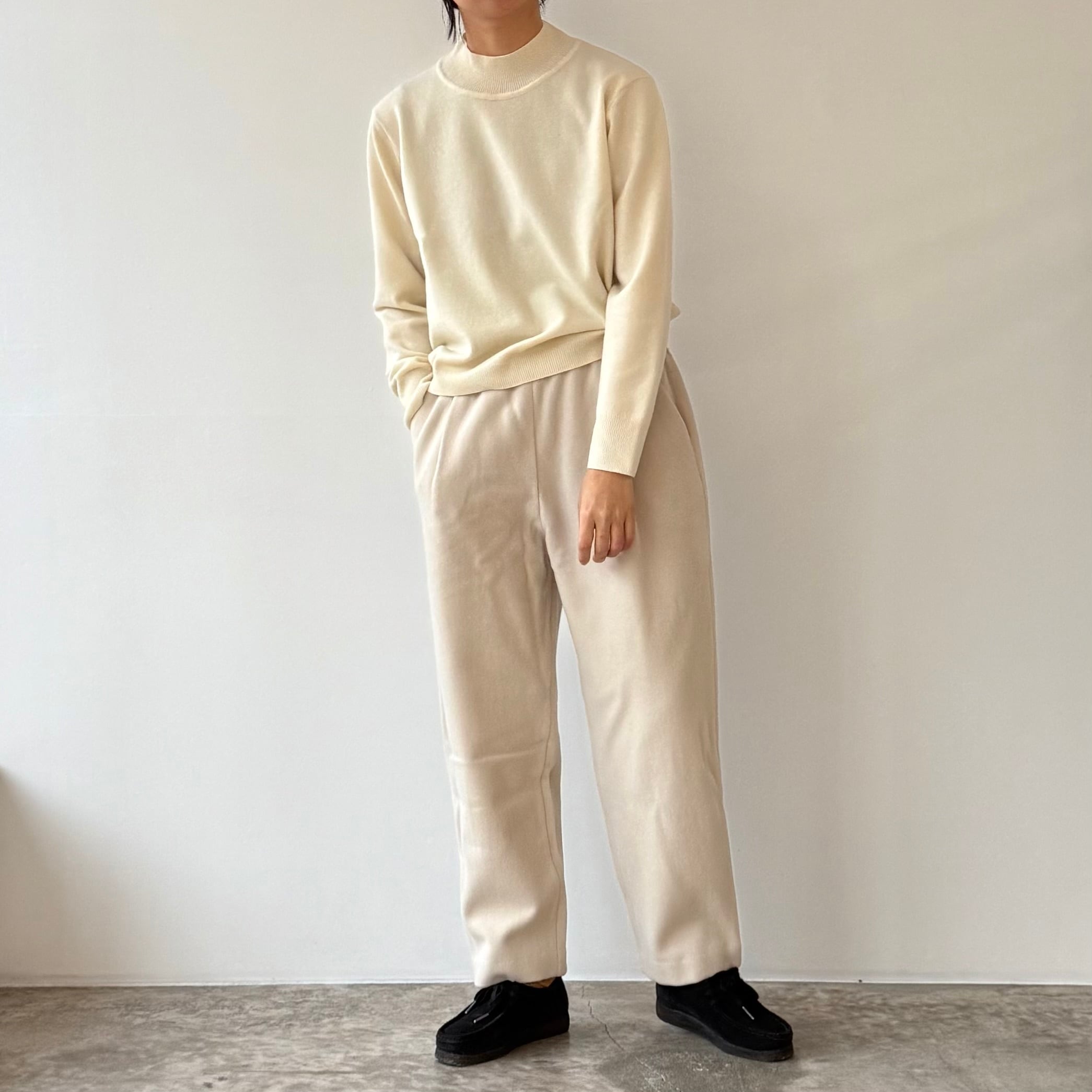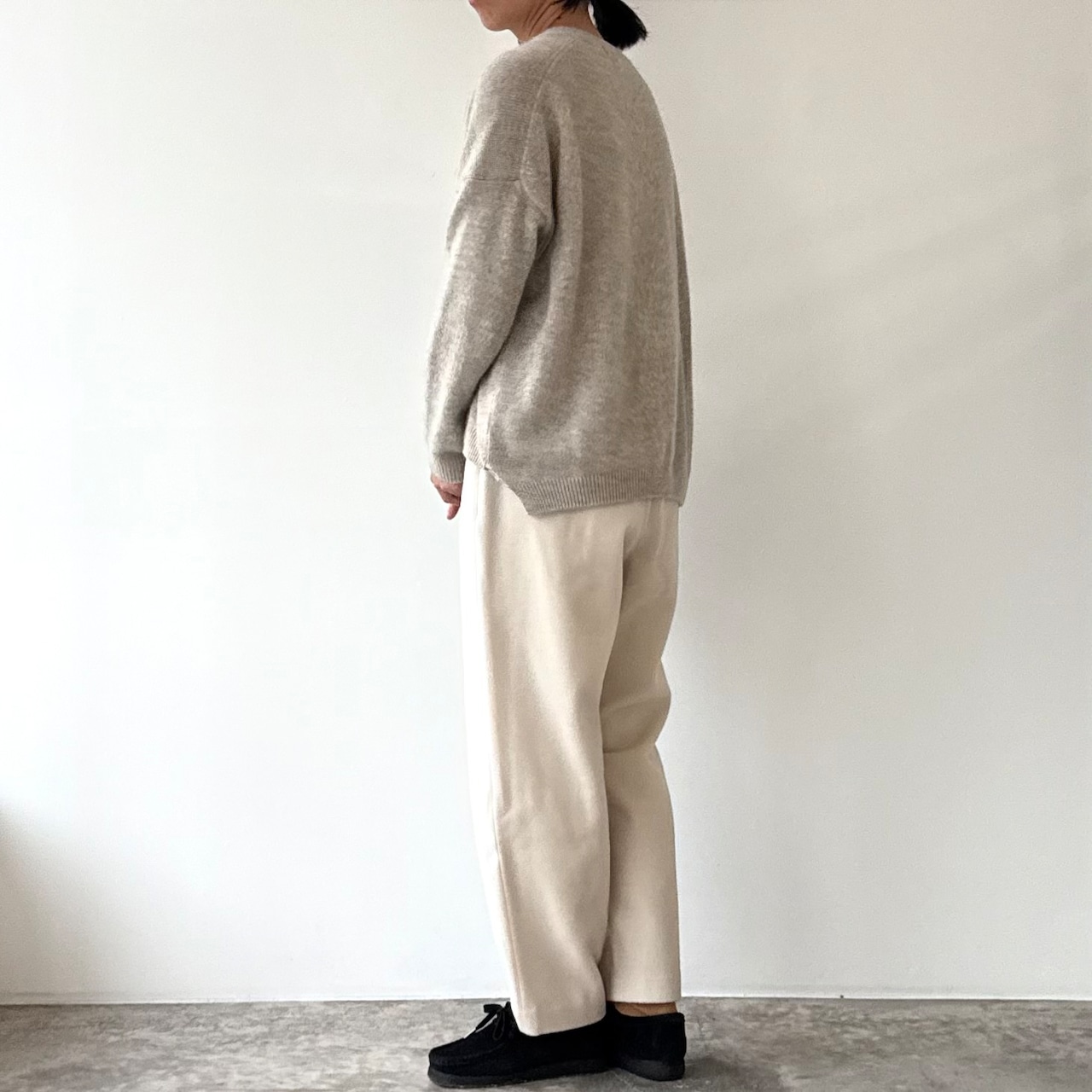 削ぎ落としたデザインの中に、余白とわずかな色気が生まれ、穿く人の佇まいを静かに引き立てます。同素材のコートと合わせたセットアップはもちろん、ざっくりとしたニットを合わせてもバランスよくまとまる。