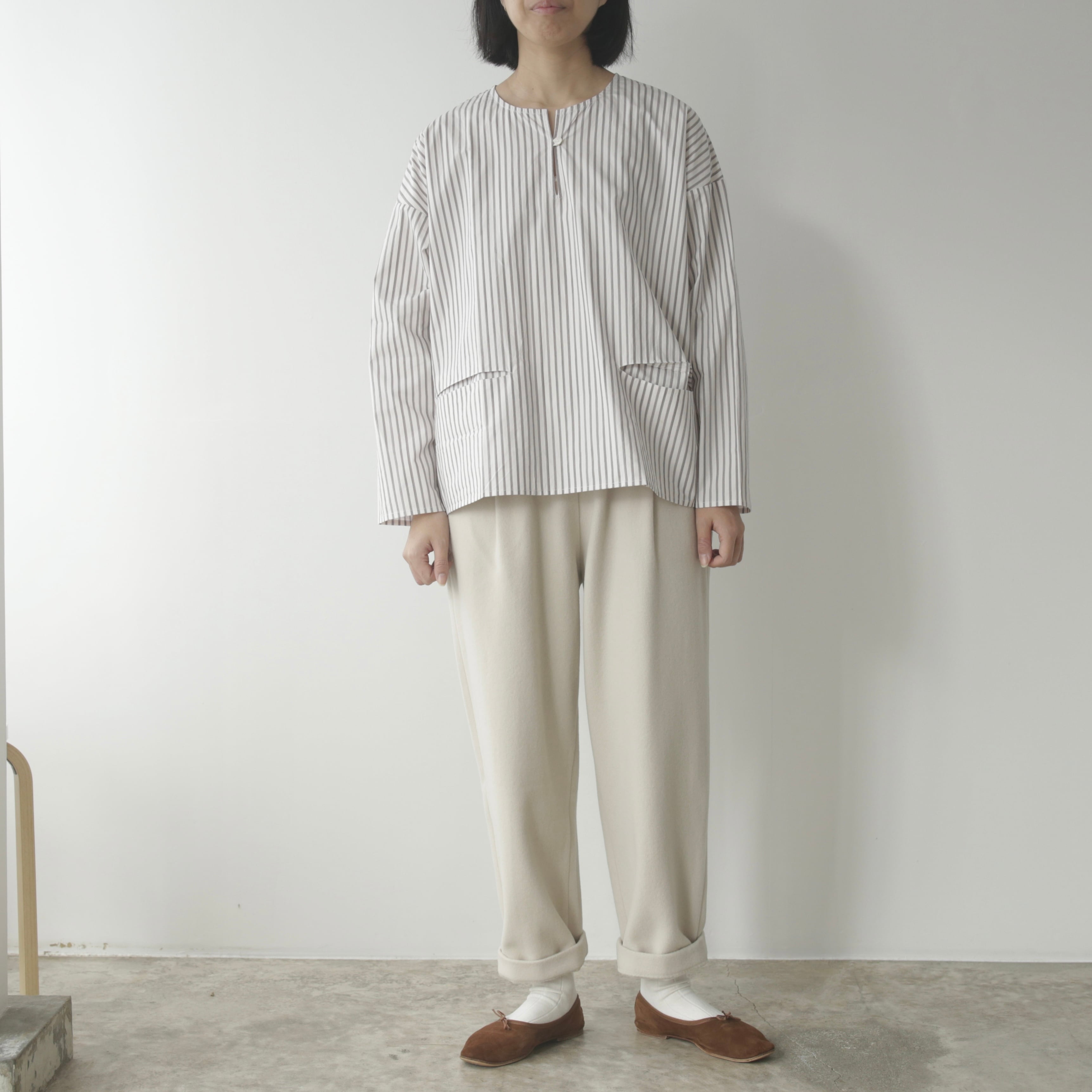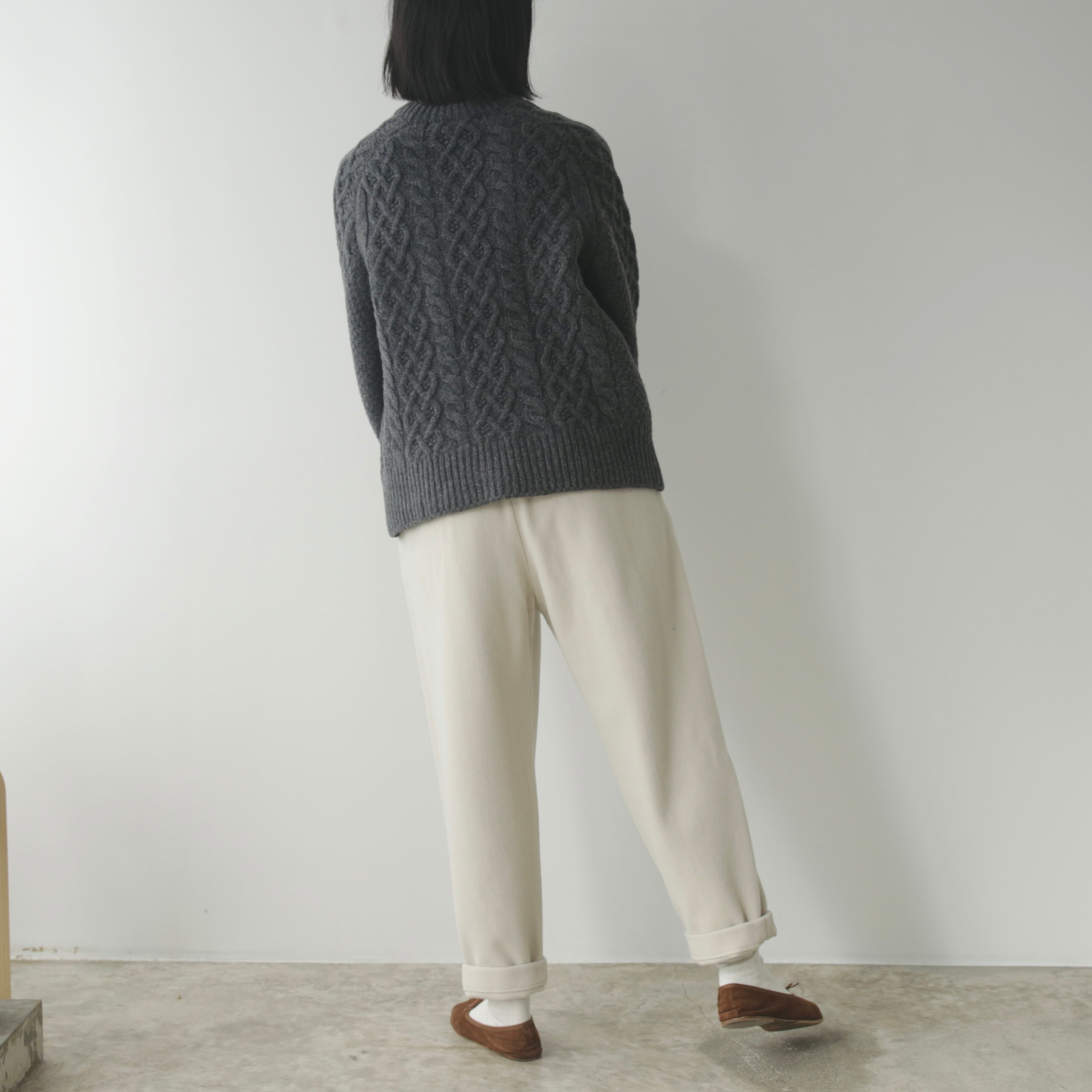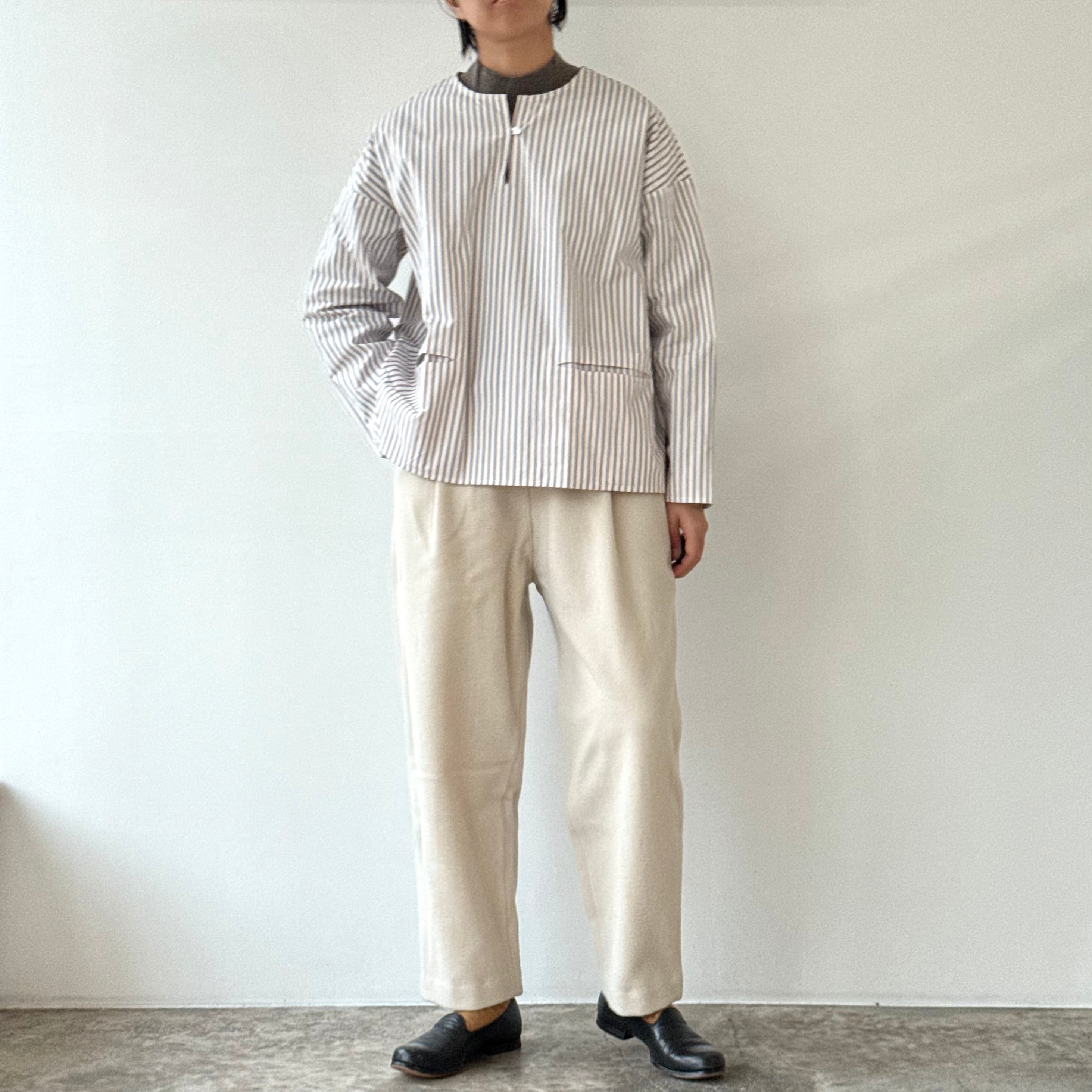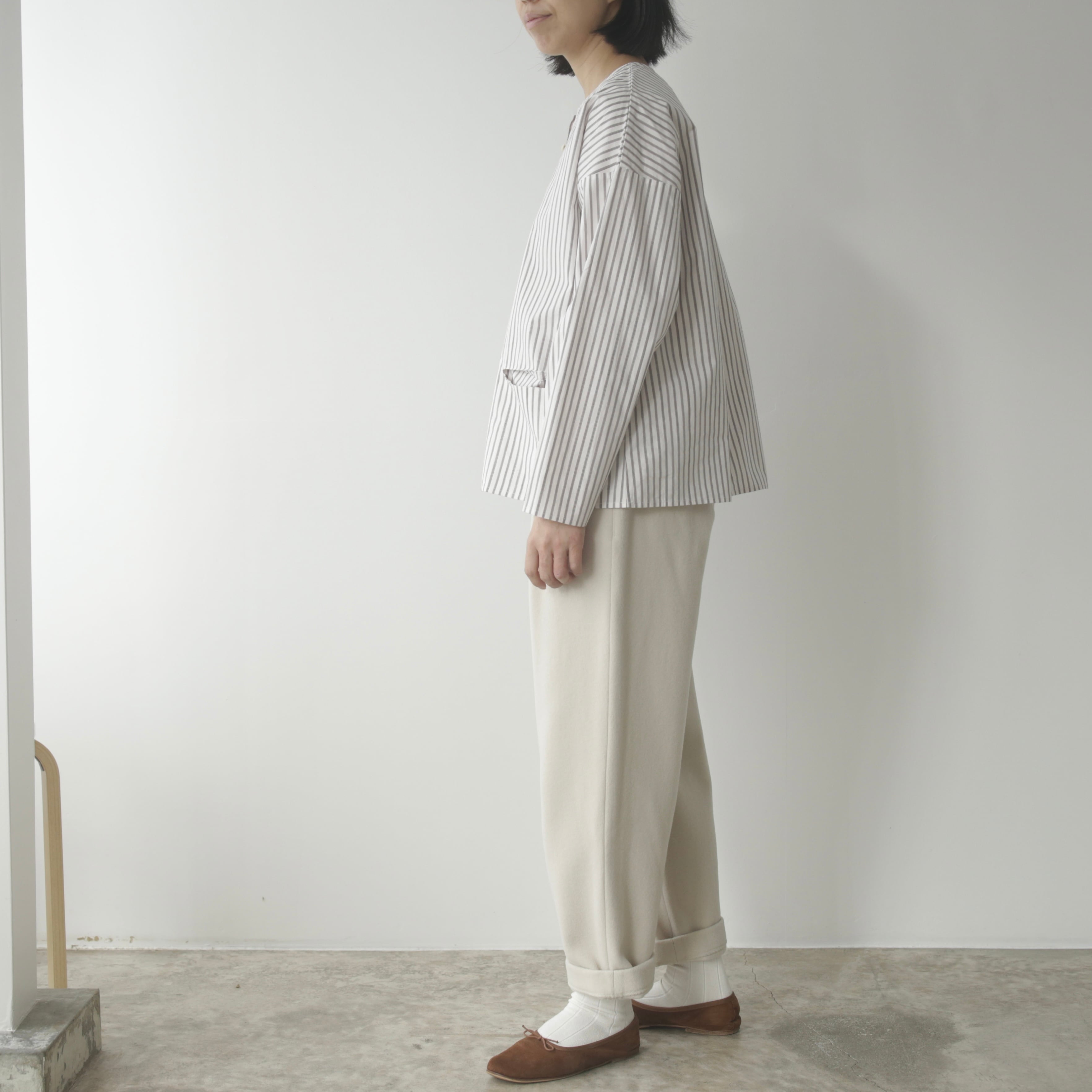 削ぎ落としたデザインの中に、余白とわずかな色気が生まれ、穿く人の佇まいを静かに引き立てます。同素材のコートと合わせたセットアップはもちろん、ざっくりとしたニットを合わせてもバランスよくまとまる。