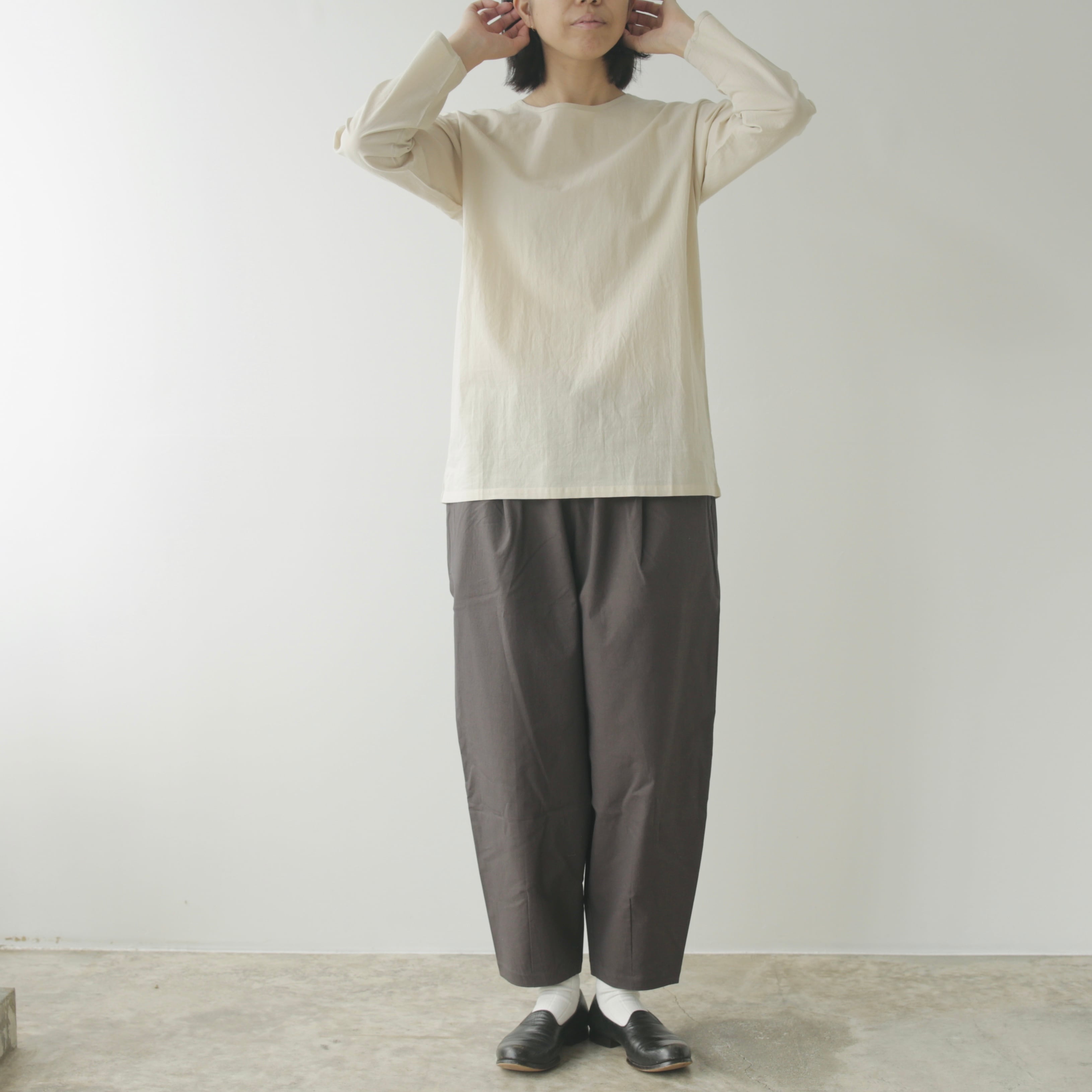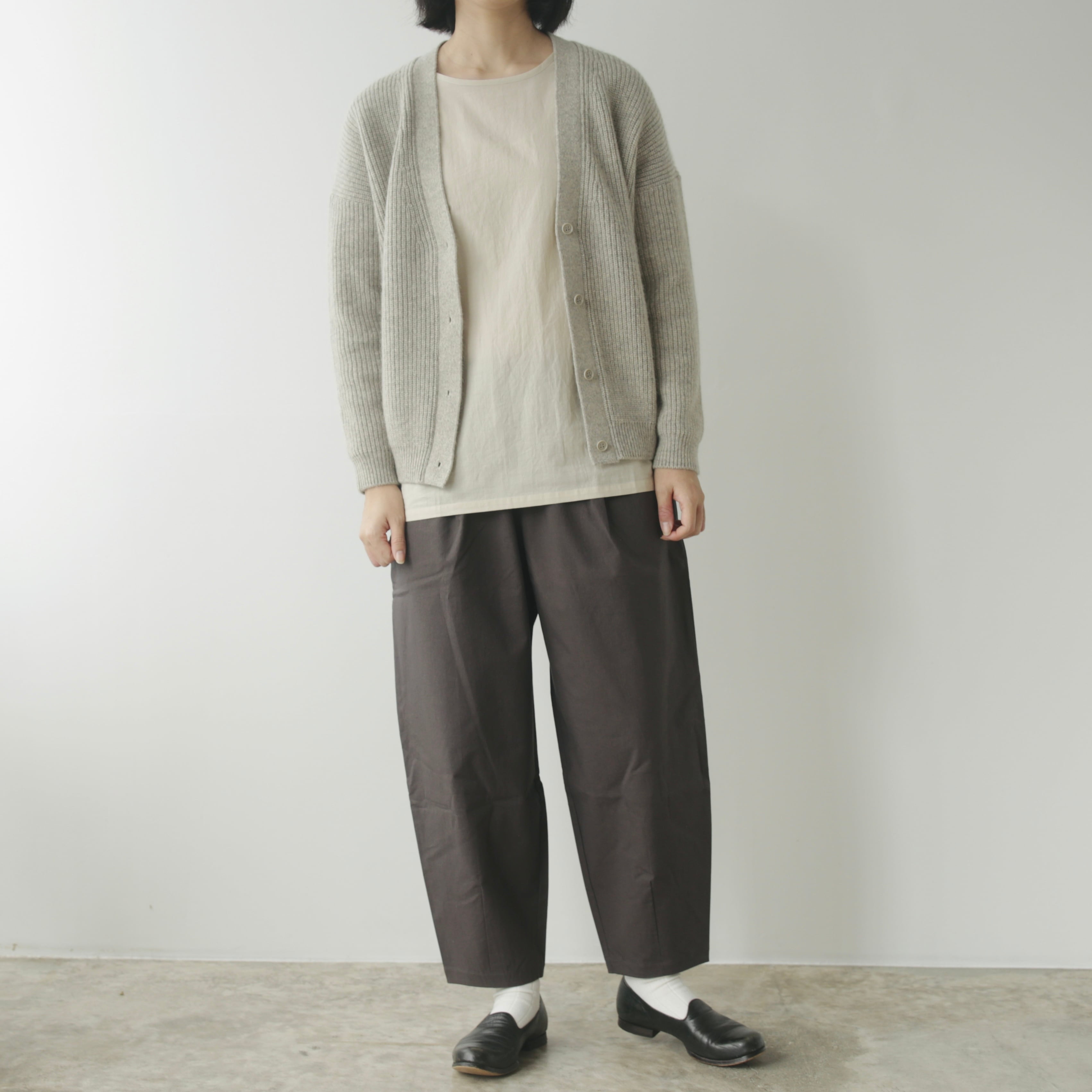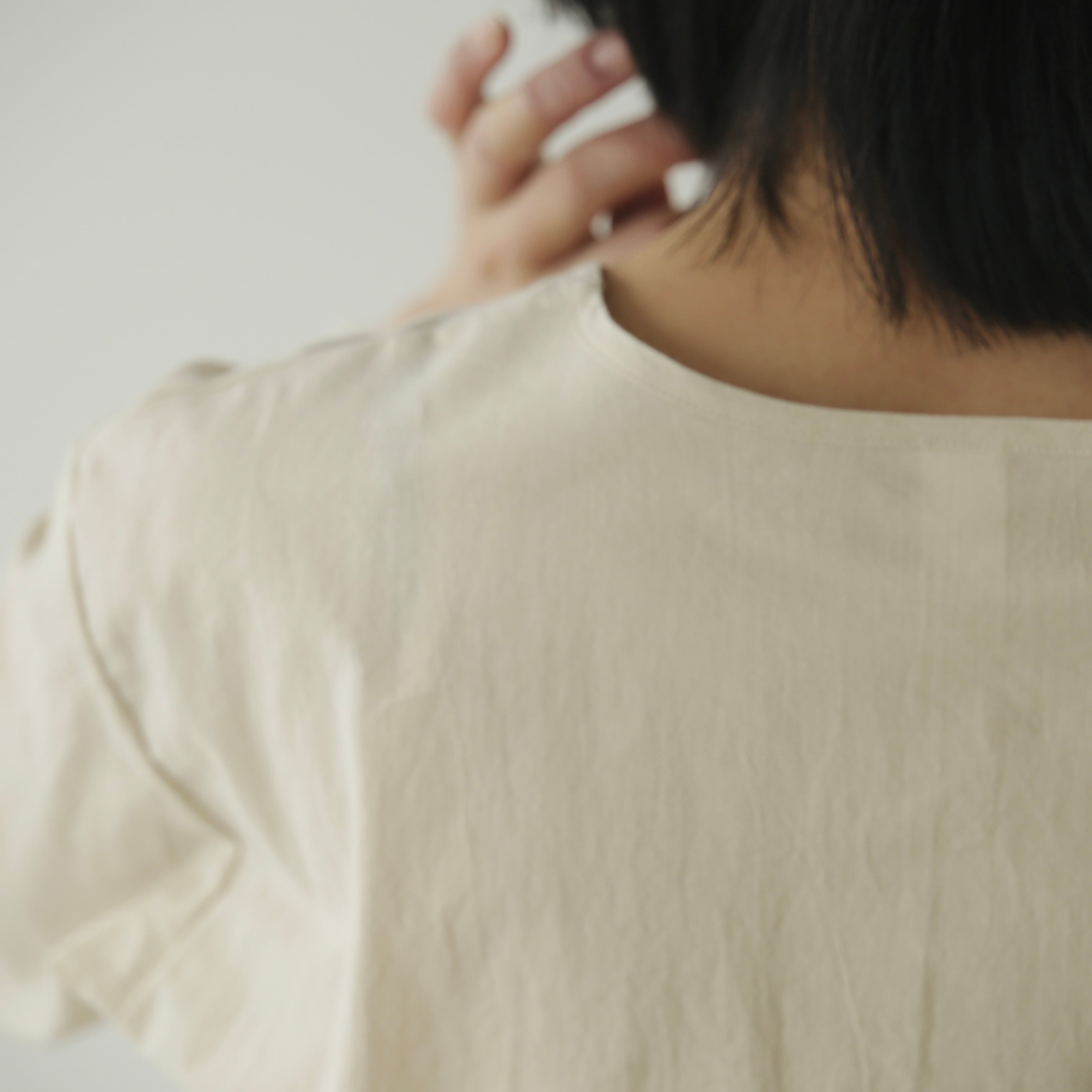 驚くほどミニマルなデザイン。けれど袖を通すと、生地がふんわりと丸みを生み、体にやさしく沿ってくれる——その自然な立体感が、女性らしい佇まいへと導いてくれます。