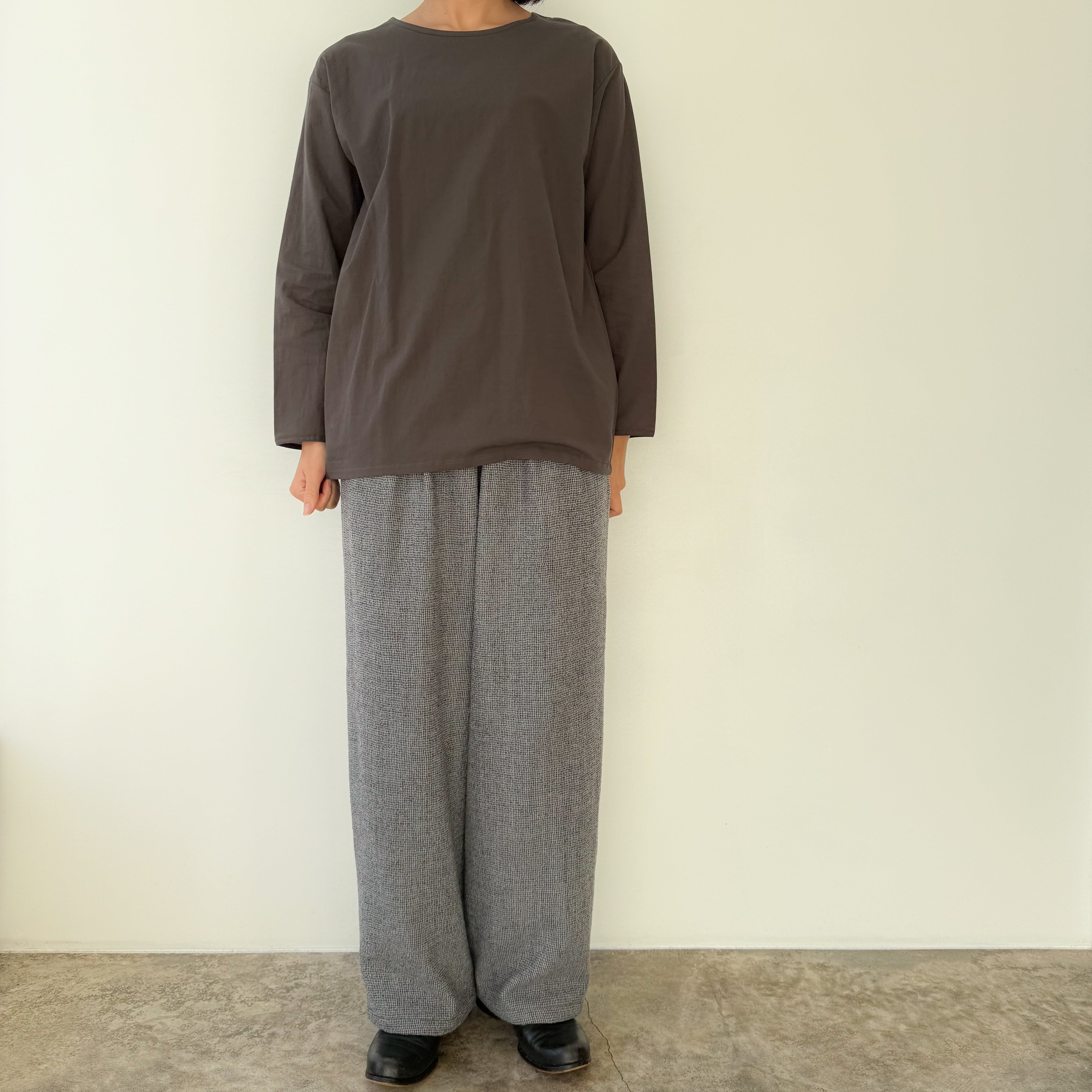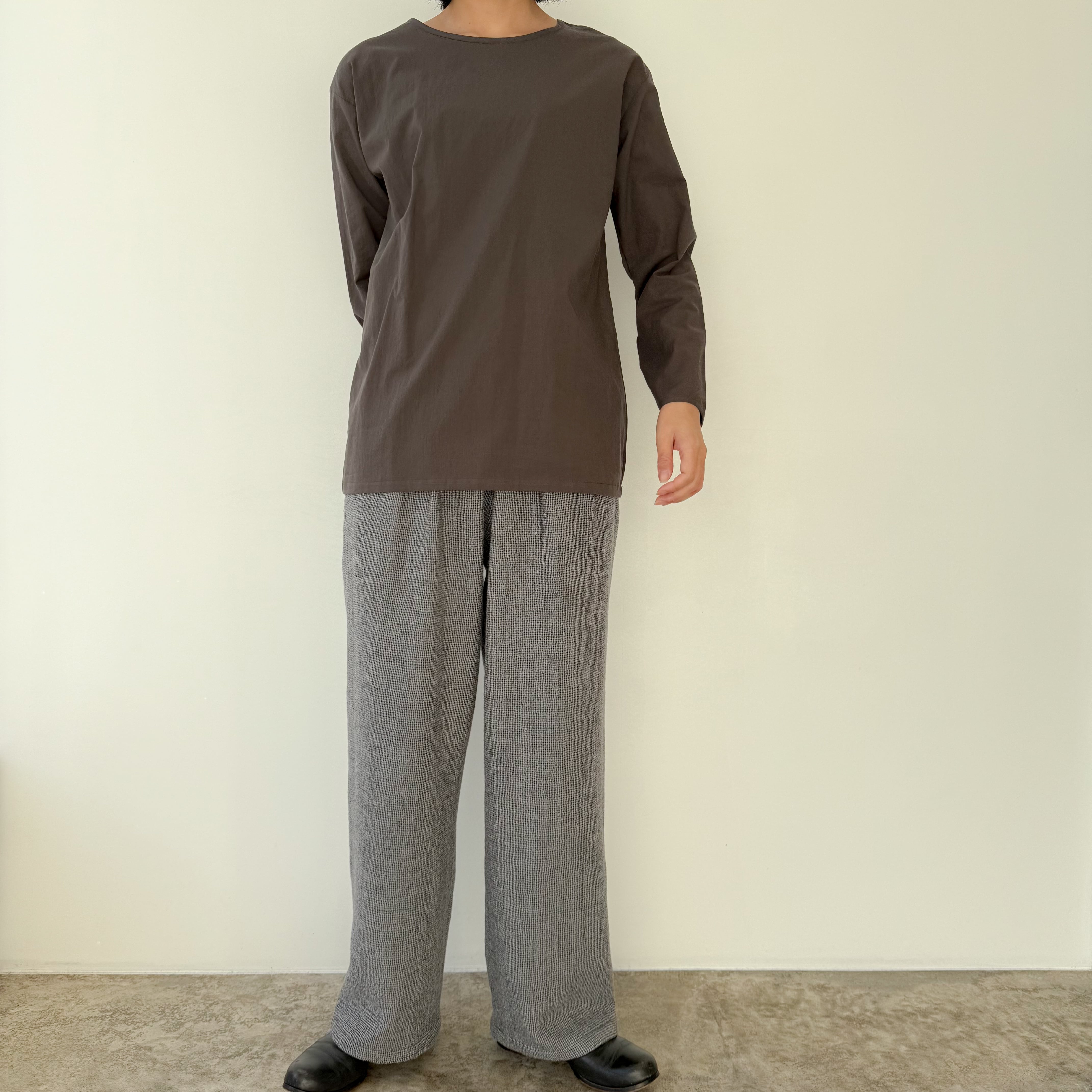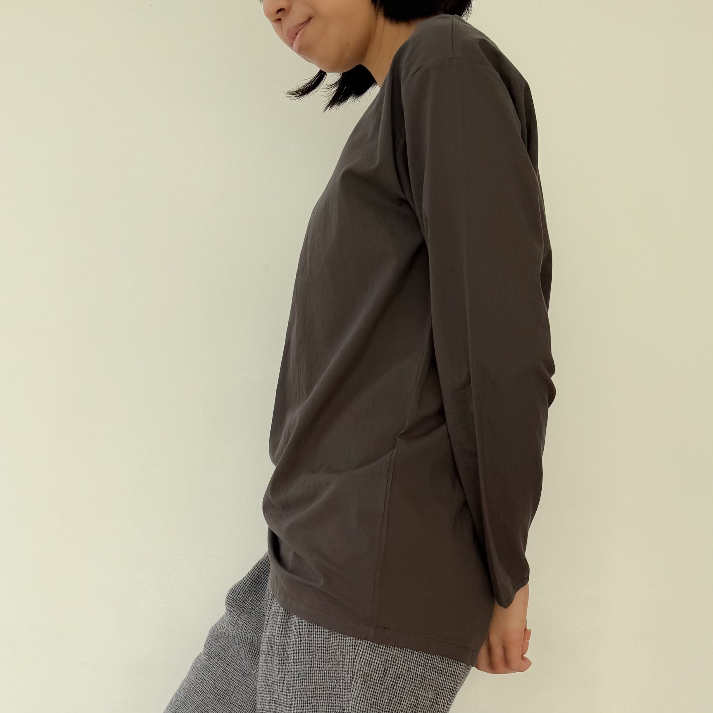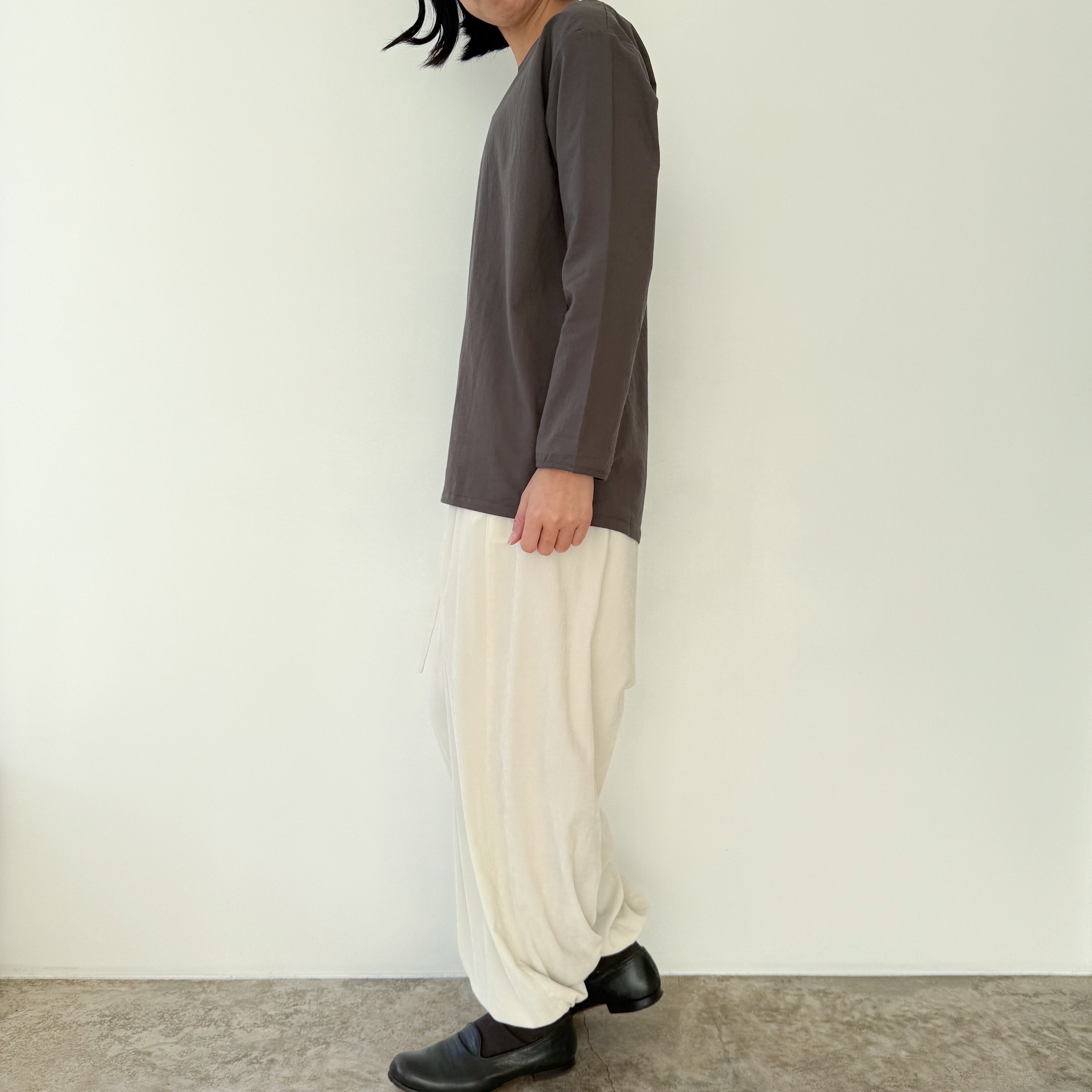 驚くほどミニマルなデザイン。けれど袖を通すと、生地がふんわりと丸みを生み、体にやさしく沿ってくれる——その自然な立体感が、女性らしい佇まいへと導いてくれます。
